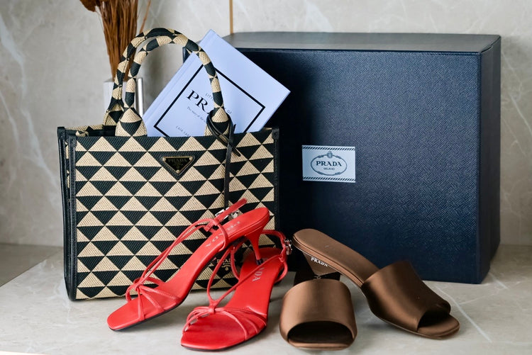 Prada Symbole Tote Jacquard Small. Peça como nova, sem uso porém sme tag da loja. Acomoda todos os tamanhos de telefone. Tamanho: 28x22 cmBolsa confeccionada em tecido estampado com padrão geométrico de triângulos em preto e bege, possui alça de mão e longa em...