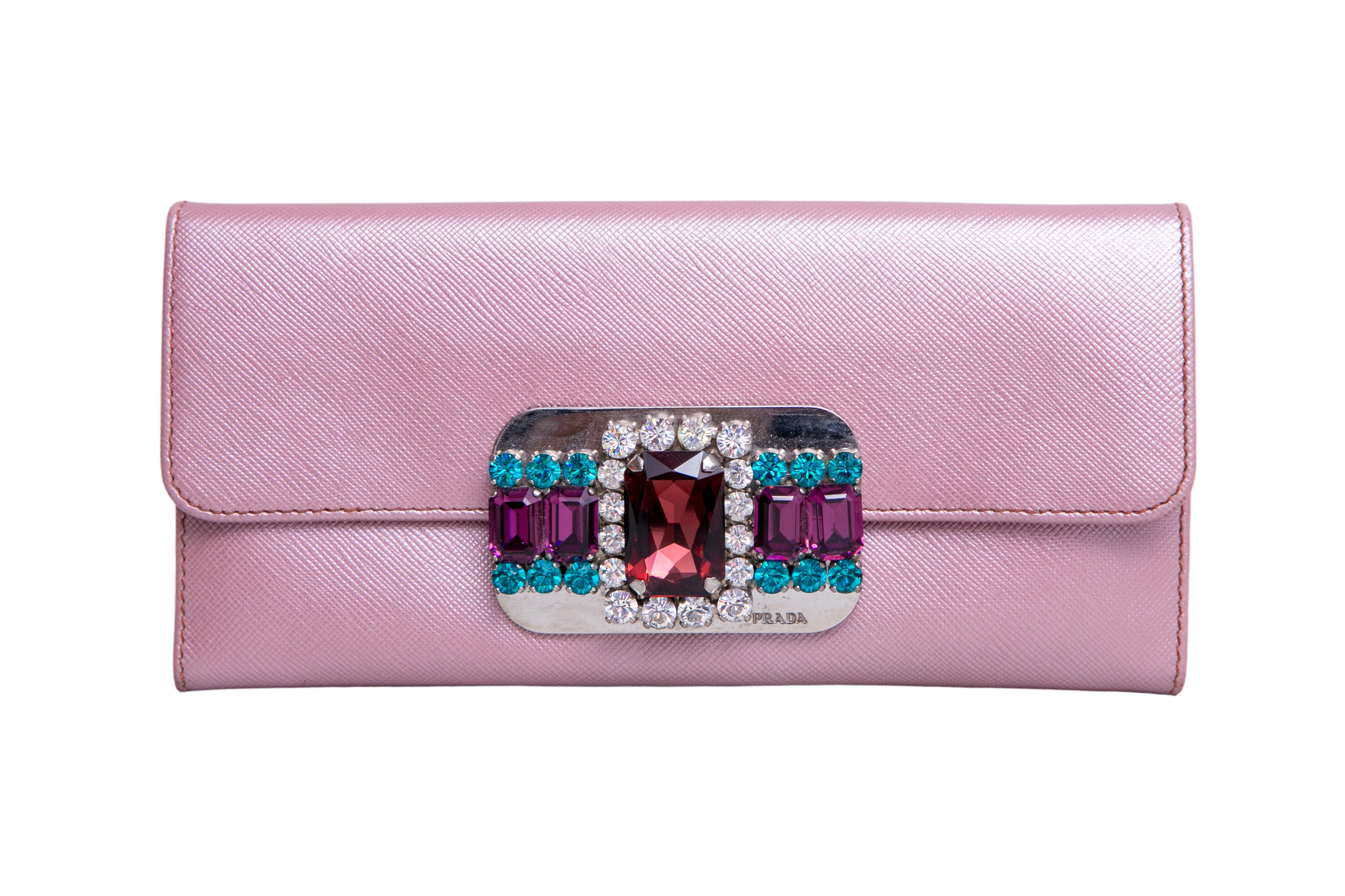 Prada Saffiano Stones Wallet Antico. Peça em perfeito estado, possui pequenos sinais de uso no couro. Tamanho: 19x9 cmCarteira confeccionada em couro saffiano na cor rosa. Possui formato retangular, fechamento por aba e detalhe frontal em pedrarias. Contém card, box e entrupy * Todas as fotos...- Preço normal