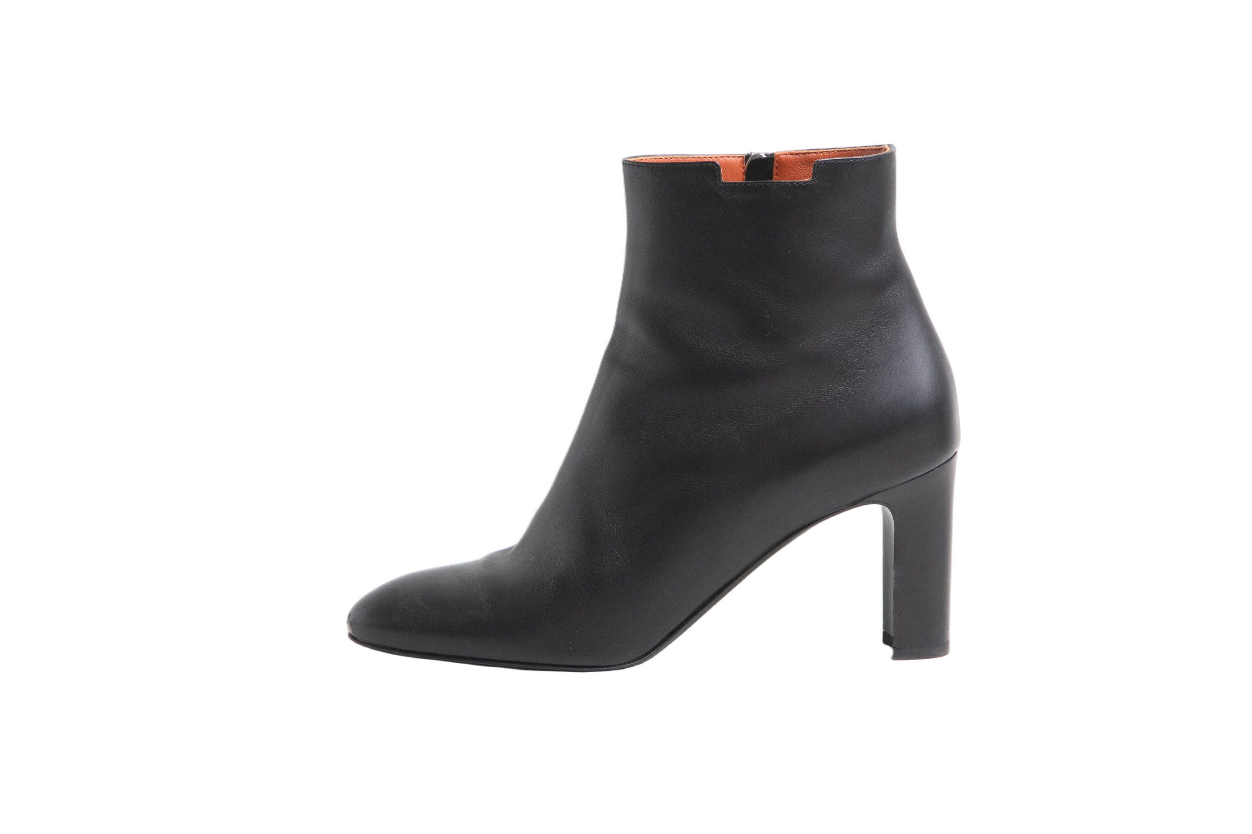 Hermès Demarche Boot Black Heels Veau. Peça em perfeito estado, possui pequenos sinais e sola. Tamanho: 39 SOLA - 37 BrasilTamanho do Salto: 7 cmBota em couro preto, de cano curto. Apresenta bico arredondado, salto médio grosso e fechamento lateral por zíper. Possui interior...- Preço normal