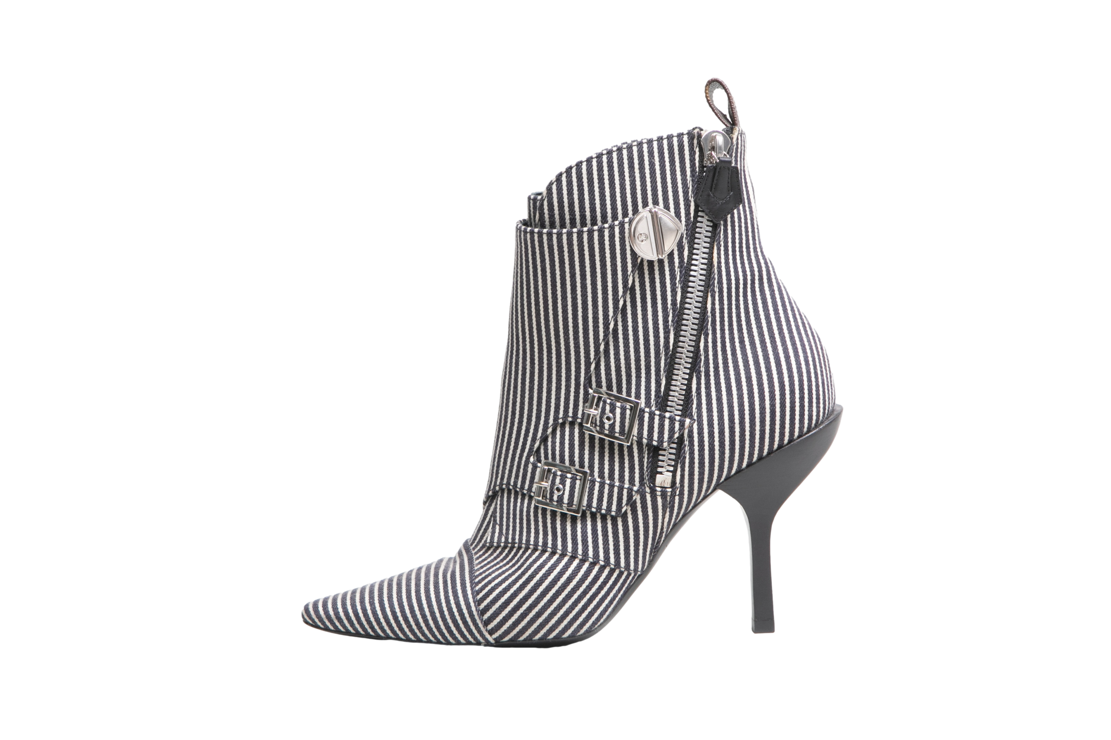 LV Ankle Boots Janet Striped Navy. Peça em perfeito estado, possui sinais de uso na sola e marca no salto. Tamanho: 40 SOLA - 38 BrasilTamanho do salto: 8 cmBota em tecido estampado com listras verticais em preto e branco. O modelo possui bico...- Preço normal