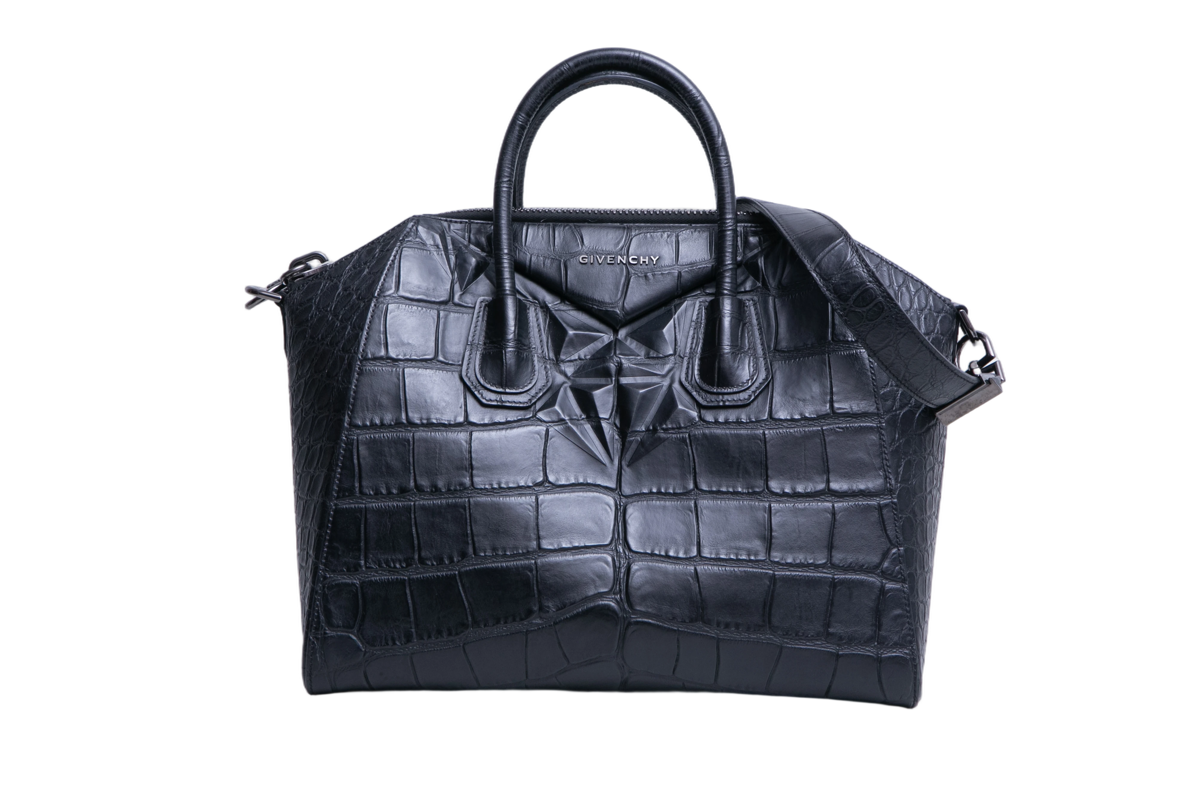 Givenchy Antigona Medium Croc Embossed Satchel Black. Peça em perfeito estado, possui pequenos sinais nas arestas. Acomoda todos os tamanhos de telefone. Bolsa em couro croco preto, nome da marca em material metálico na parte frontal com alça de mão e alça longa removível,...- Preço normal