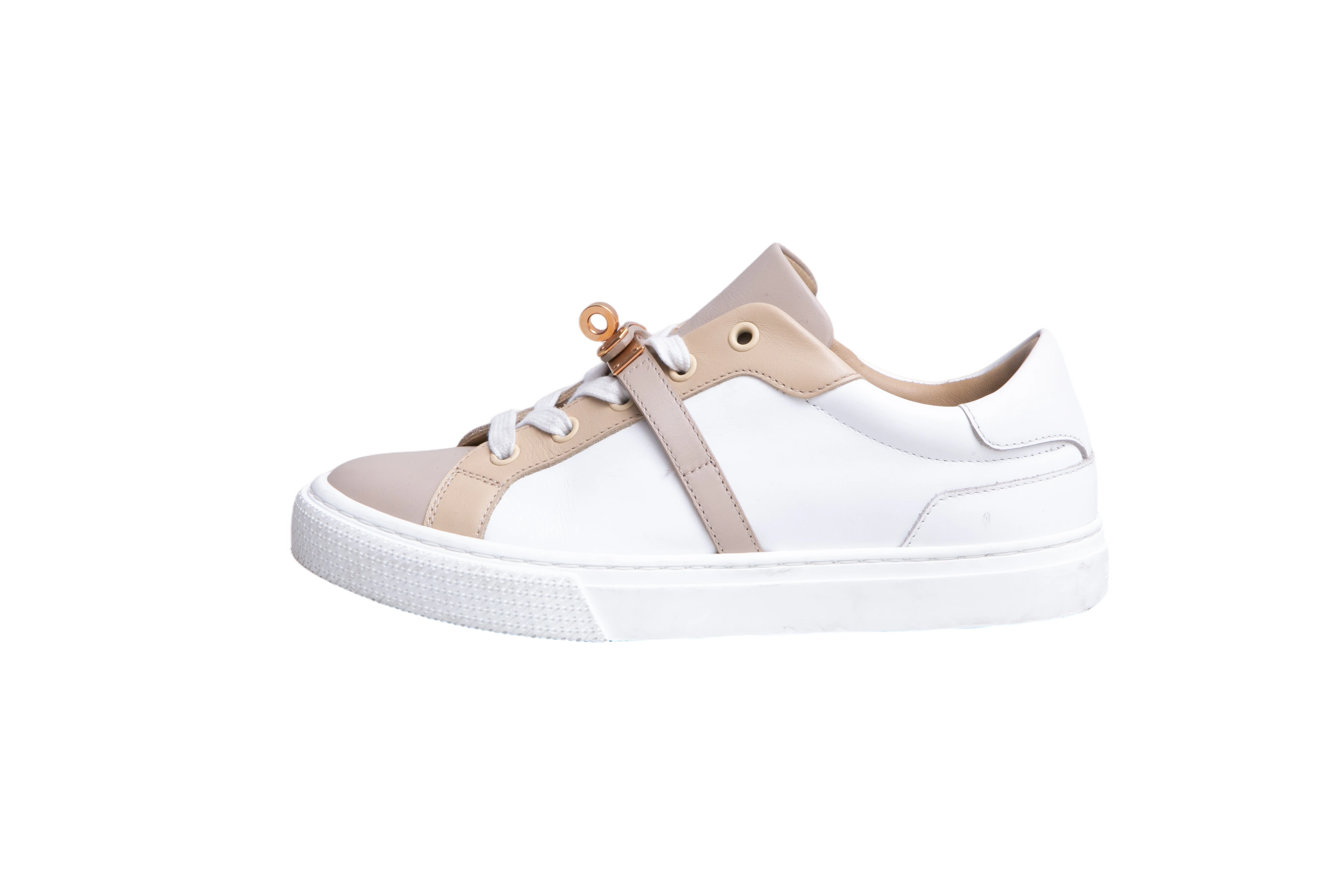 Hermès Sneaker Day Buckle Kelly Beige and White. Peça em perfeito estado, pequenos sinais de uso no couro e na sola. Tamanho: 36 SOLA - 34 BrasilTênis confeccionado em couro liso nas tonalidades branco e bege. Possui bico arredondado, fechamento por cadarço, detalhe frontal com ferragem...- Preço normal
