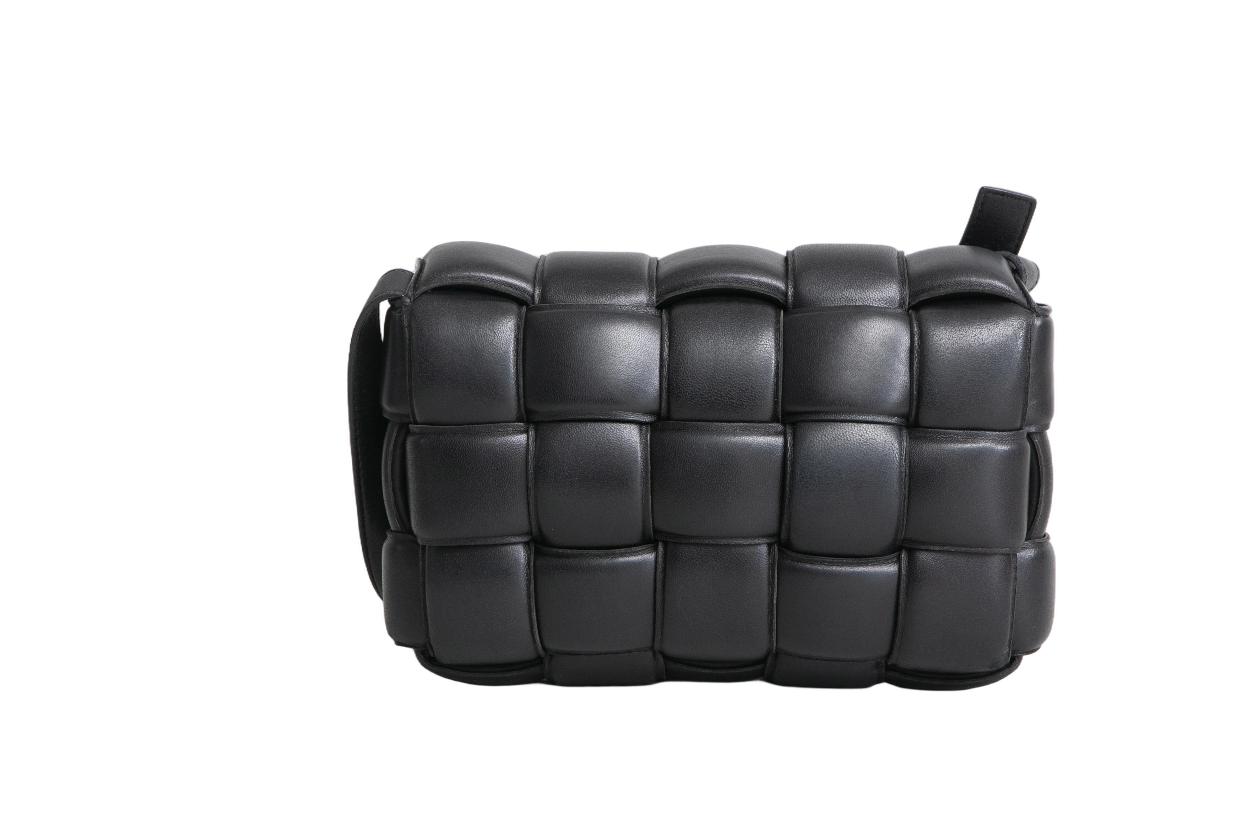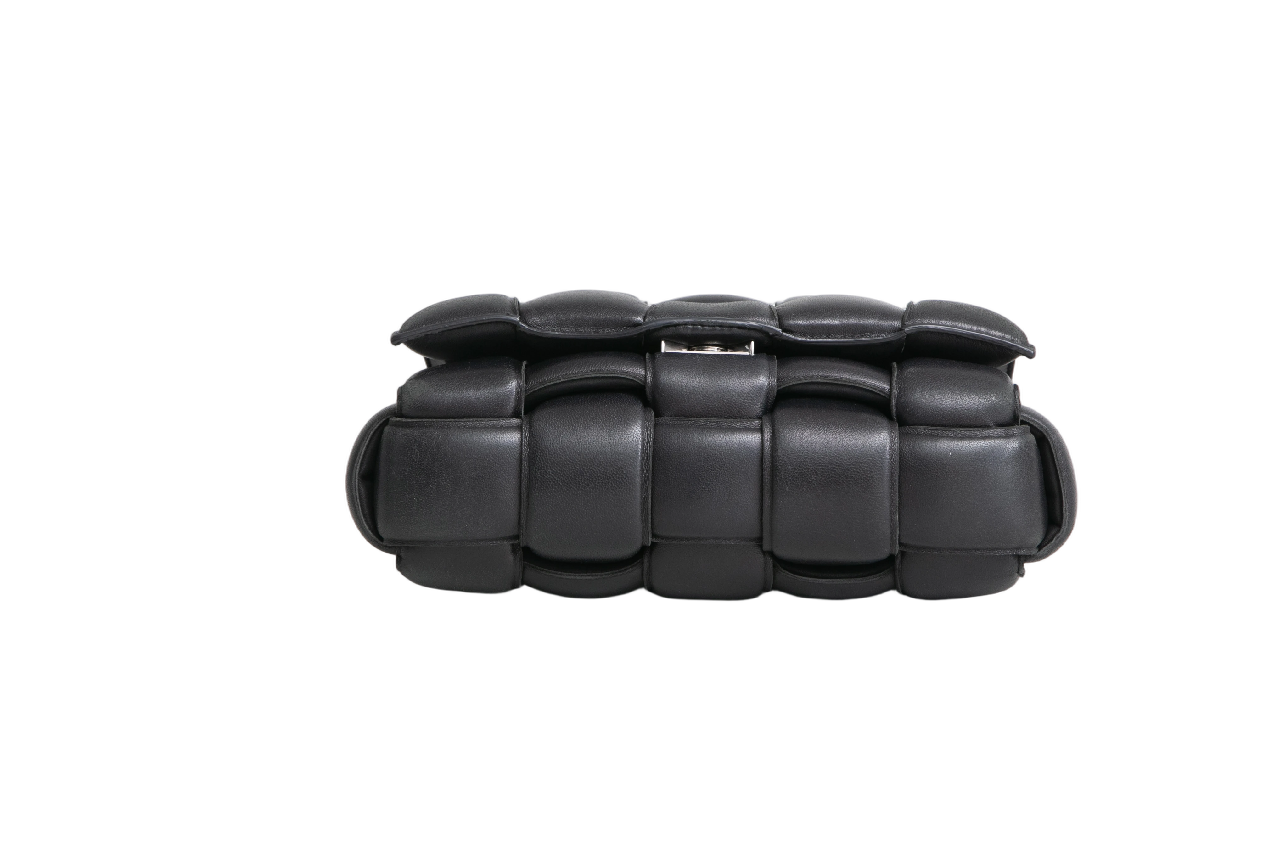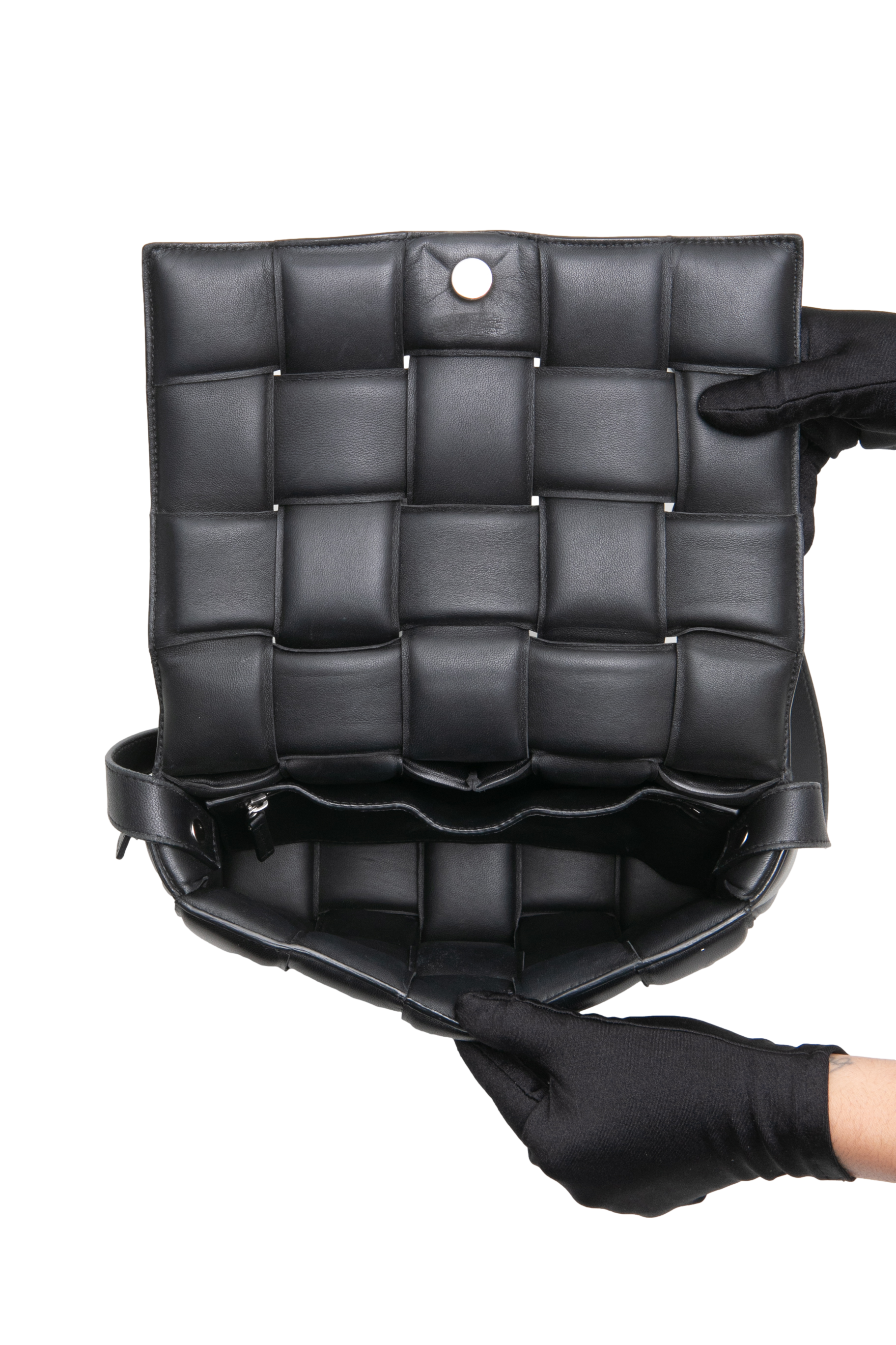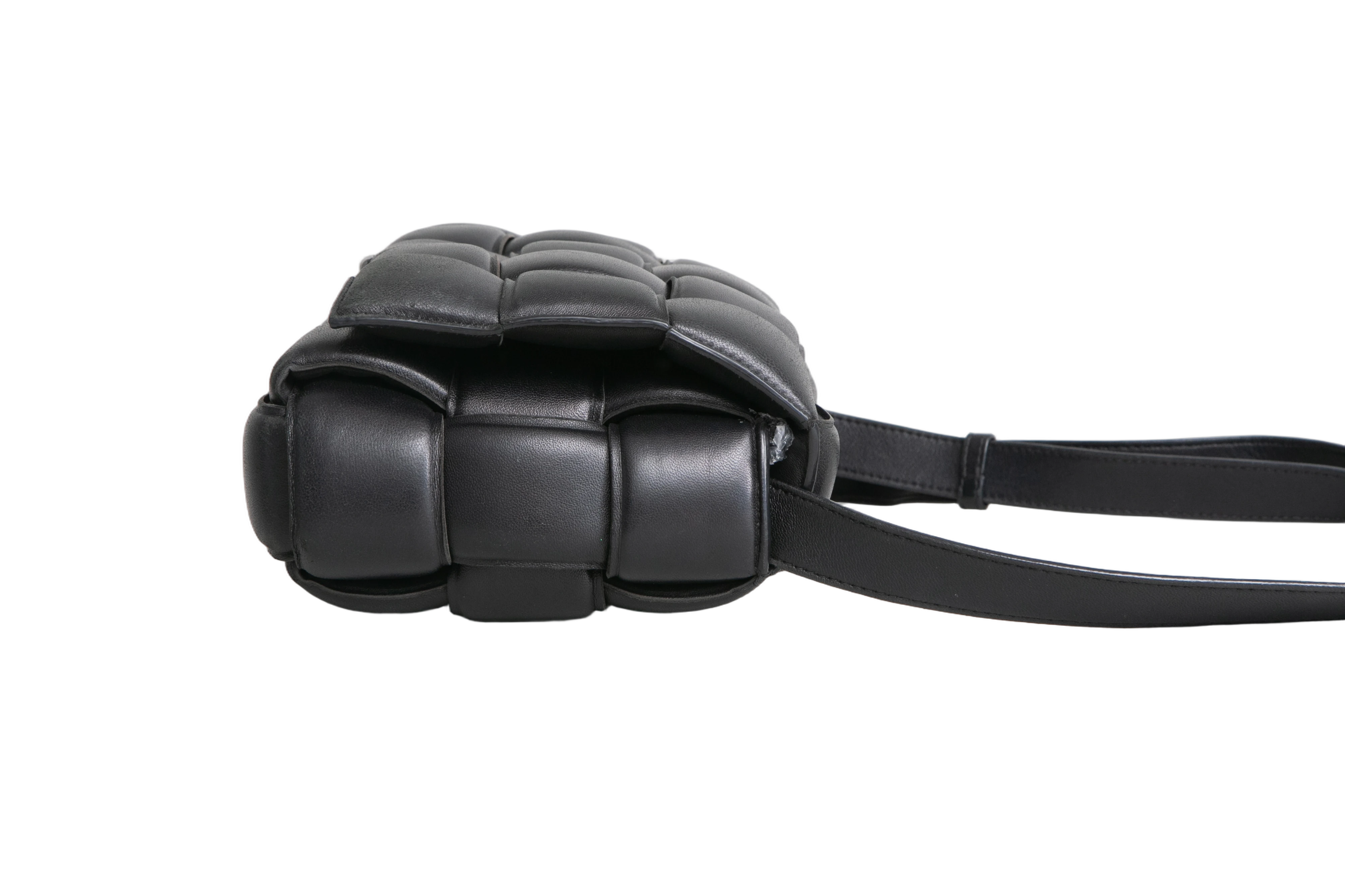 Bottega Cassette Padded Intrecciato Black. Peça em ótimo estado, possui sinais nas arestas e couro, alguns craquelados na alça.