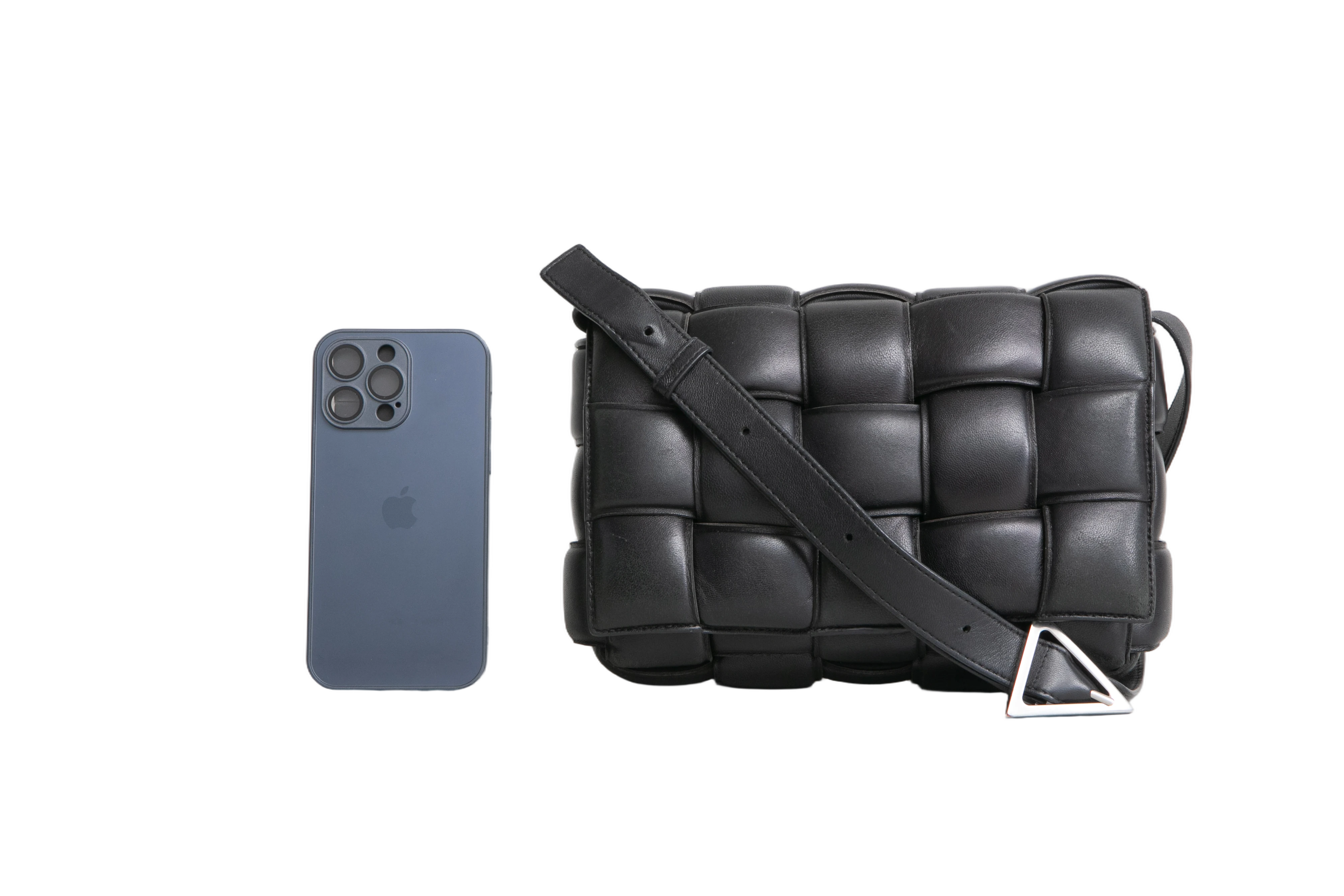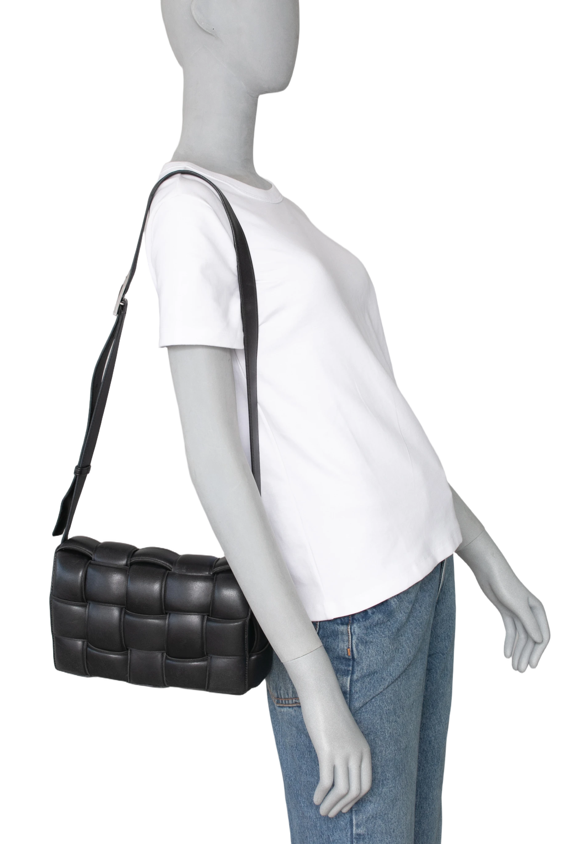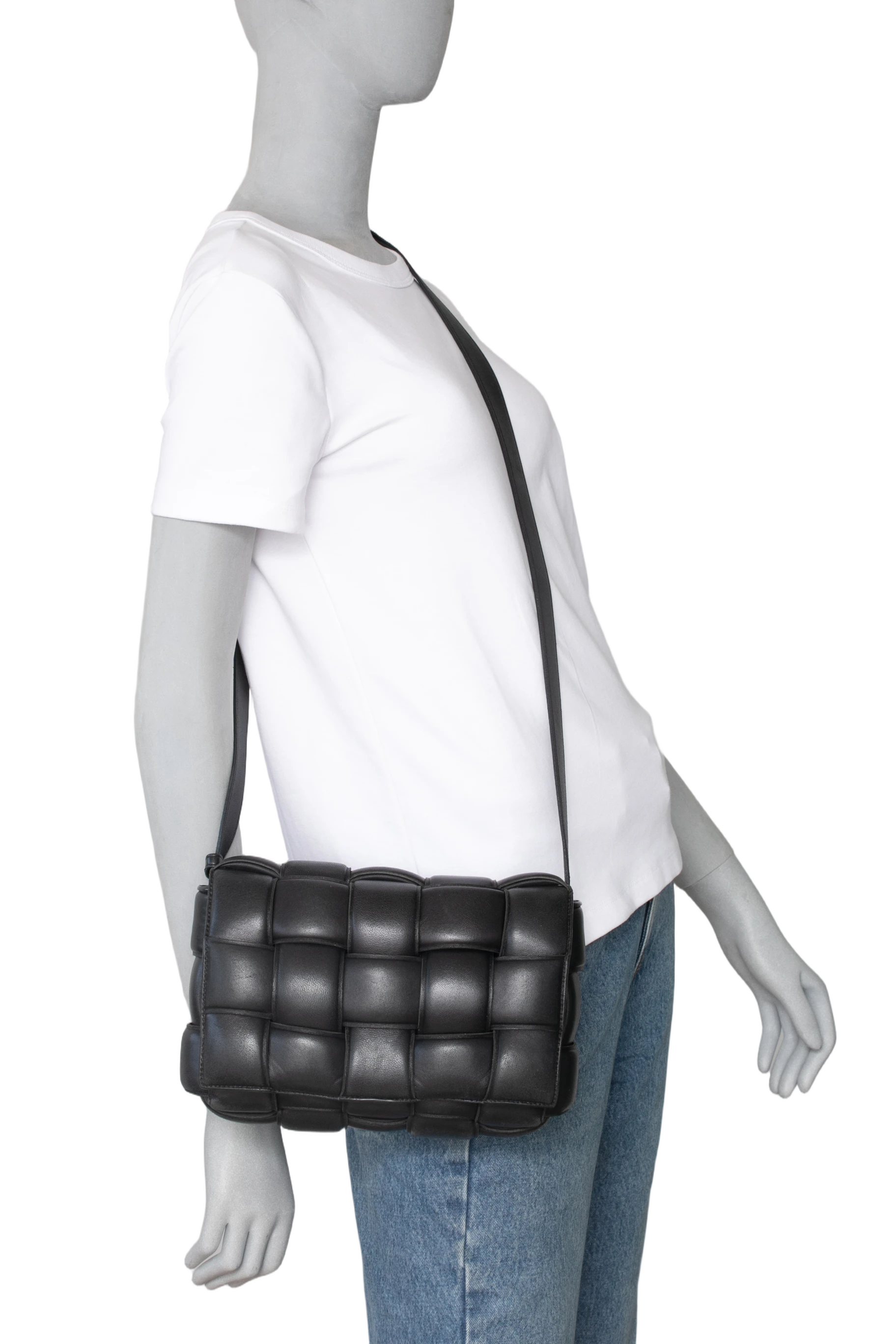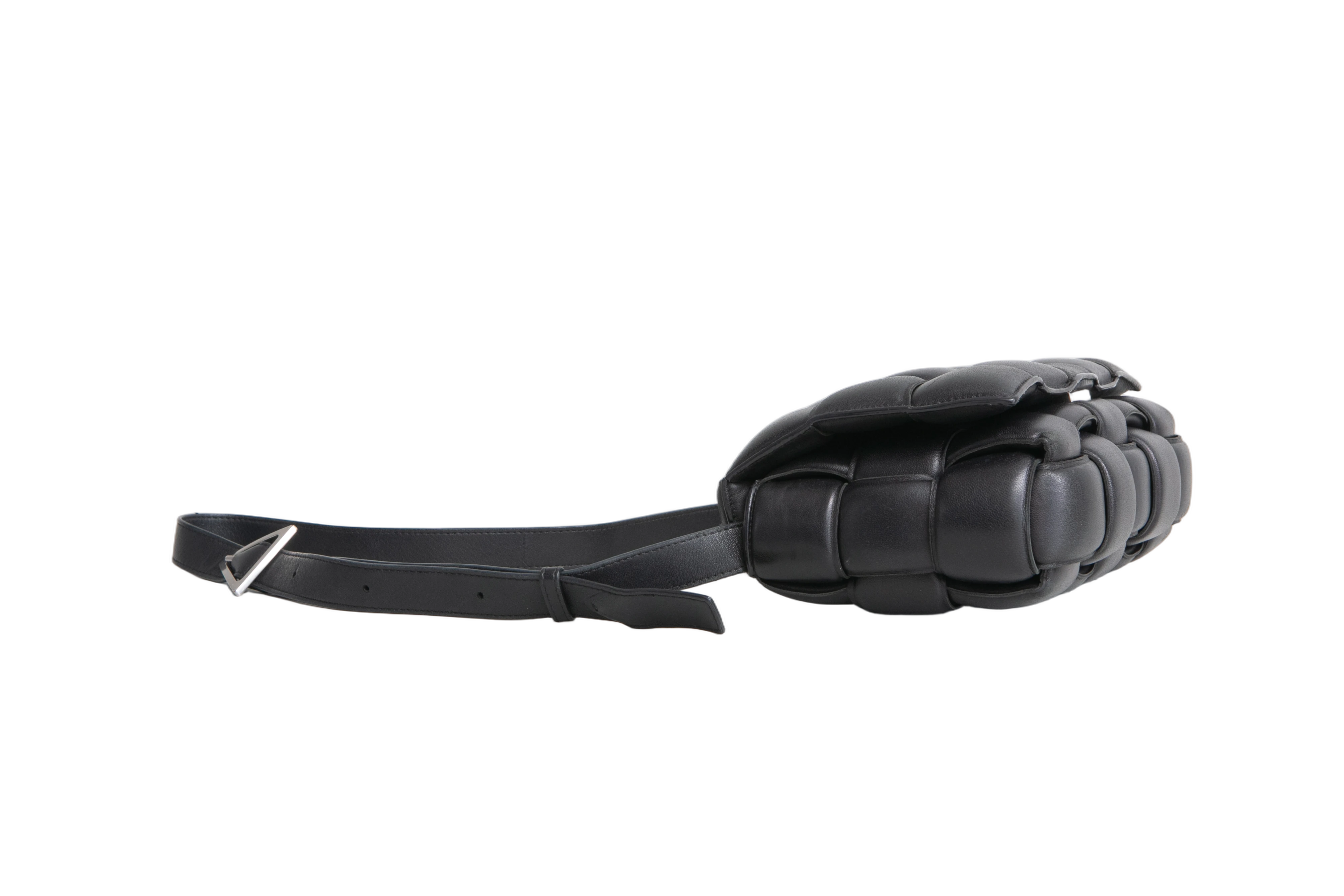 Bottega Cassette Padded Intrecciato Black. Peça em ótimo estado, possui sinais nas arestas e couro, alguns craquelados na alça.