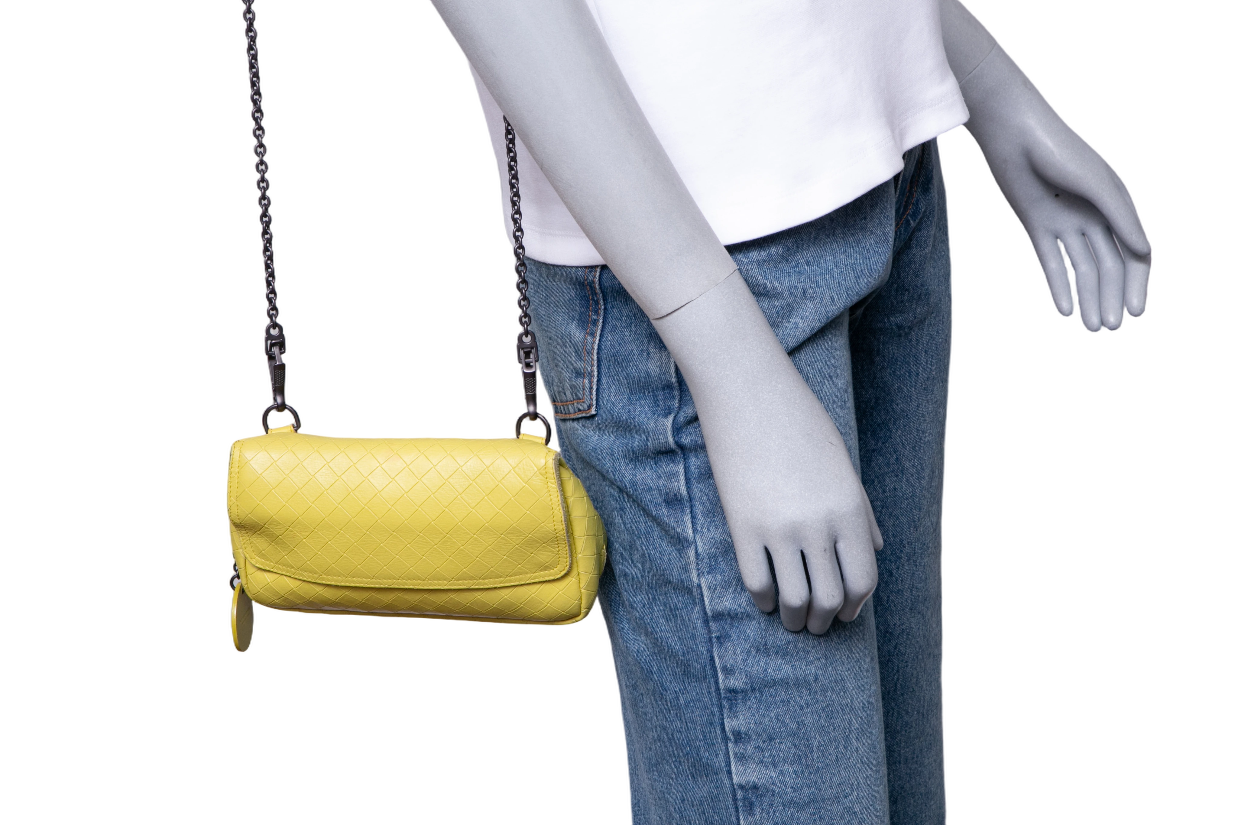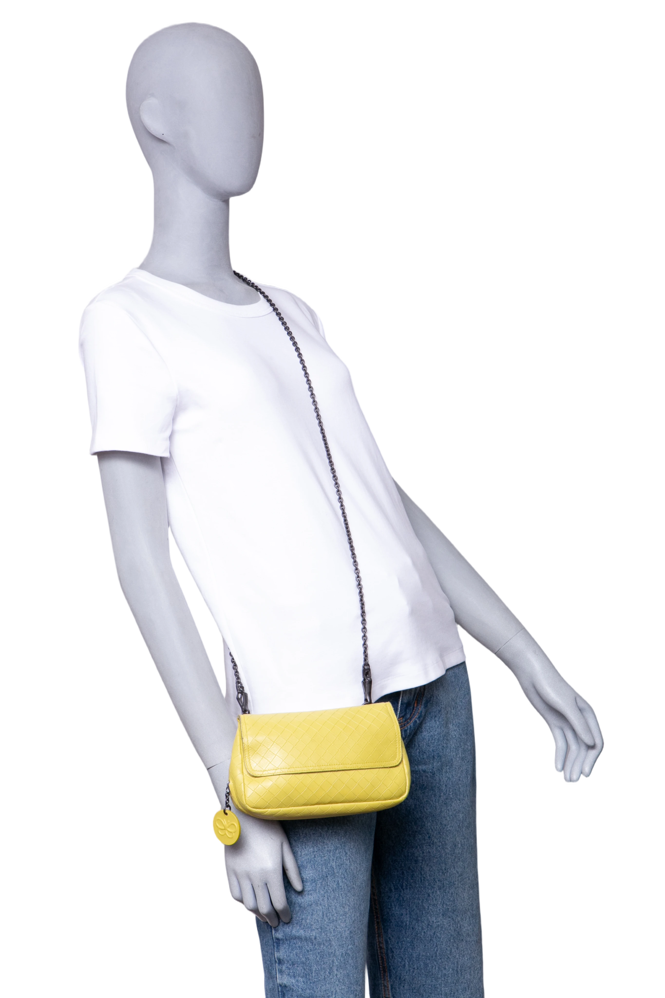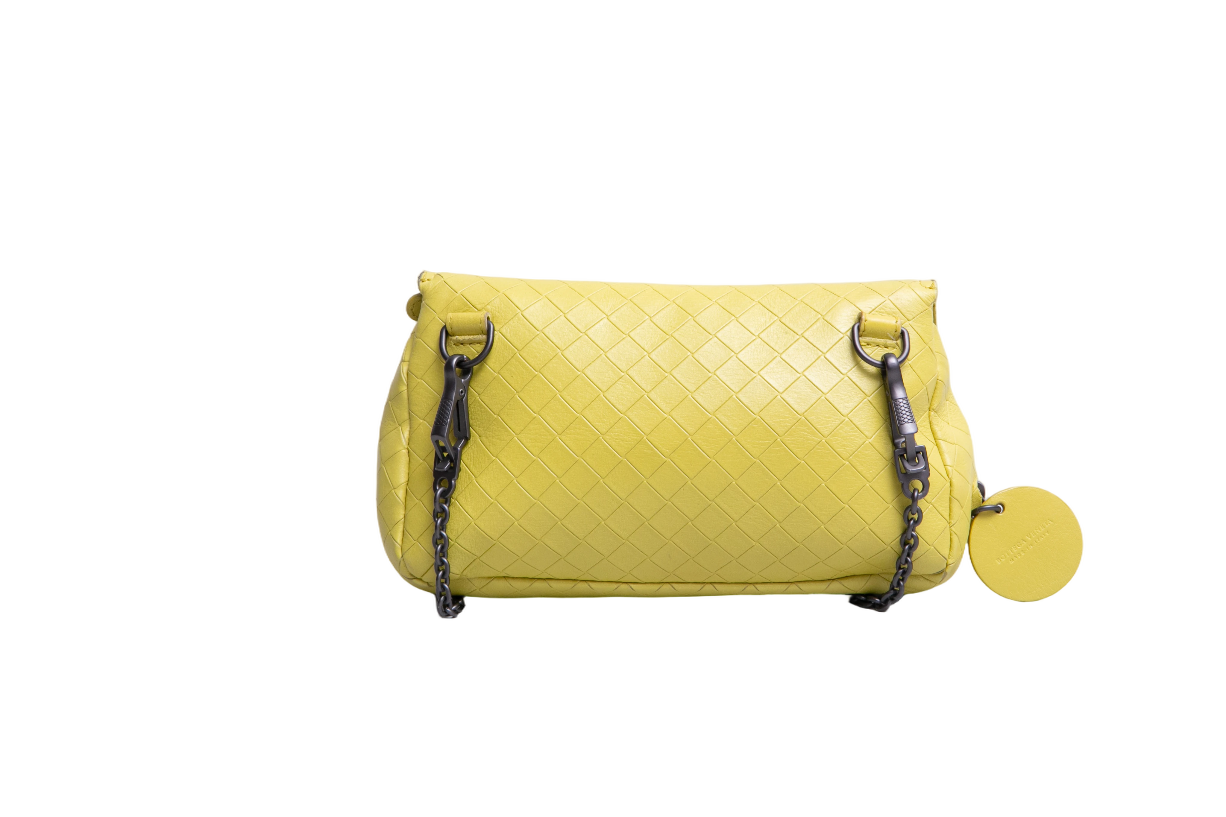 Bolsa em couro na cor verde limão modelo intrecciato, essa bolsa possui vários compartimentos com fechamento por aba com botão magnético e zíper. Possui alça em corrente para uso shoulder e crossbpdy.