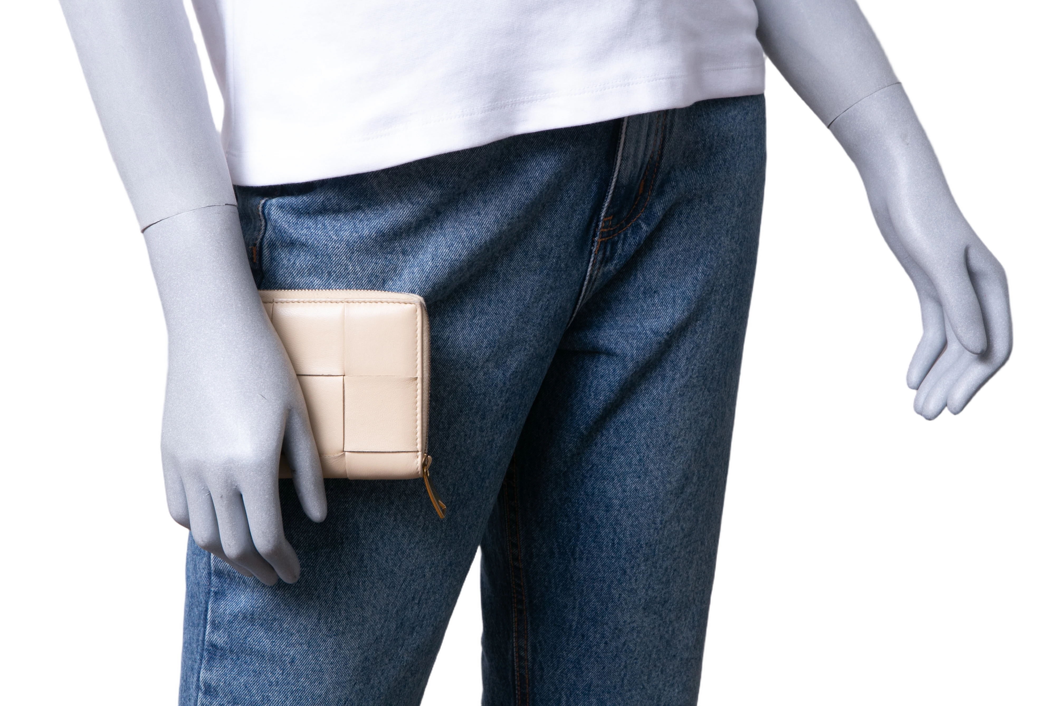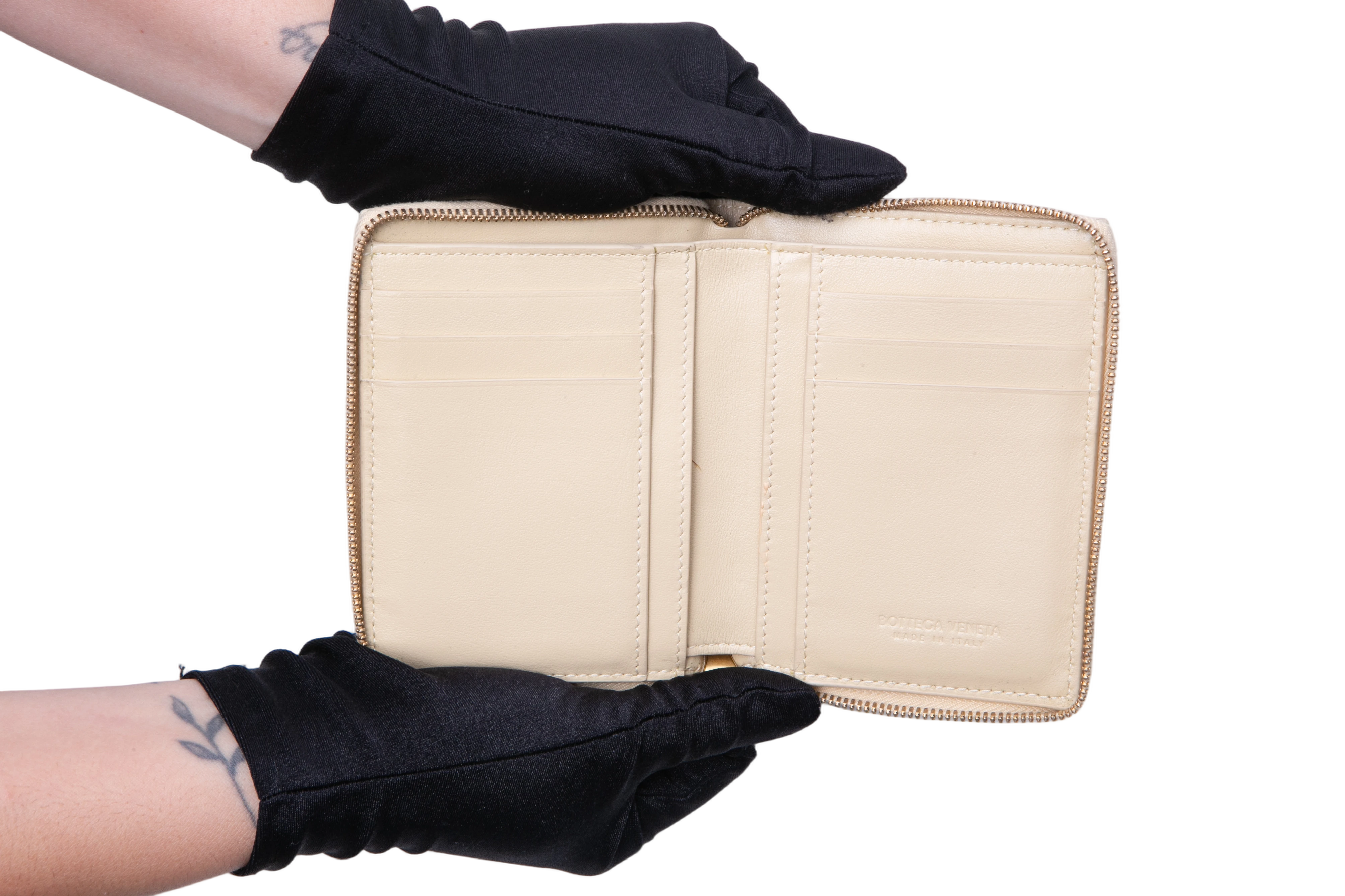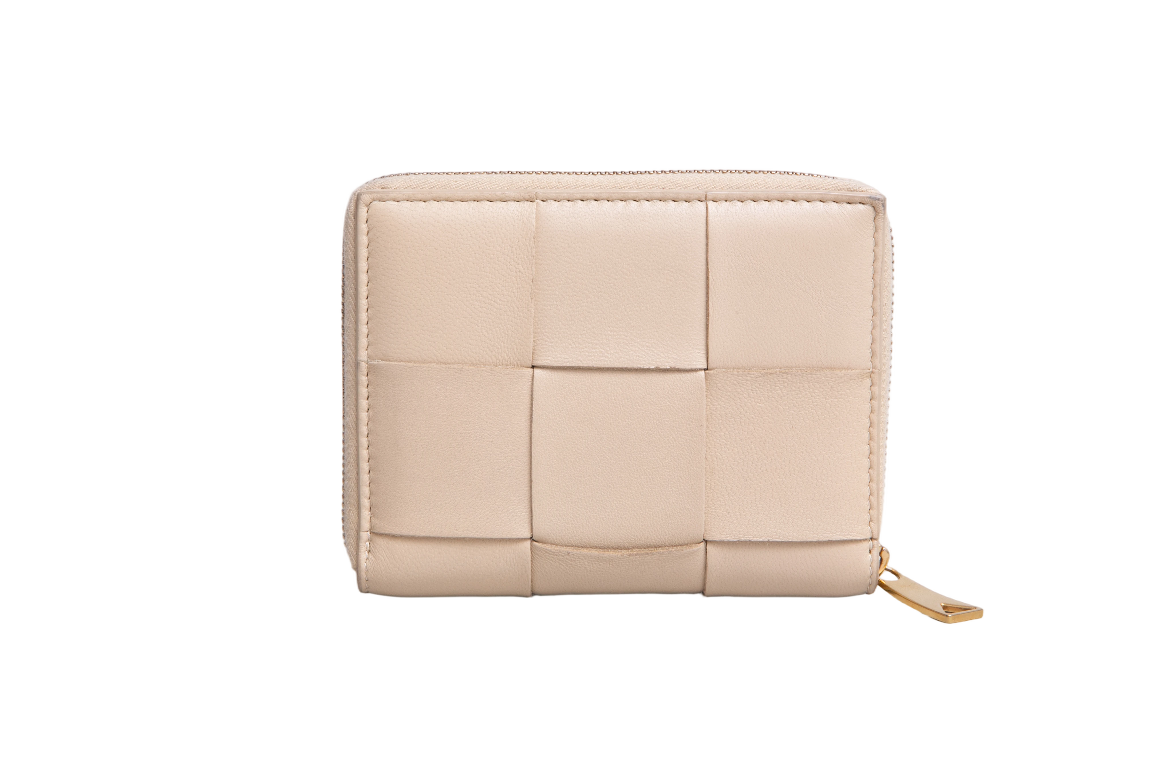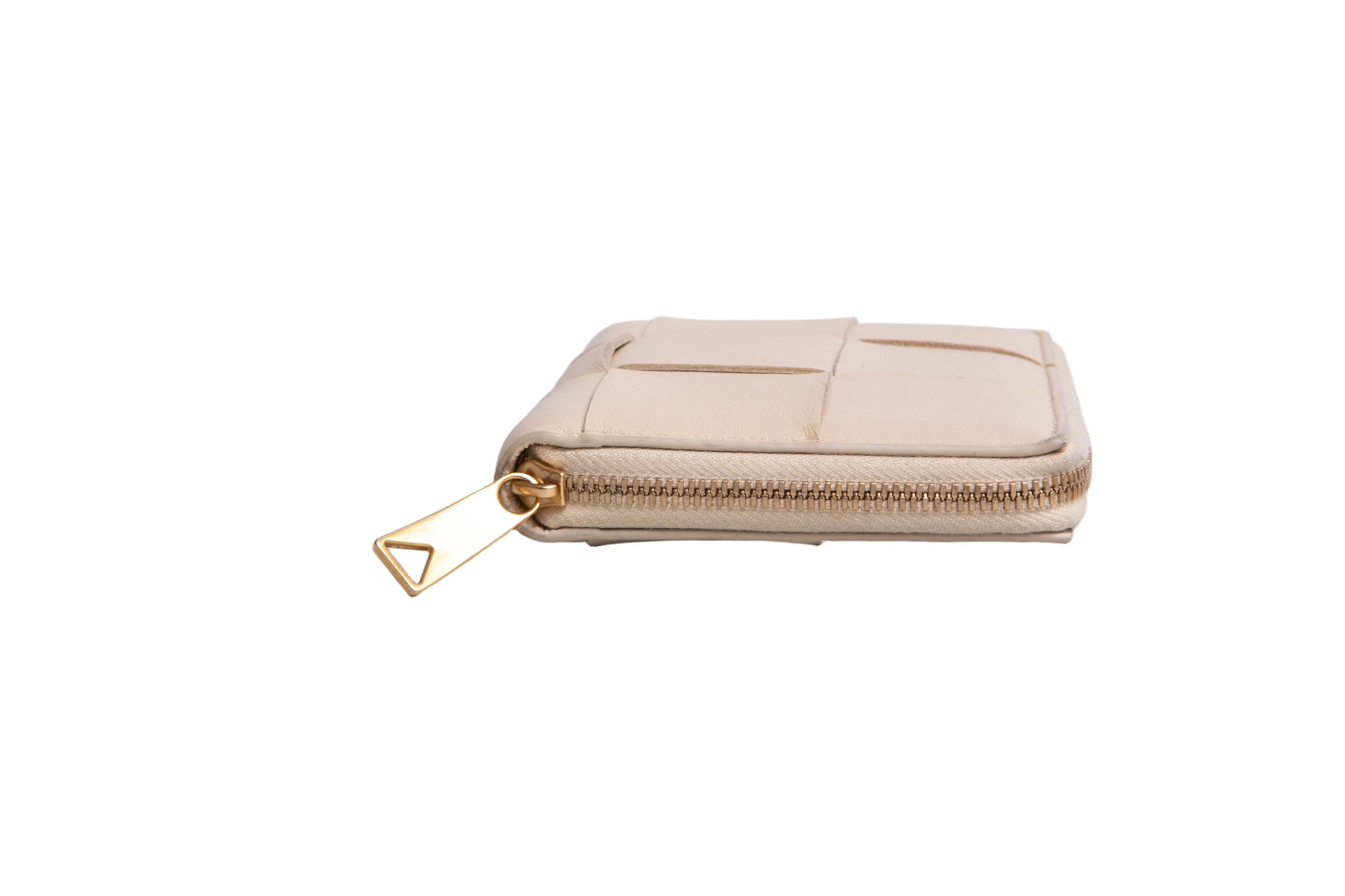 Carteira confeccionada em couro na cor bege entrelaçado, modelo intrecciato padrão da marca com fechamento por zíper.