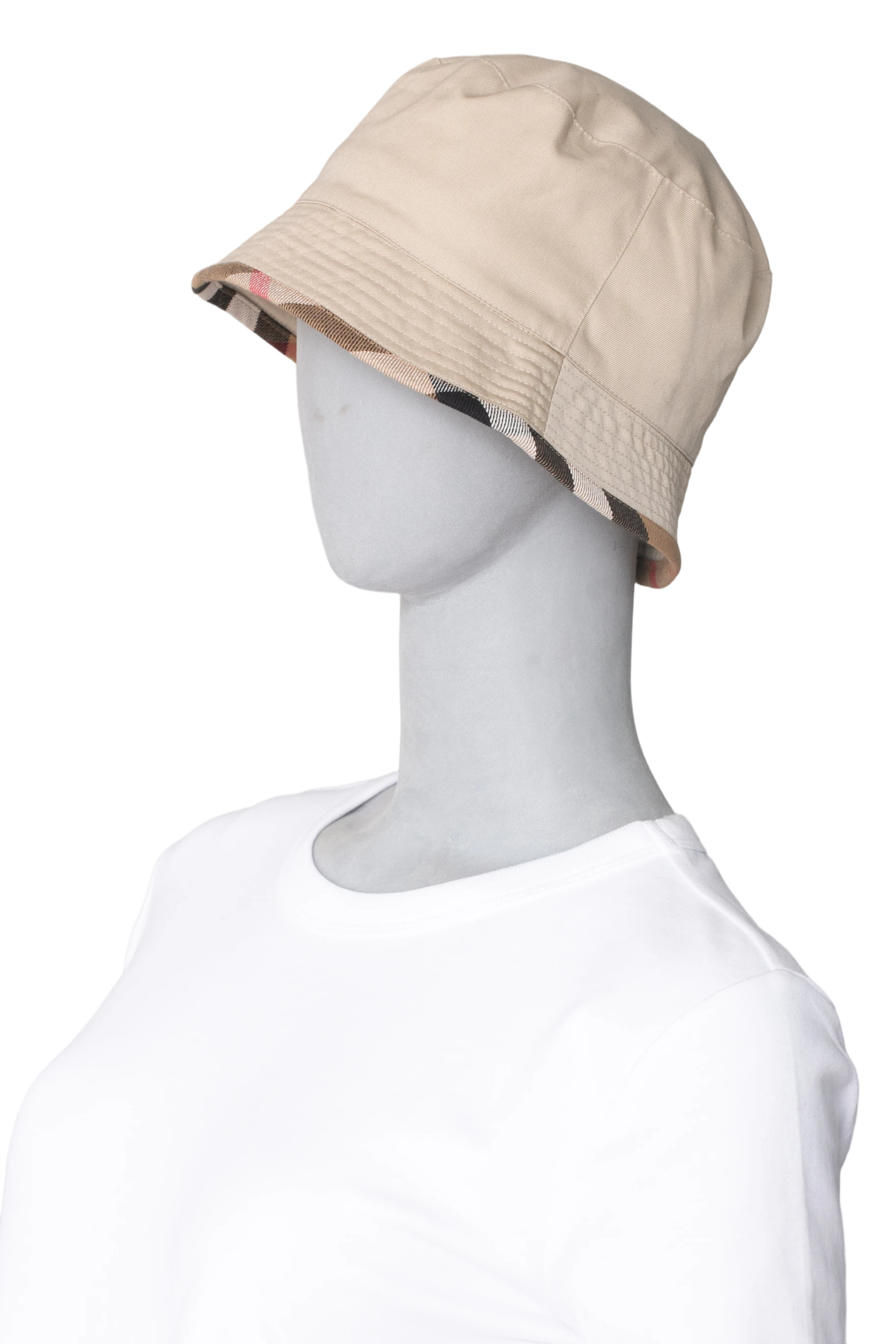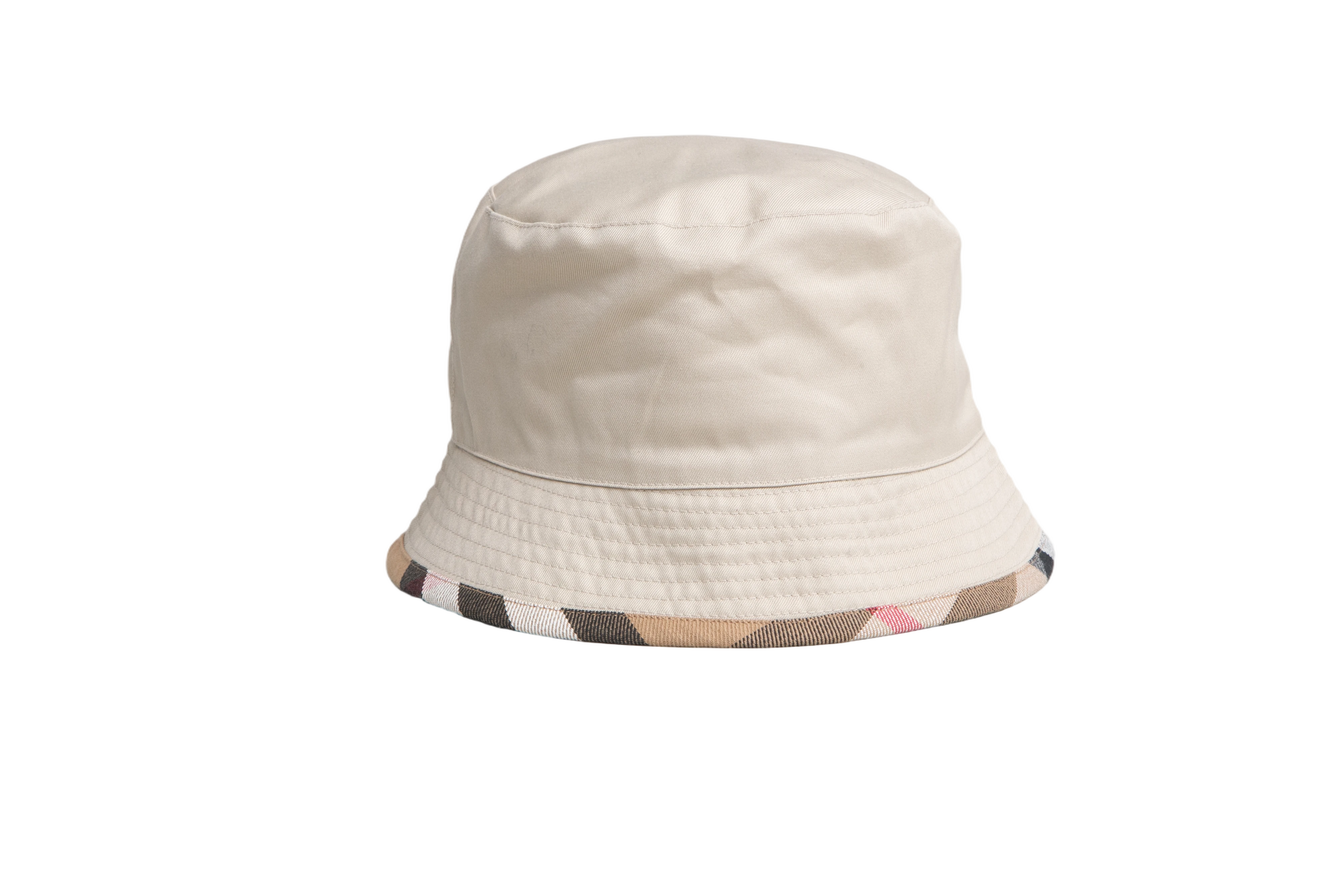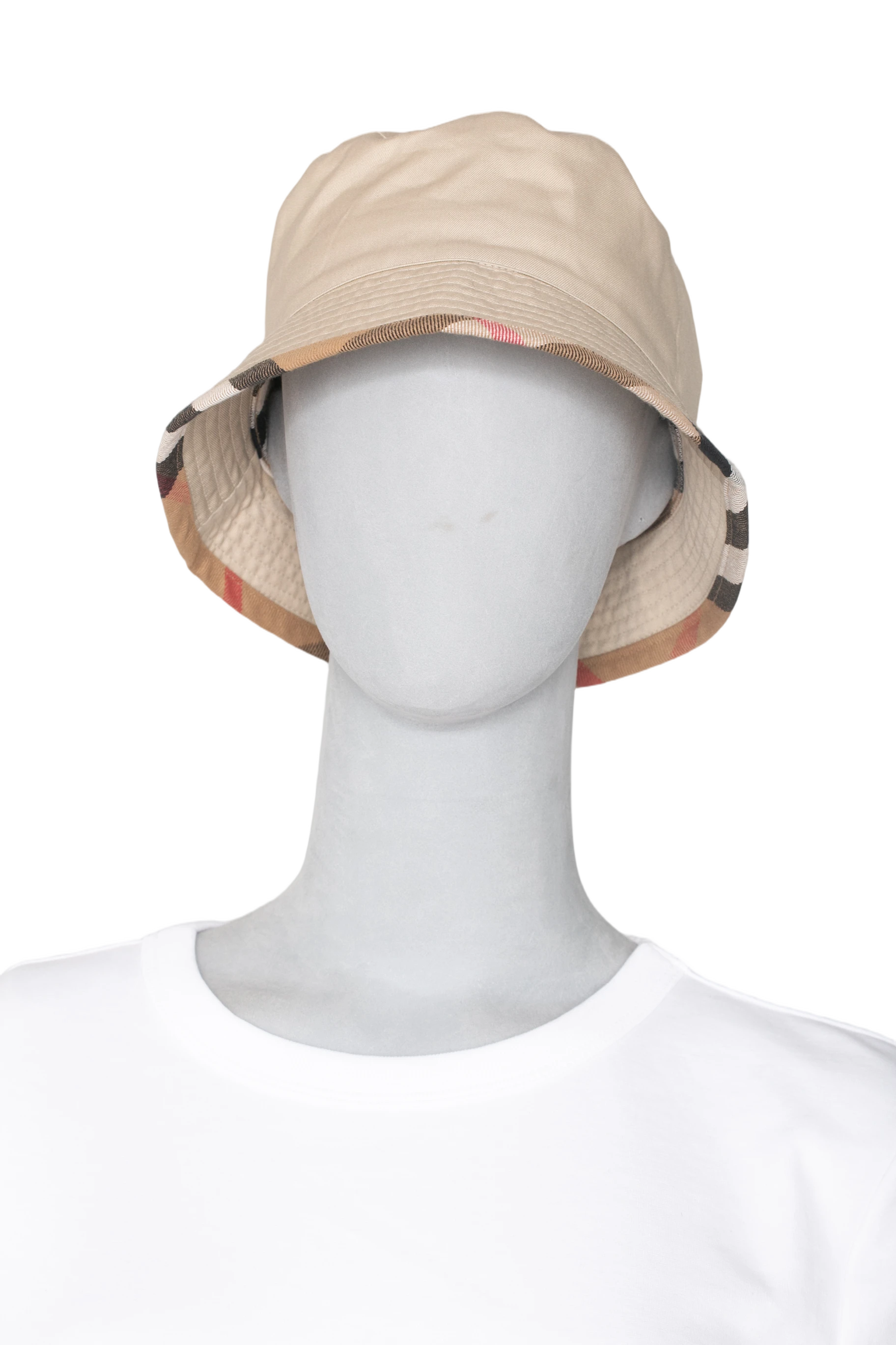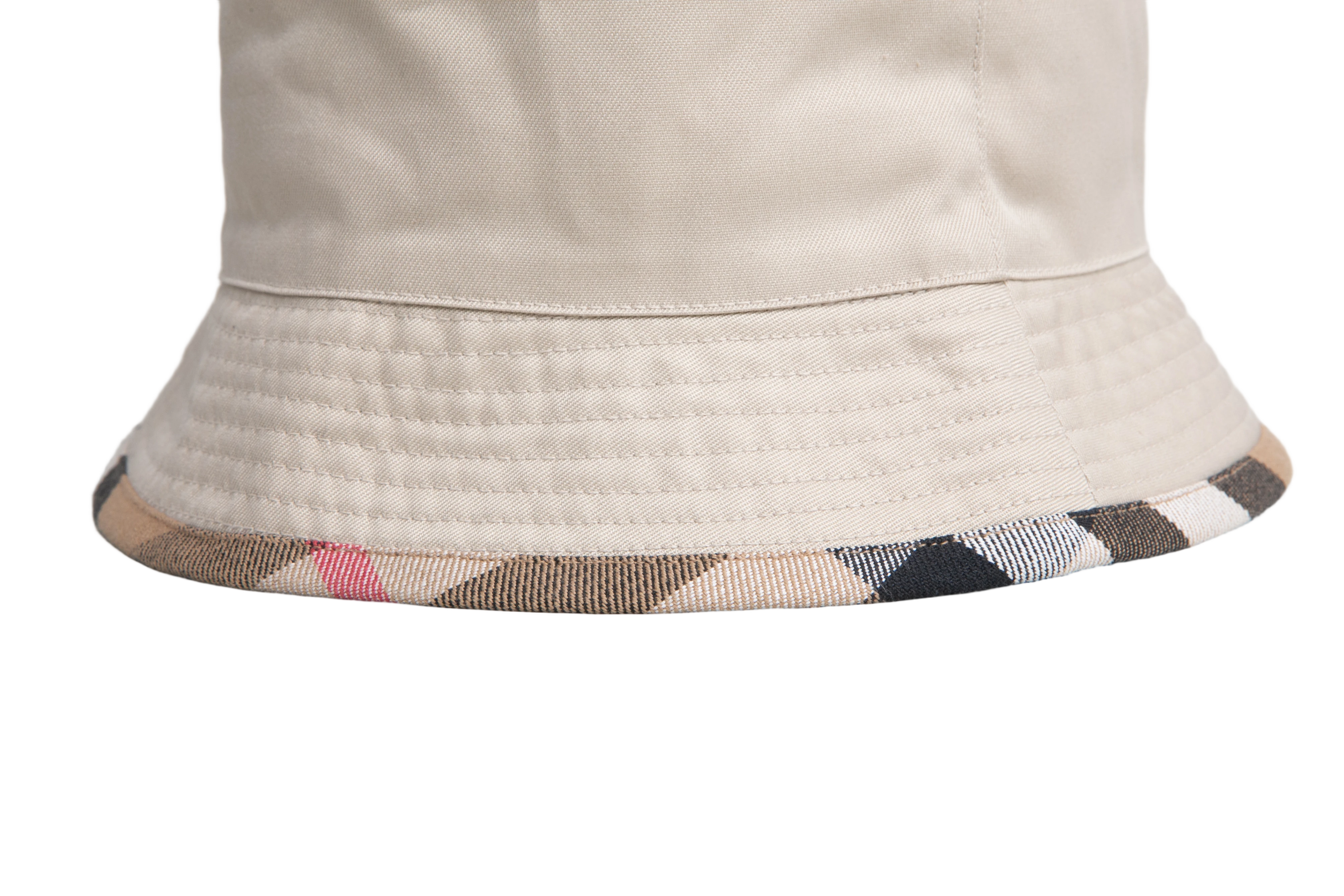 Chapéu modelo bucket em tecido bege, com interior e borda exibindo o icônico xadrez vintage da marca.
