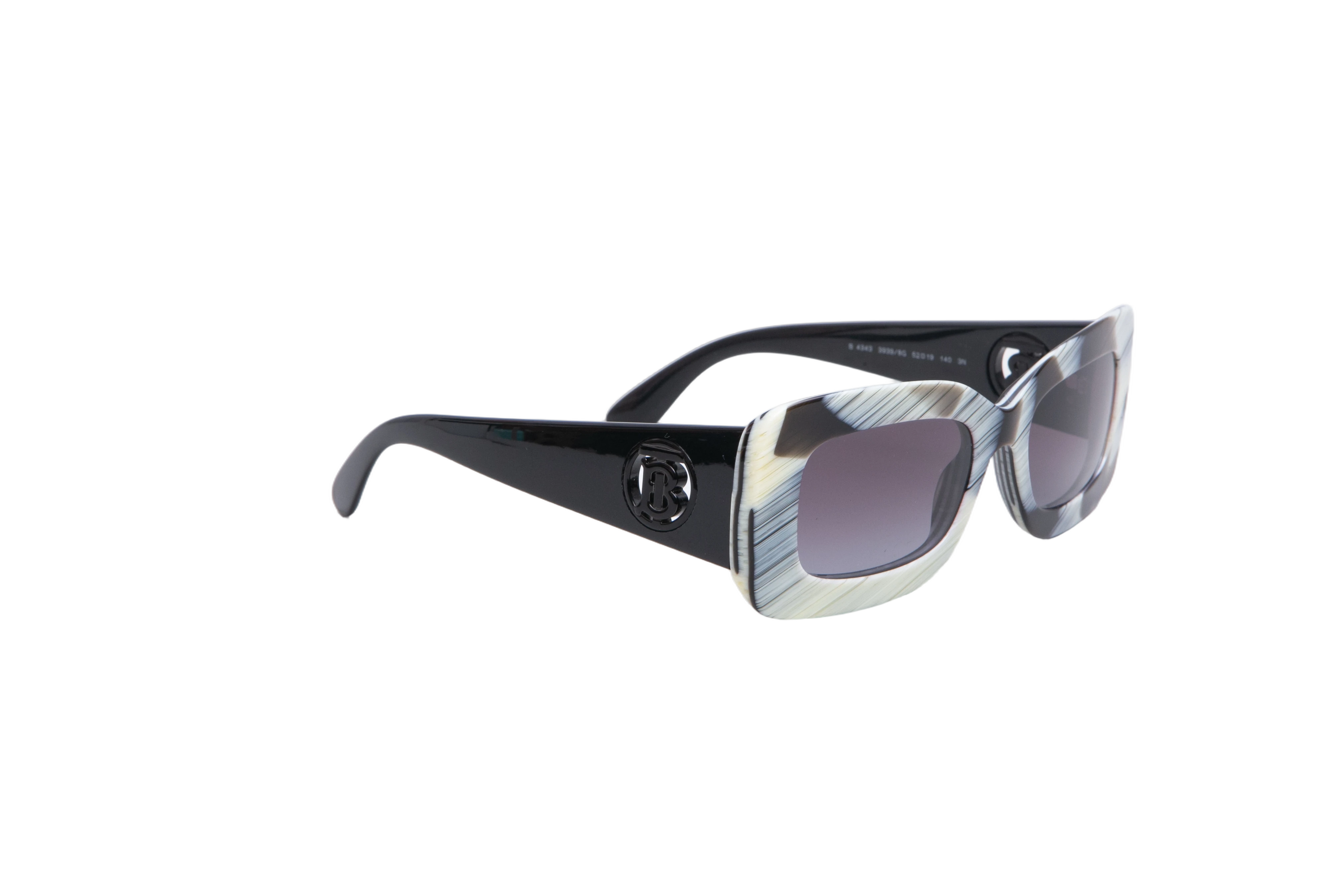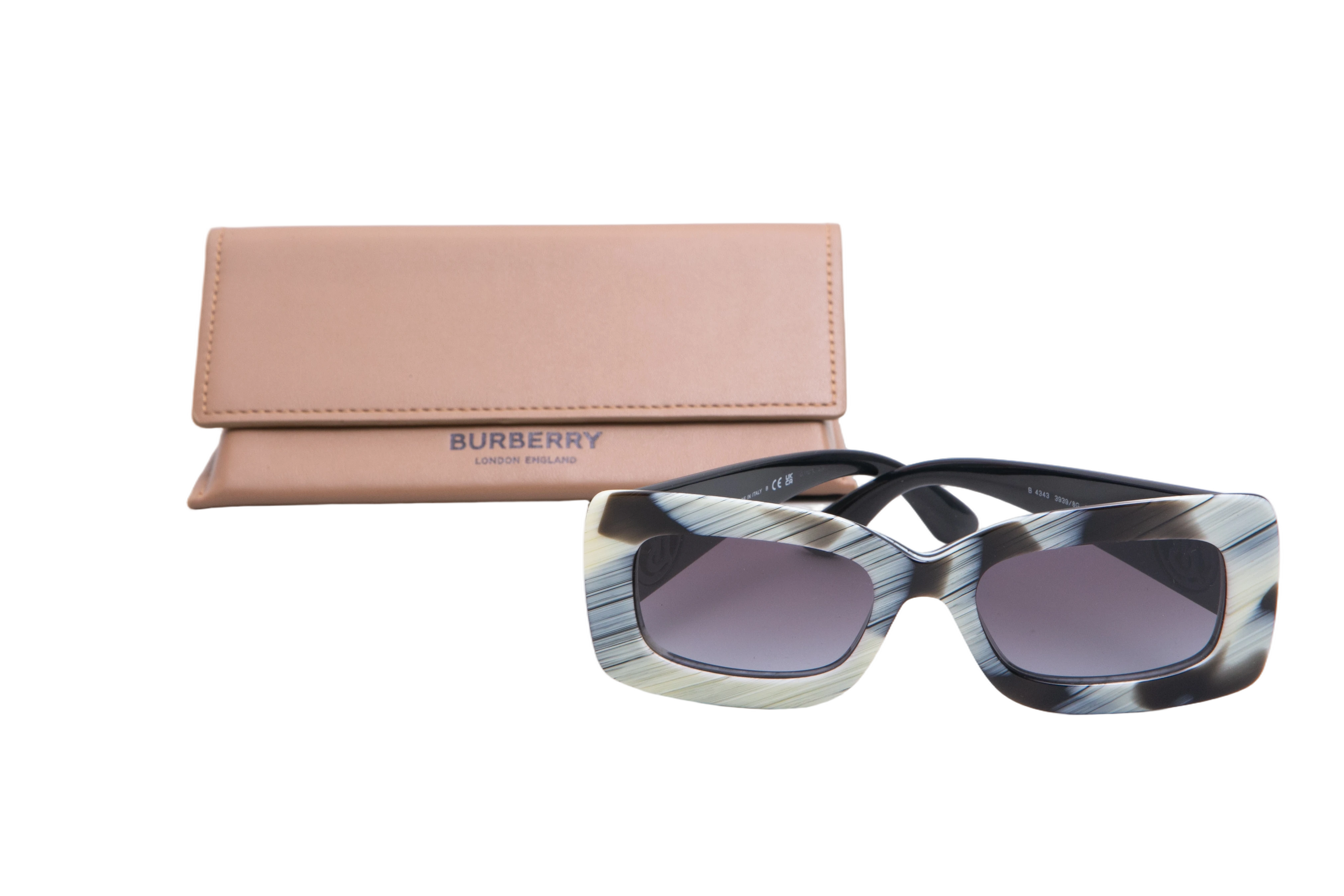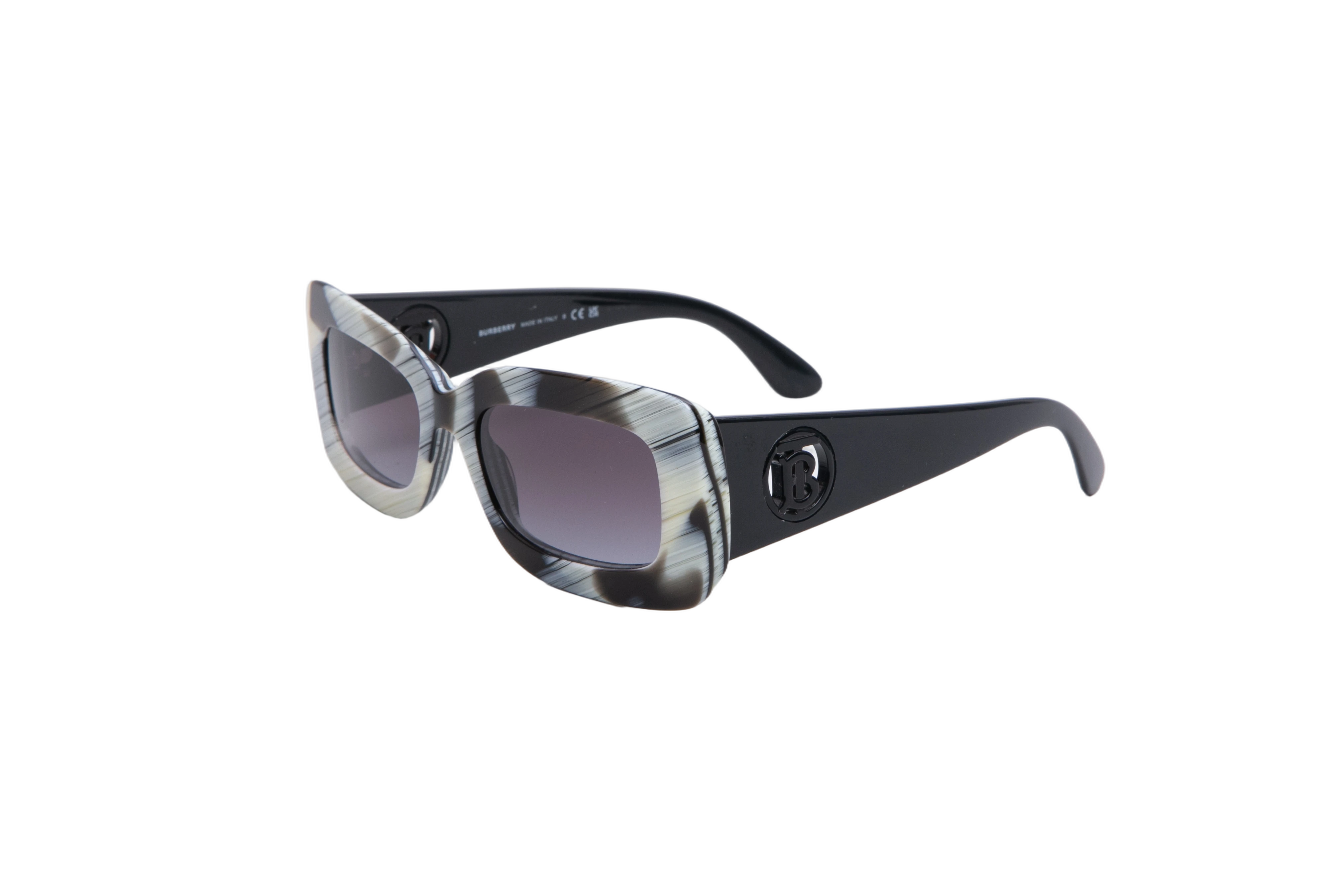 O óculos possui armação retangular em acetato na cor marfim com efeito horn (madrepérola). As hastes largas apresentam o logo Burberry na cor preta. As lentes em degradê cinza.