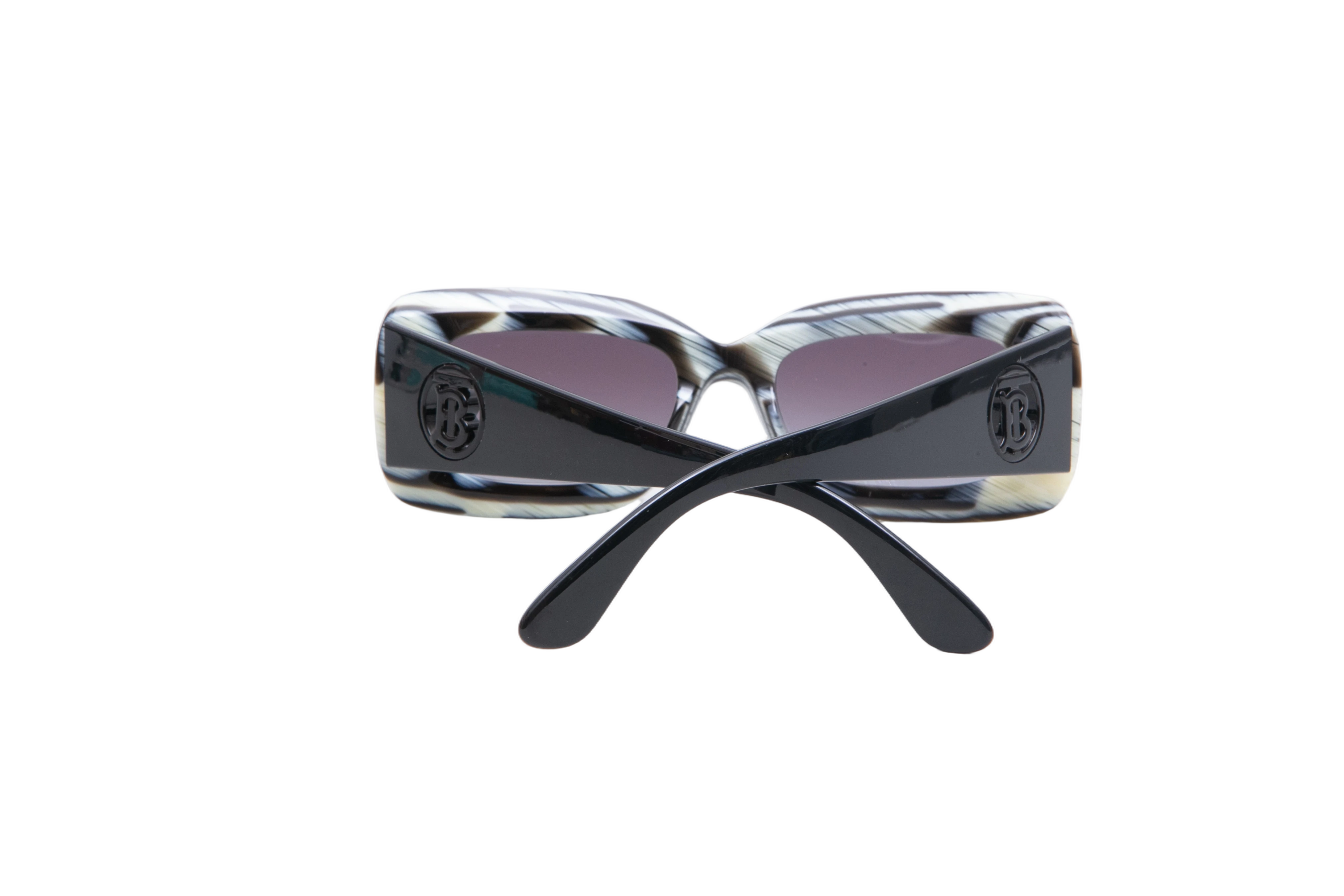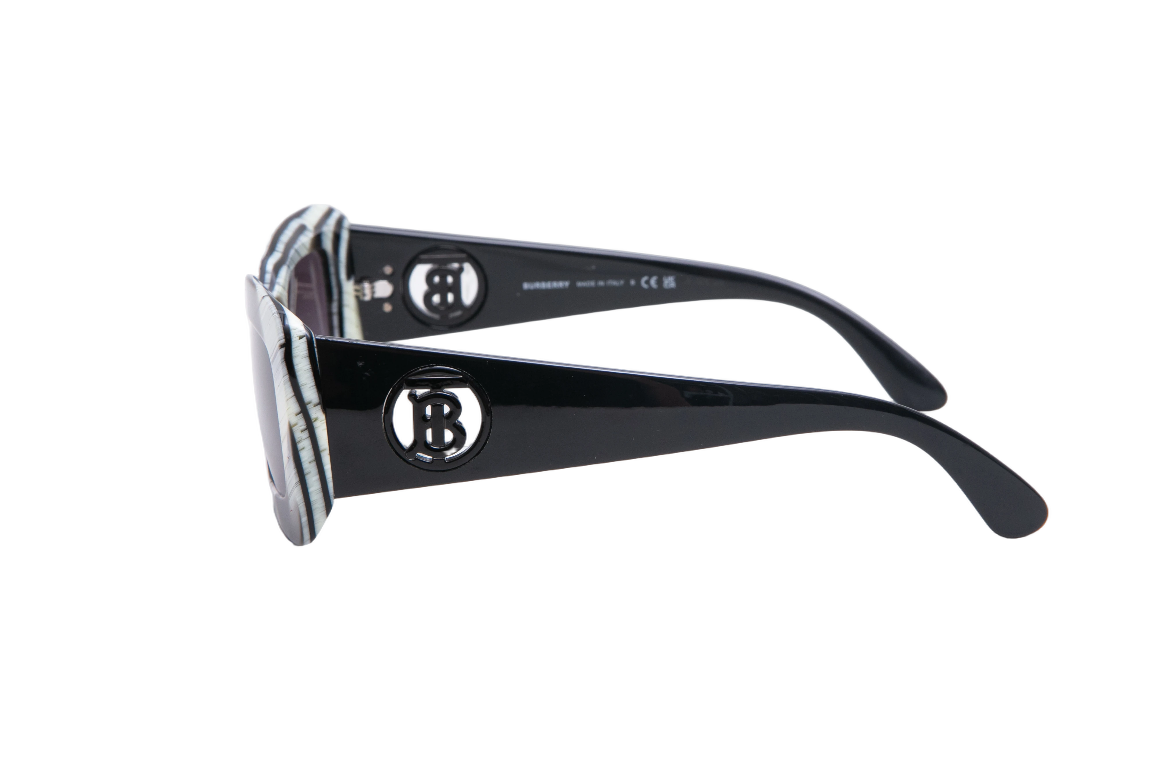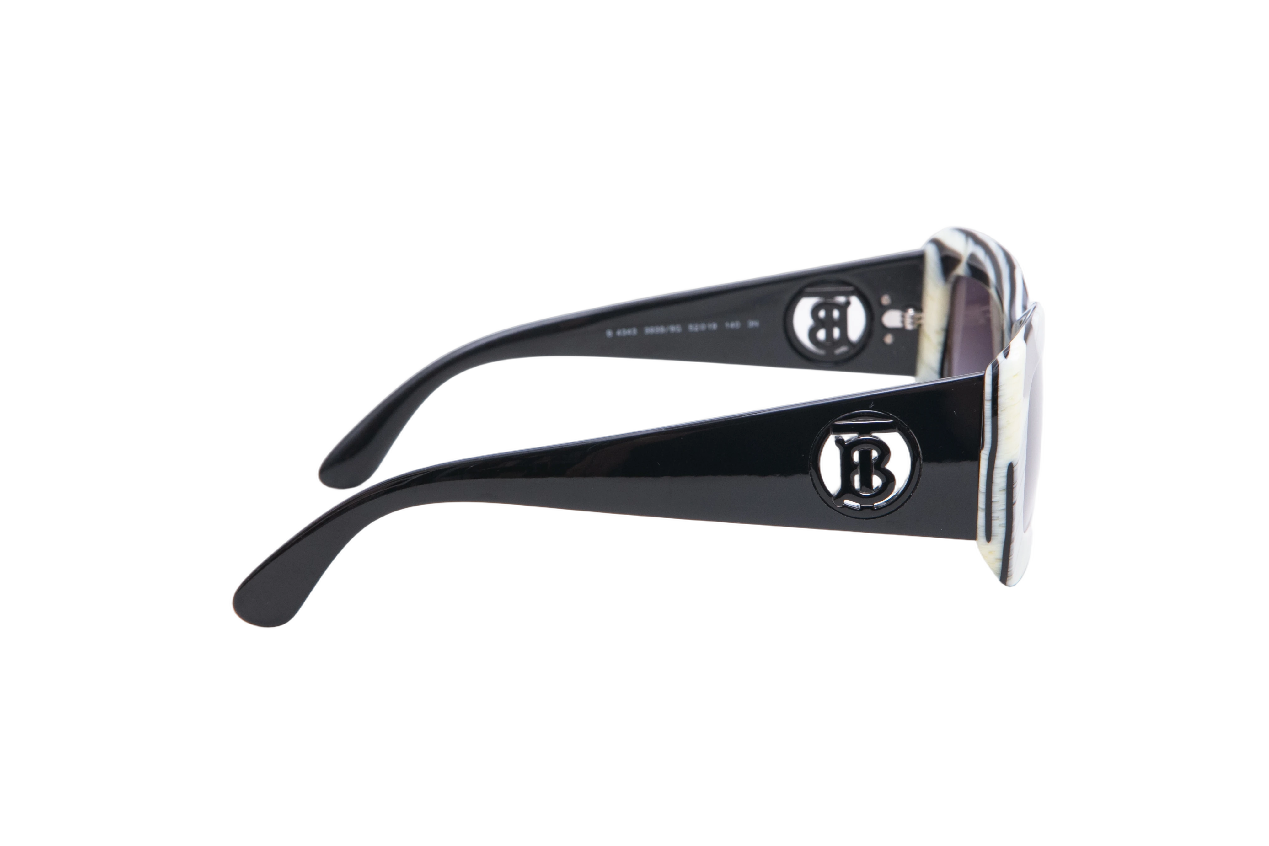 O óculos possui armação retangular em acetato na cor marfim com efeito horn (madrepérola). As hastes largas apresentam o logo Burberry na cor preta. As lentes em degradê cinza.