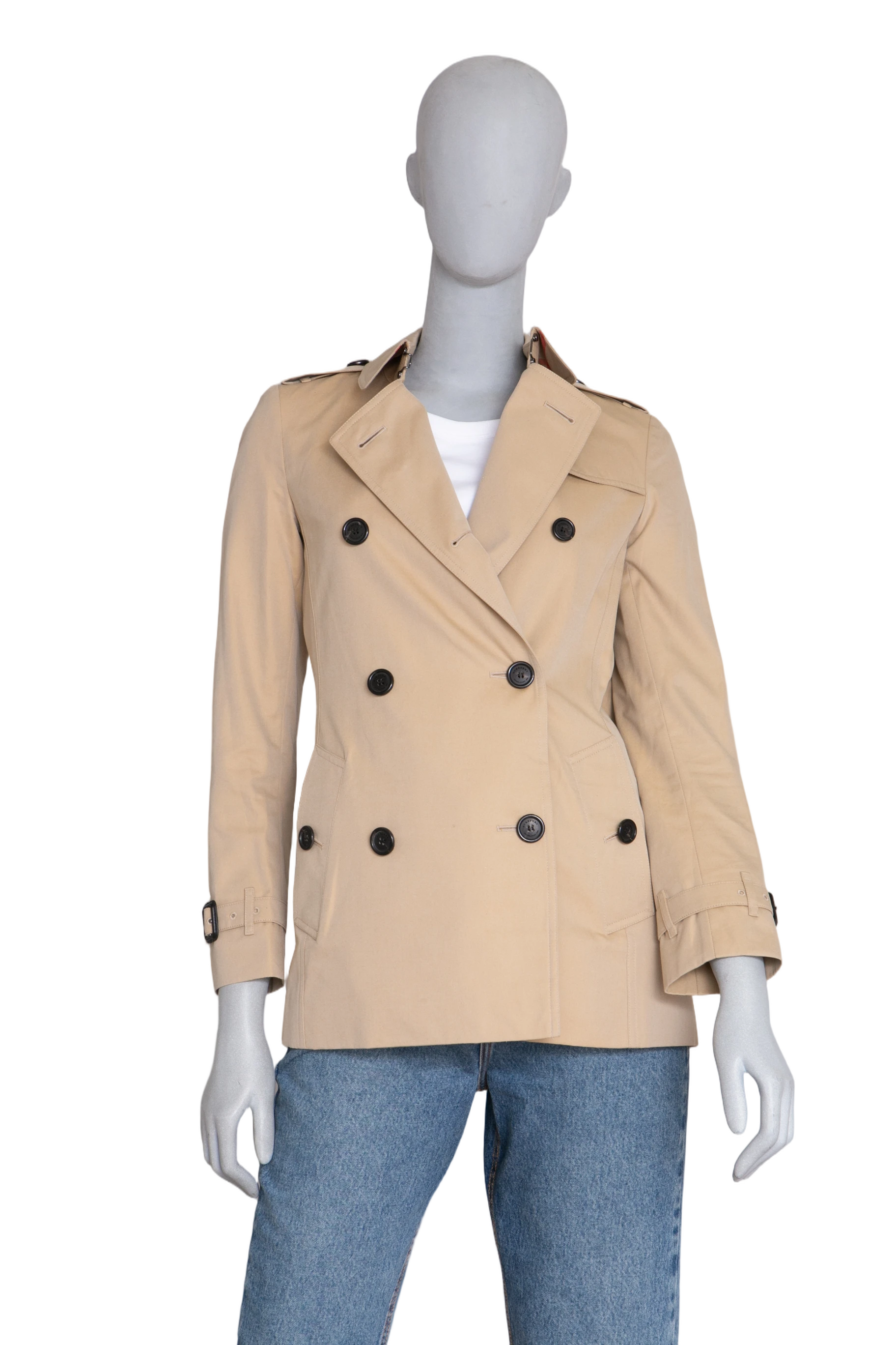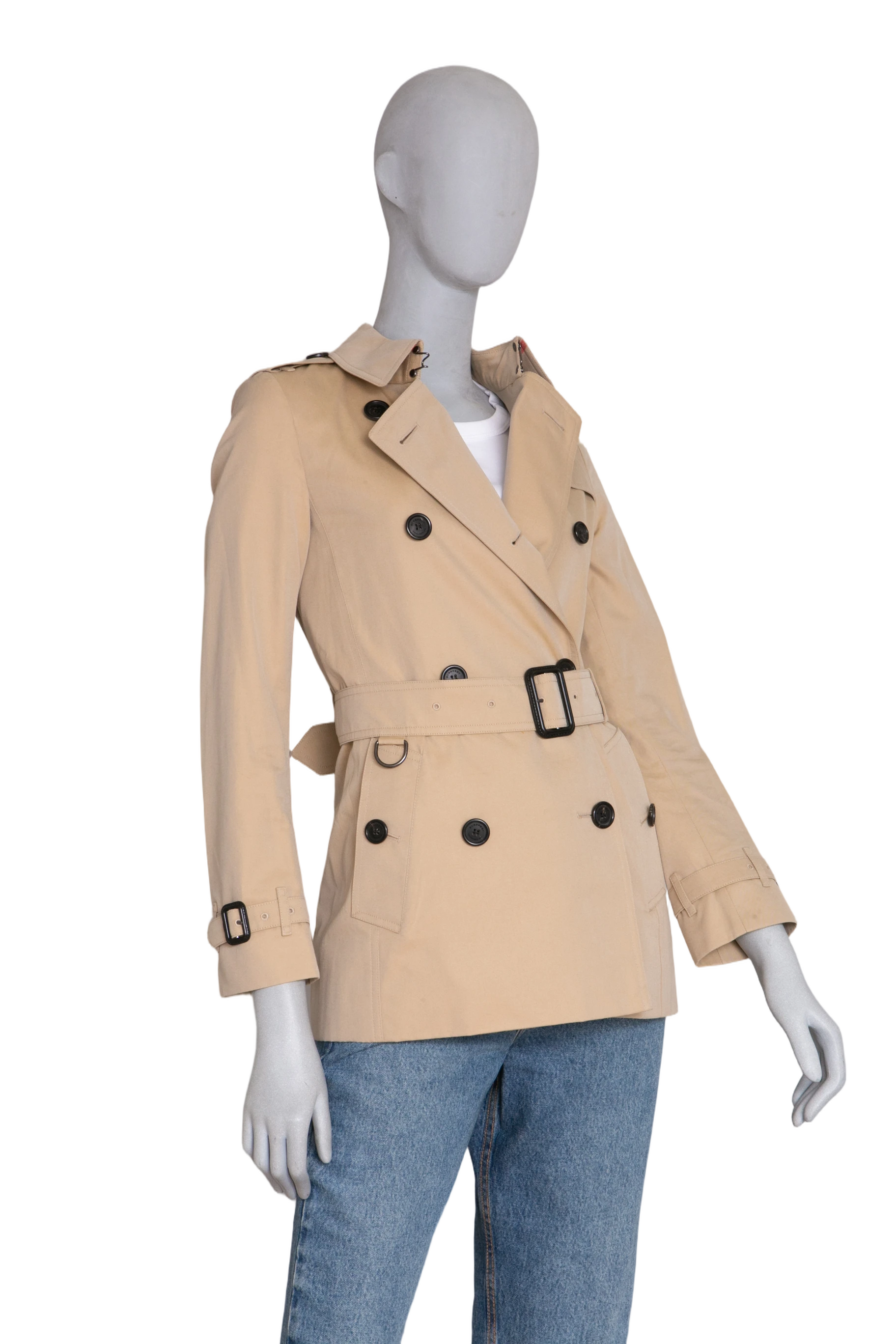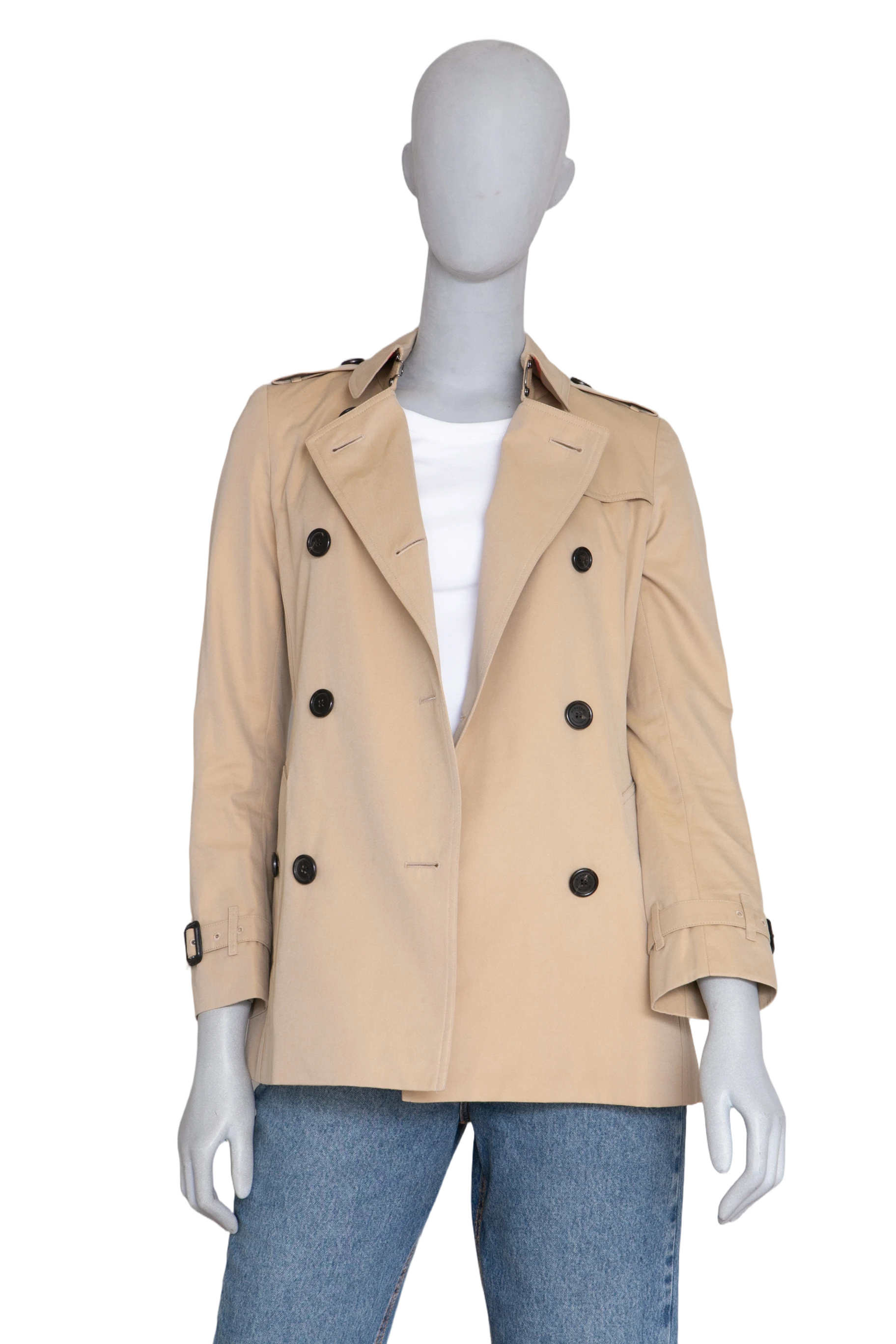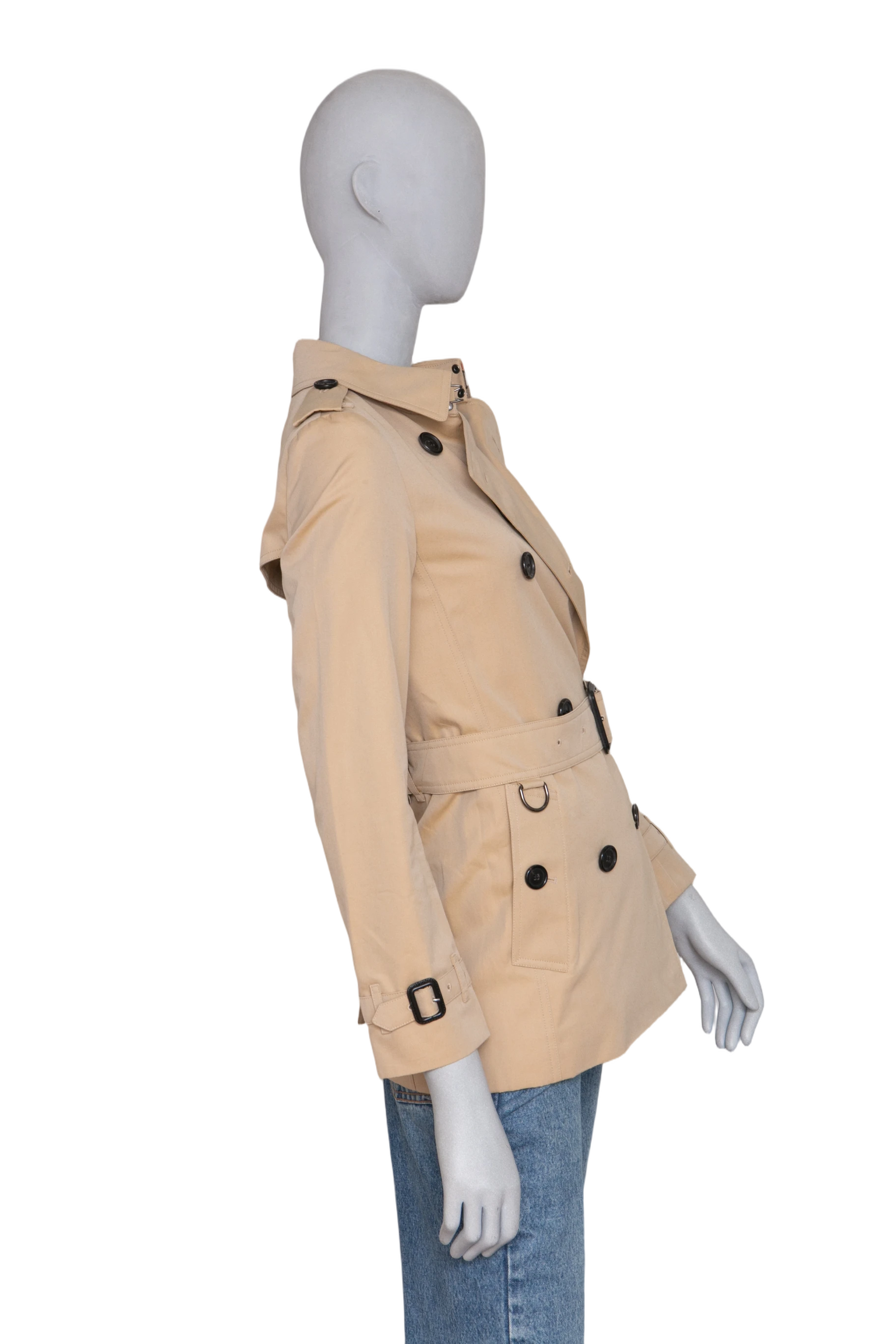 Casaco estilo trench coat em tecido bege, com modelagem clássica e comprimento médio. Possui abotoamento duplo frontal, cinto com fivela ajustável na cintura e detalhes em fivelas nos punhos.