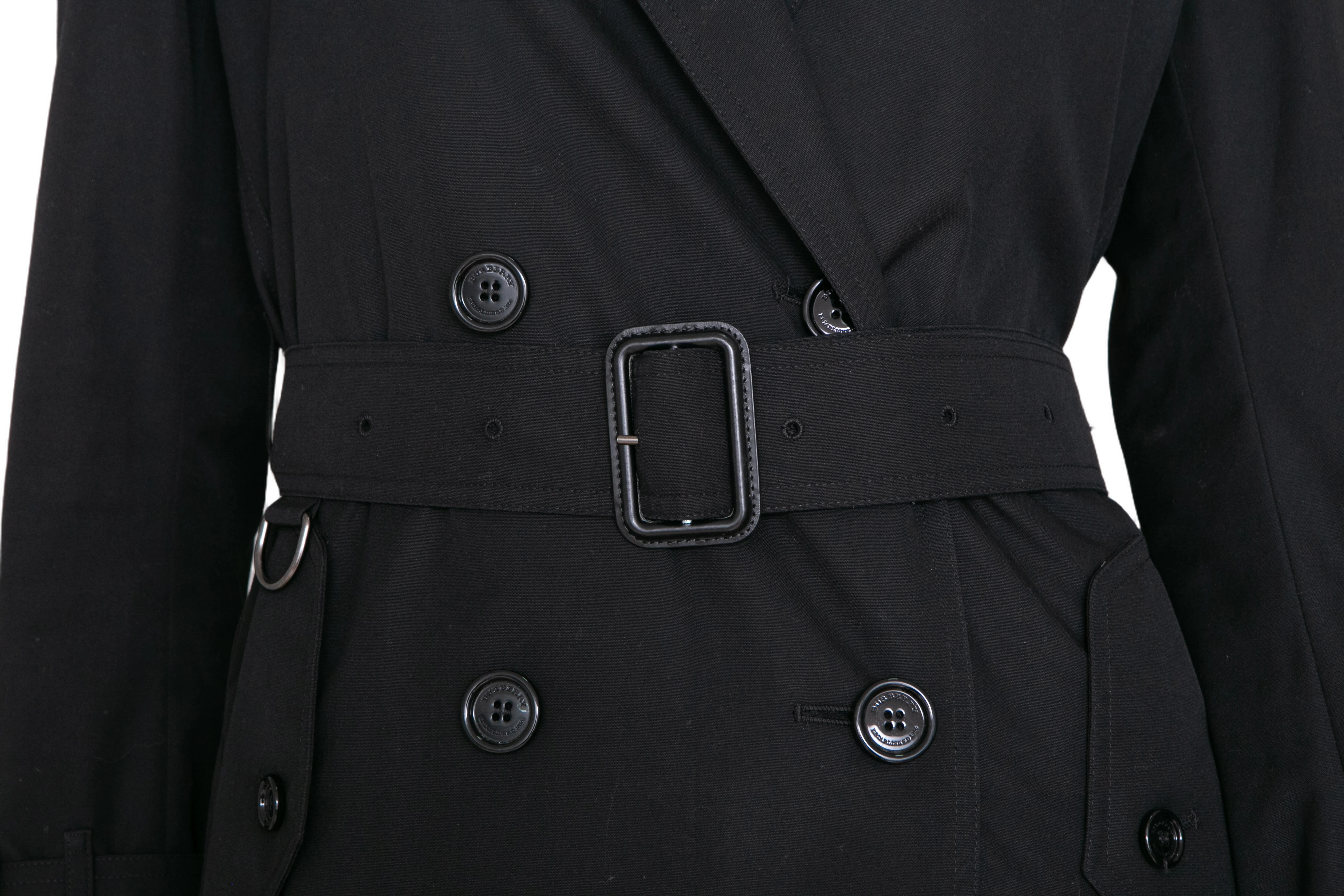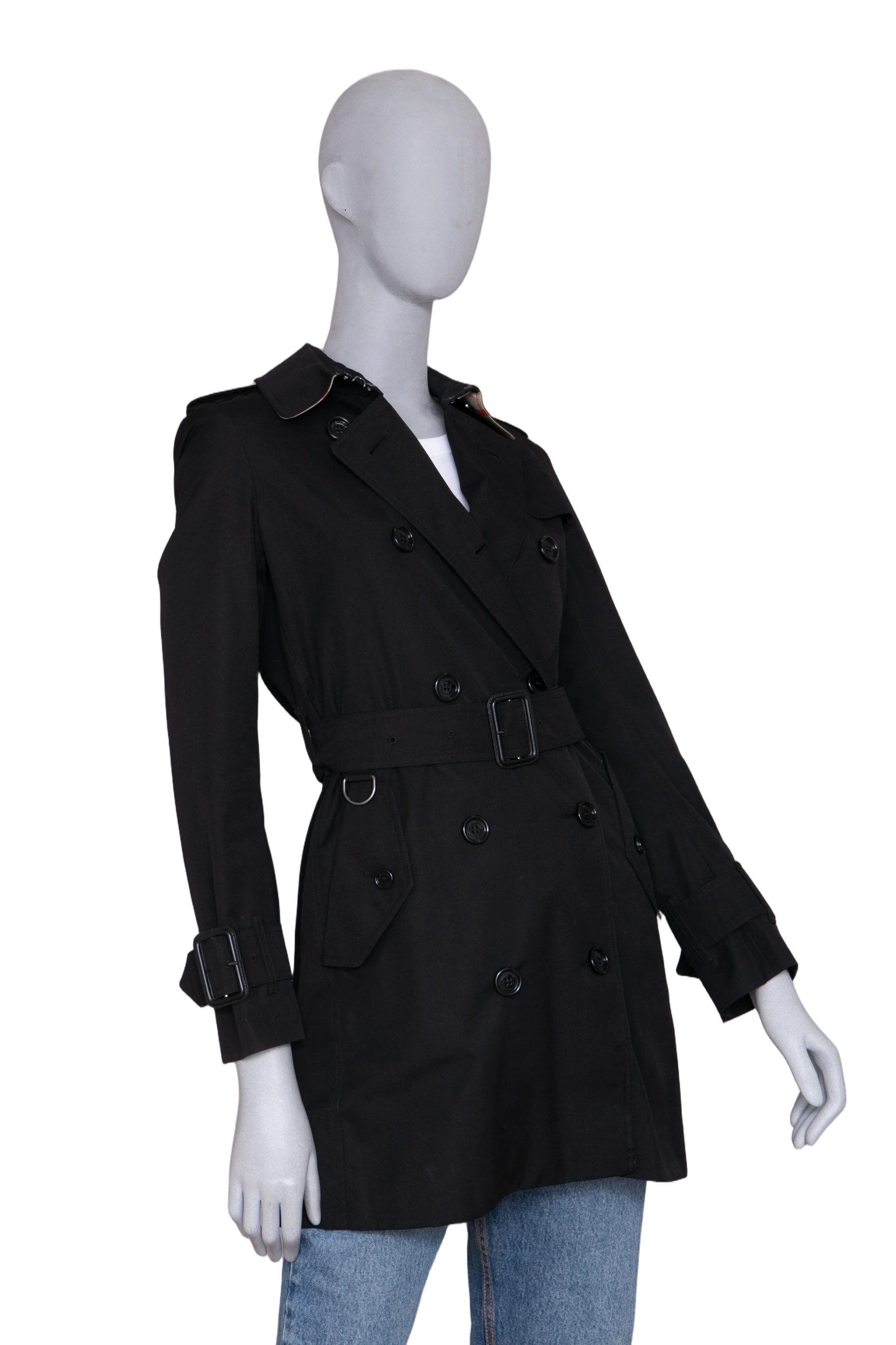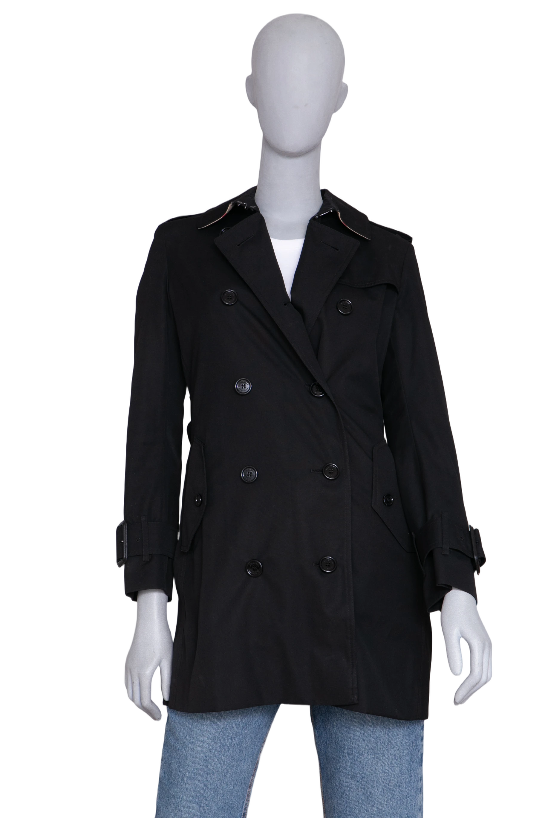 Casaco estilo trench coat em tecido preto, com modelagem clássica e comprimento médio. Possui abotoamento duplo frontal, cinto com fivela ajustável na cintura, bolsos laterais e detalhes em fivelas nos punhos. Apresenta ainda gola estruturada com forro interno xadrez icônico da marca.