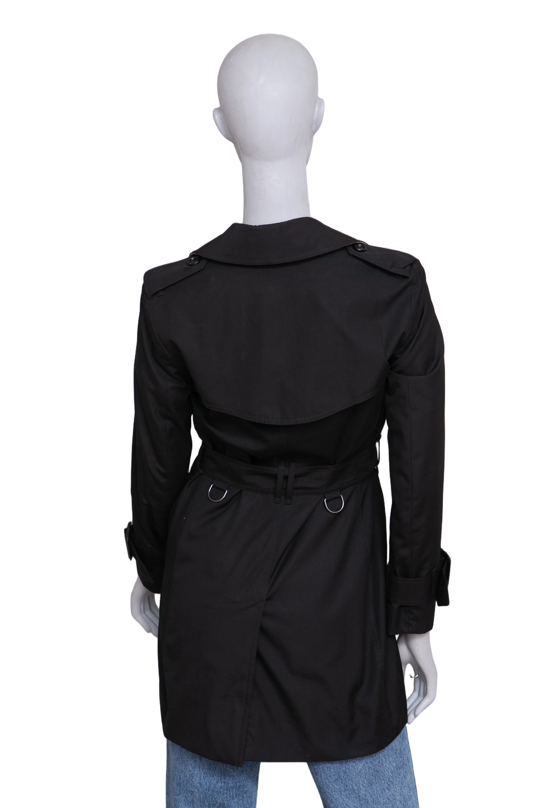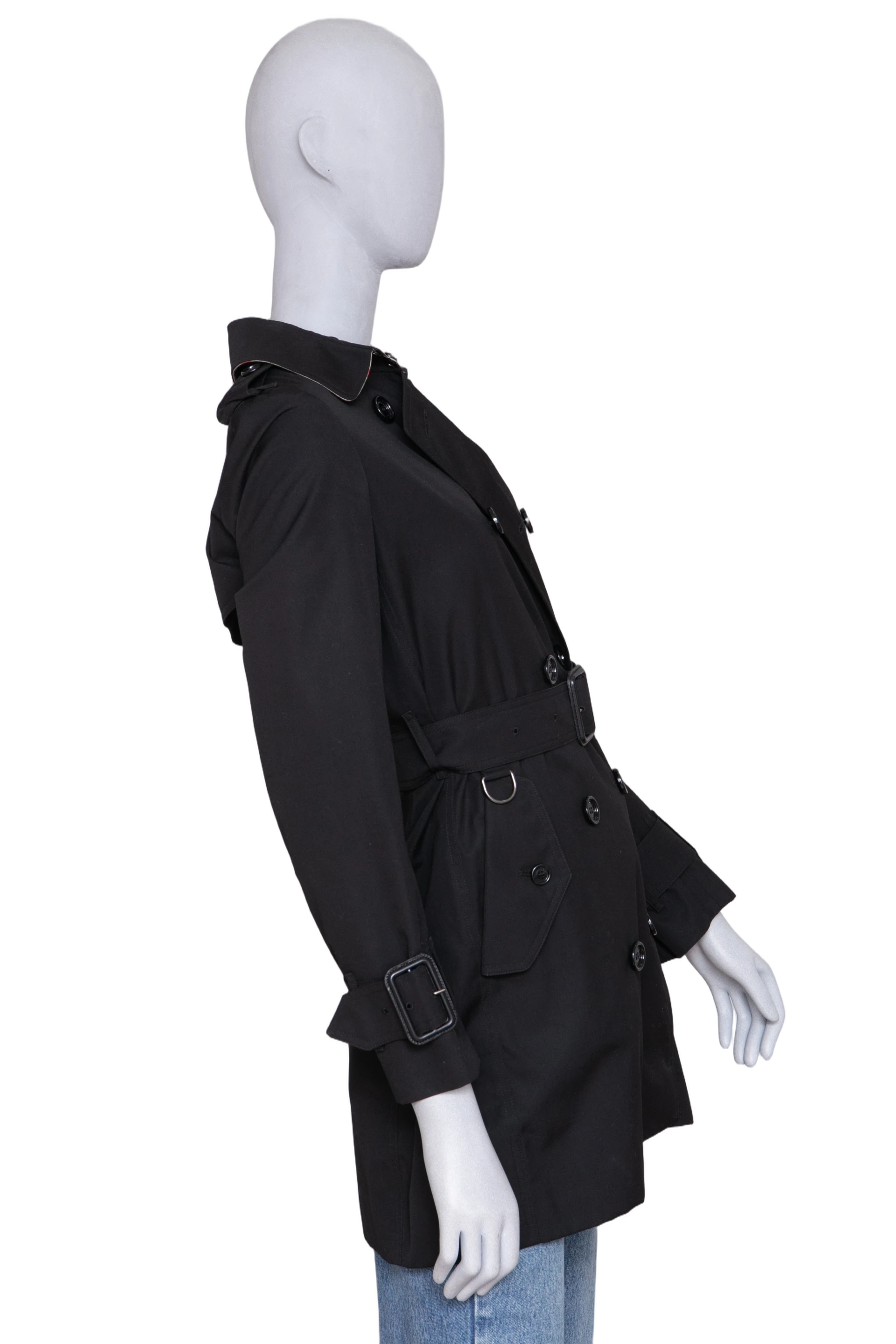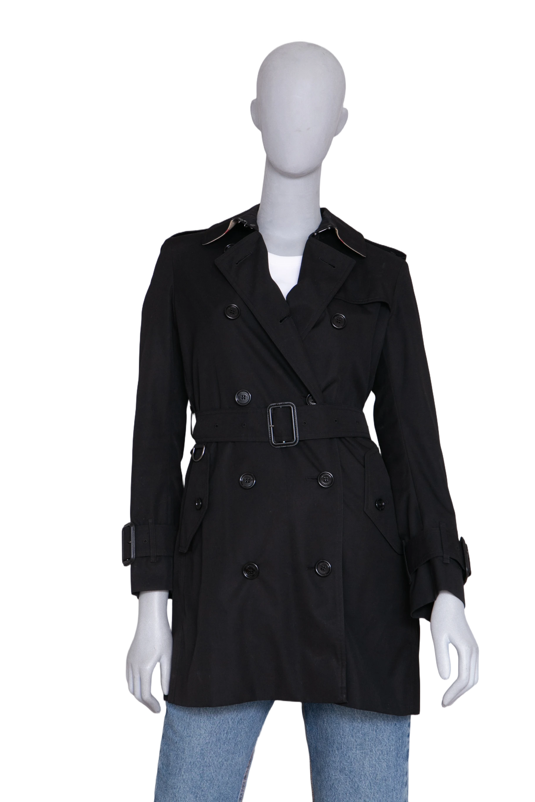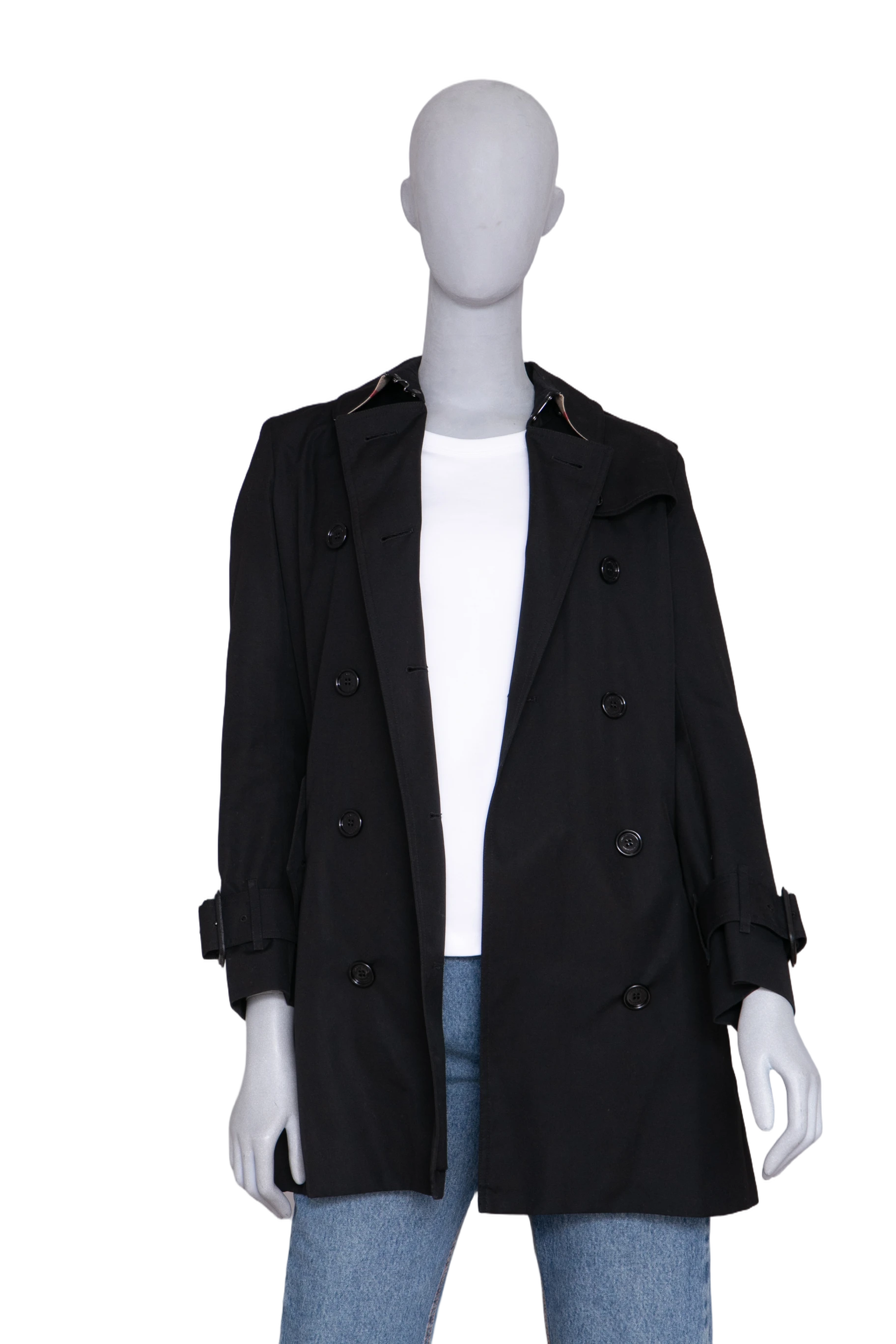 Casaco estilo trench coat em tecido preto, com modelagem clássica e comprimento médio. Possui abotoamento duplo frontal, cinto com fivela ajustável na cintura, bolsos laterais e detalhes em fivelas nos punhos. Apresenta ainda gola estruturada com forro interno xadrez icônico da marca.