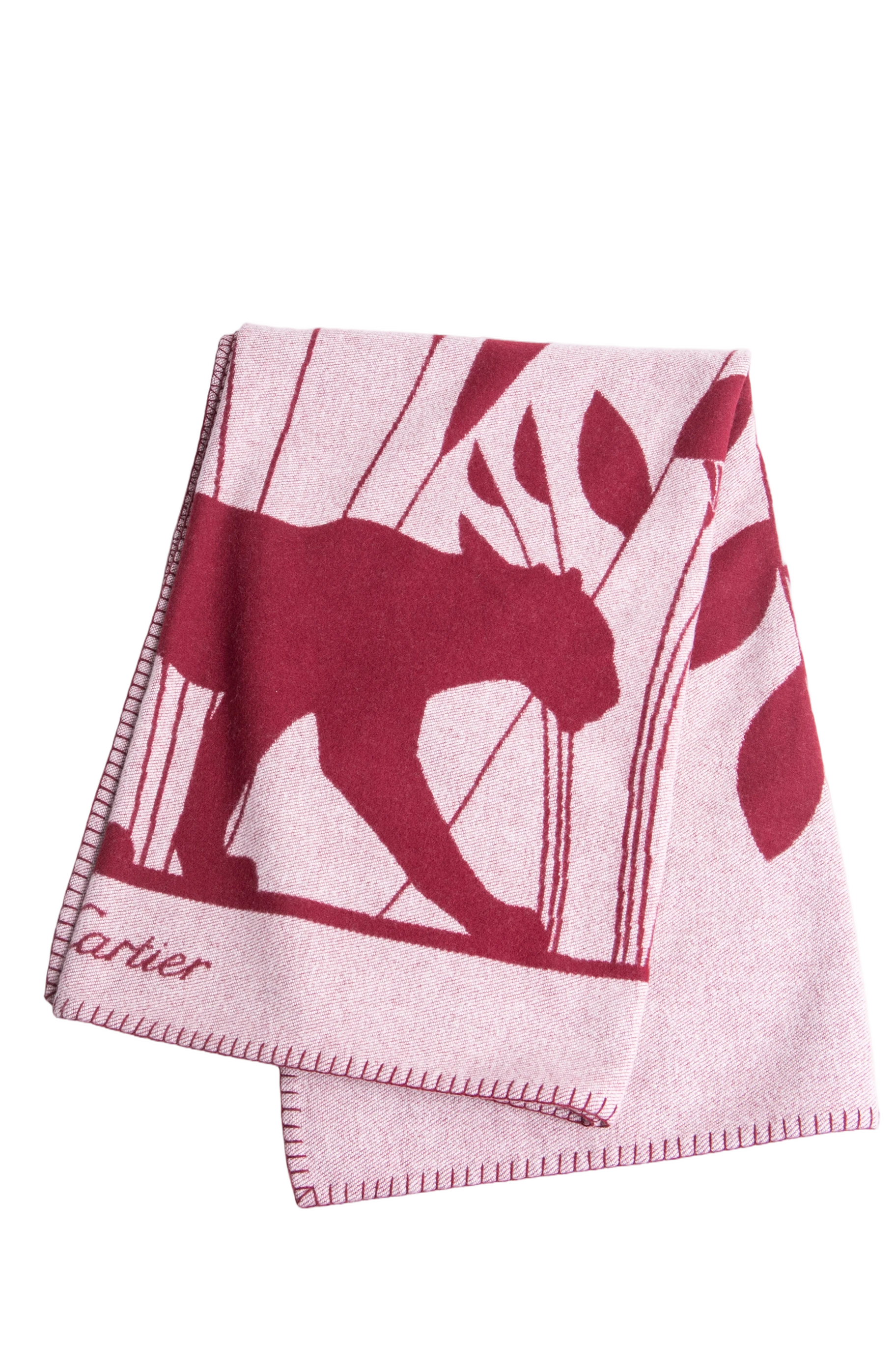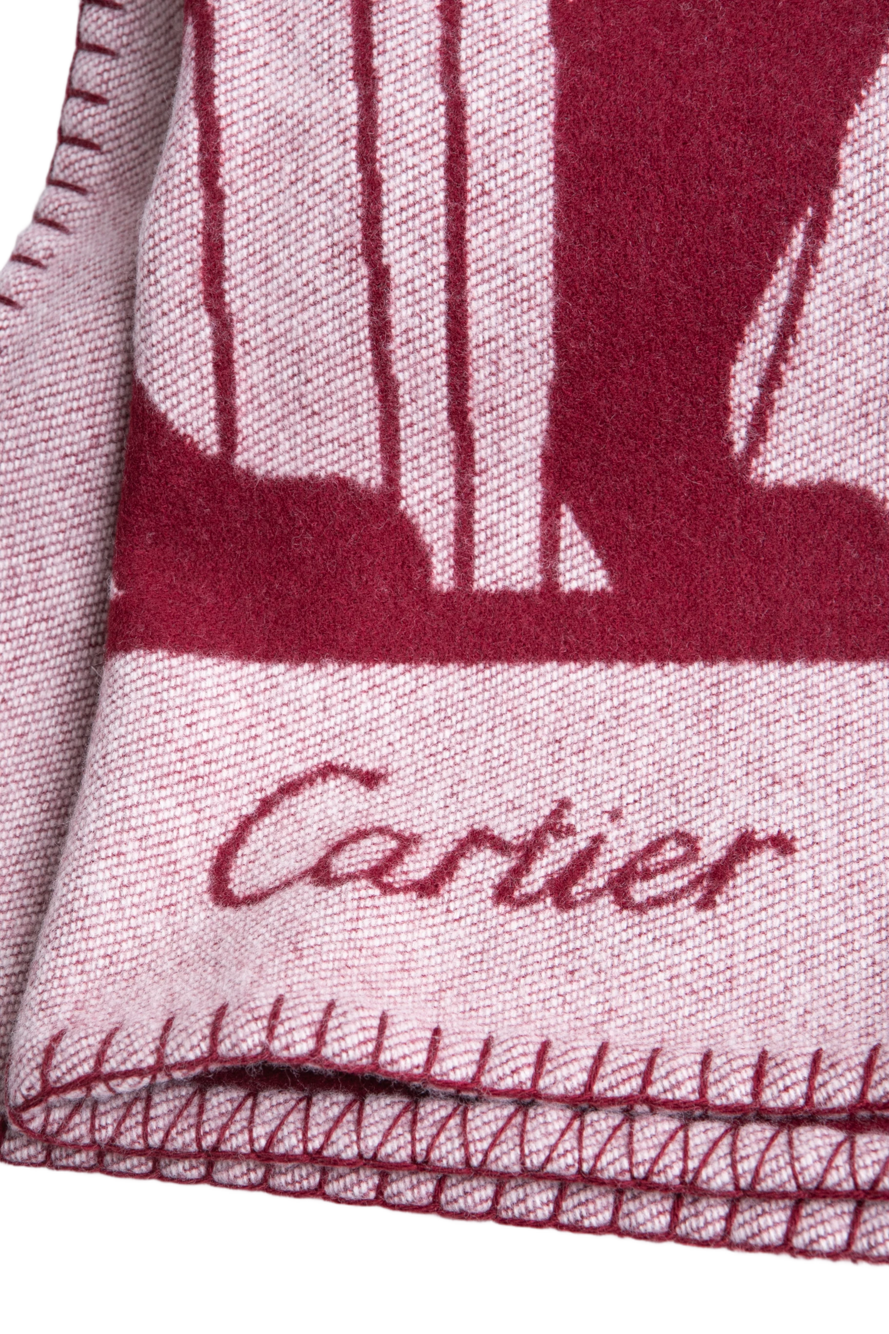 Manta Cartier confeccionada em tecido, em tons de rosa e vinho. Apresenta estampa de pantera, com assinatura Cartier discreta. Possui bordas com acabamento em ponto aparente.