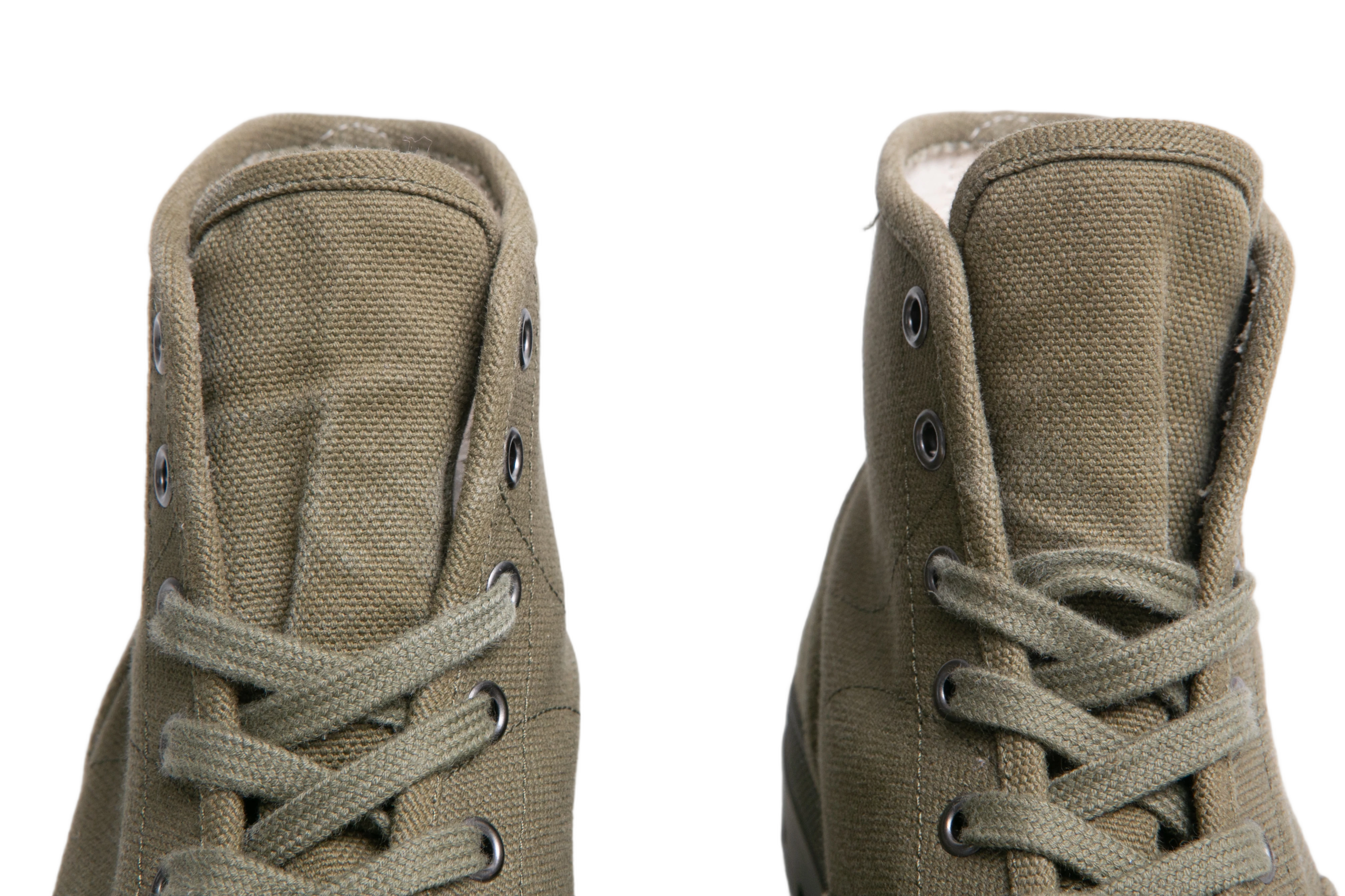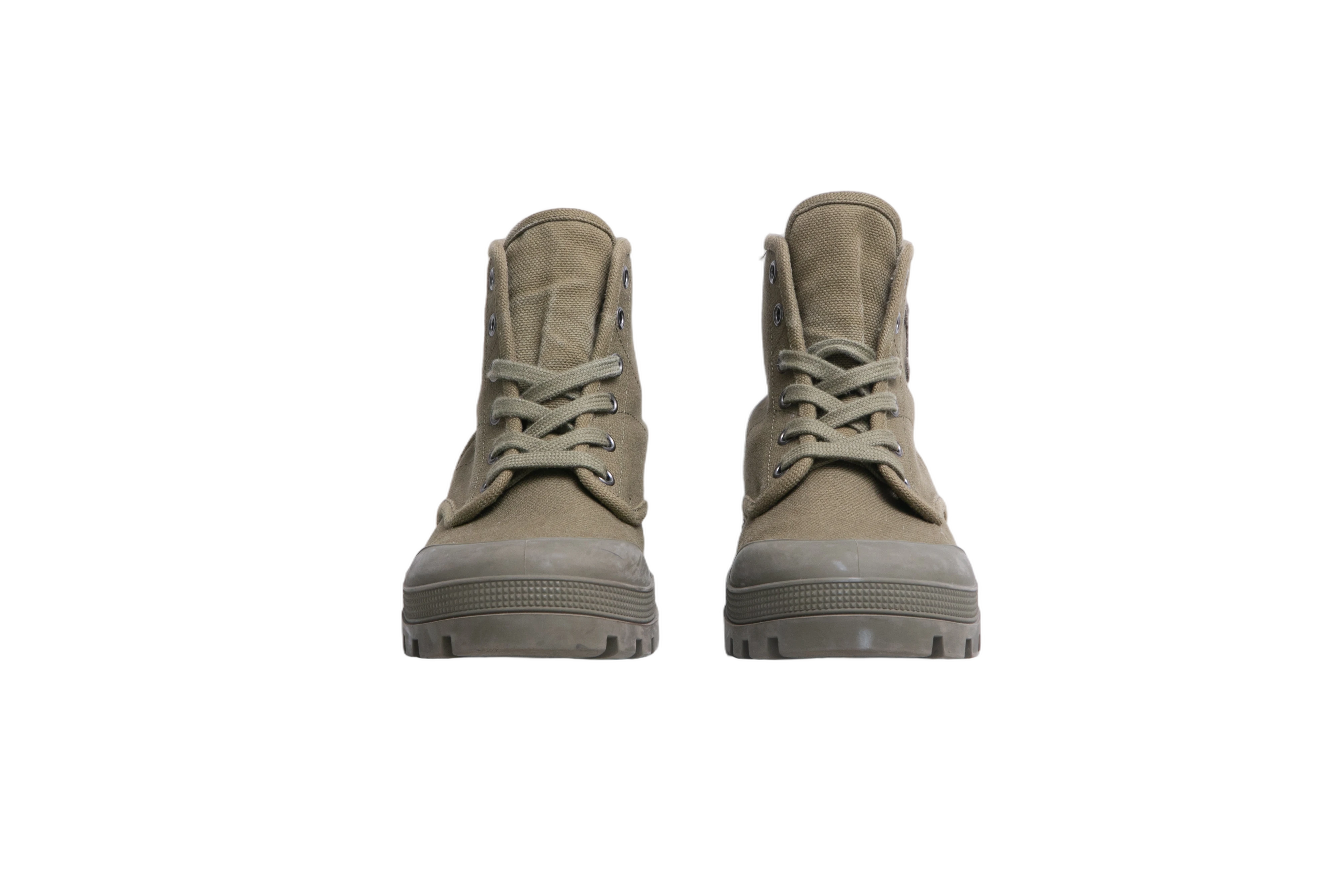 Bota em lona verde, com cano médio e solado robusto em borracha tratorada. O modelo possui biqueira reforçada, fechamento por cadarço com ilhoses metálicos e detalhe do logo Triomphe aplicado na lateral.