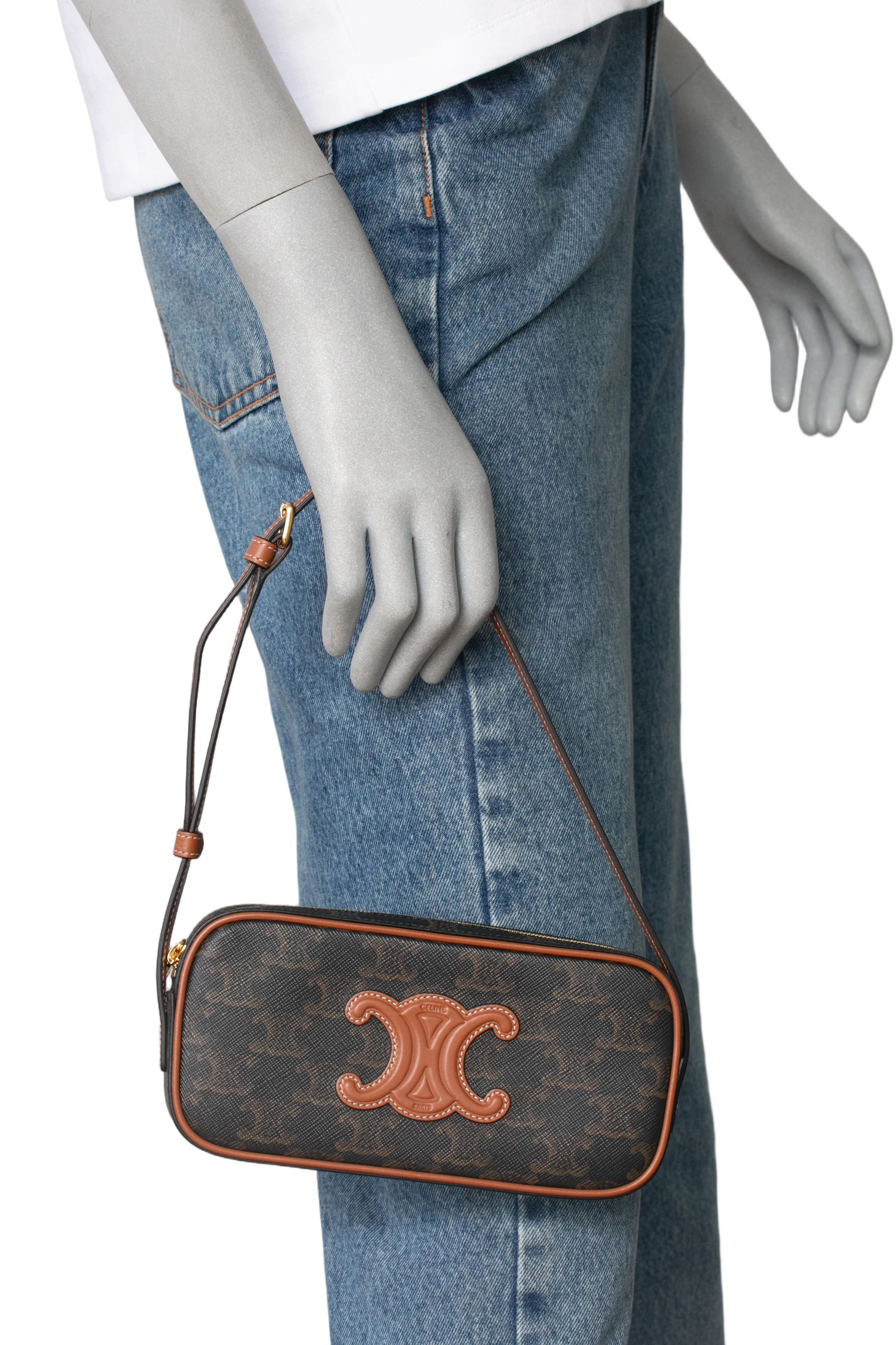 Bolsa confeccionada em canvas com o monograma Triomphe na cor marrom escuro e acabamentos em couro caramelo. Fechamento em zíper, alça curta ajustável , para uso shoulder e handle bag
