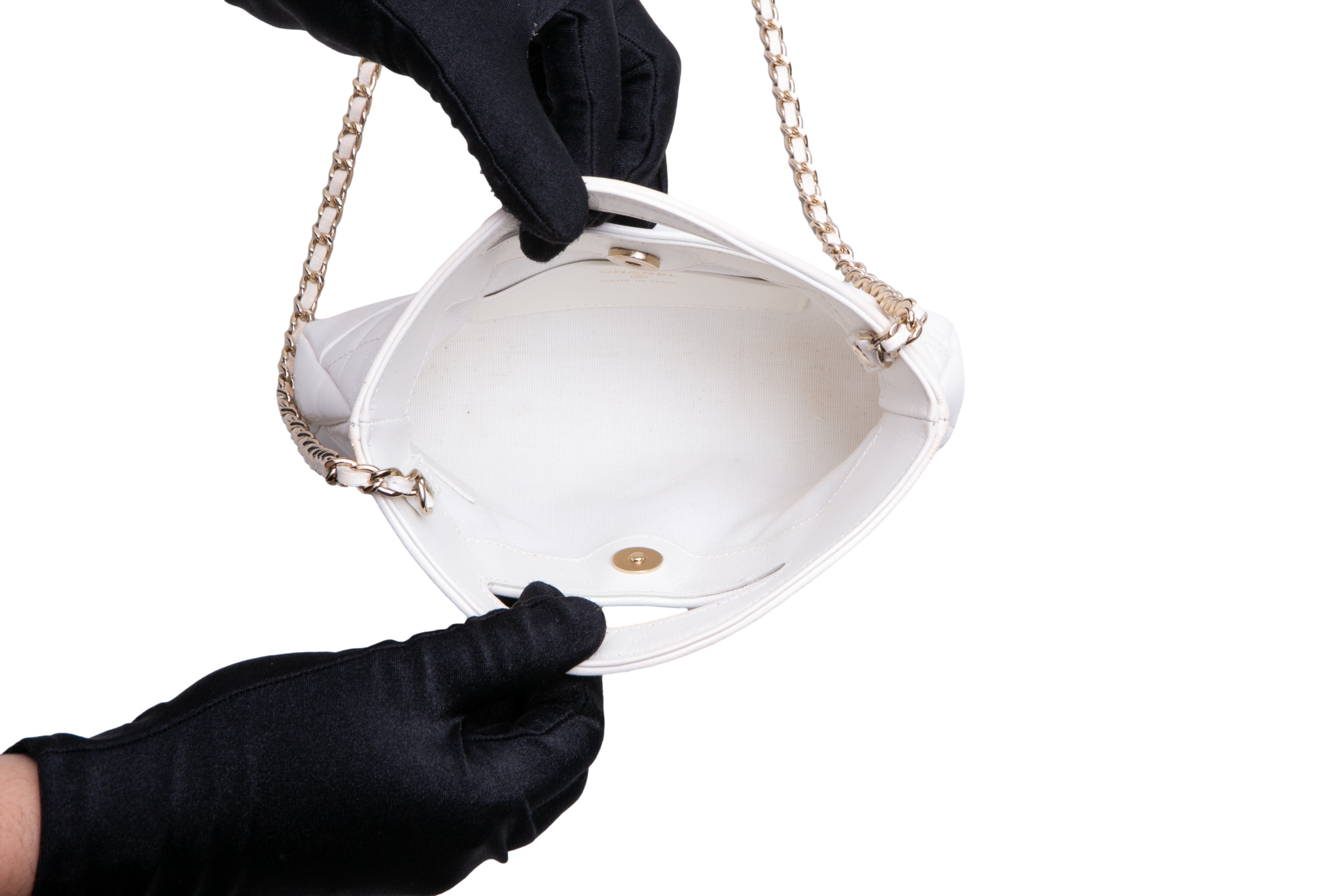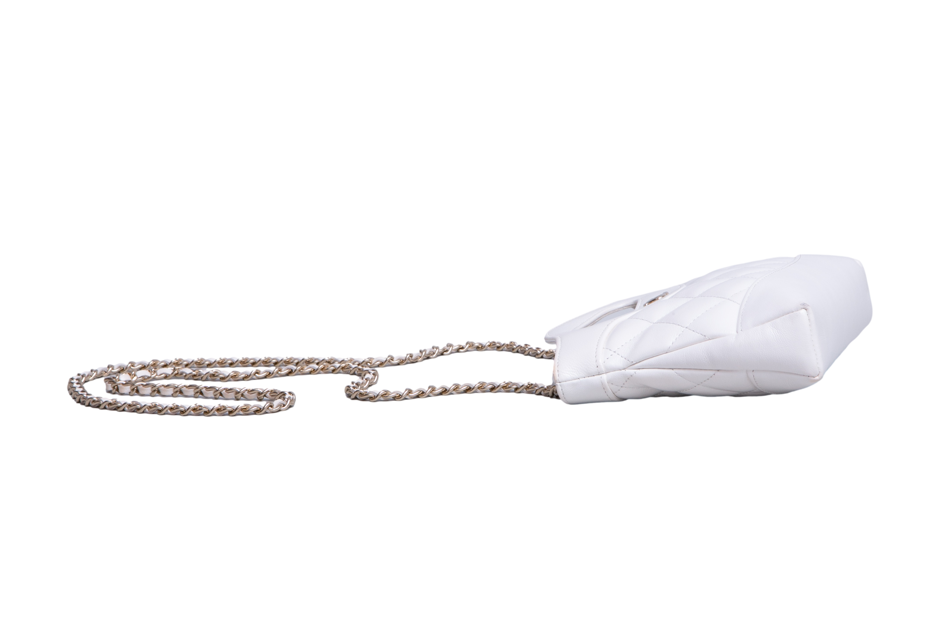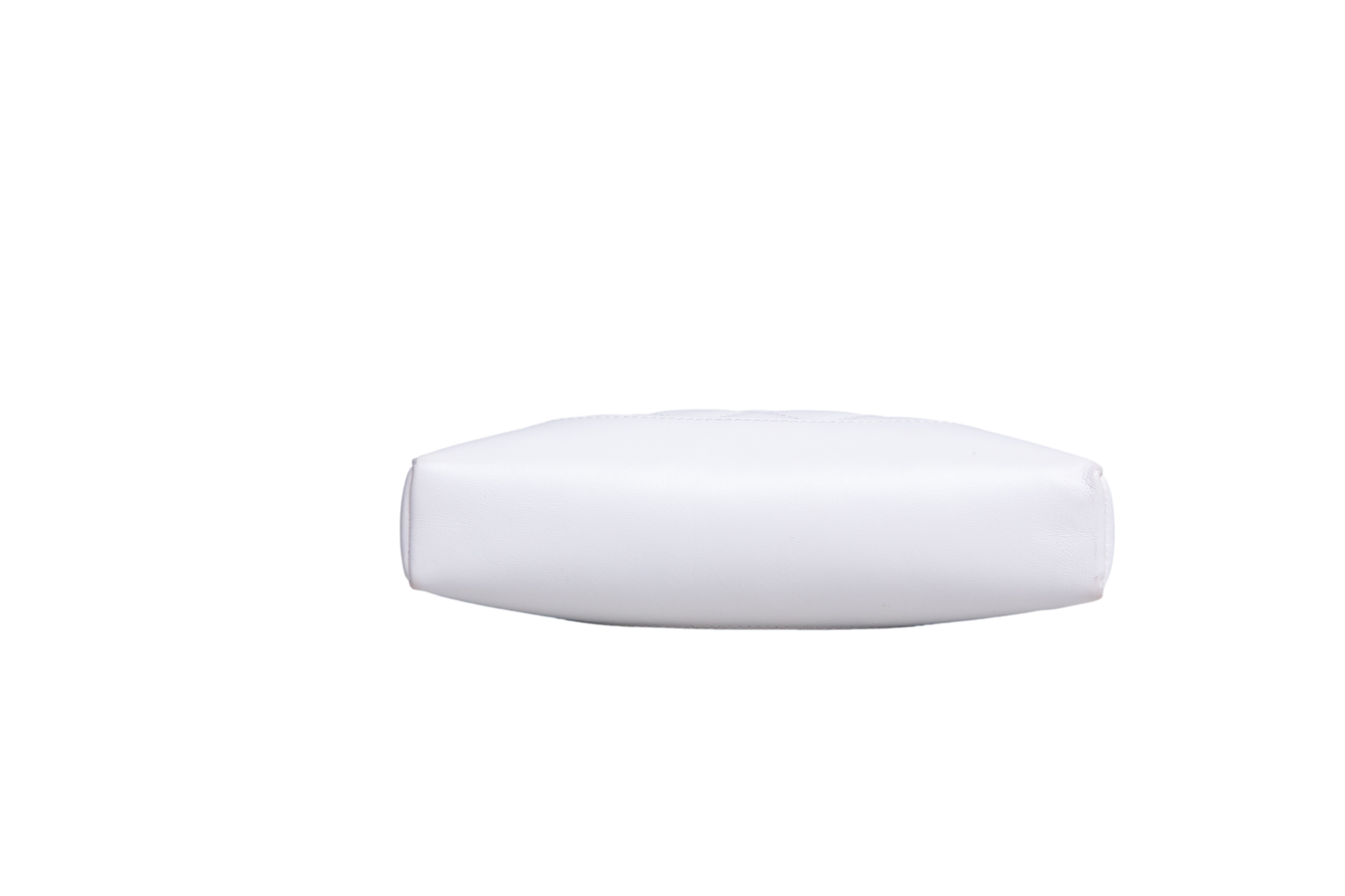 Bolsa confeccionada em couro matelassê branco, fecho de botão magnético com alça superior e alça de corrente entrelaçada.