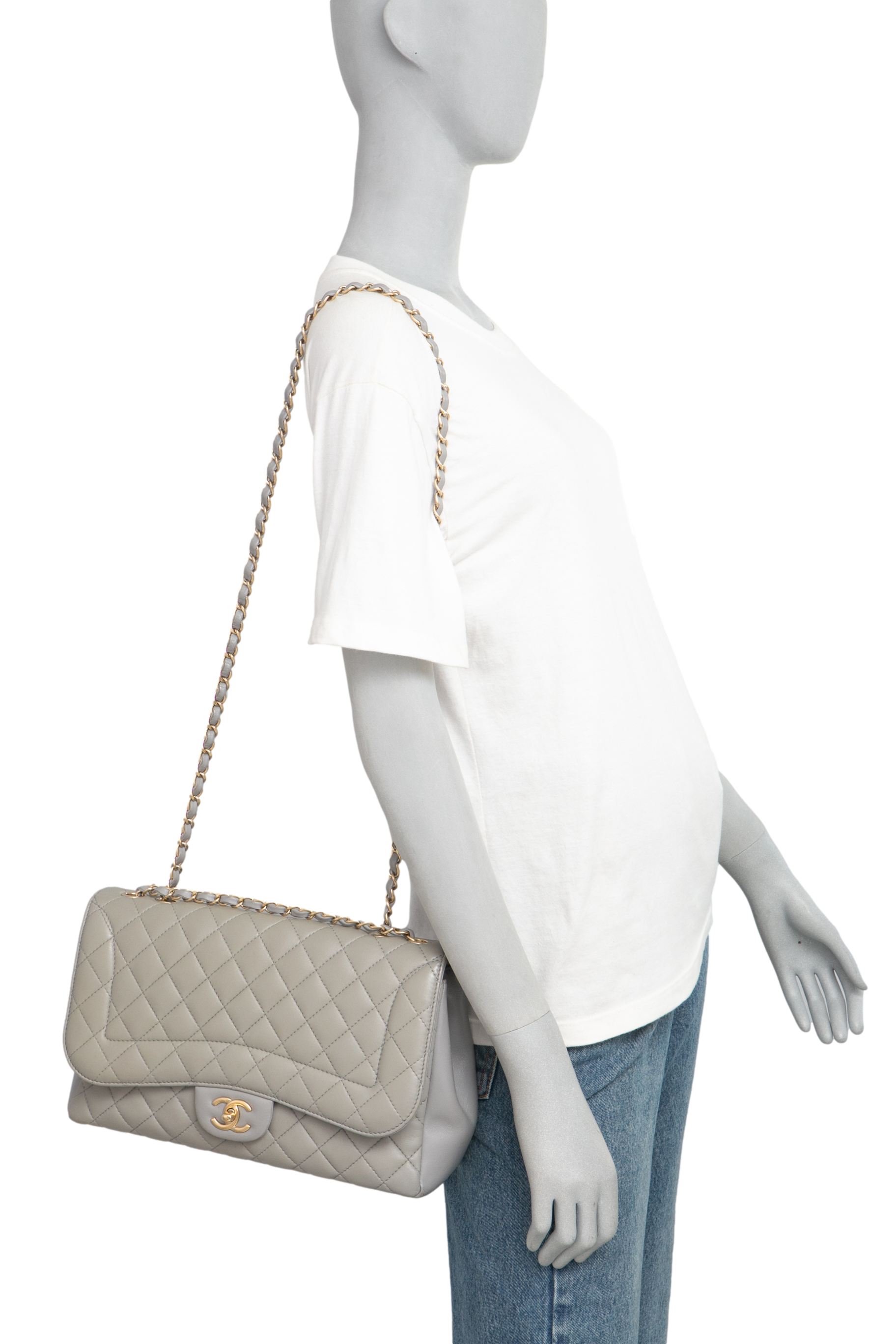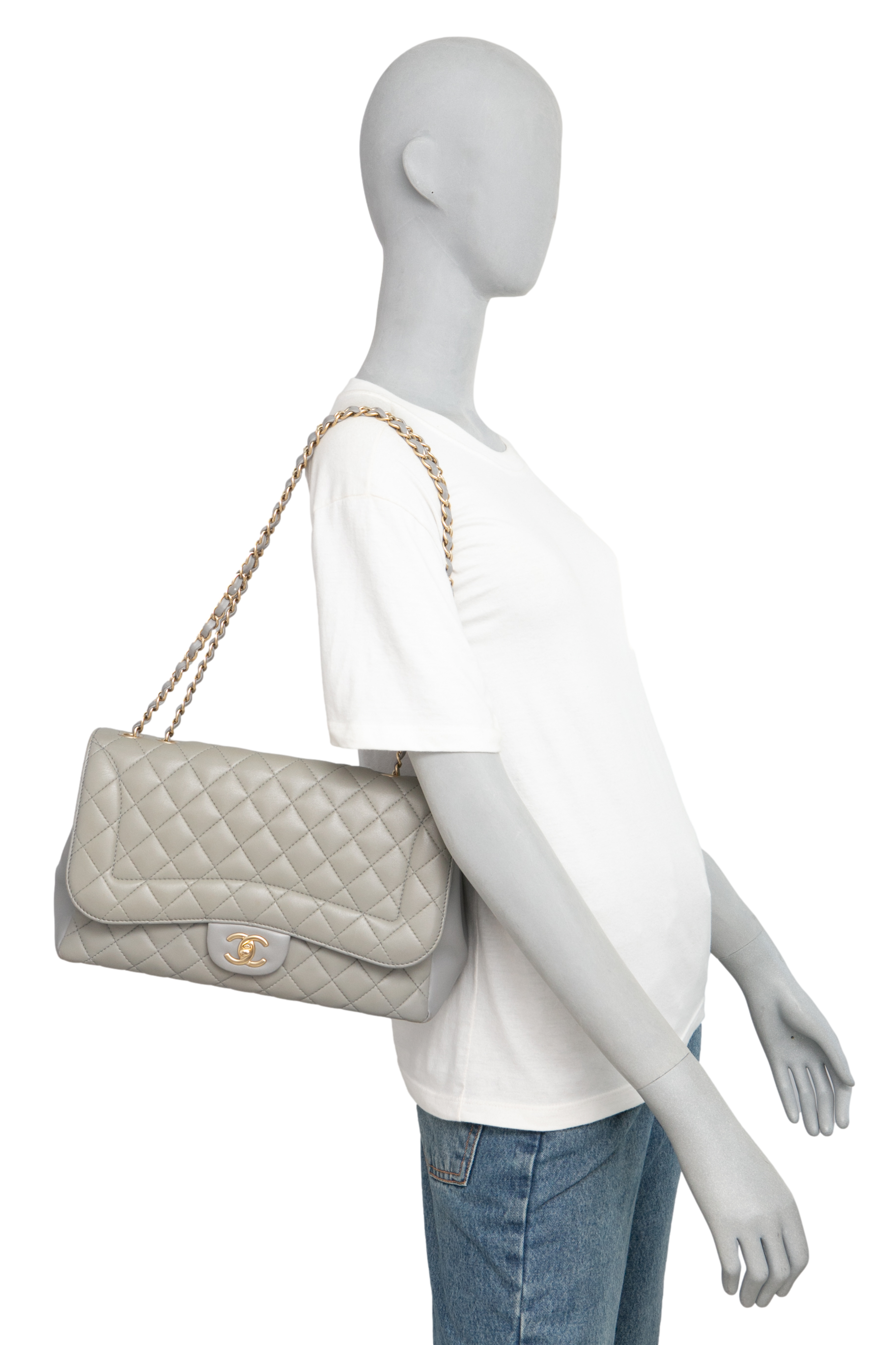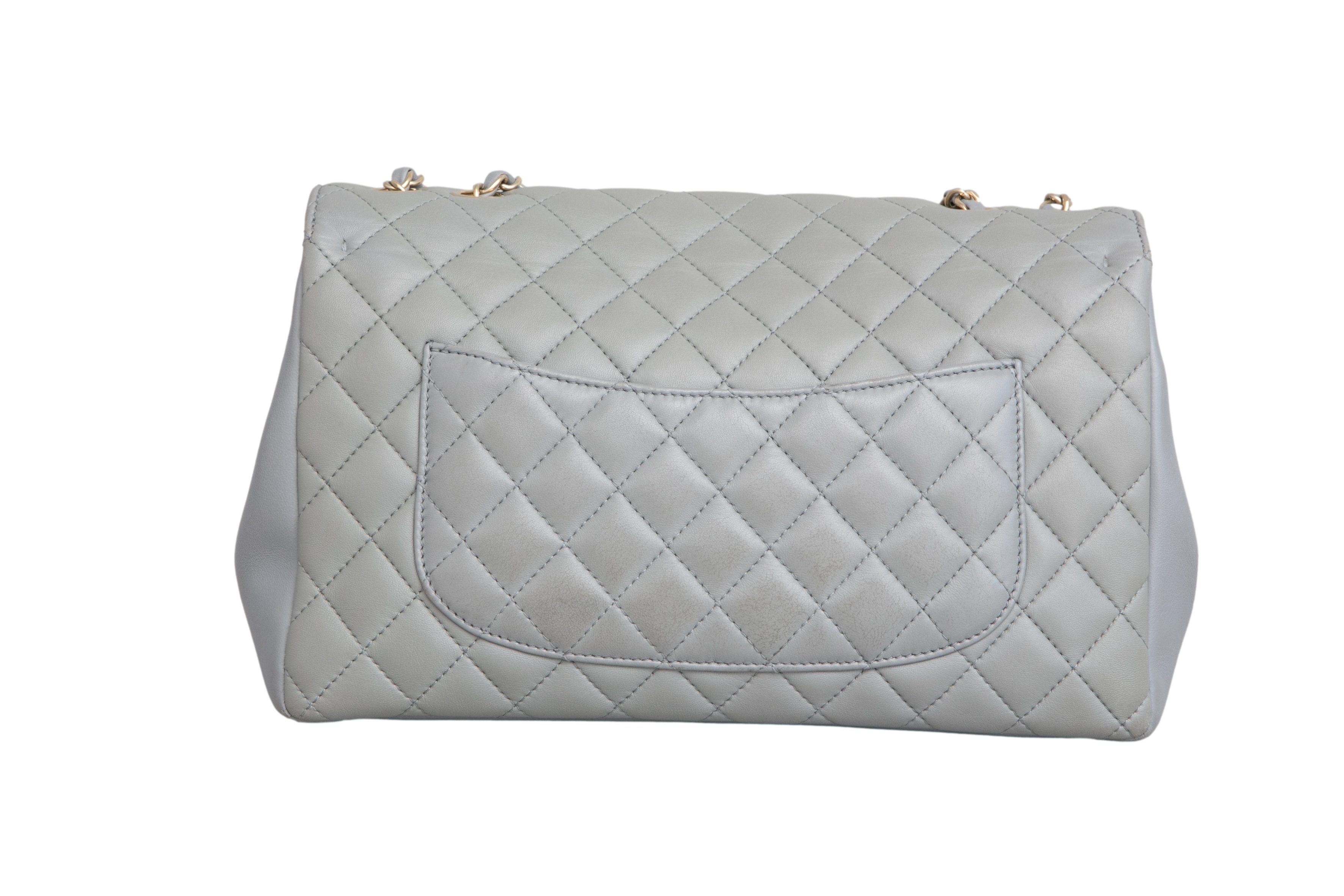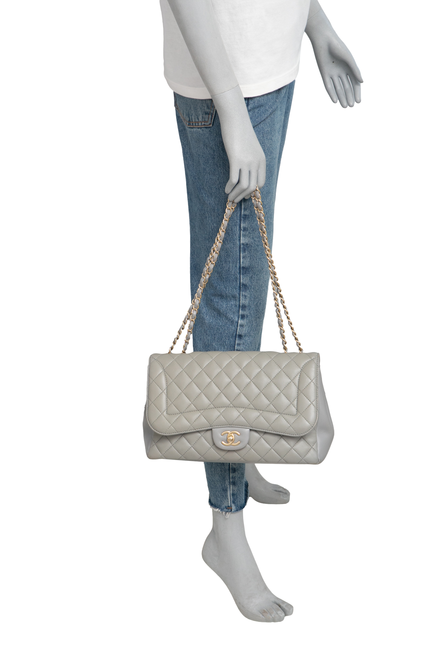 Chanel Classic Flap Jumbo Pearl Grey. Peça em ótimo estado, possui manchas na parte traseira da bolsa.