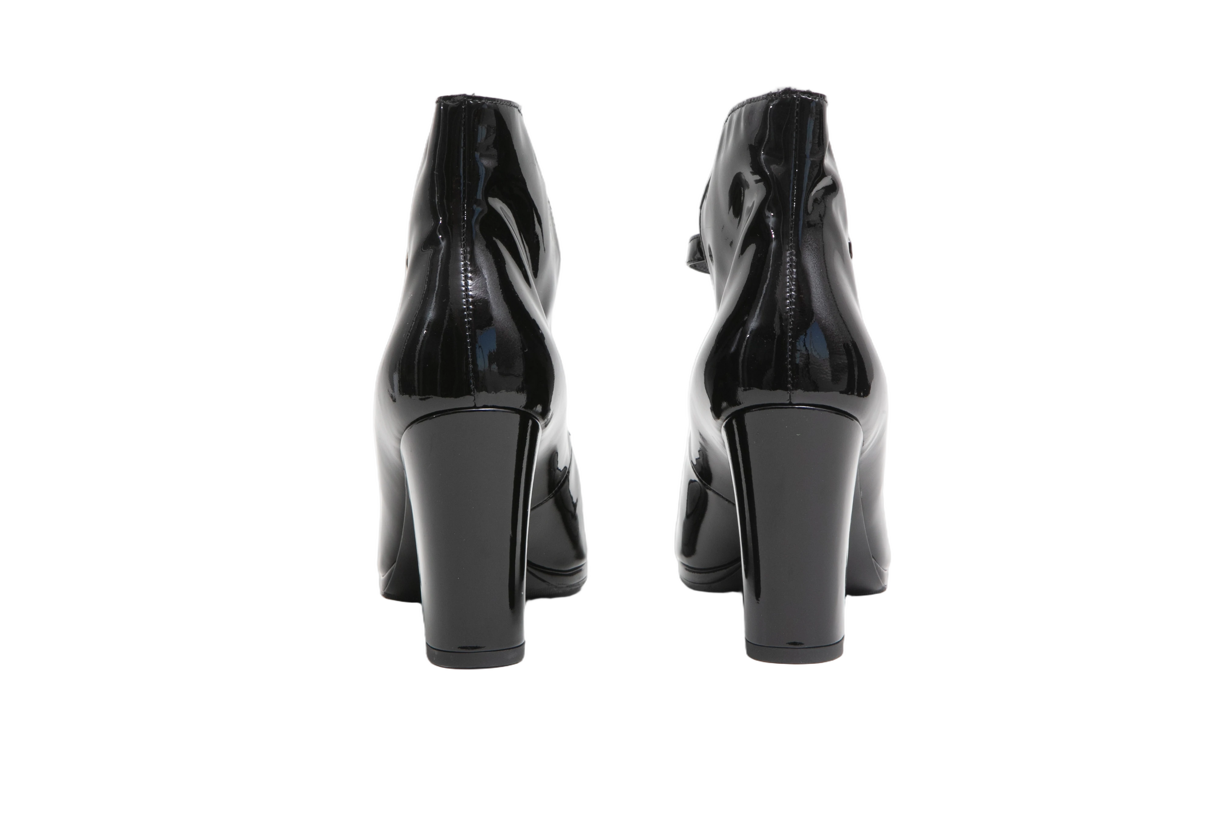 Sapato em verniz preto, com bico arredondado em tecido contrastante e logo bordado discreto. O modelo apresenta tira no tornozelo com fivela metálica e salto grosso.