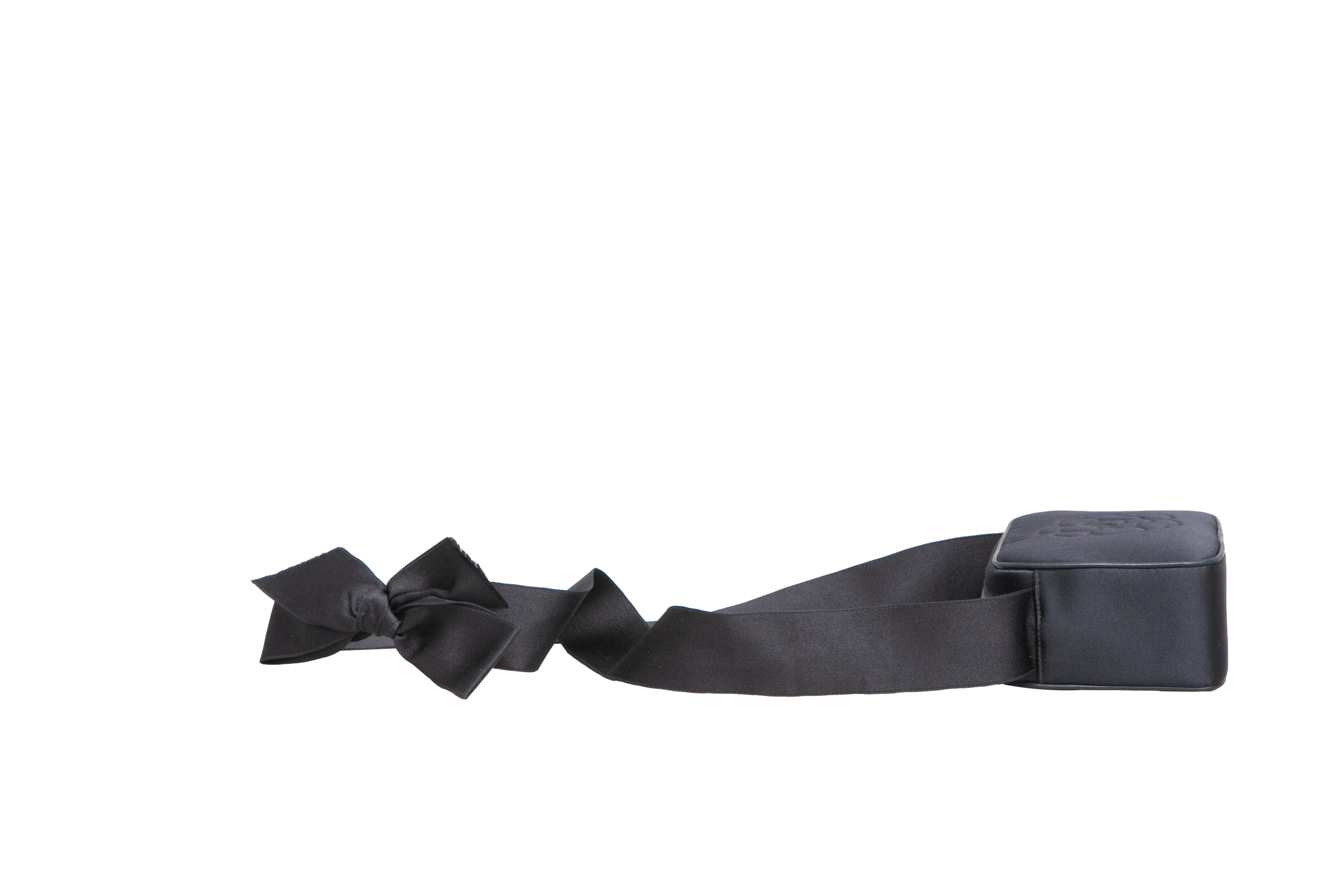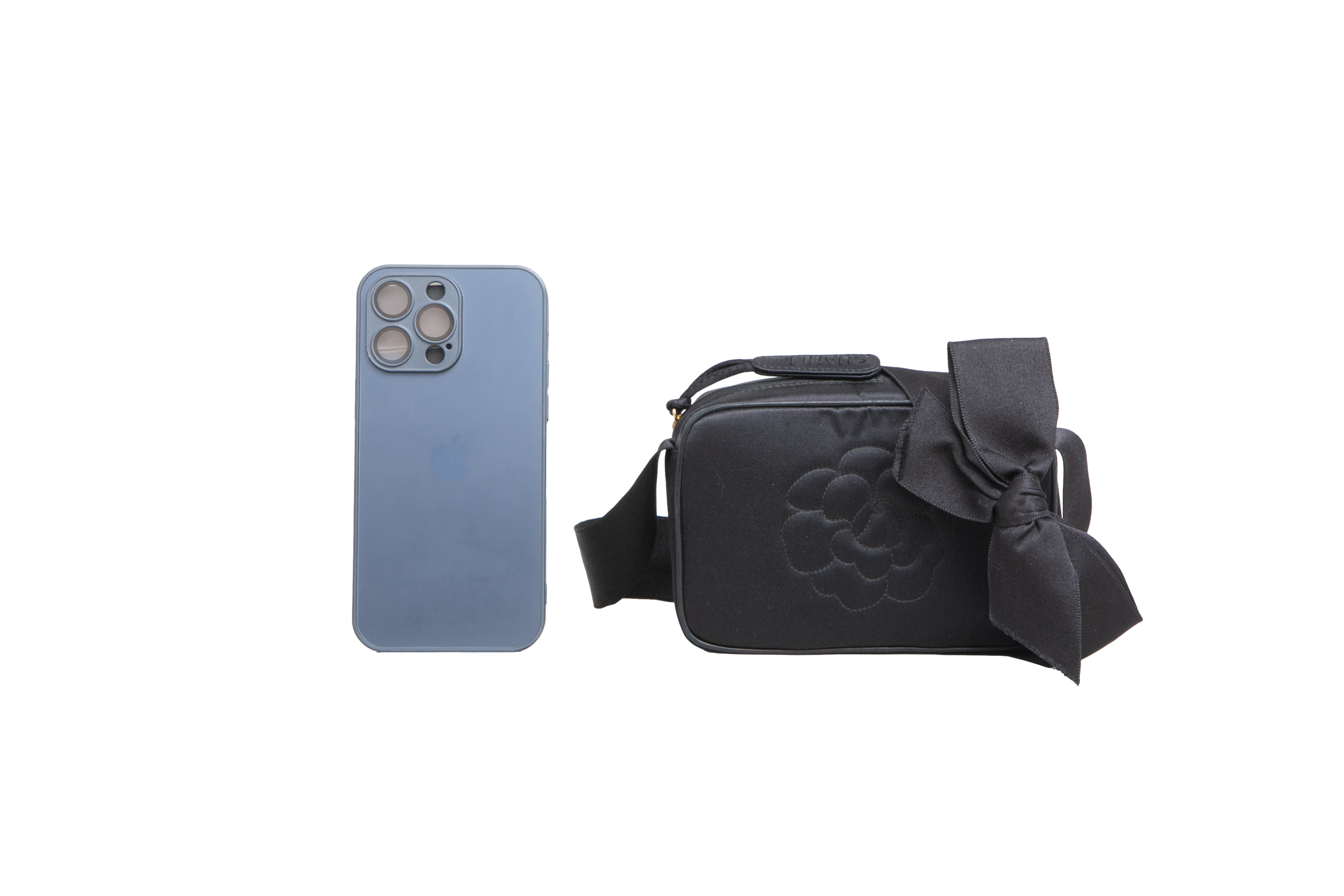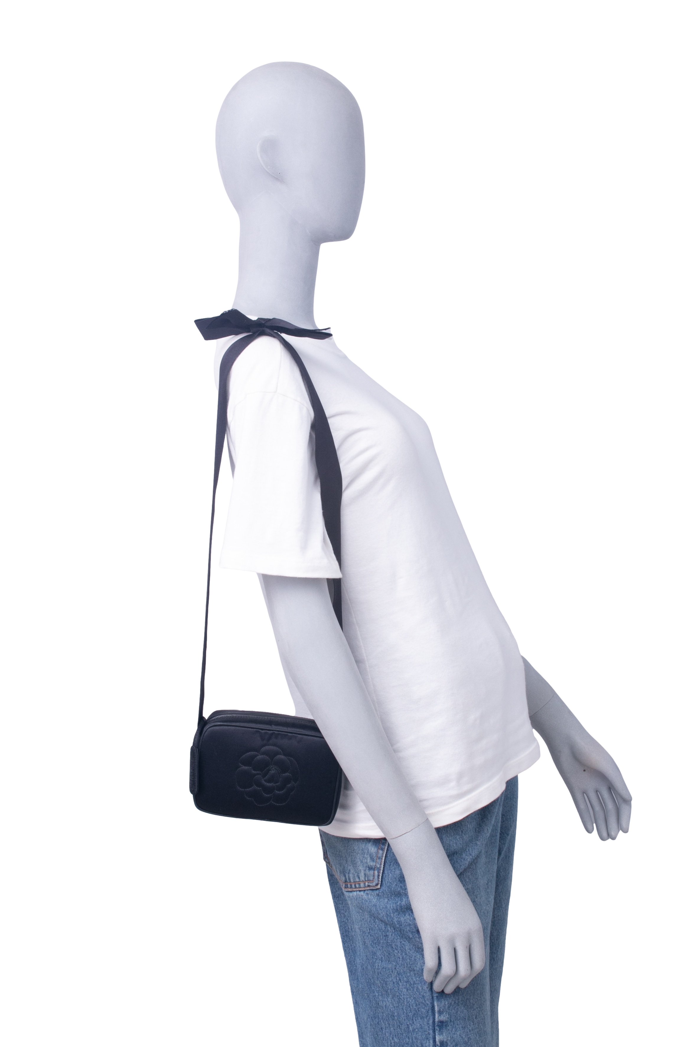 A bolsa exibida é um modelo compacto e contemporâneo, confeccionado em tecido preto com acabamento acetinado e estrutura retangular de linhas minimalistas. Na parte frontal, destaca-se a icônica camélia — símbolo clássico da elegância da maison Chanel — delicadamente bordada em relevo, conferindo um charme sofisticado à peça.