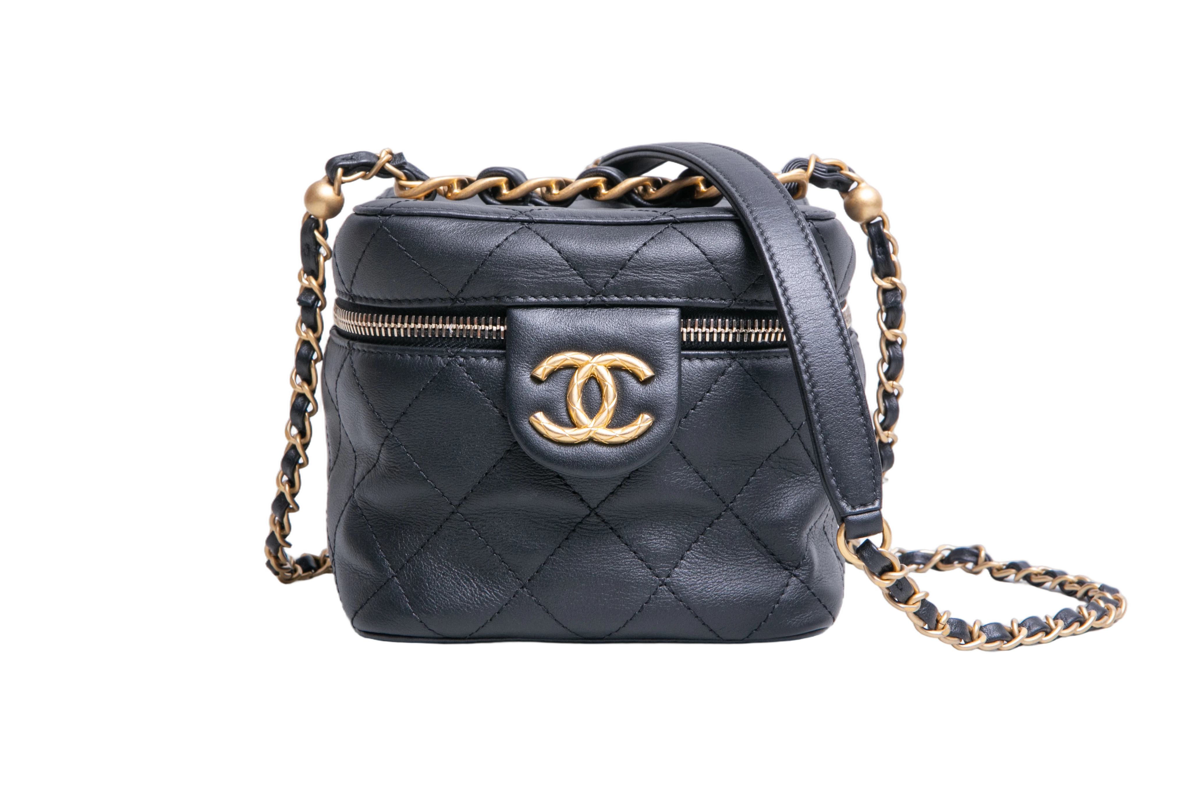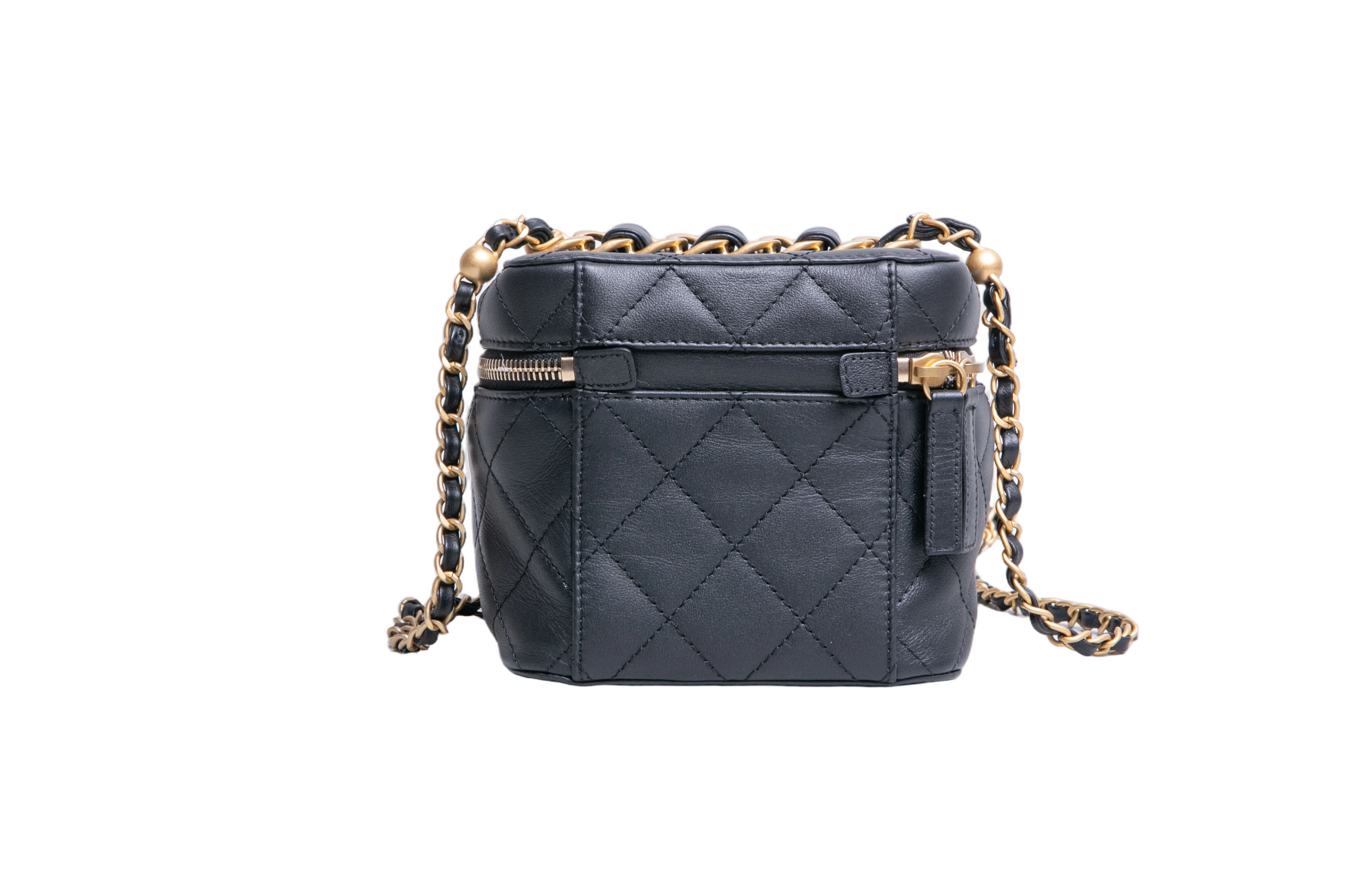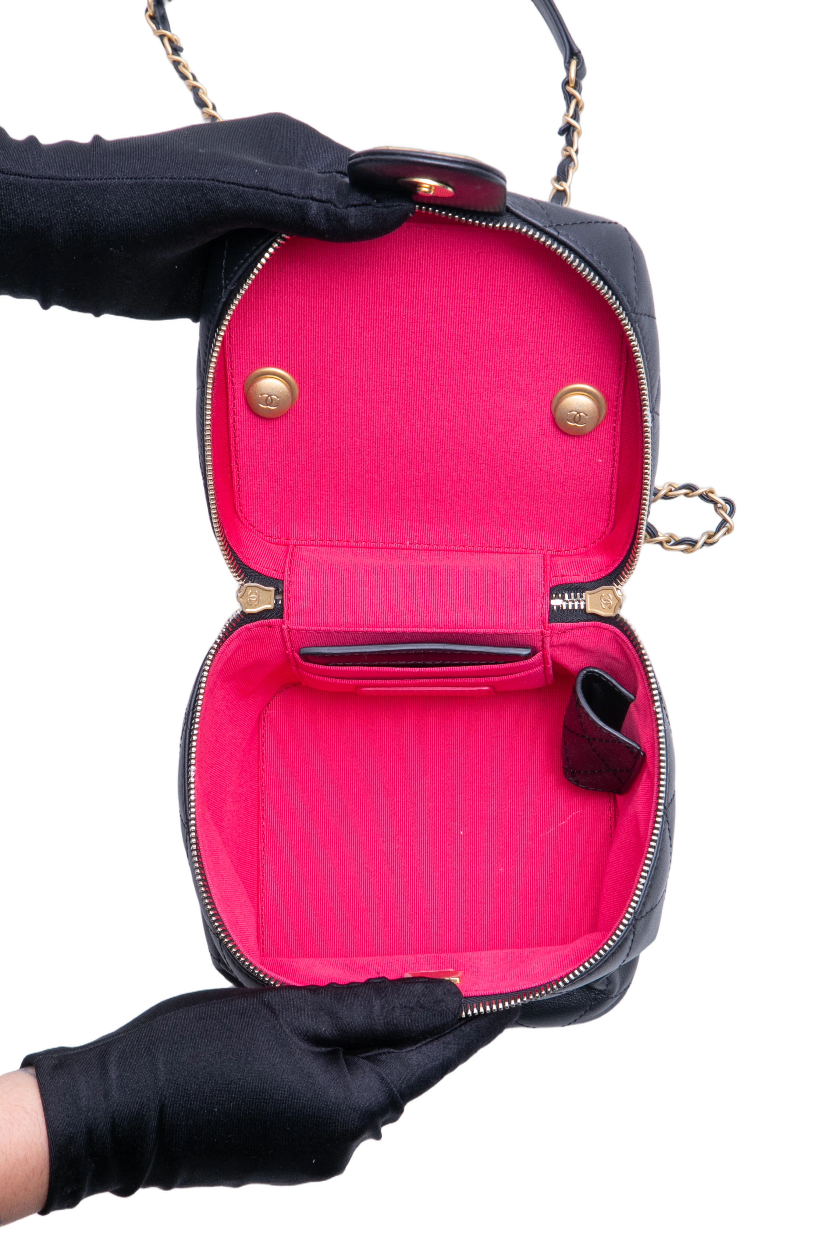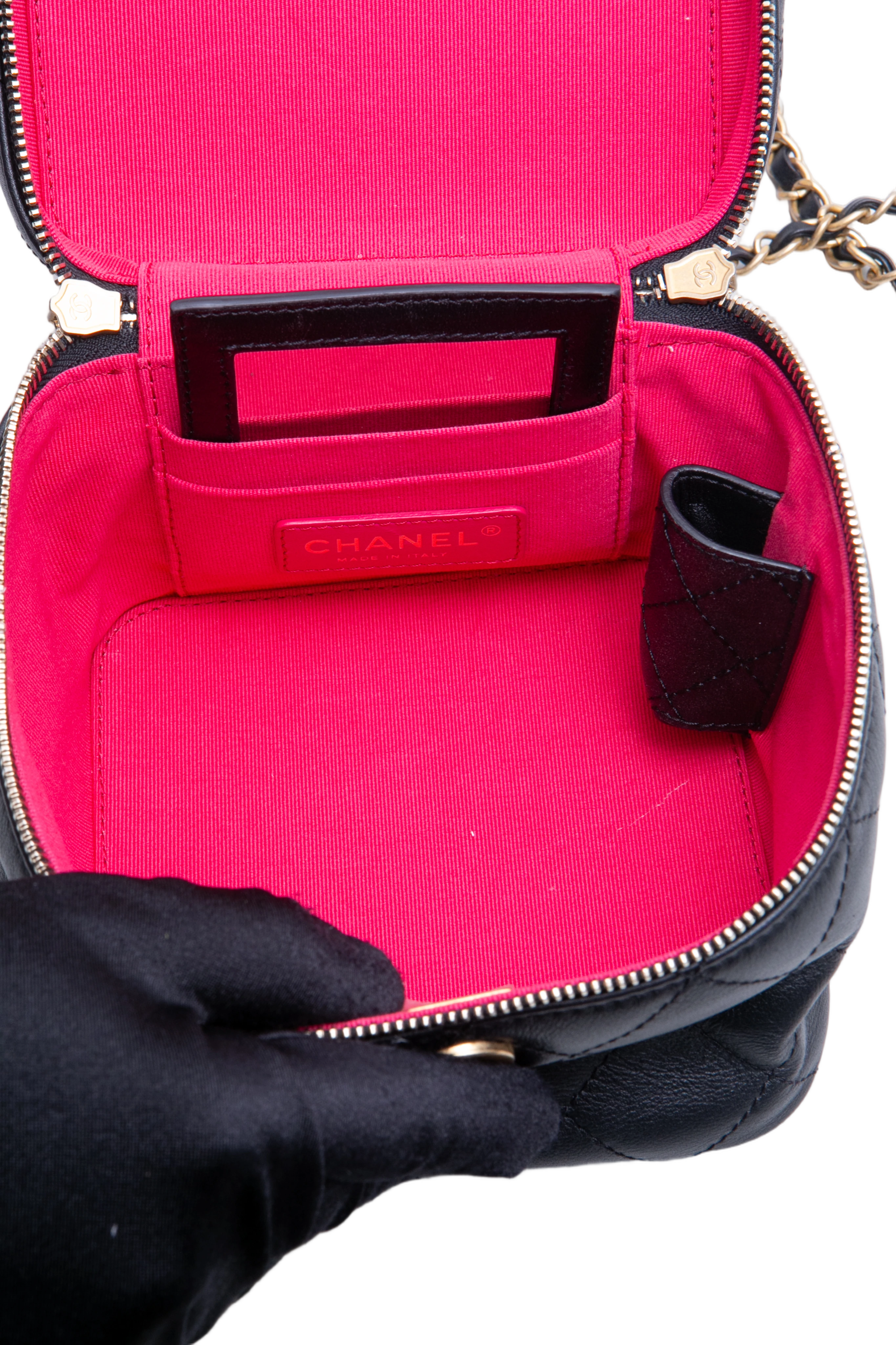 Chanel Vanity Case Small Black/Gold. Peça em perfeito estado, possui pequenas marcas no couro e forro.