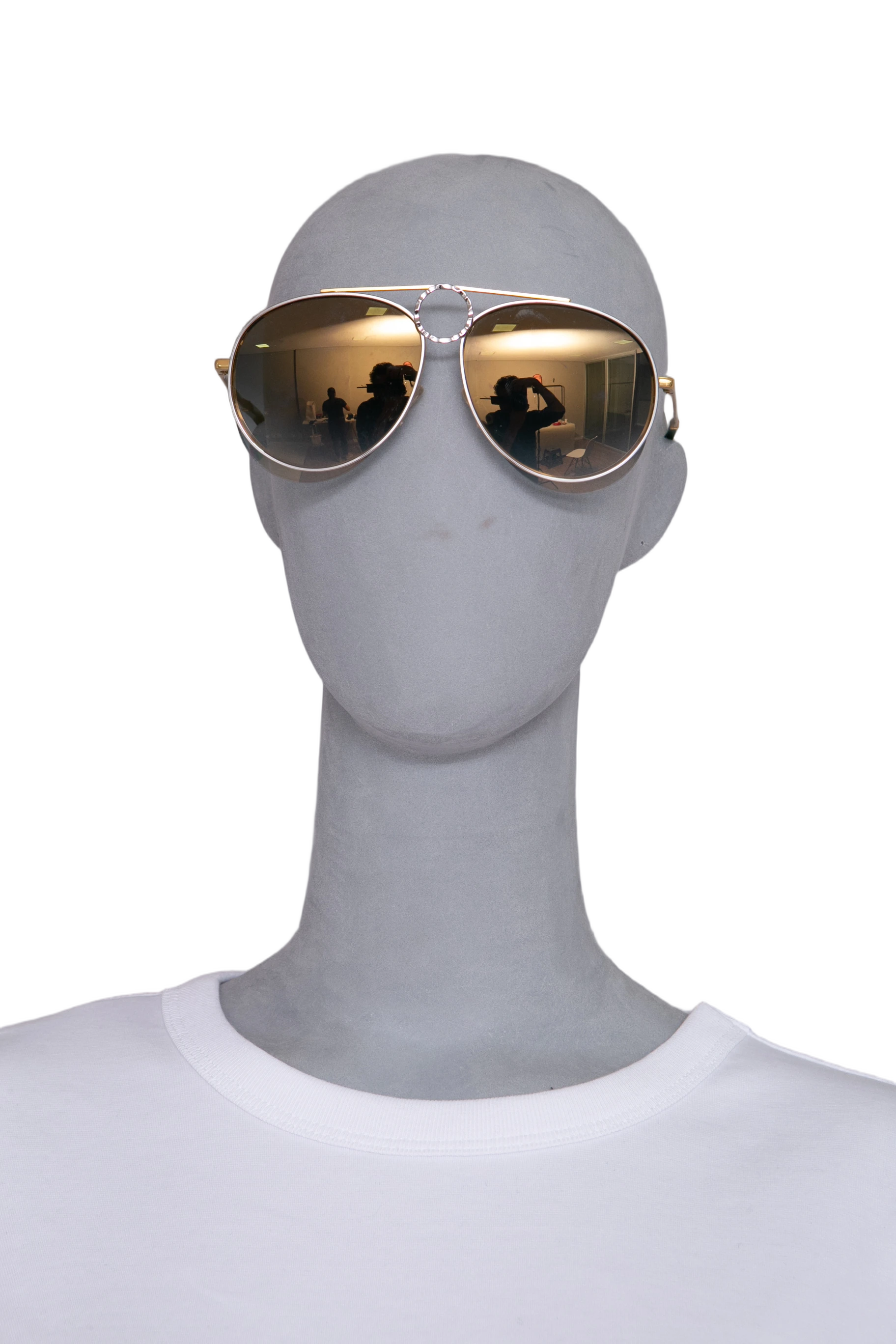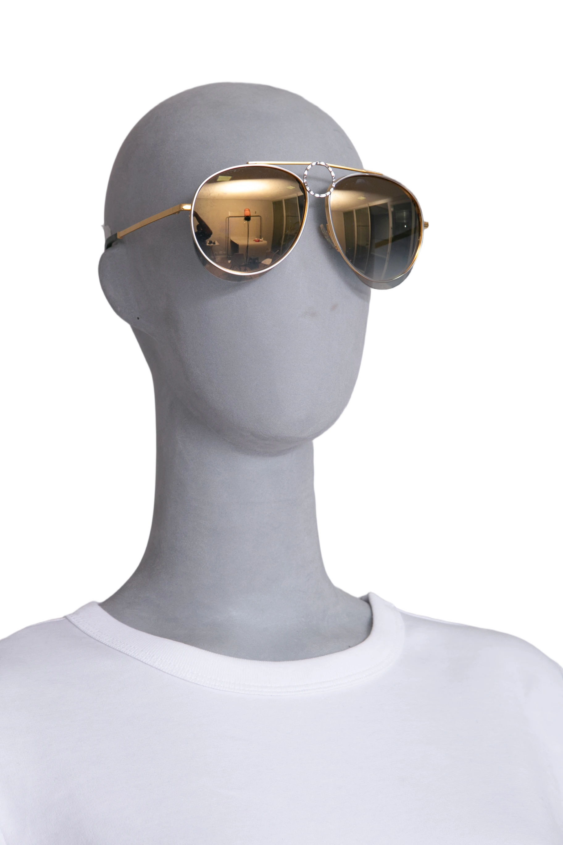 Óculos de sol modelo aviador, com armação em metal dourado e detalhes em acetato translúcido. Possui hastes finas douradas com ponteiras em verde. As lentes em tom cinza degradê oferecem proteção.