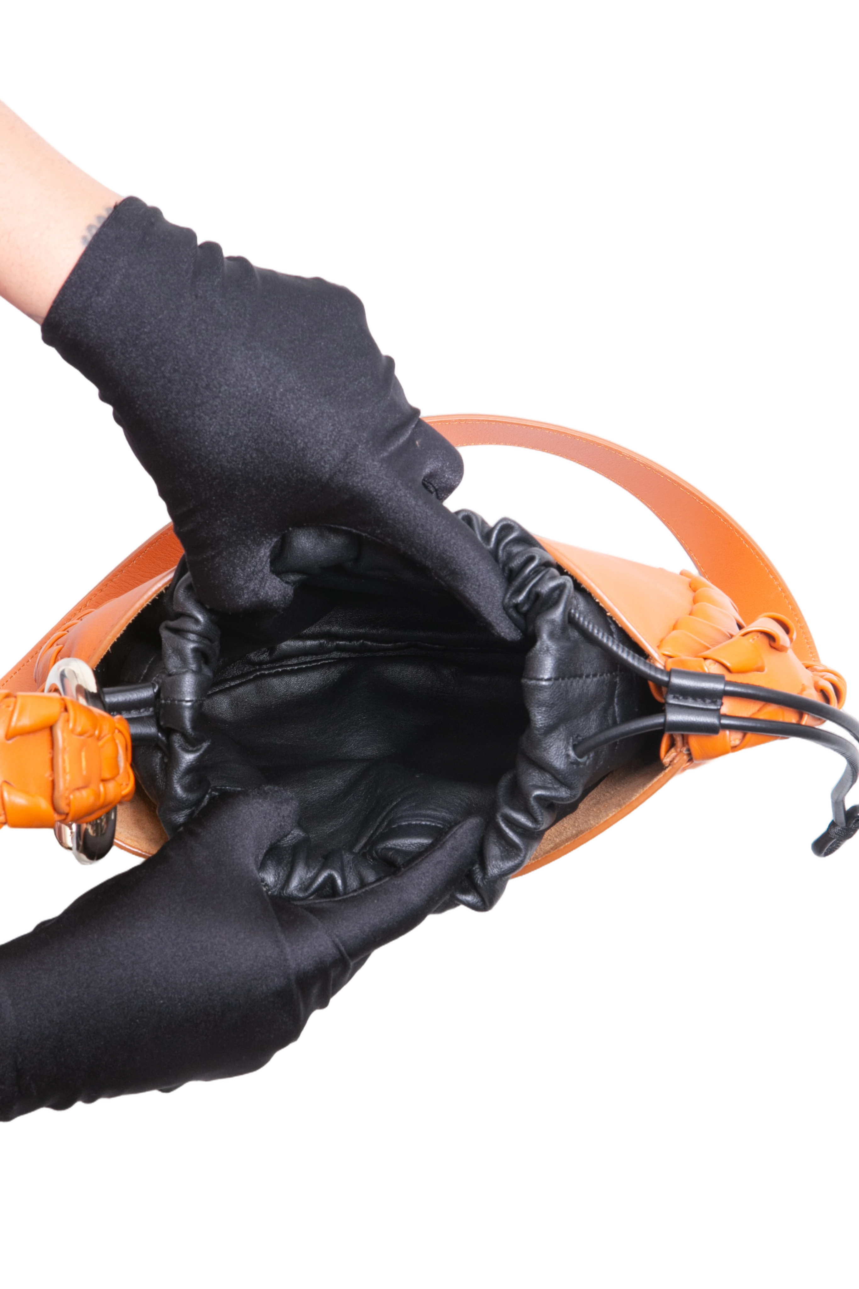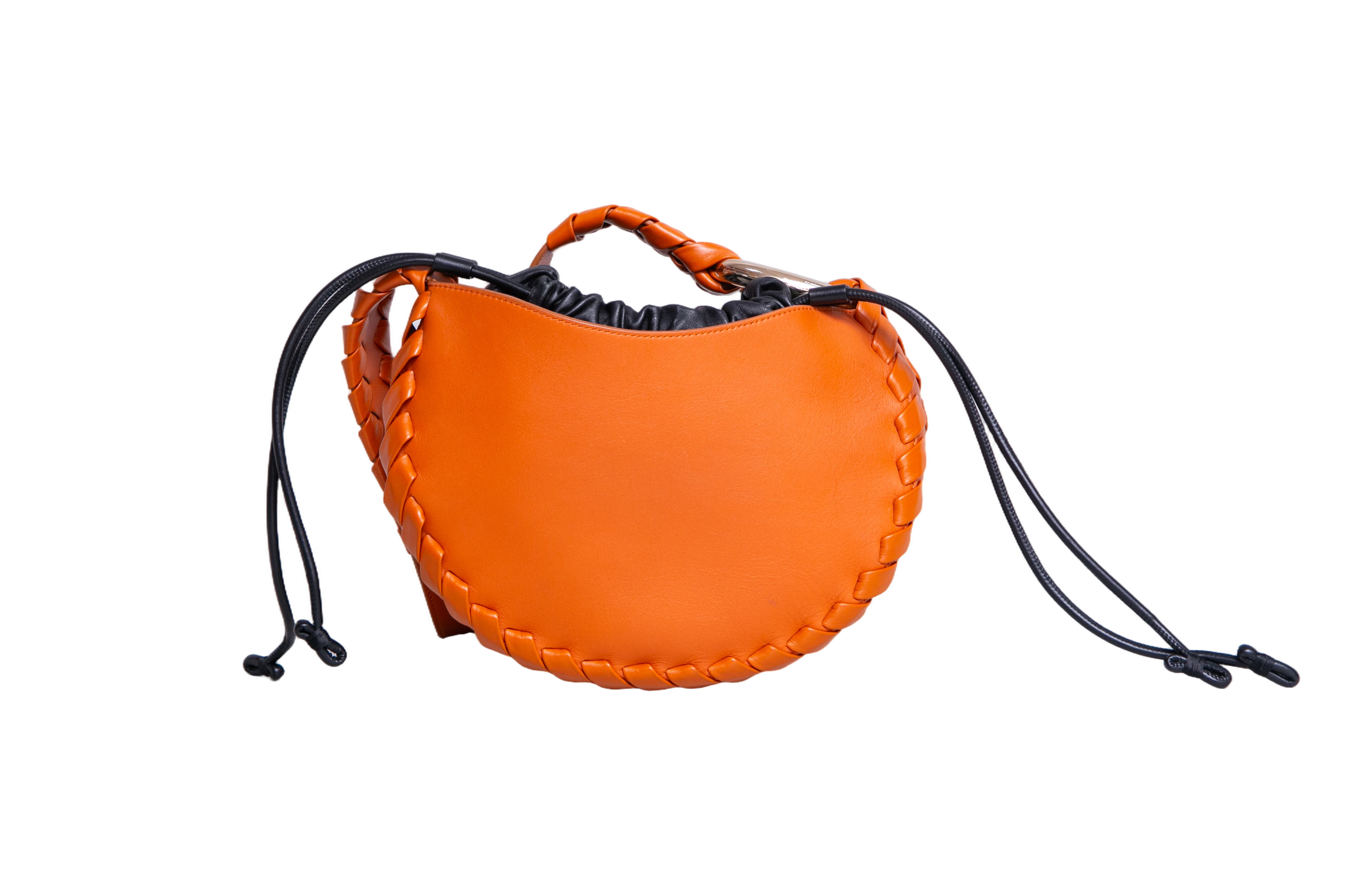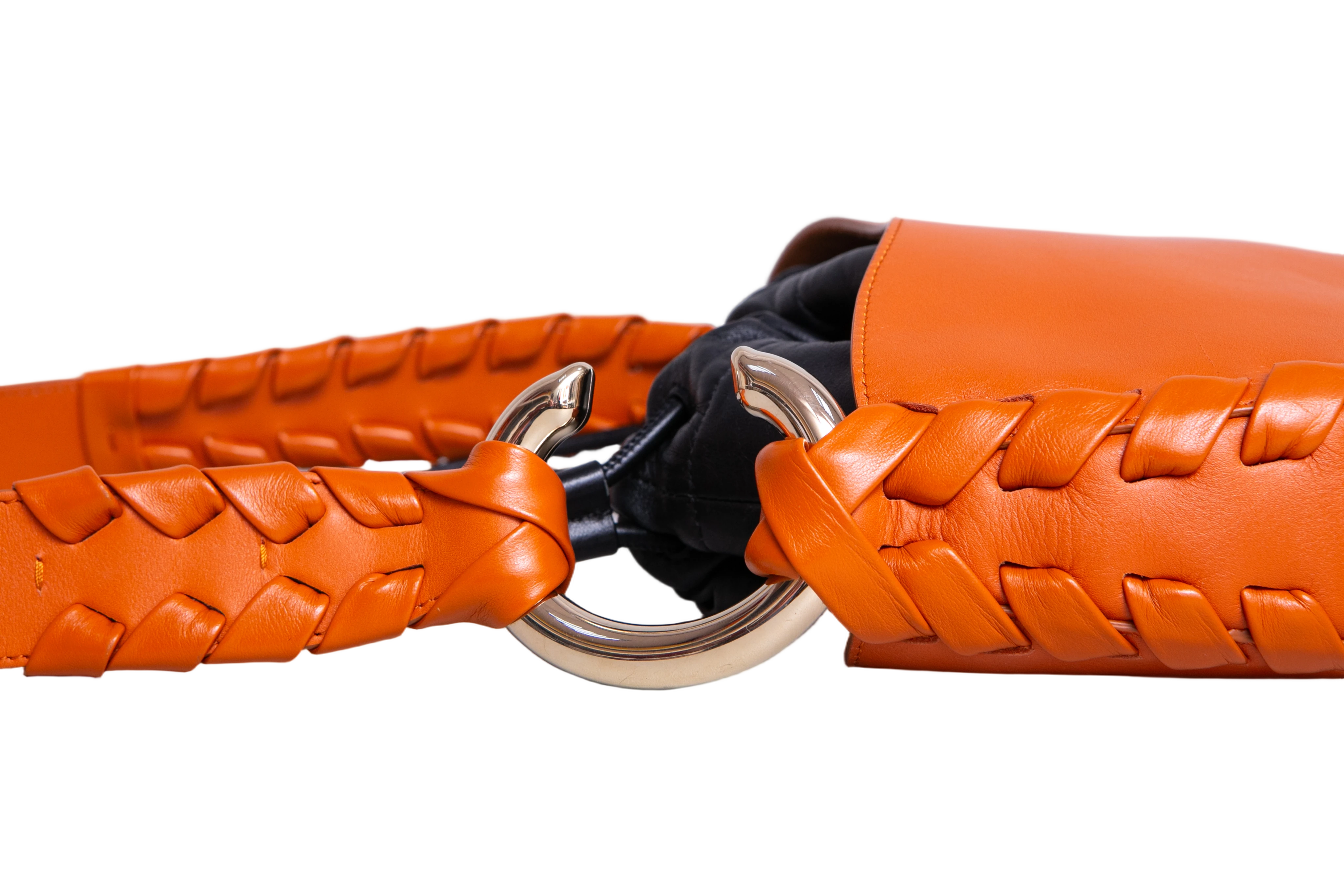 Bolsa em couro laranja, possui compartimento solto em couro preto com fechamento por cordão, na lateral um detalhe metálico em "C". Possui alça longa em couro para uso shoulder e crossbody.