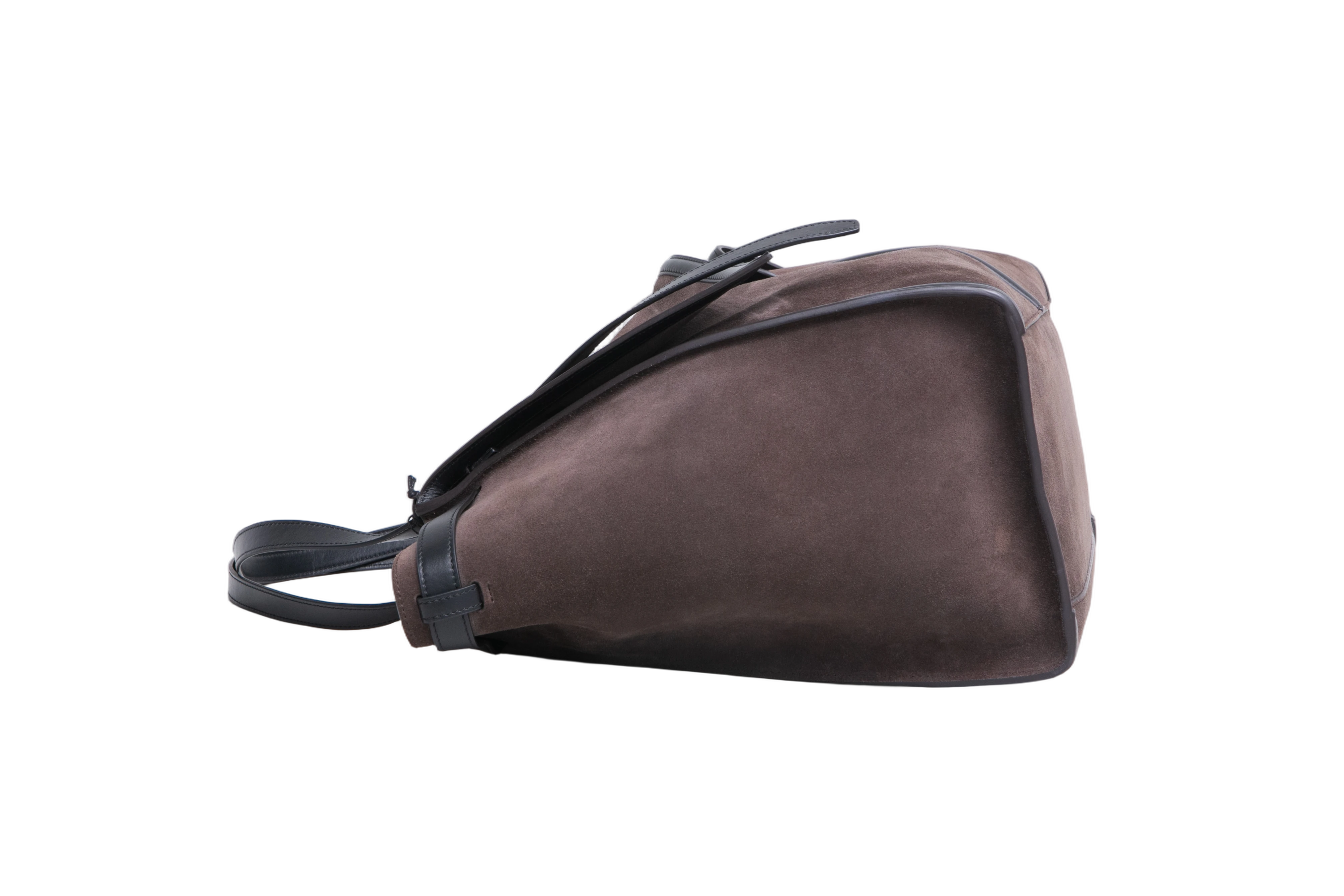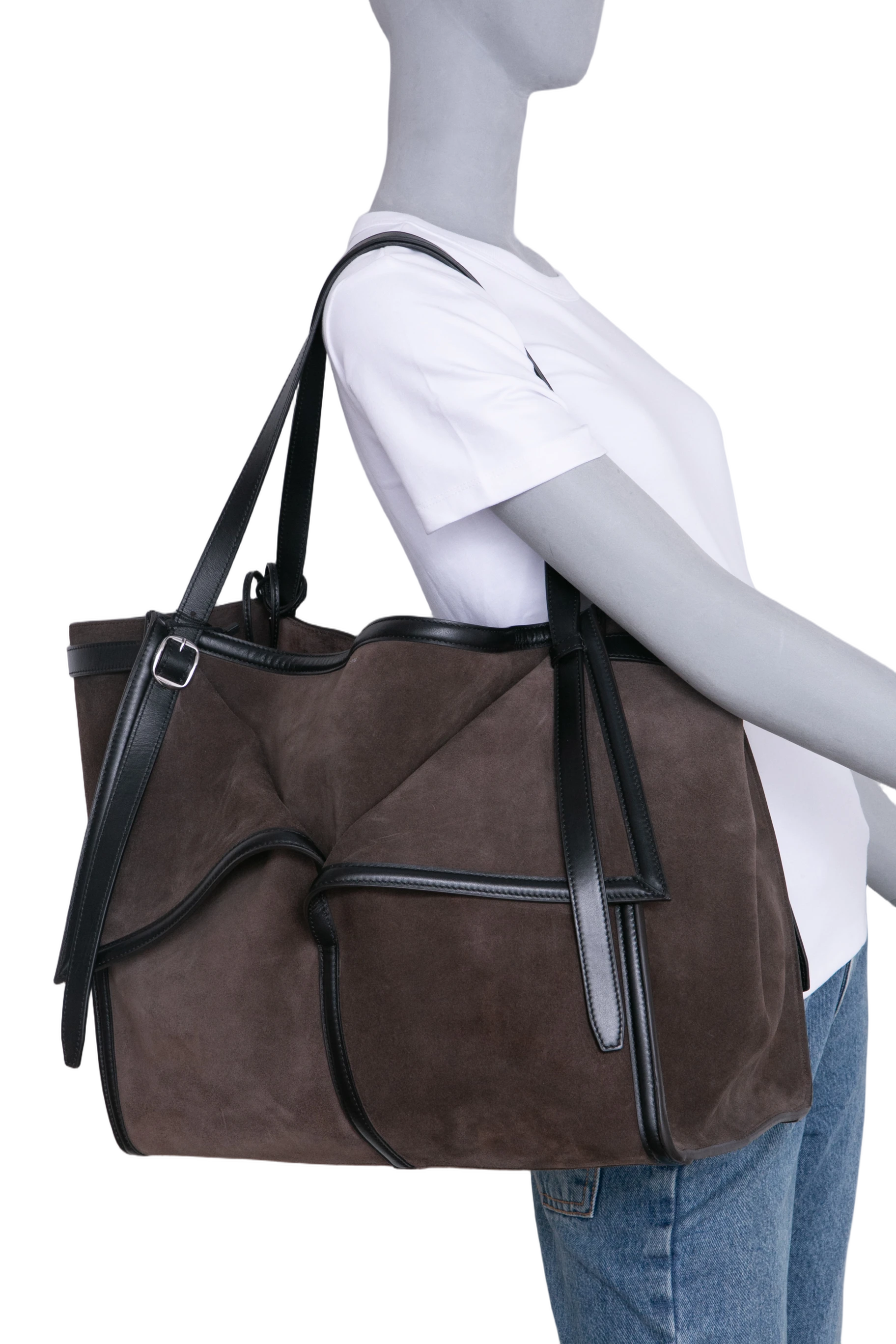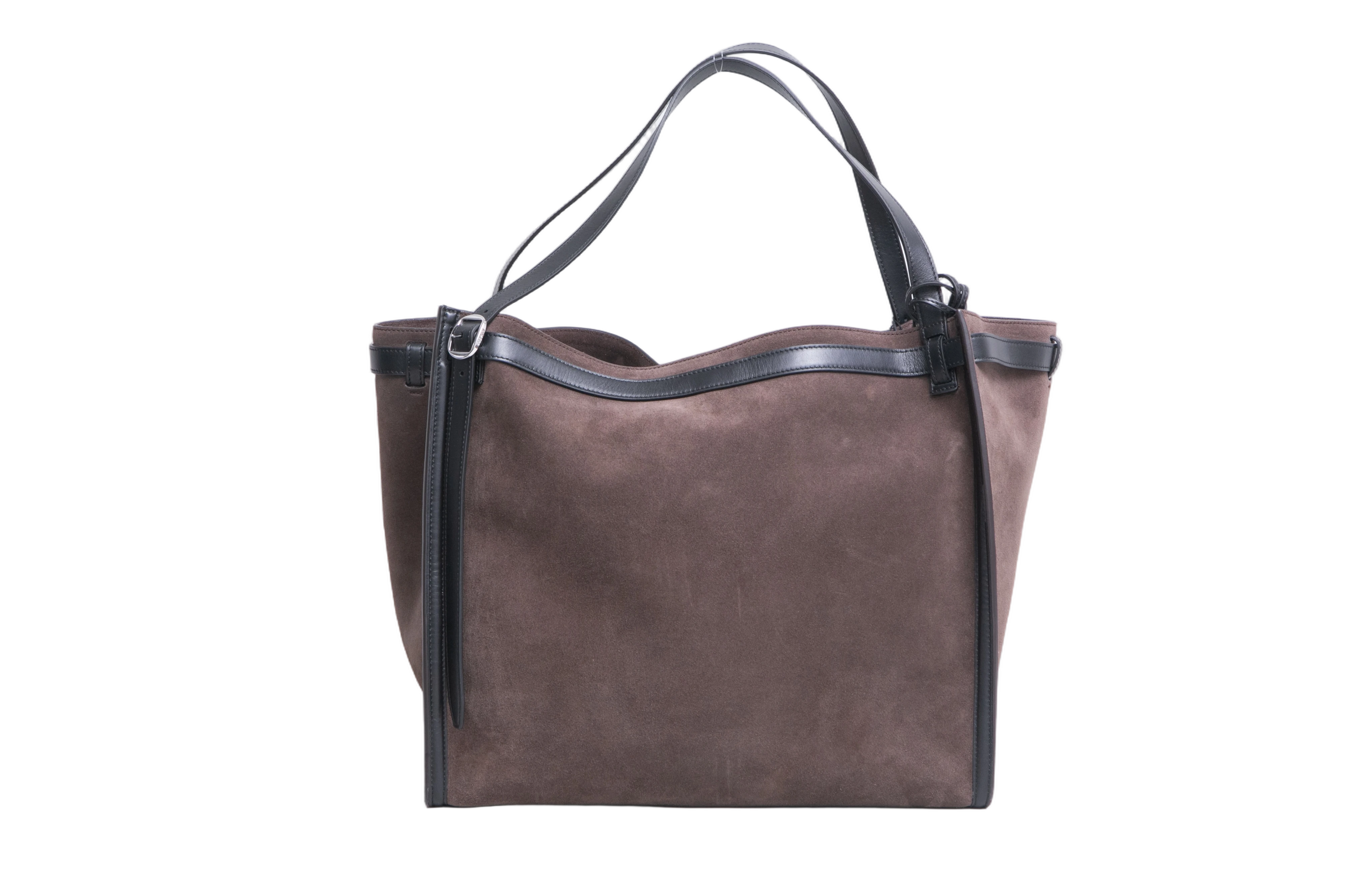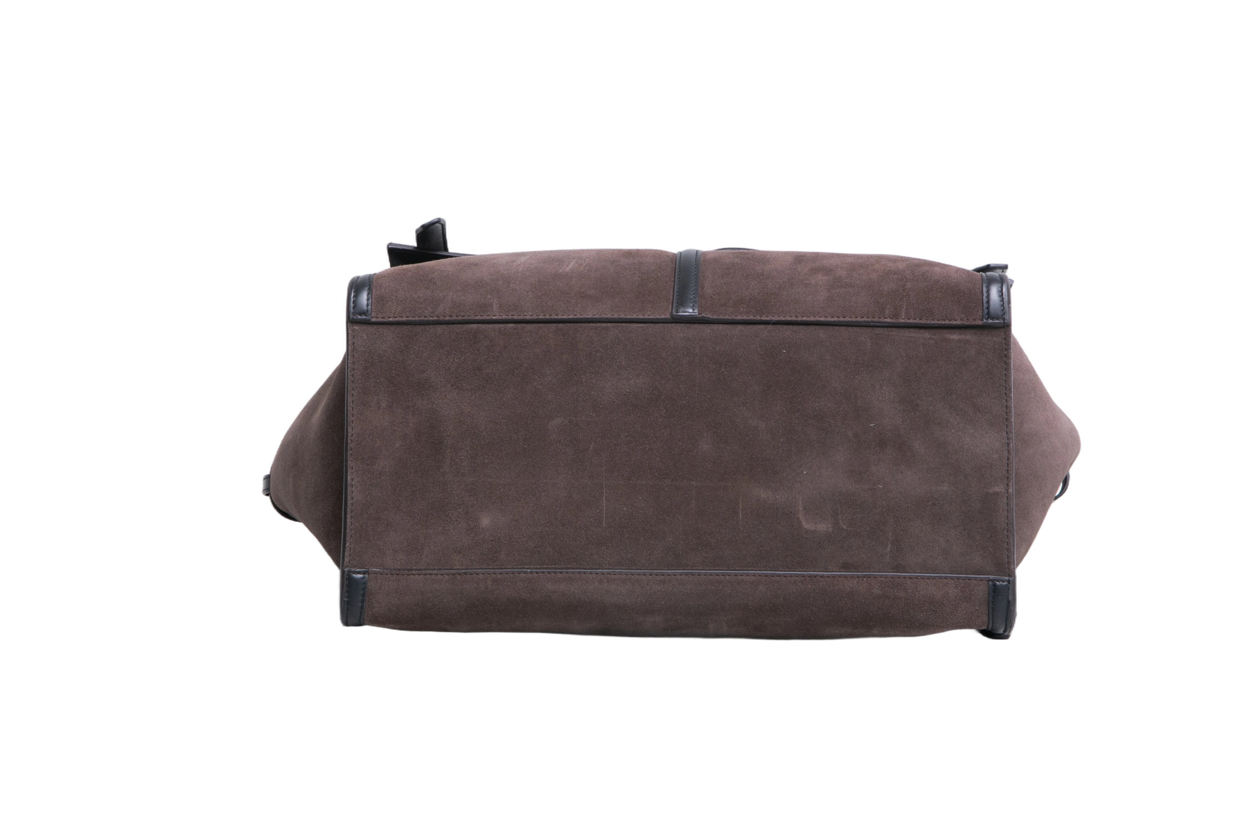 Bolsa em camurça marrom com acabamento em couro preto, possui estrutura ampla em formato tote, com alças duplas de ombro para uso shoulder e handle bag