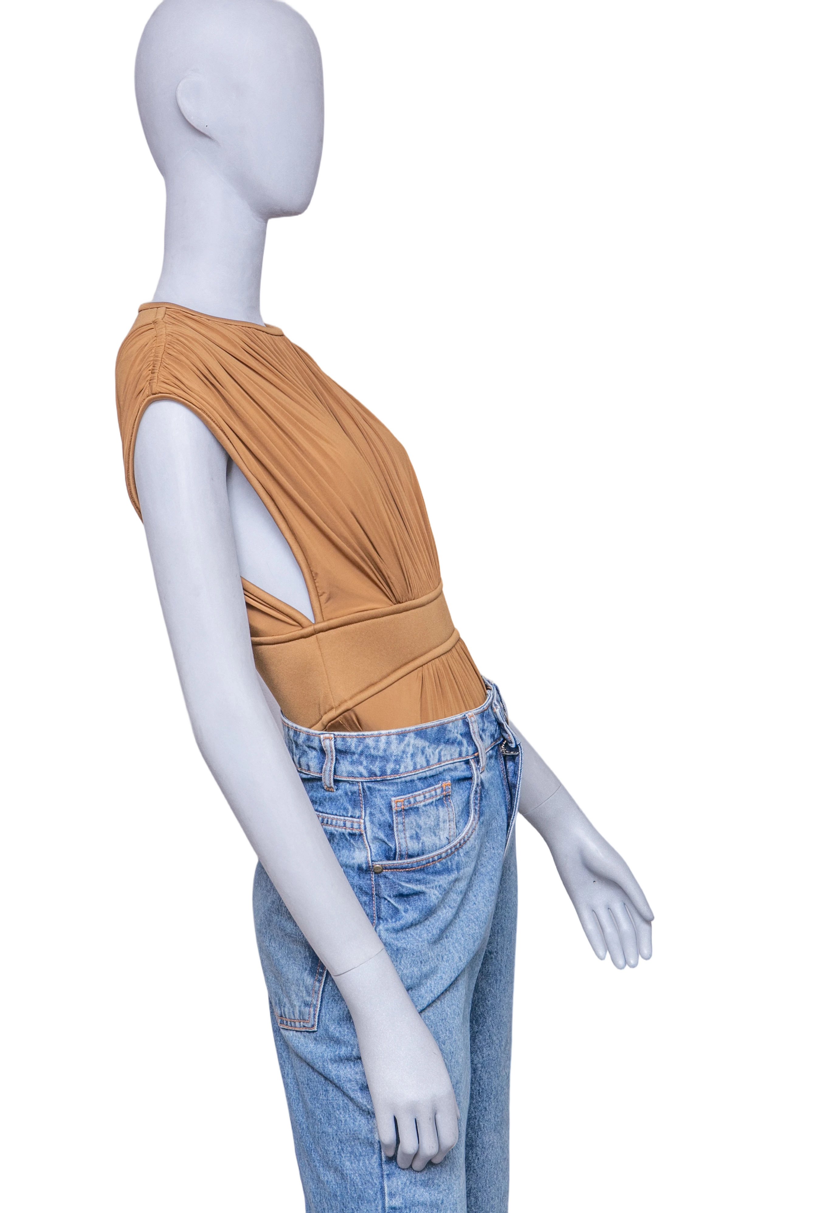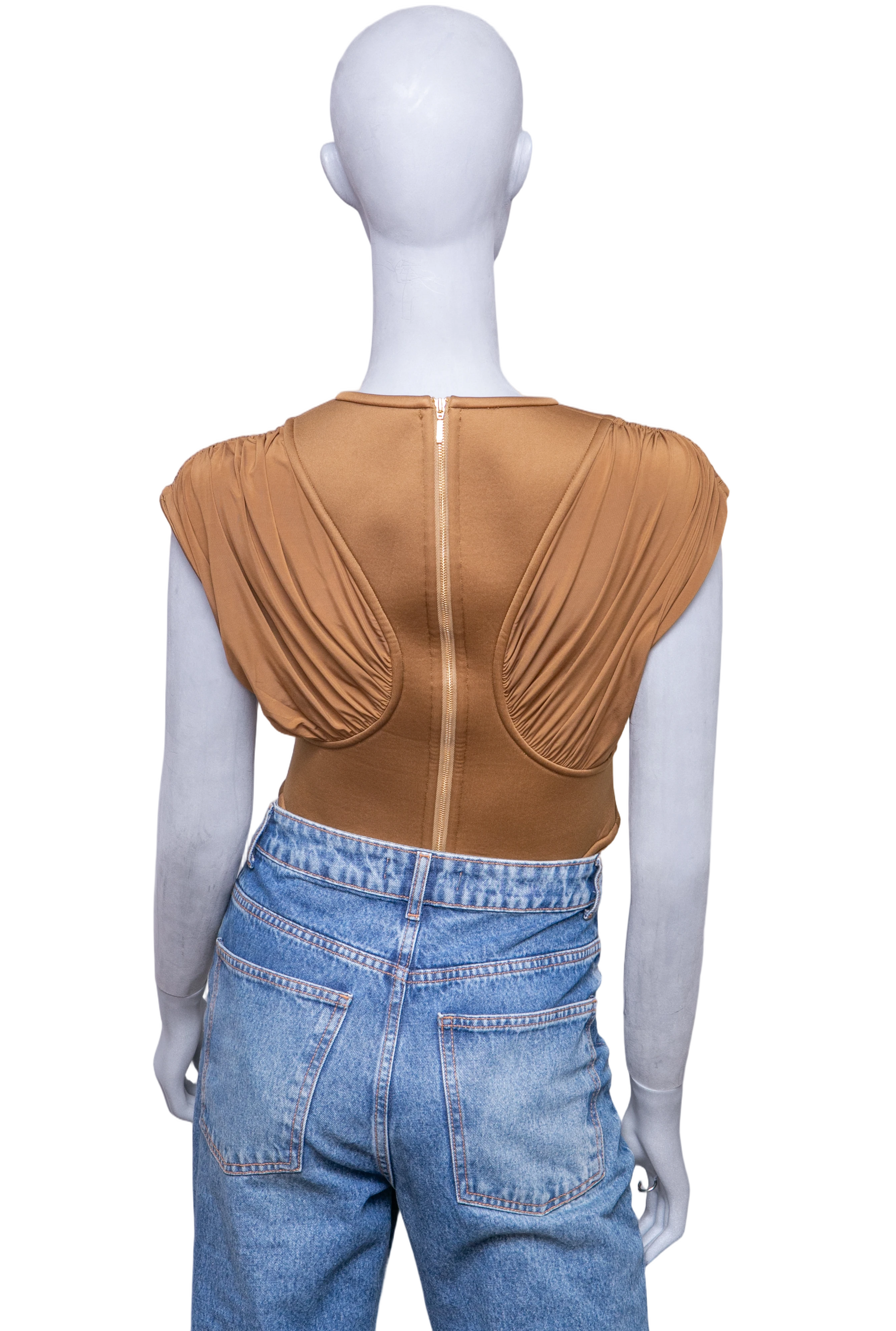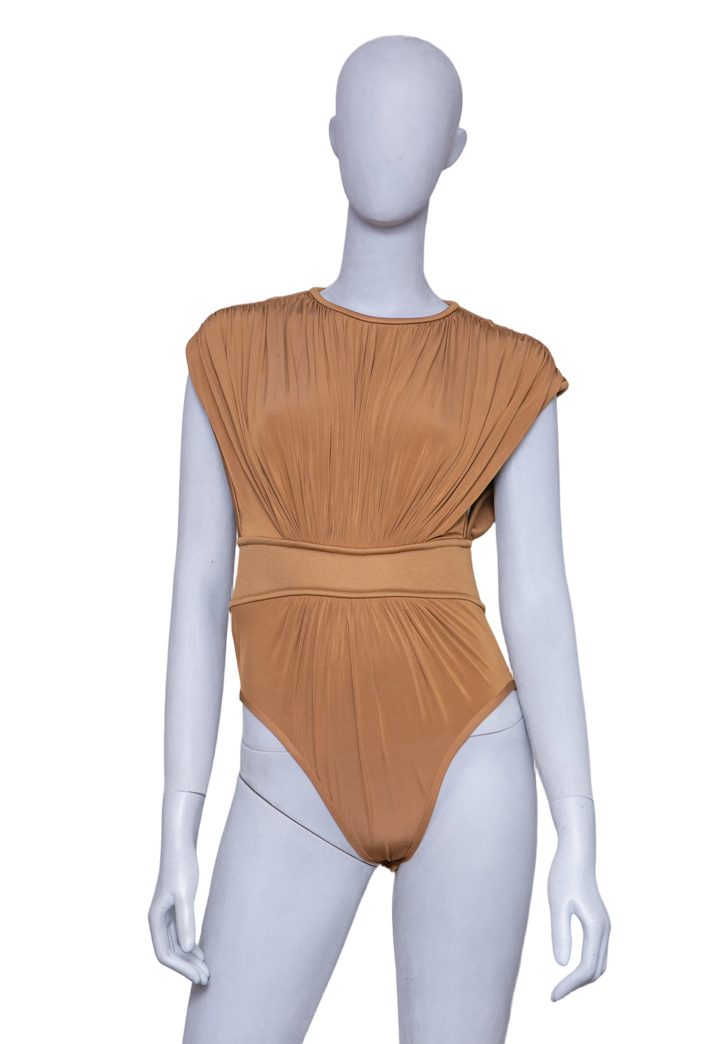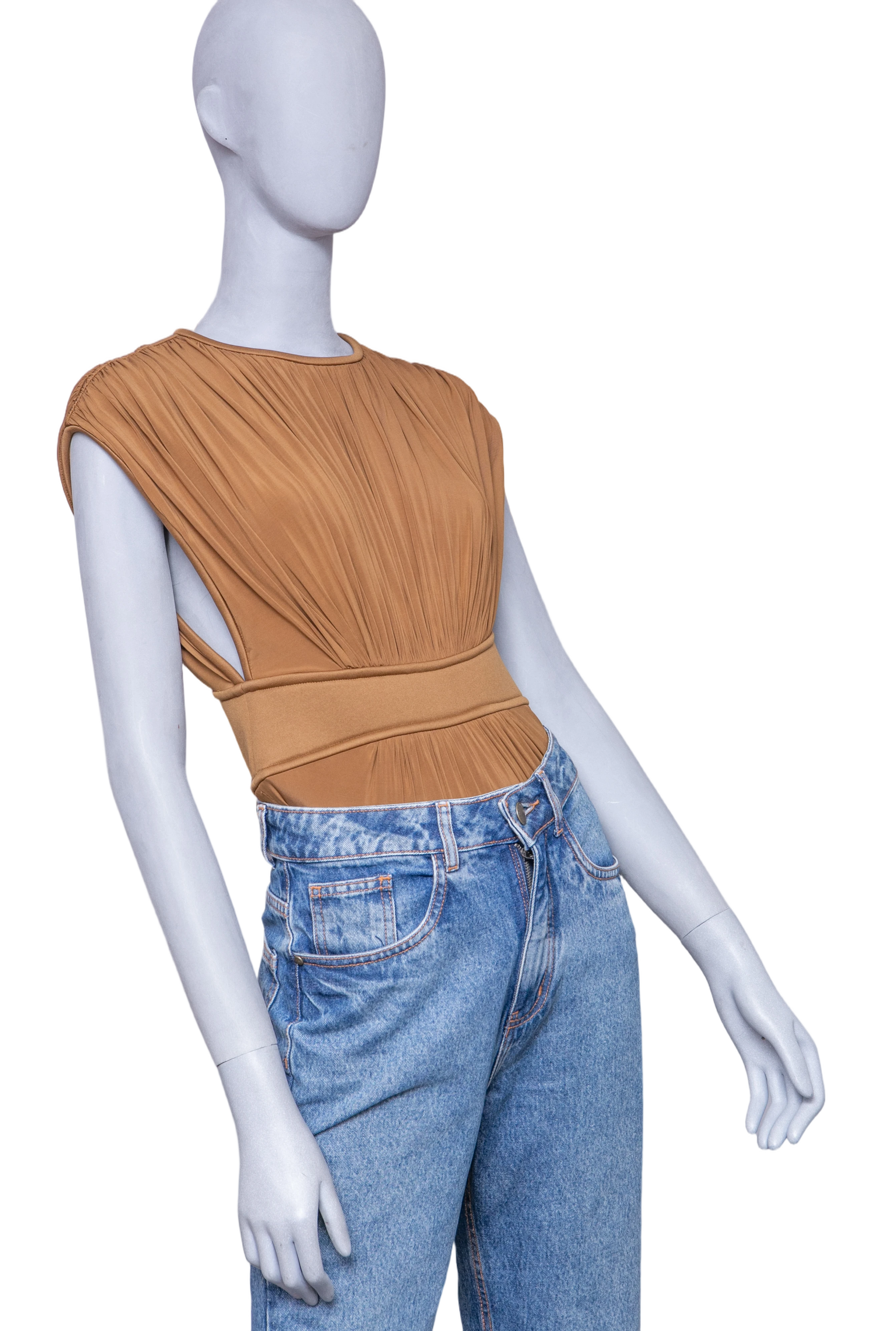 Body em tom caramelo, confeccionado em tecido leve com acabamento drapeado na parte frontal e traseira. O modelo apresenta ombros amplos, decote fechado e efeito franzido. A cintura é marcada por uma faixa lisa integrada.