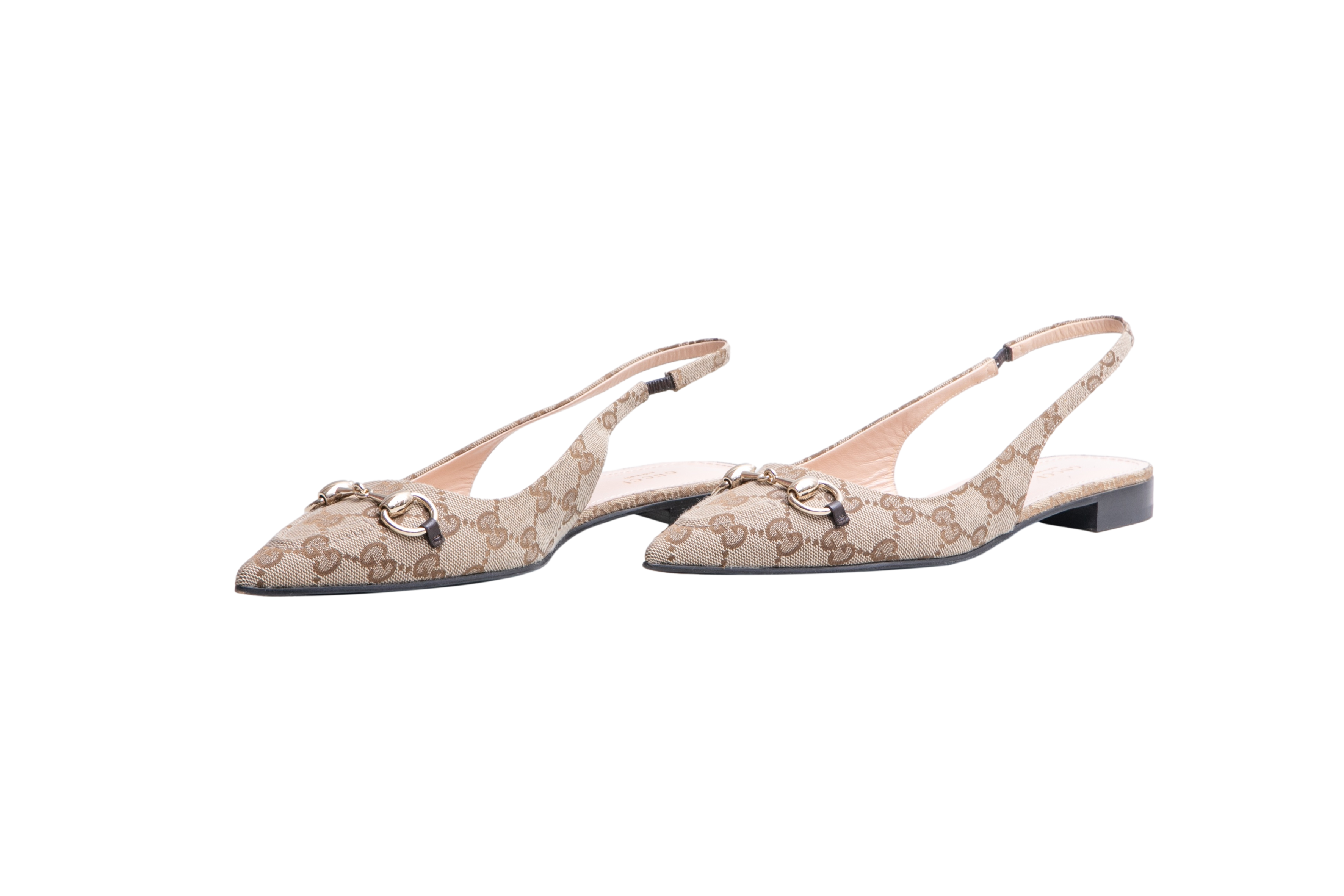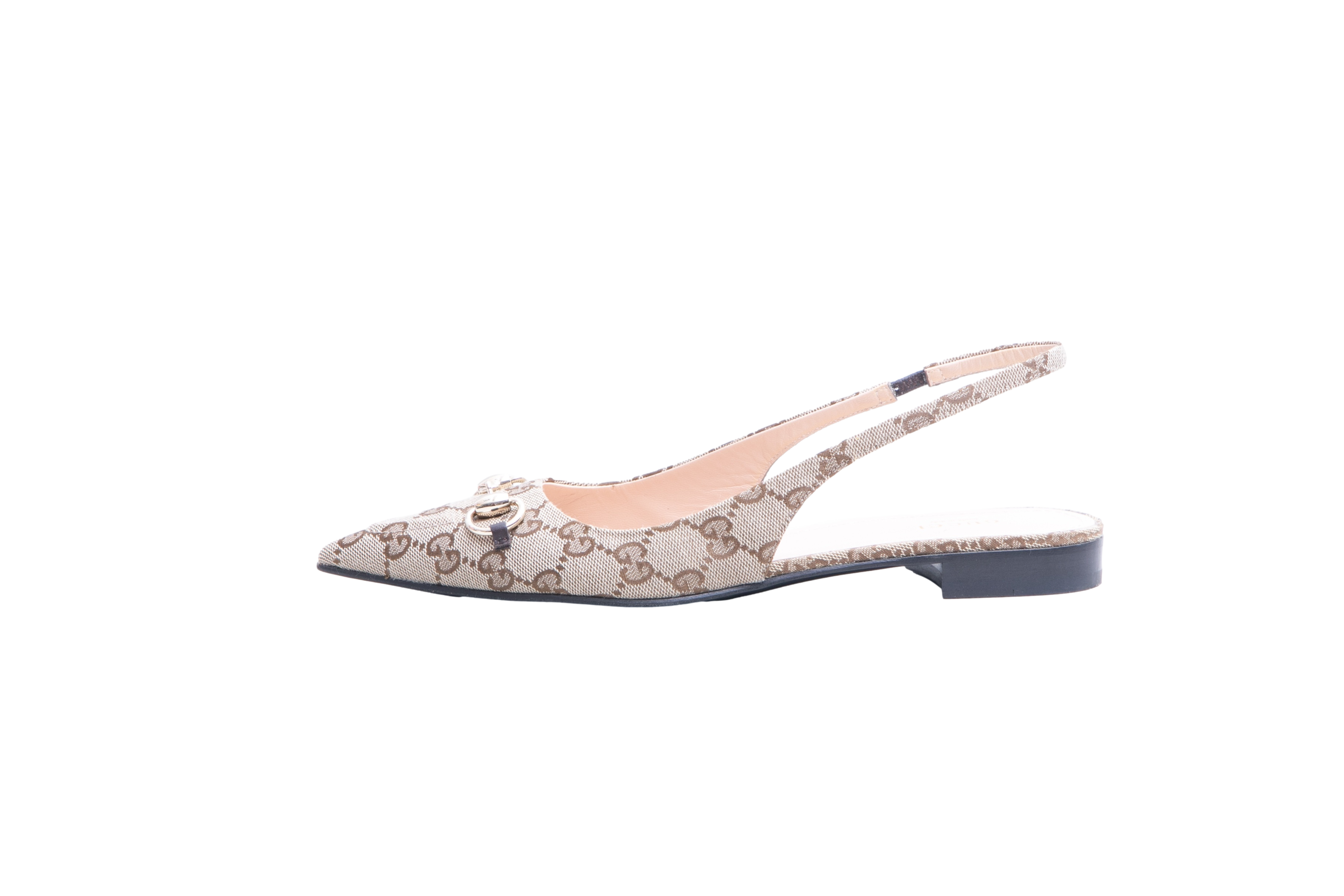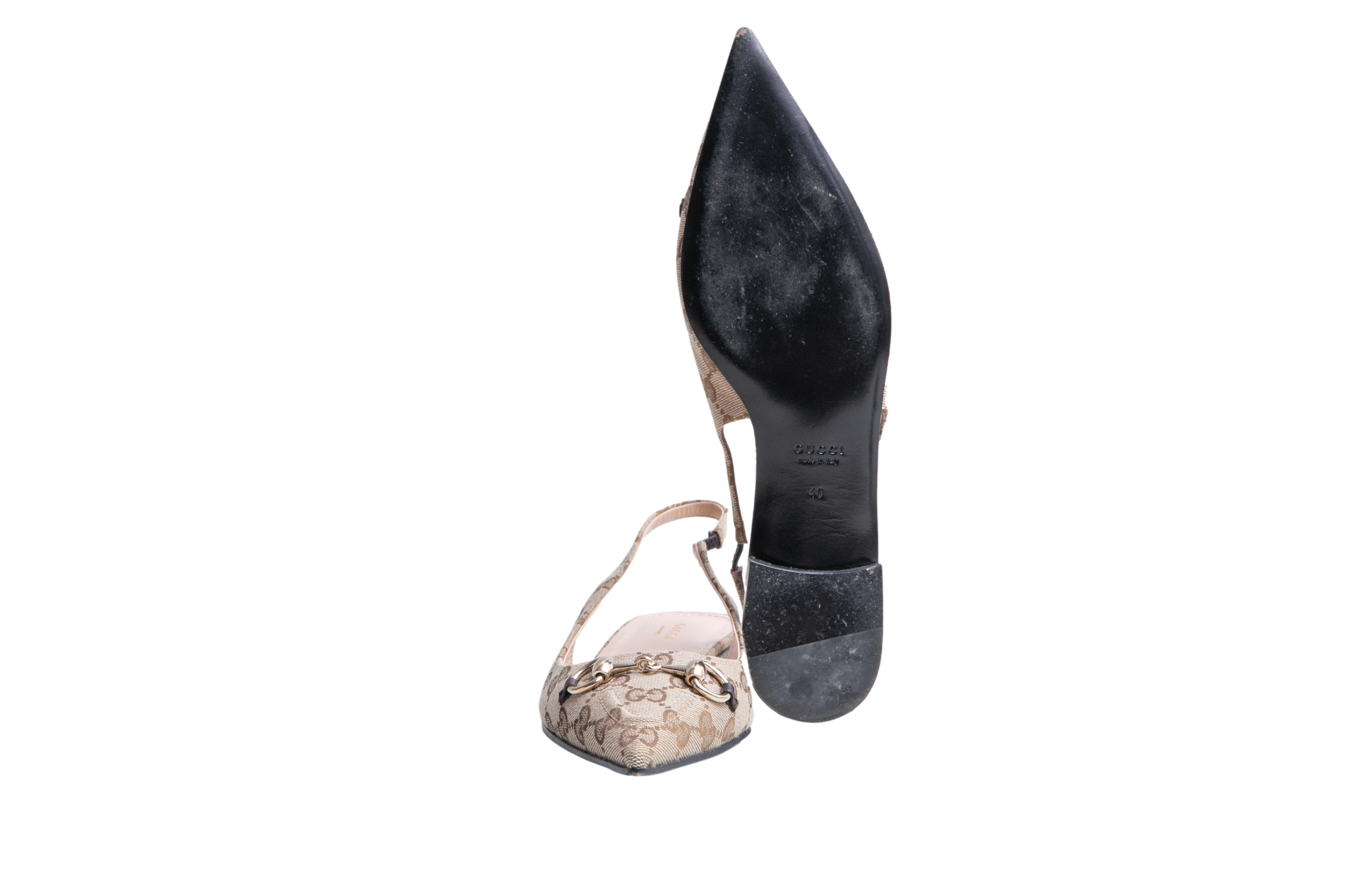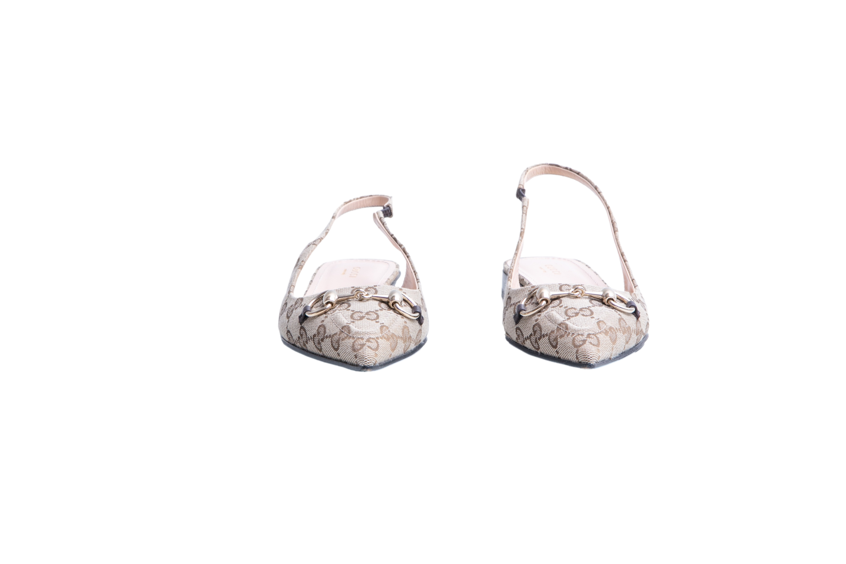Sapato confeccionado em canvas bege com monograma GG. Slingback de bico fino, com detalhe metálico dourado na parte frontal o tradicional horsebit da marca. Possui salto baixo e interior em couro.
