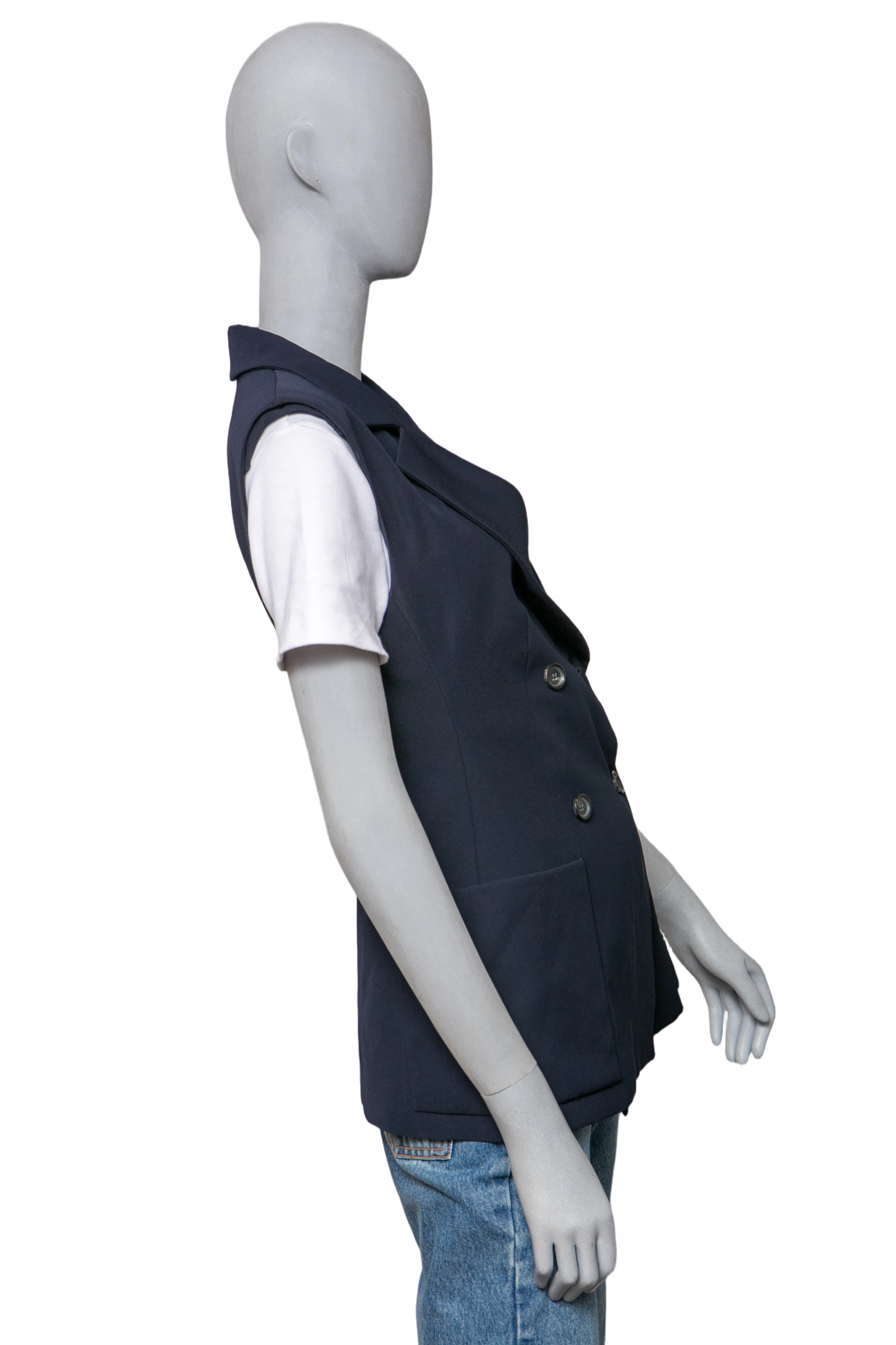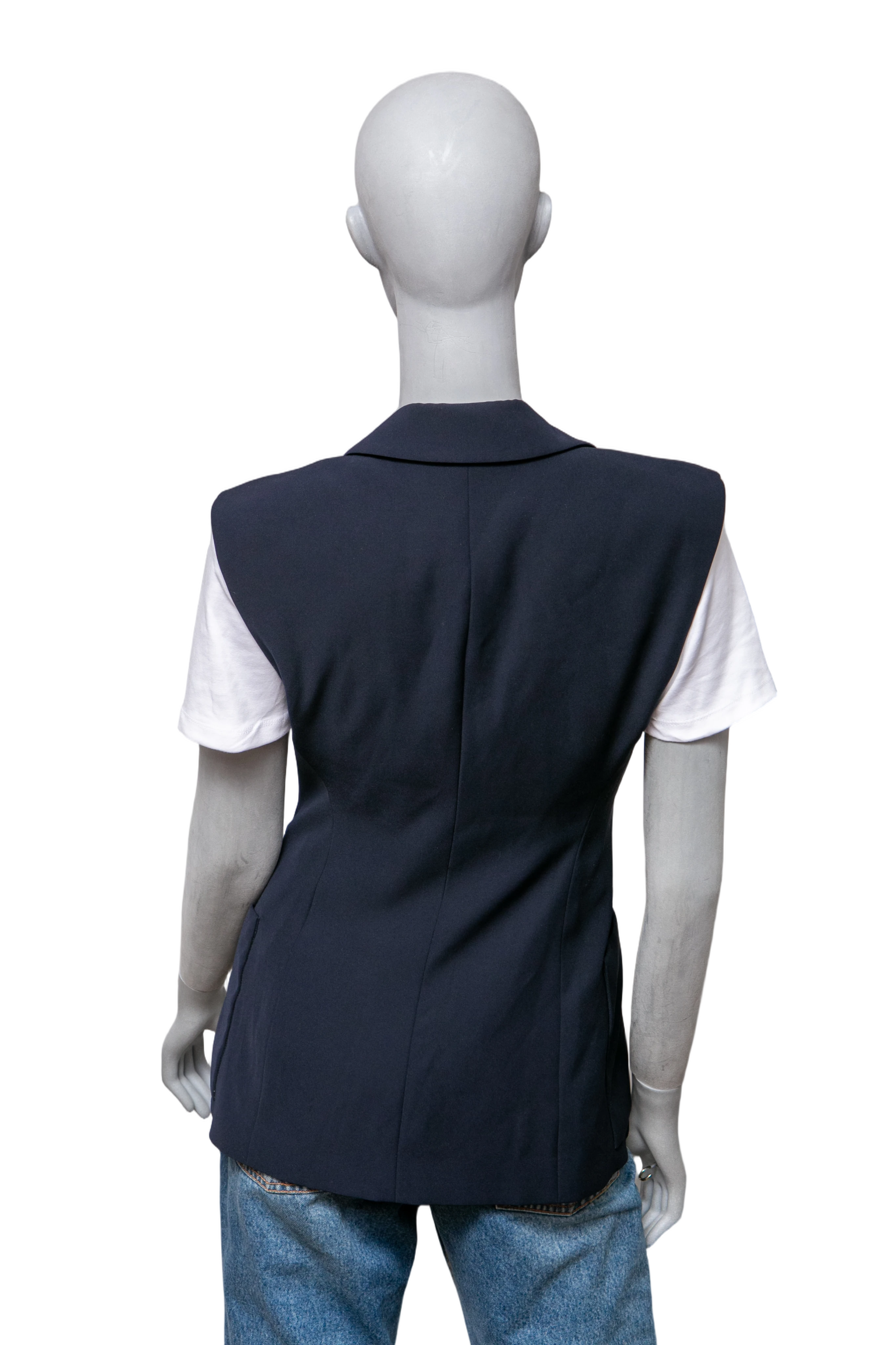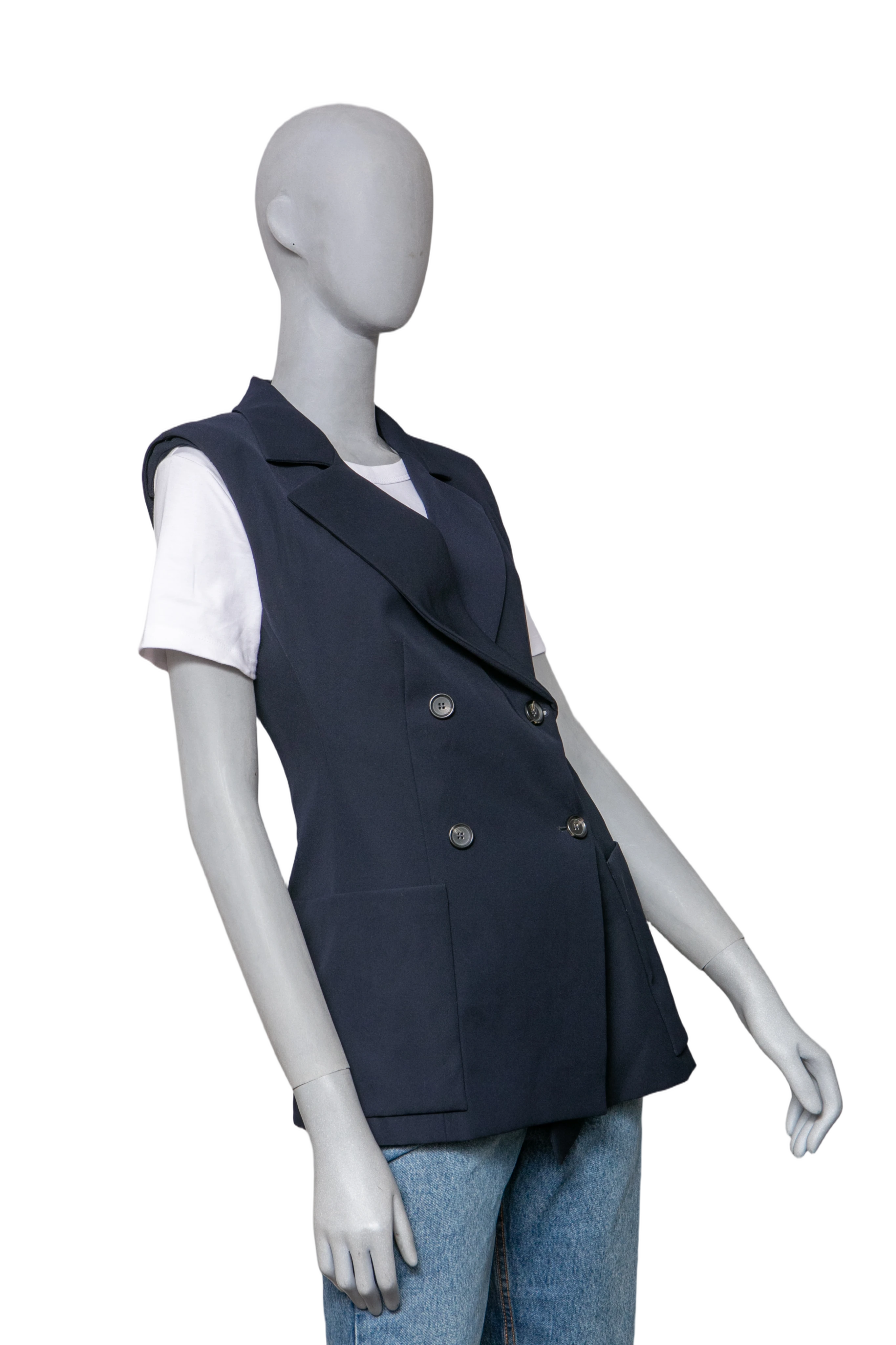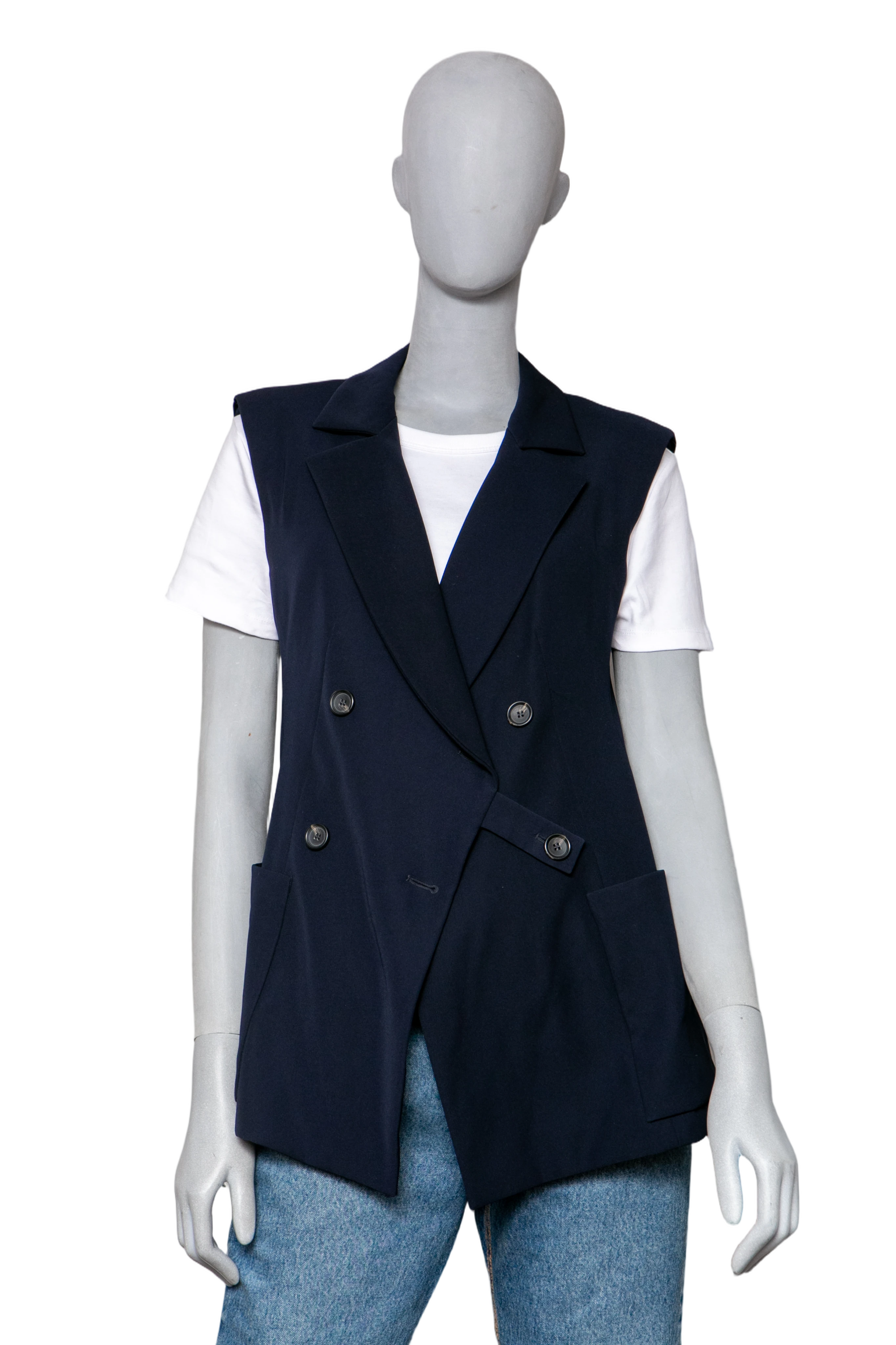 Colete em alfaiataria, confeccionado em tecido estruturado na cor azul marinho. O modelo apresenta design sem mangas, fechamento transpassado com botões duplos frontais e bolsos laterais aplicados. Possui gola lapela clássica e caimento reto.