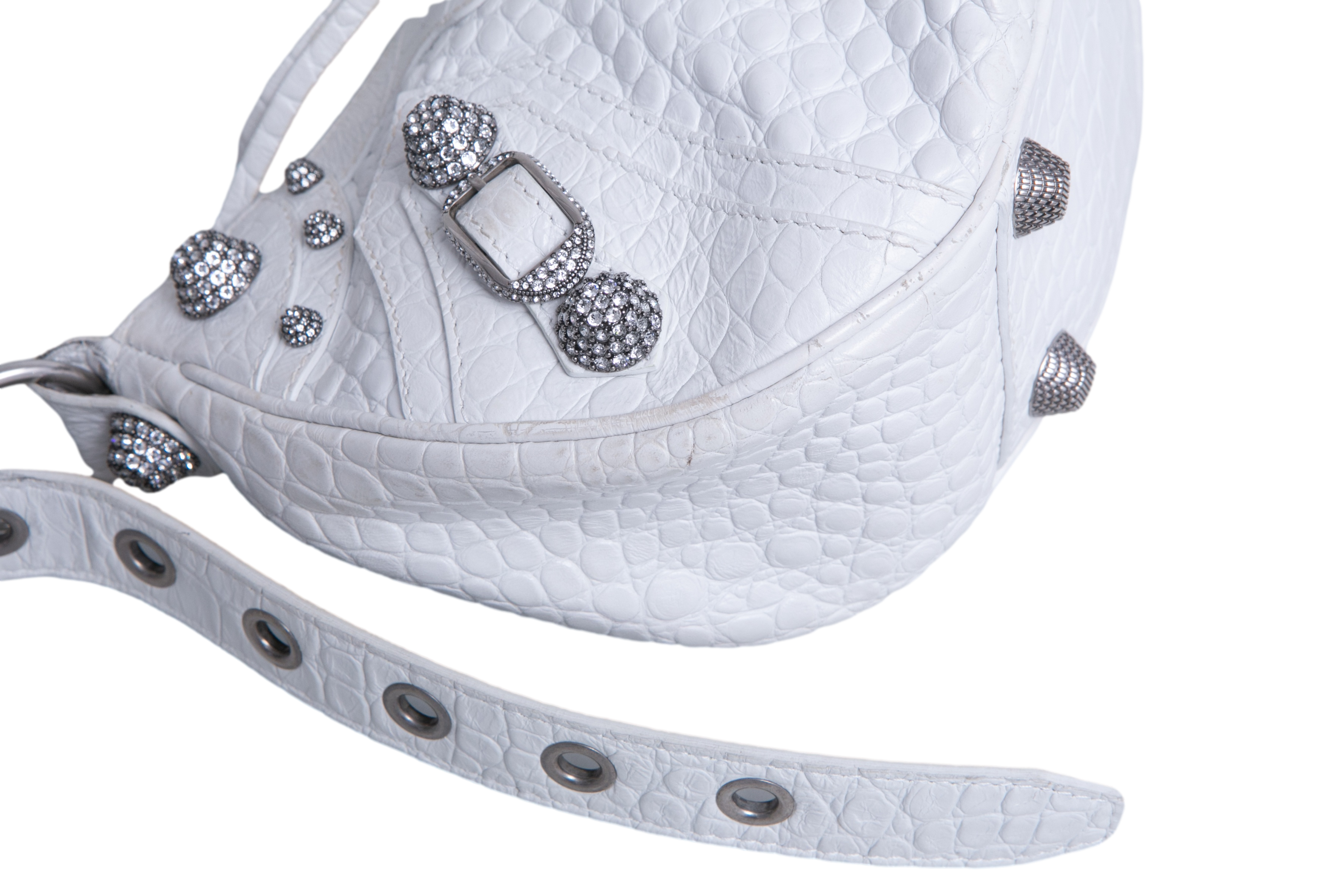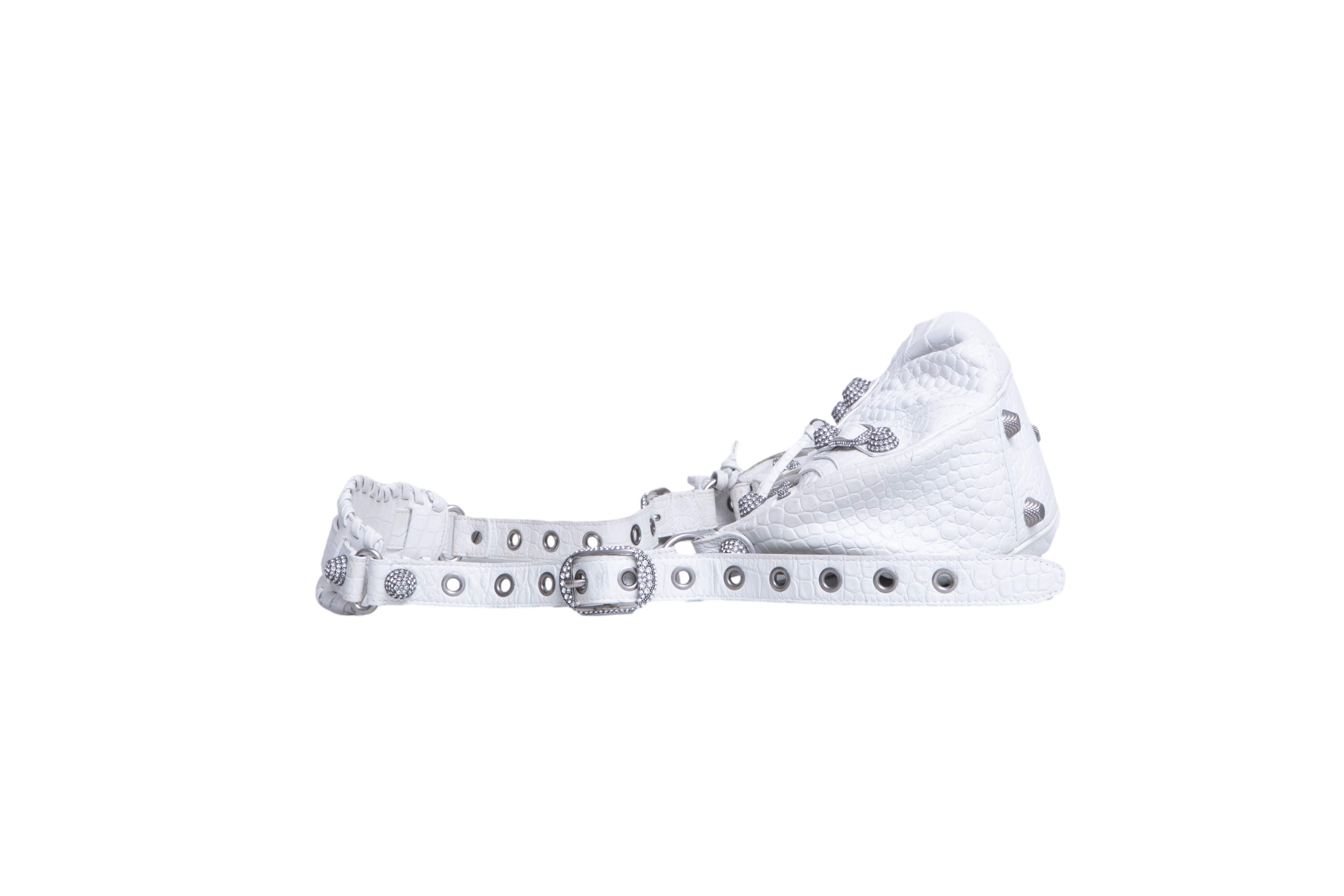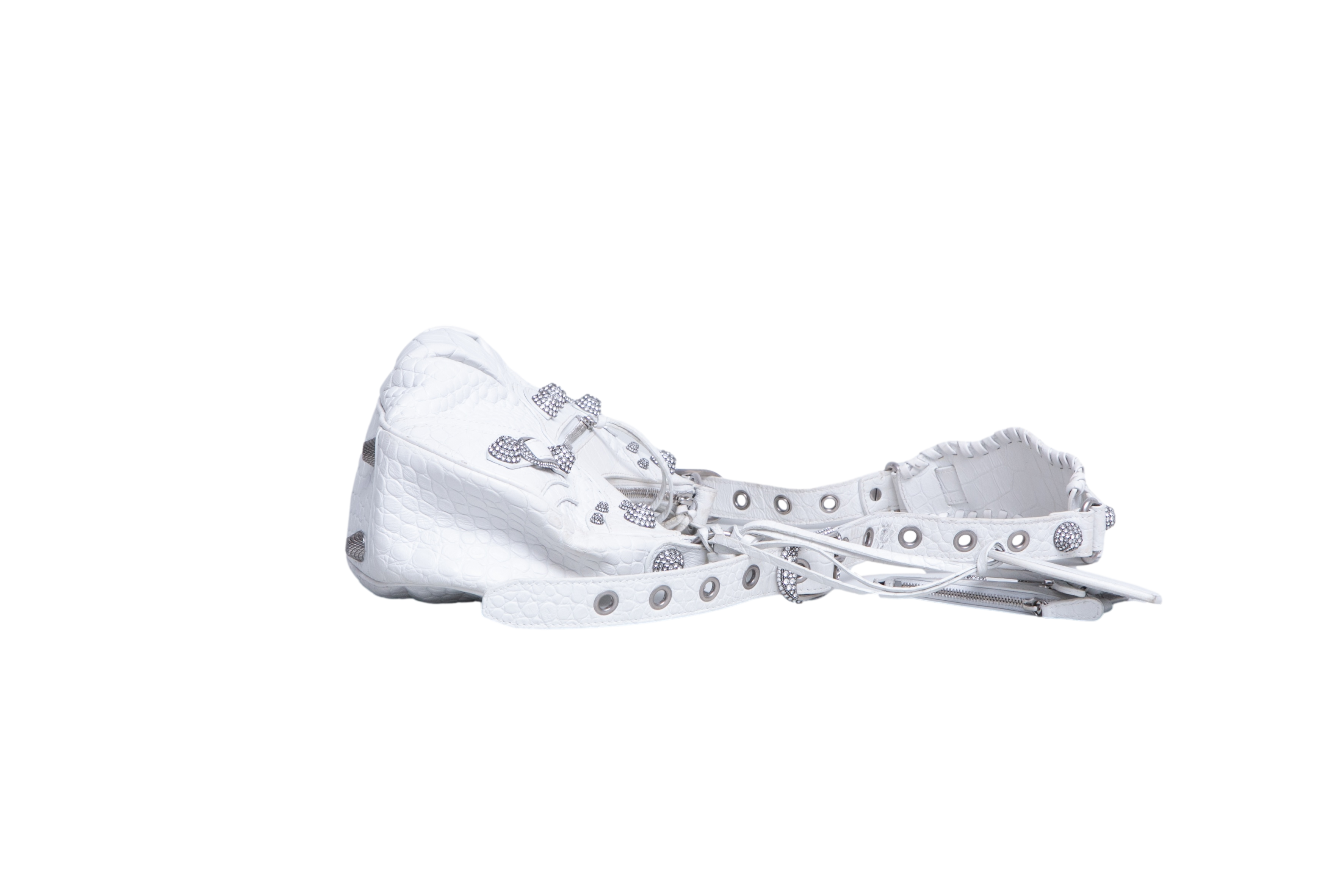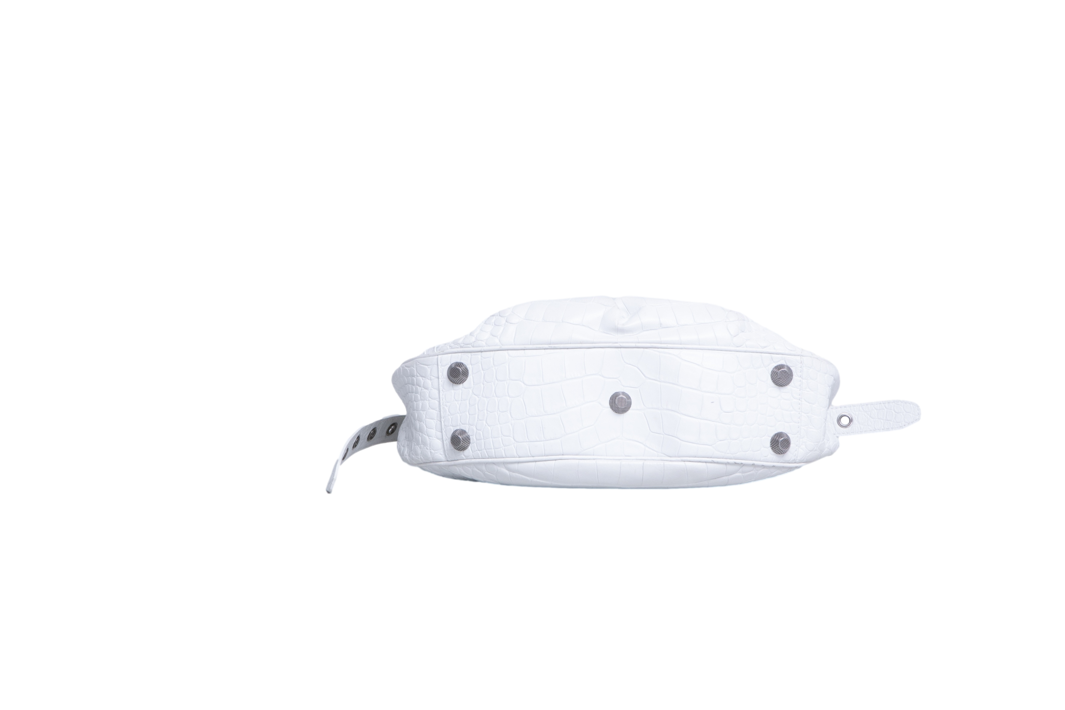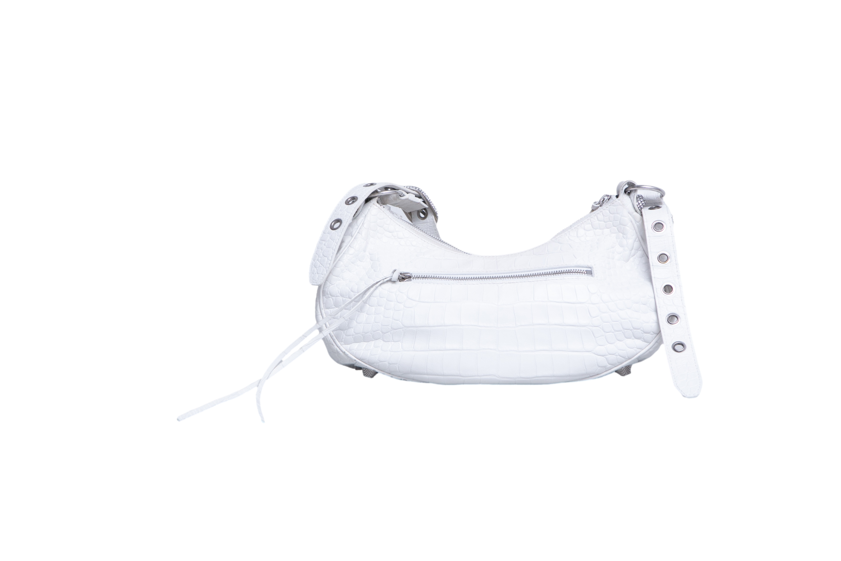 Bolsa em couro branco com textura crocodilo, com detalhes metálicos prateados, tachas e zíper frontal, além de alça de ombro ajustada com acabamento trançado. Alça para uso shoulder.