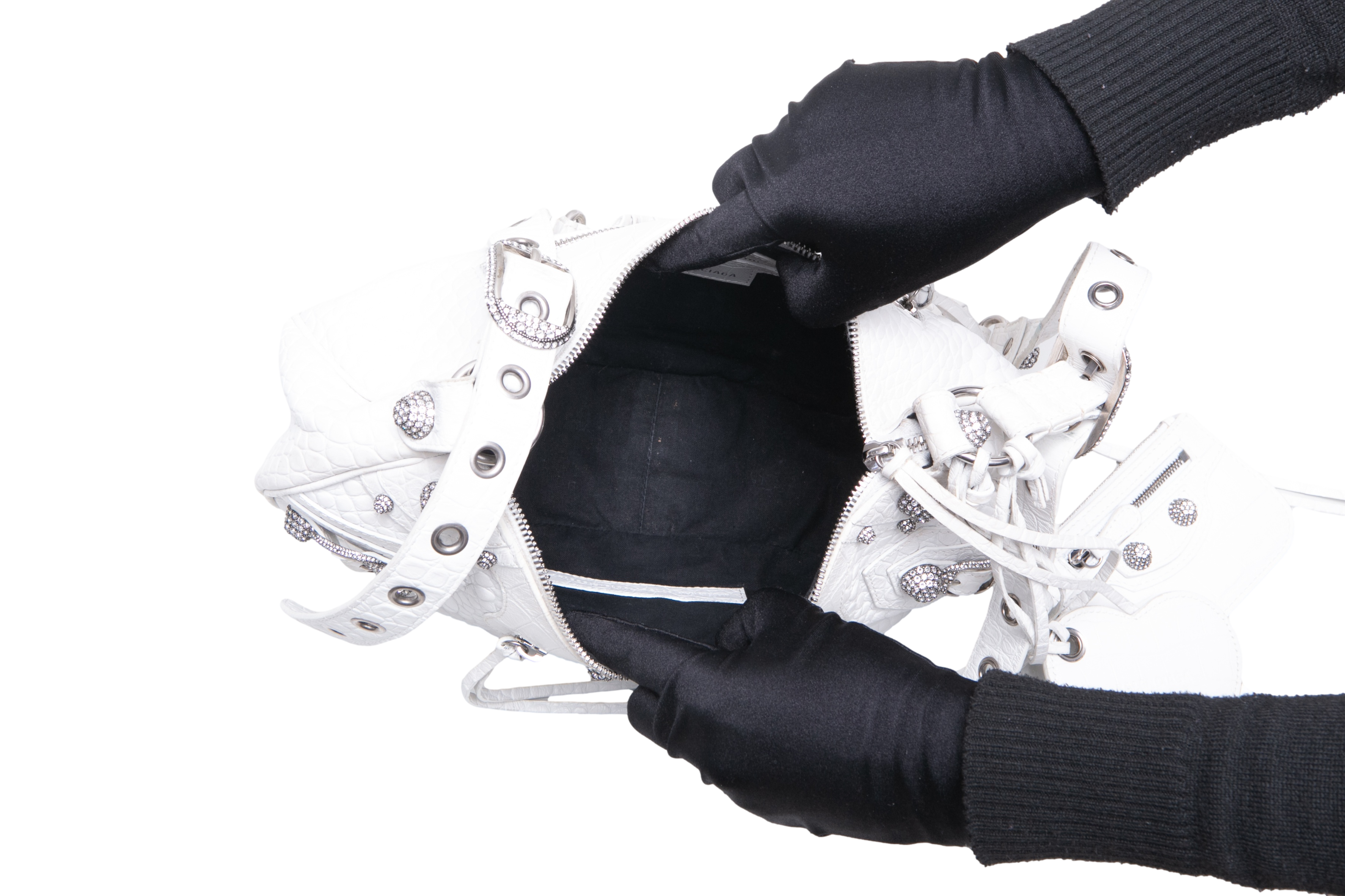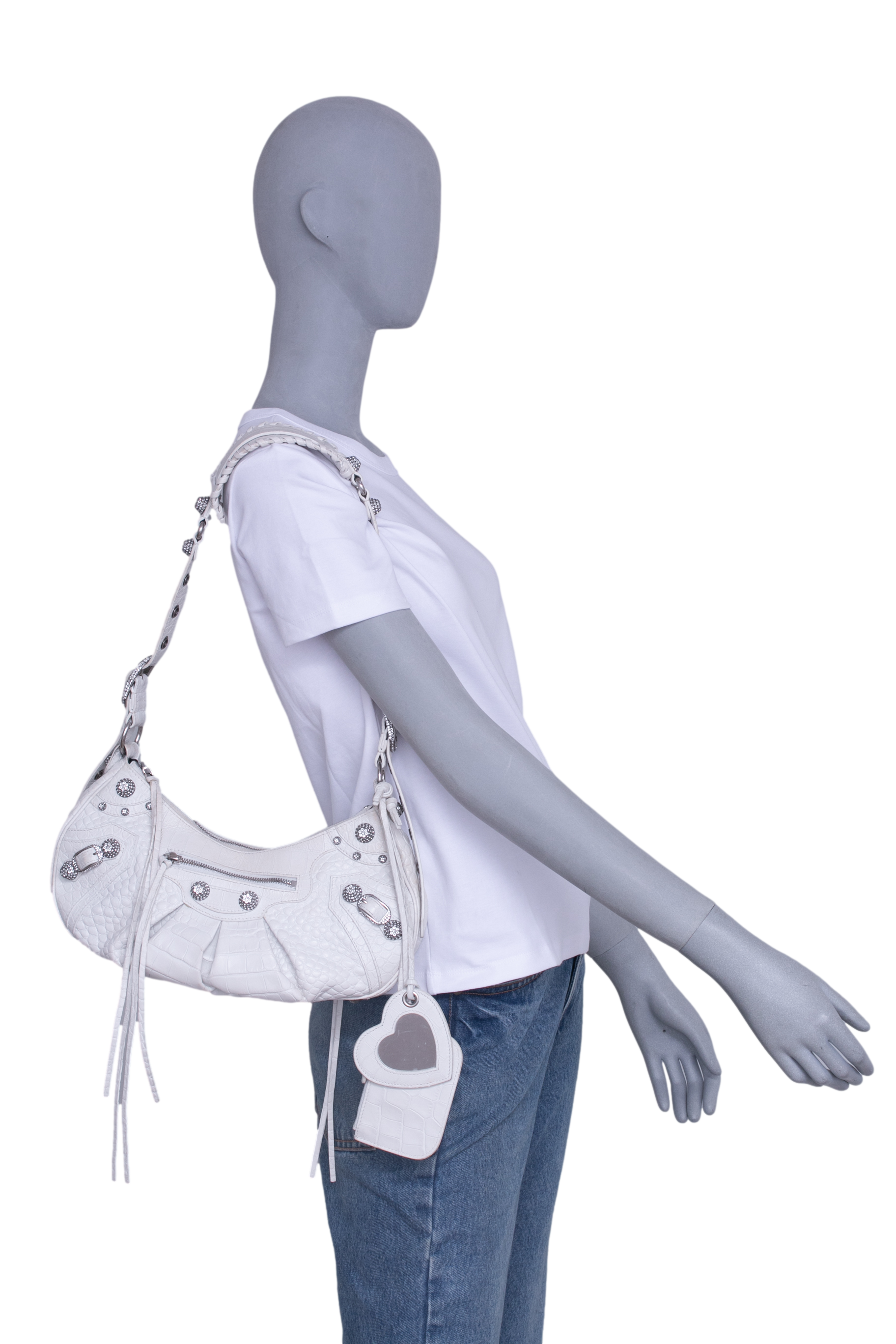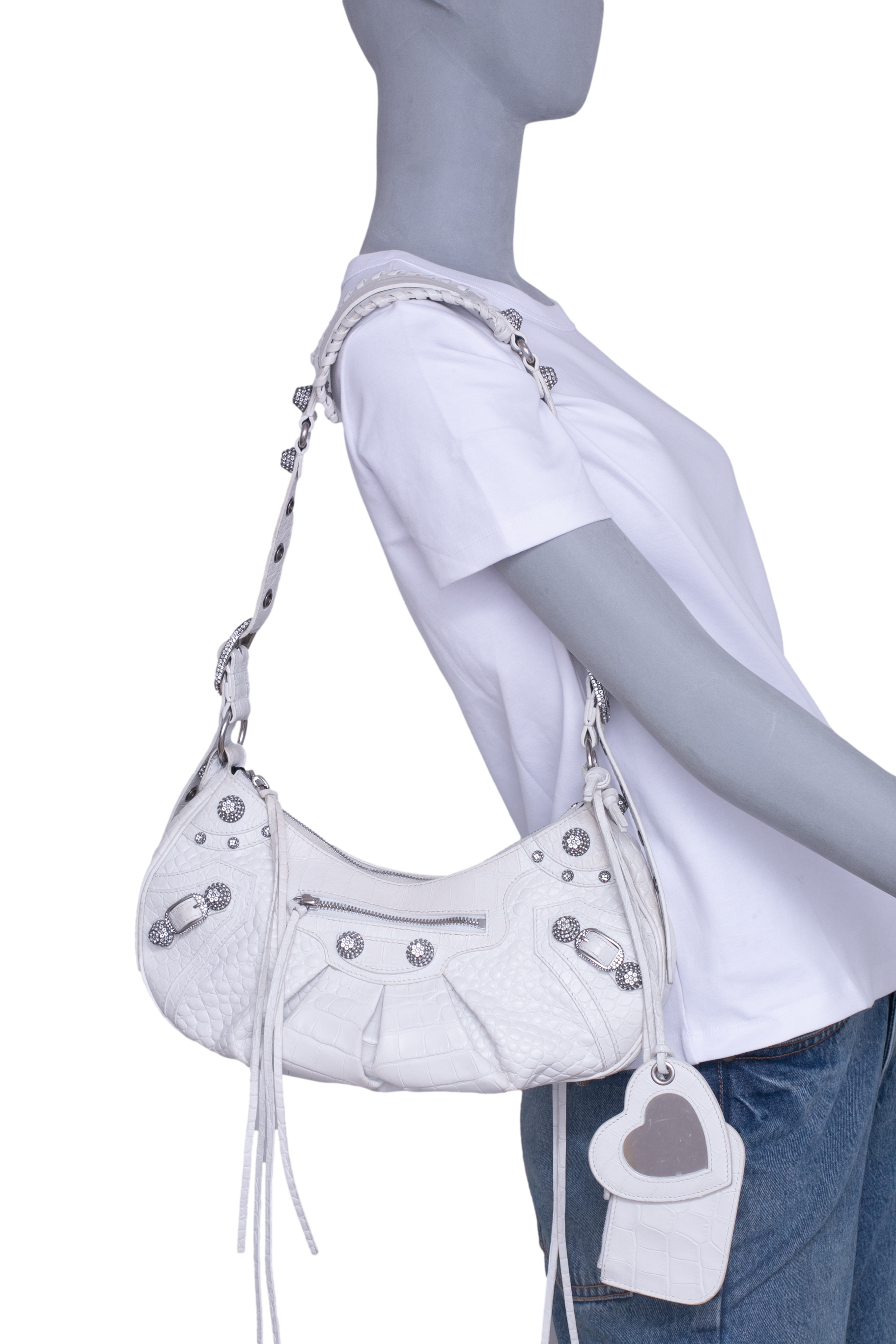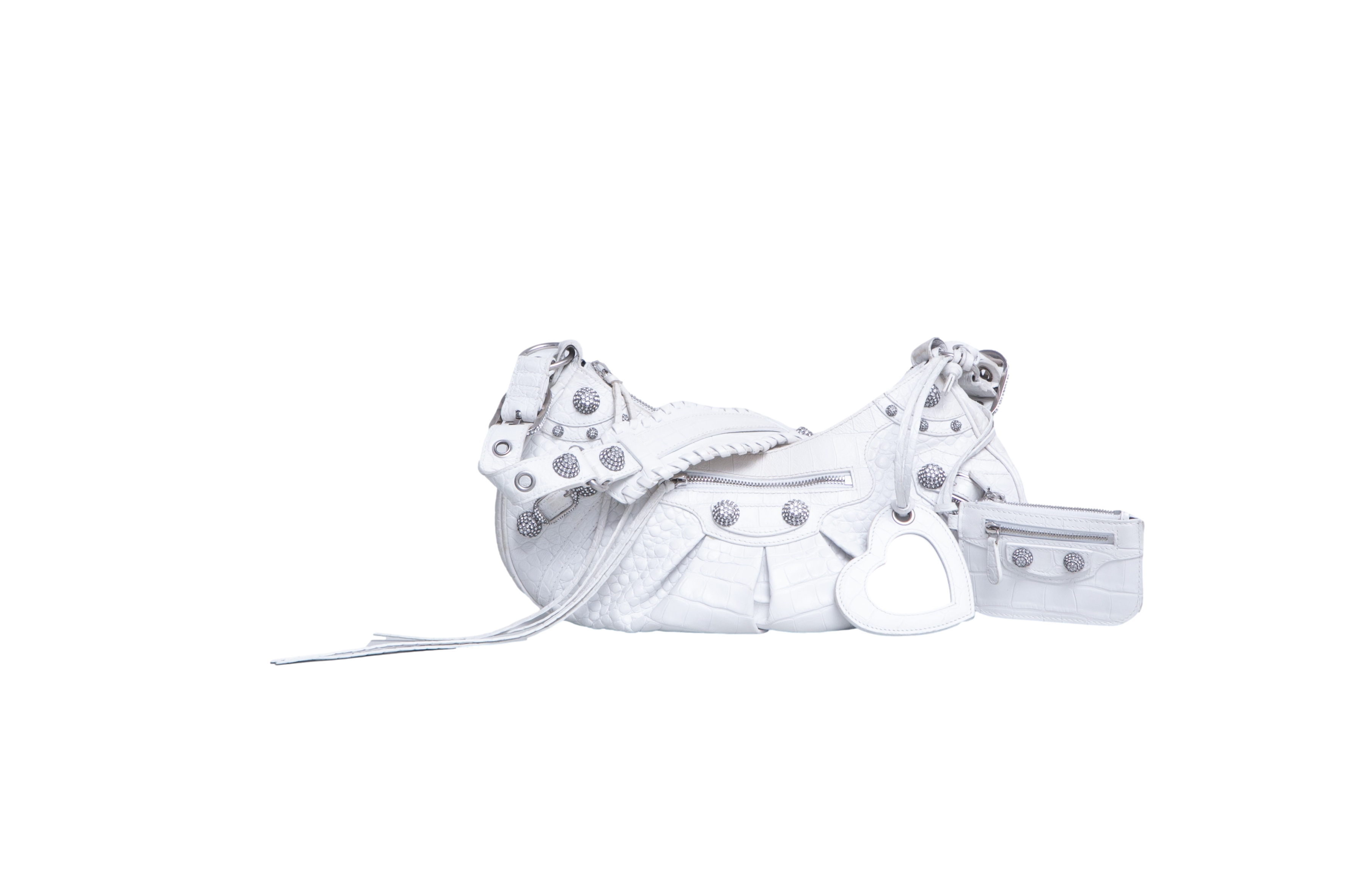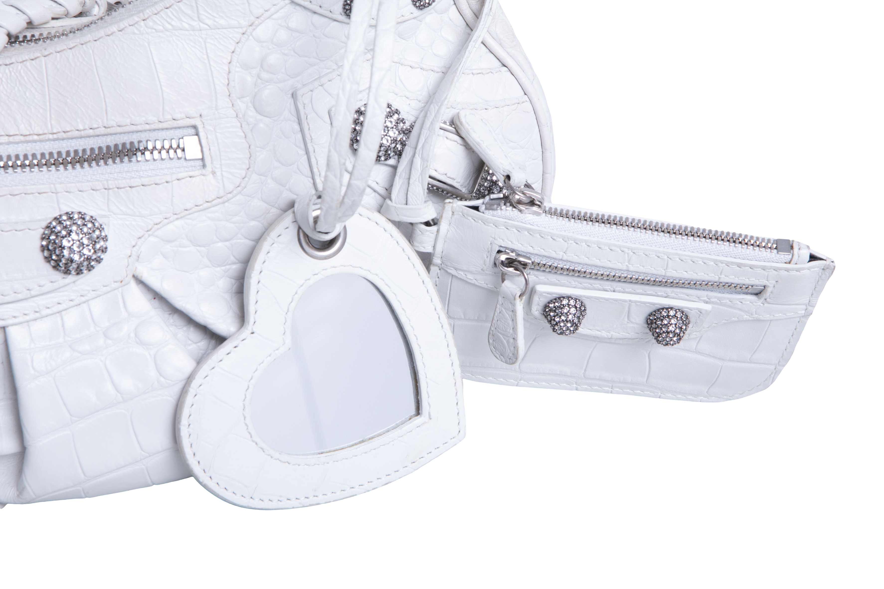 Bolsa em couro branco com textura crocodilo, com detalhes metálicos prateados, tachas e zíper frontal, além de alça de ombro ajustada com acabamento trançado. Alça para uso shoulder.