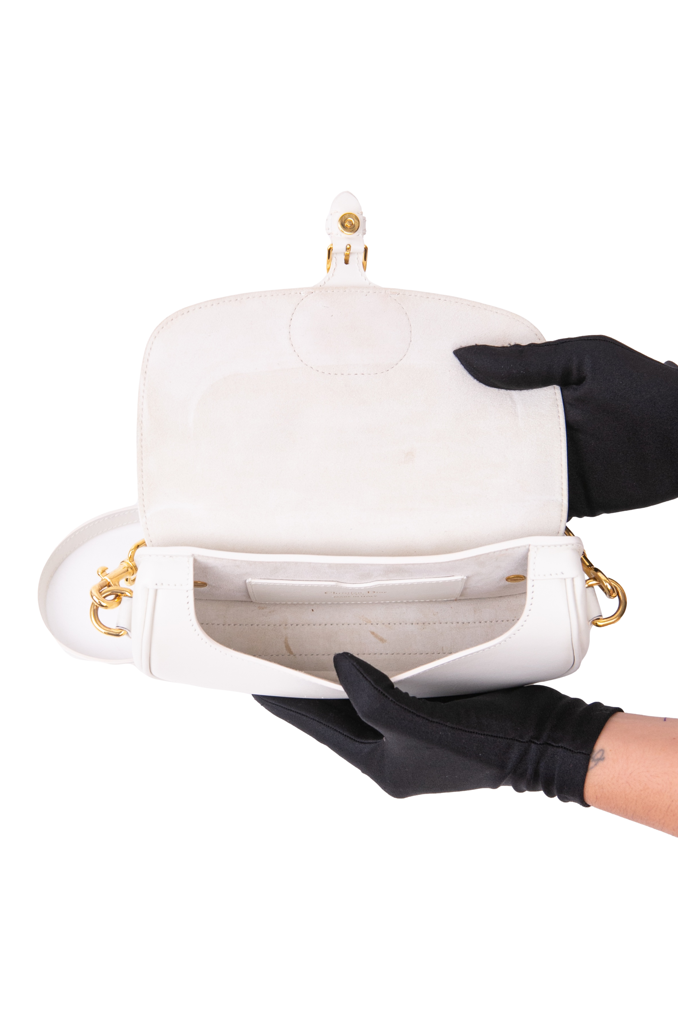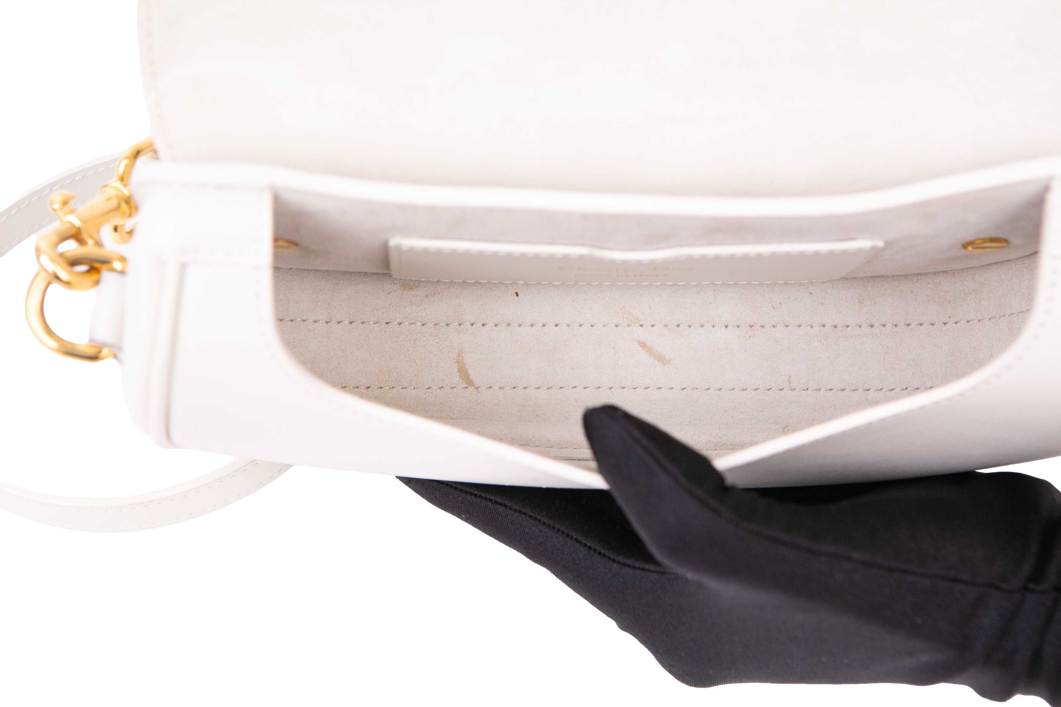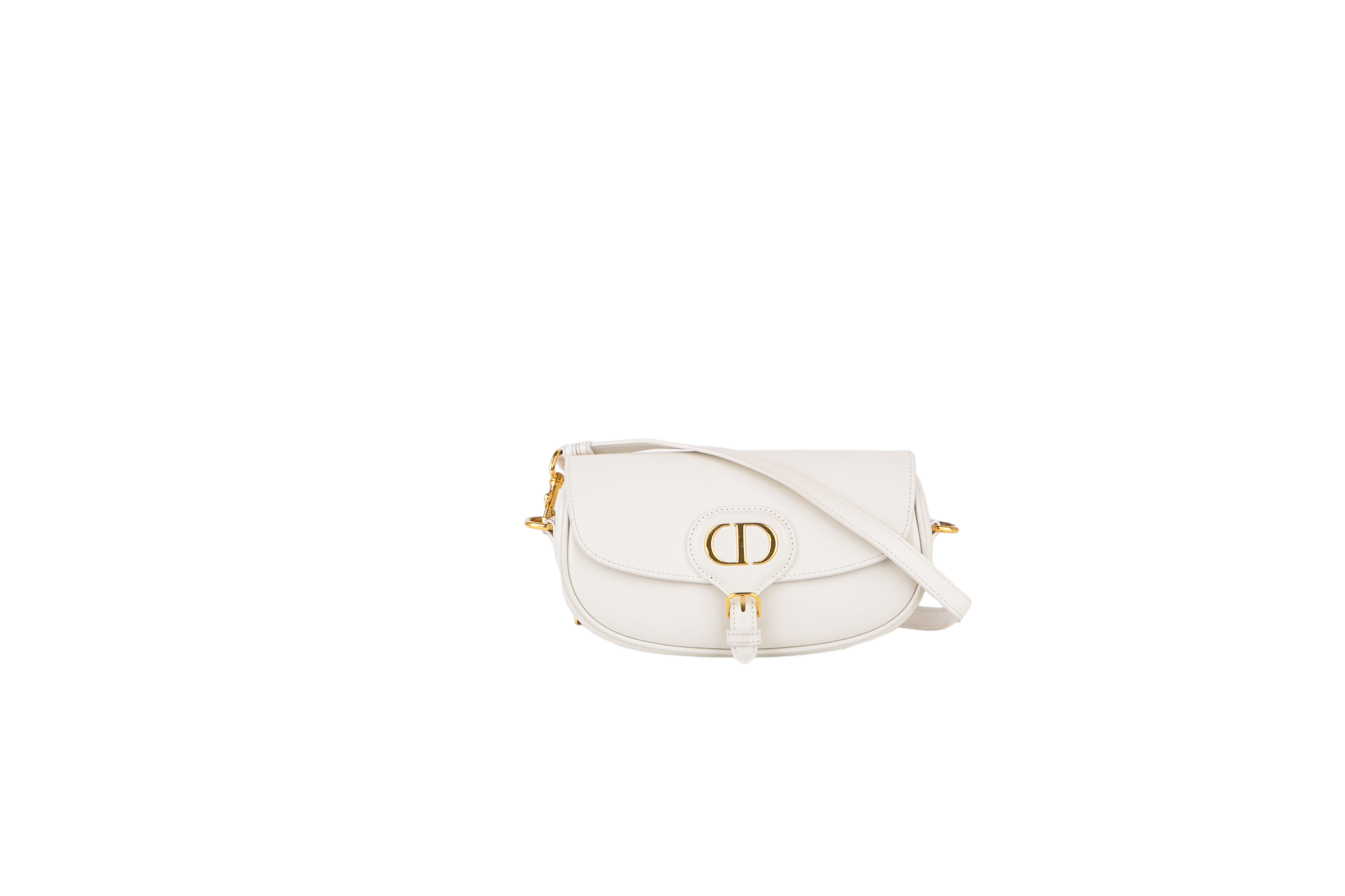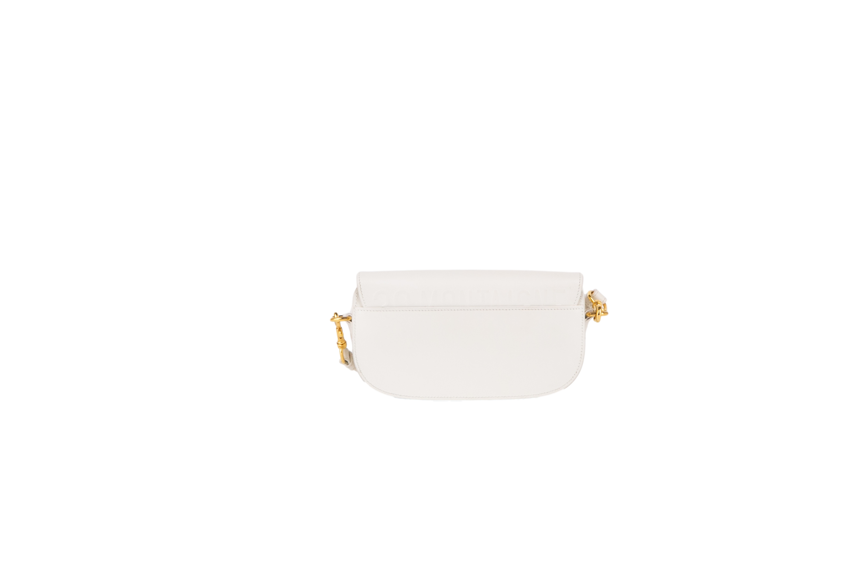 Confeccionada em couro de vitelo box na cor latte, a bolsa exibe um acabamento liso e estruturado, proporcionando um visual refinado. Seu interior é revestido em couro de vitelo acamurçado, oferecendo uma textura suave e maior maleabilidade. Os detalhes metálicos em dourado envelhecido, incluindo a fivela decorativa com as iniciais "CD", adicionam um charme atemporal à peça.