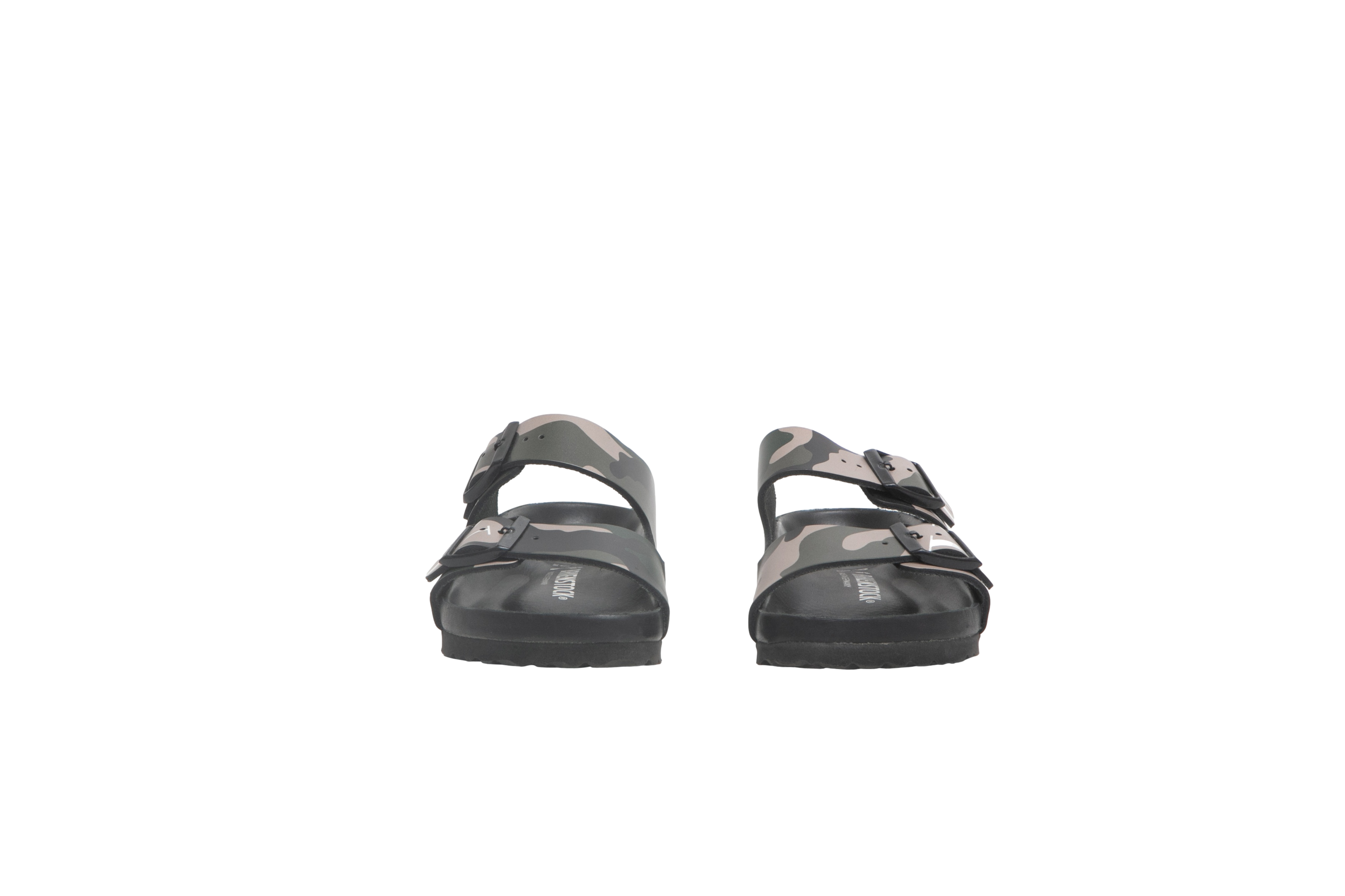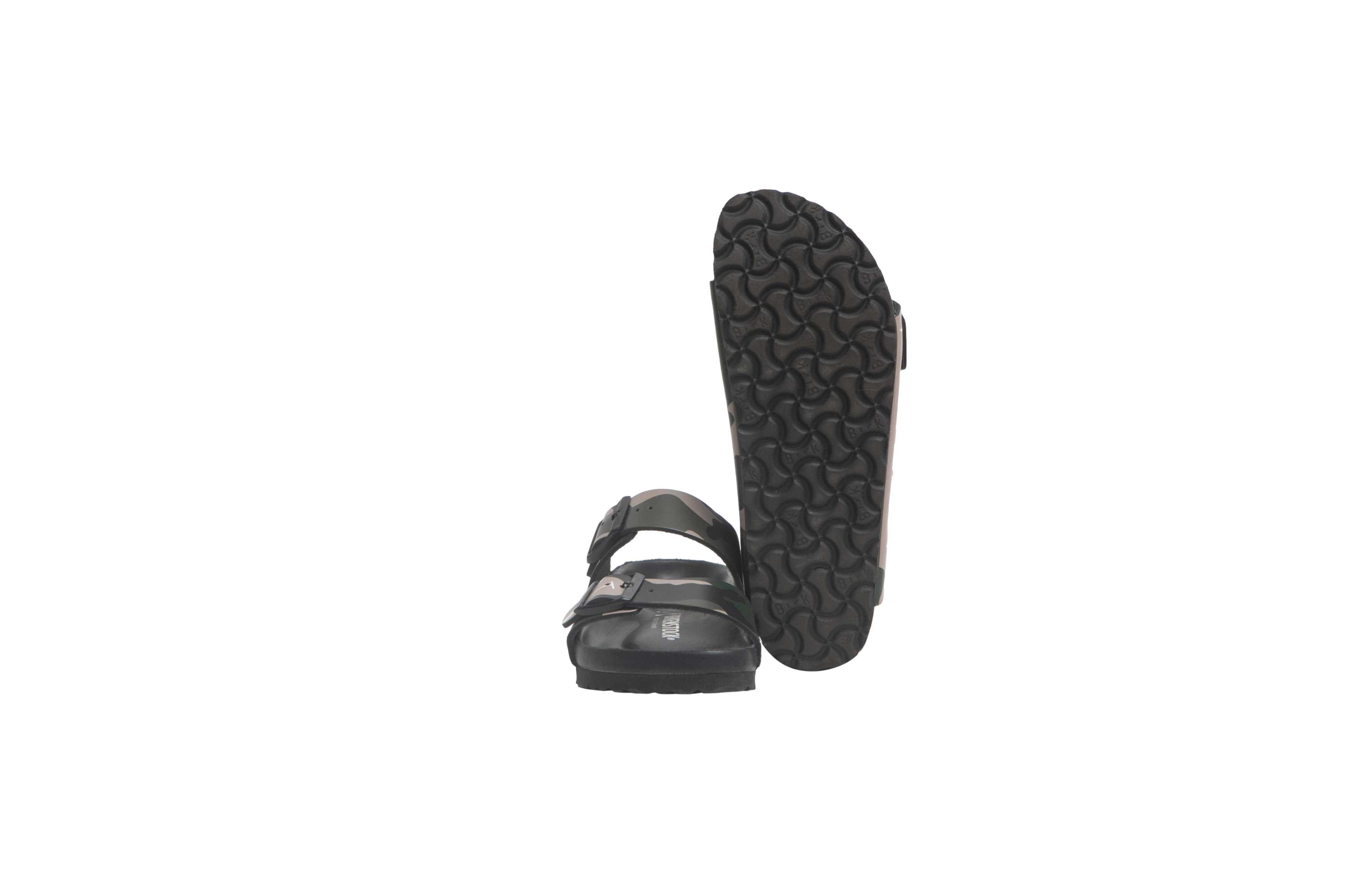 Com uma base de sola anatômica, característica da Birkenstock, o modelo oferece extremo conforto e suporte, garantindo uma experiência de uso prolongada sem abrir mão do estilo. O tom militar predominante, que mistura nuances de verde e detalhes em preto, confere ao modelo um visual arrojado e contemporâneo, ao mesmo tempo em que faz referência ao estilo utilitário e casual.