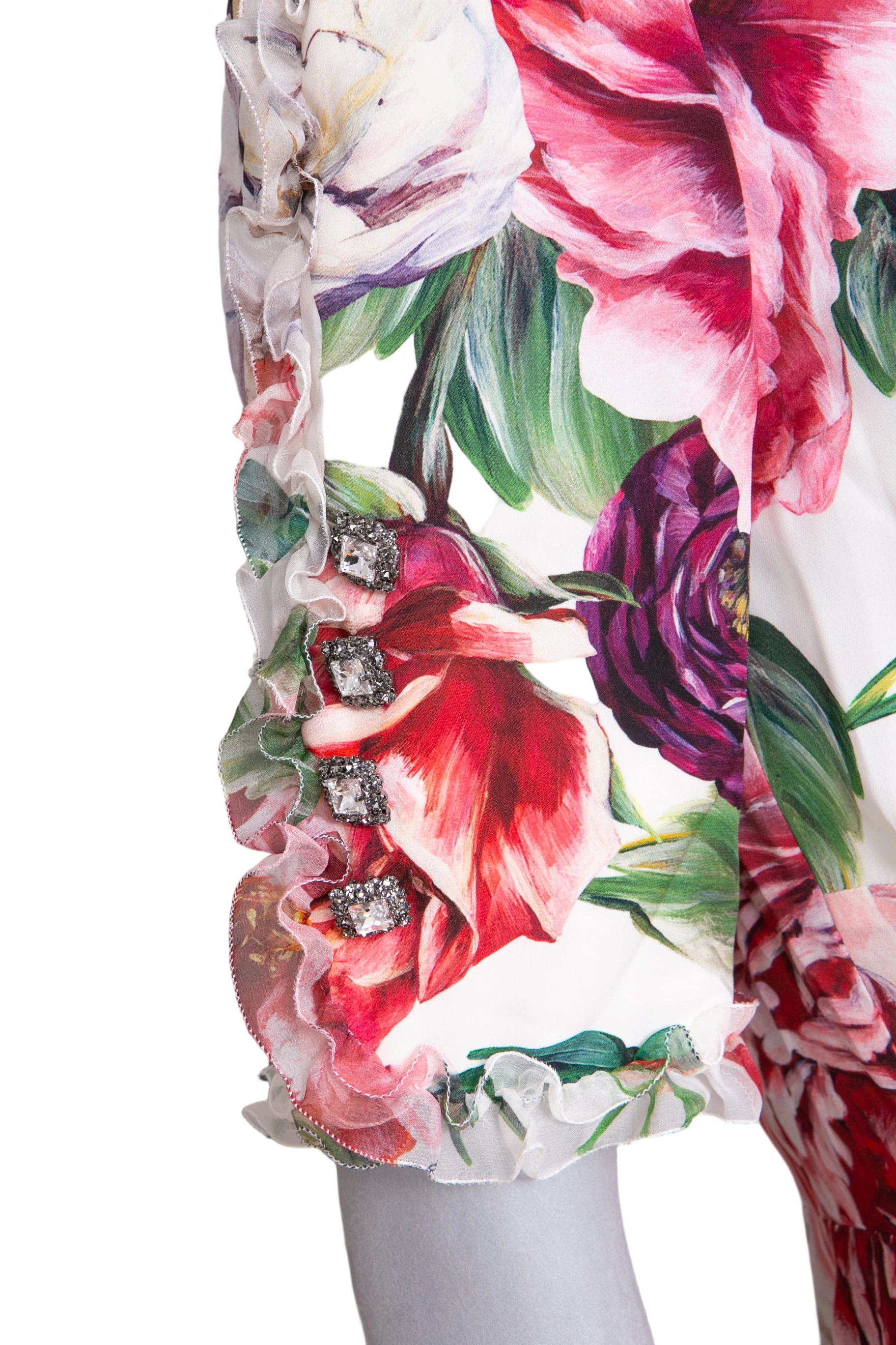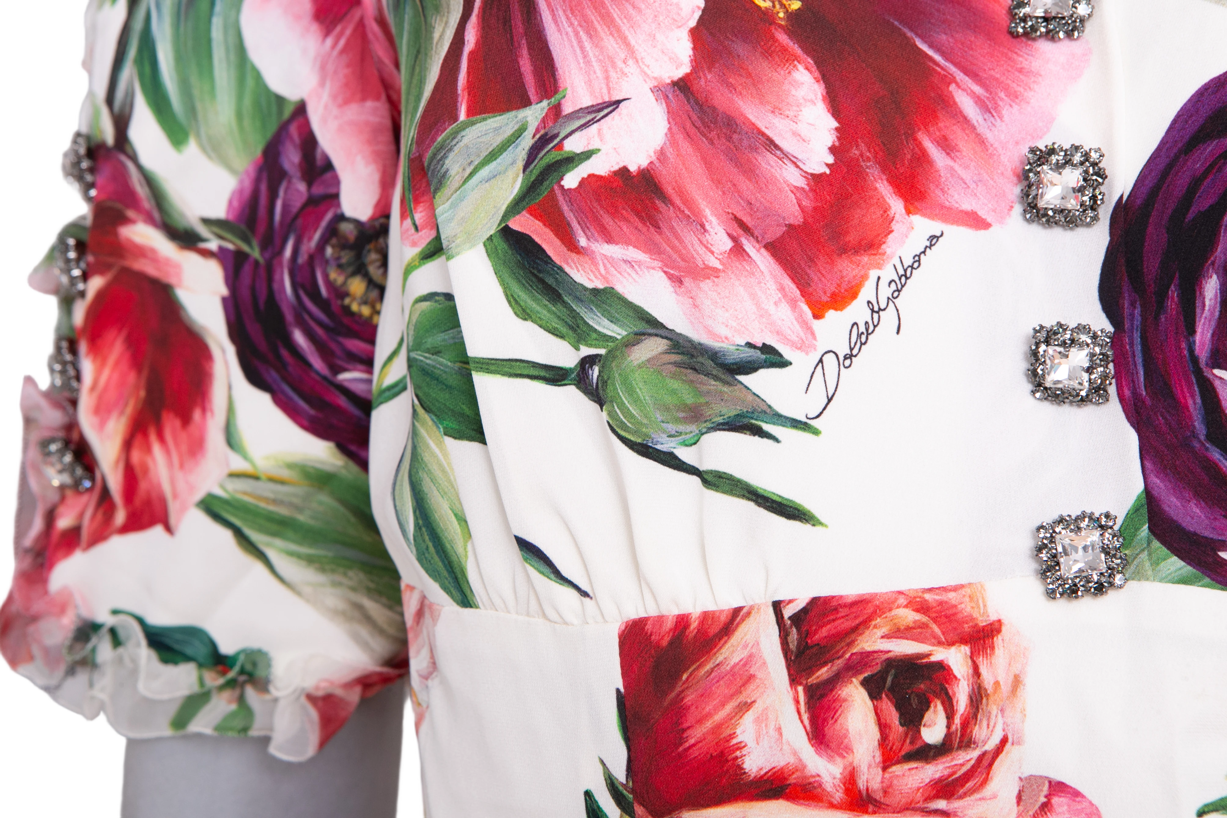 Vestido midi em fundo branco com estampa floral multicolorida em tons vibrantes de rosa, roxo, vermelho e verde. O modelo apresenta mangas curtas, decote redondo, detalhe de botões frontais com aplicação de cristais e saia levemente rodada com babado na barra.