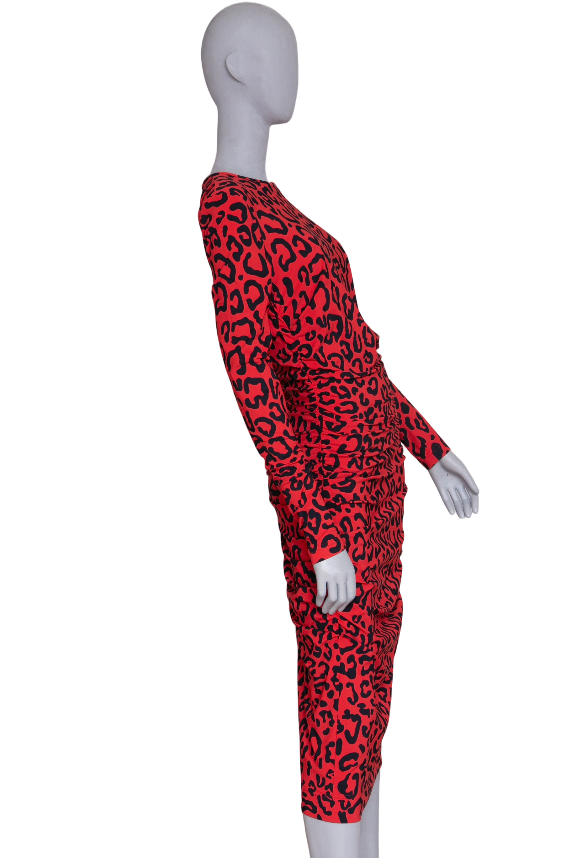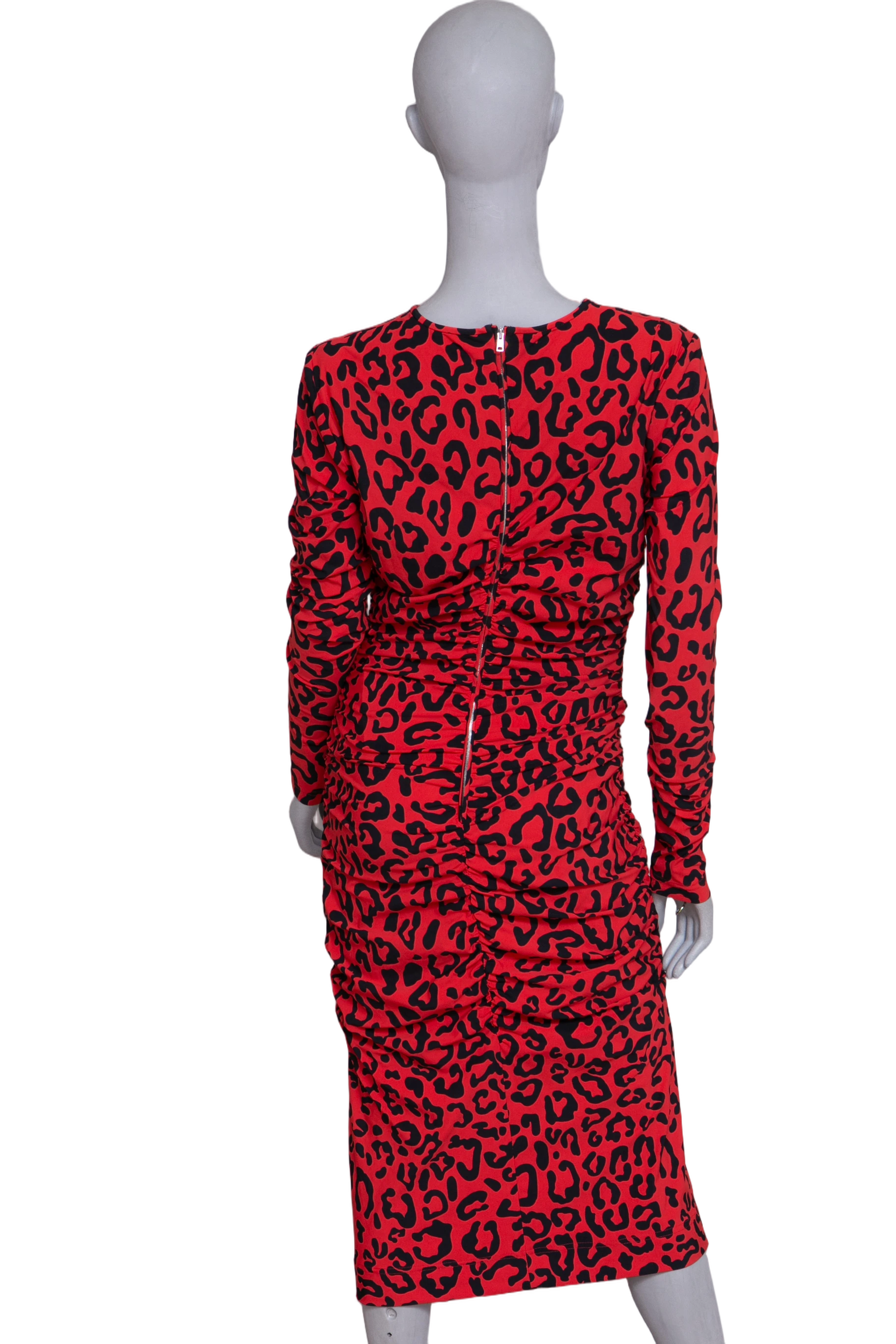 Vestido midi em estampa animal print nas cores vermelho vibrante e preto. O modelo possui mangas longas, gola redonda e caimento ajustado ao corpo.