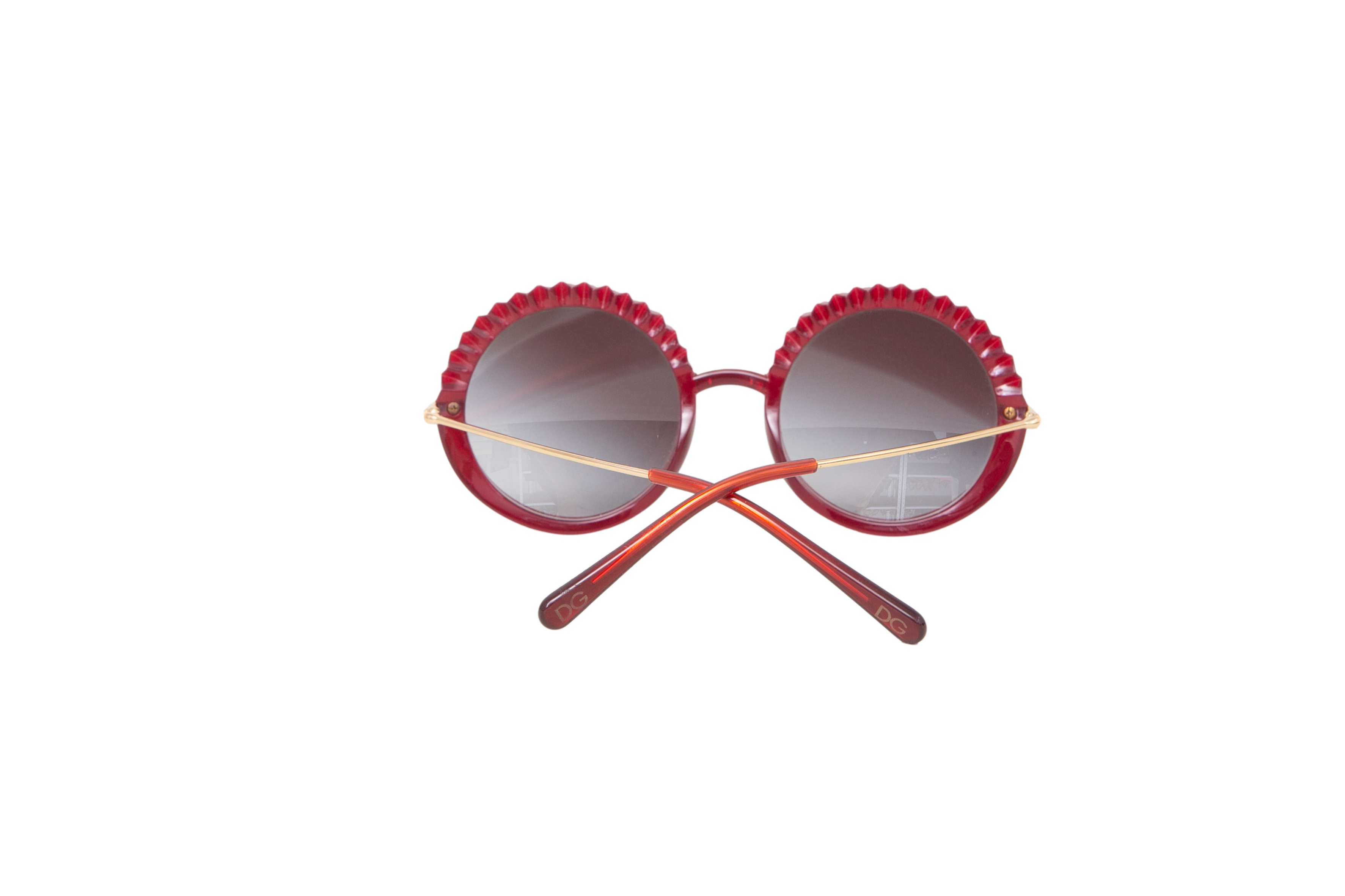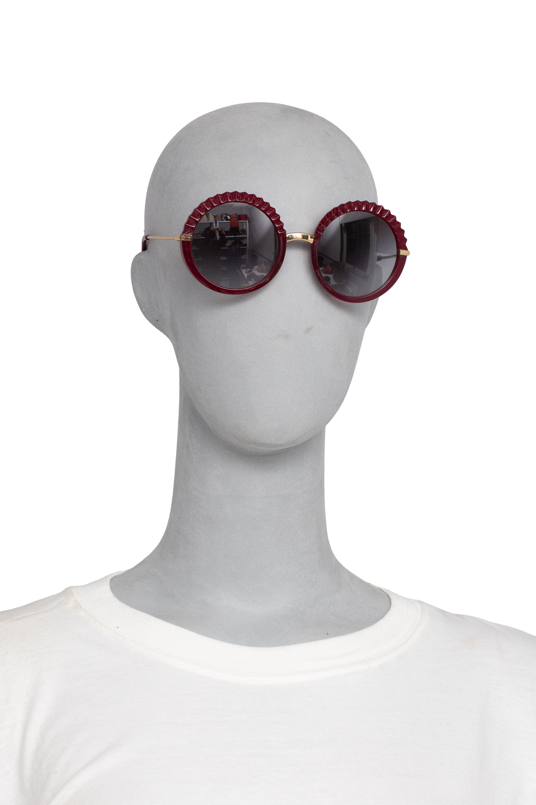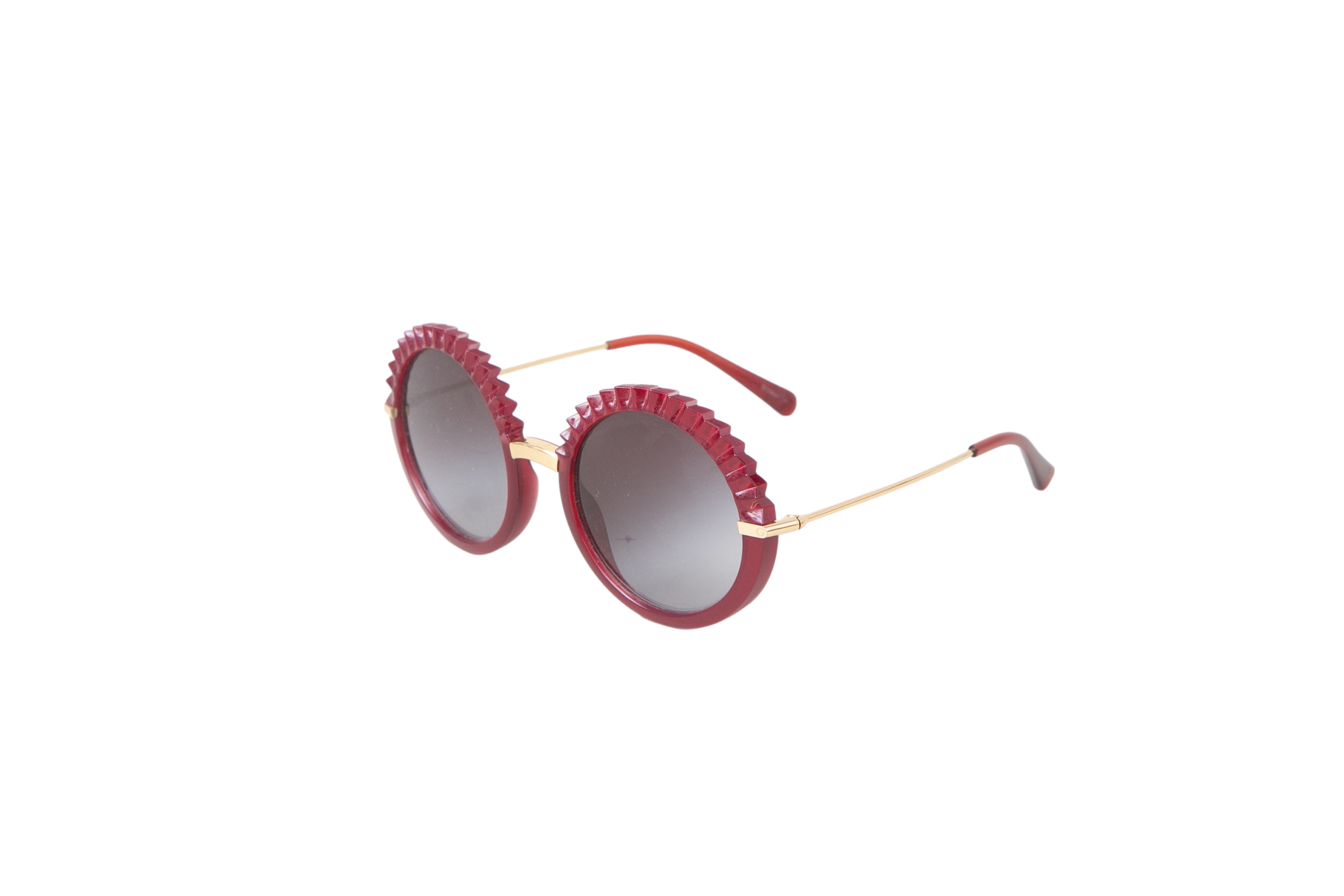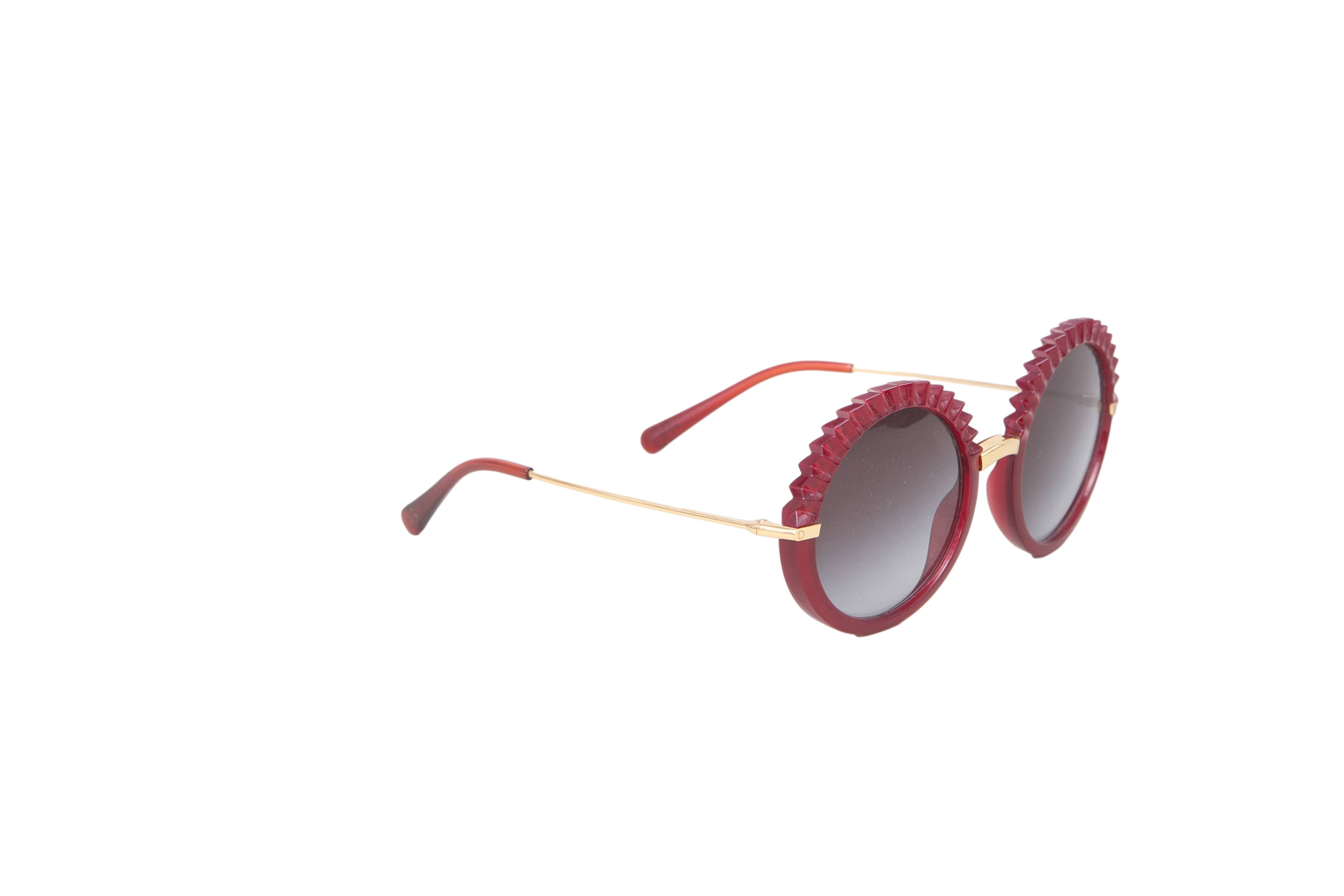 O óculos apresenta um design ousado e sofisticado, perfeito para quem busca personalidade e estilo marcante. A armação redonda em acetato vermelho profundo traz um toque vibrante e moderno, enquanto o detalhe em relevo na parte superior confere um visual único e elegante.