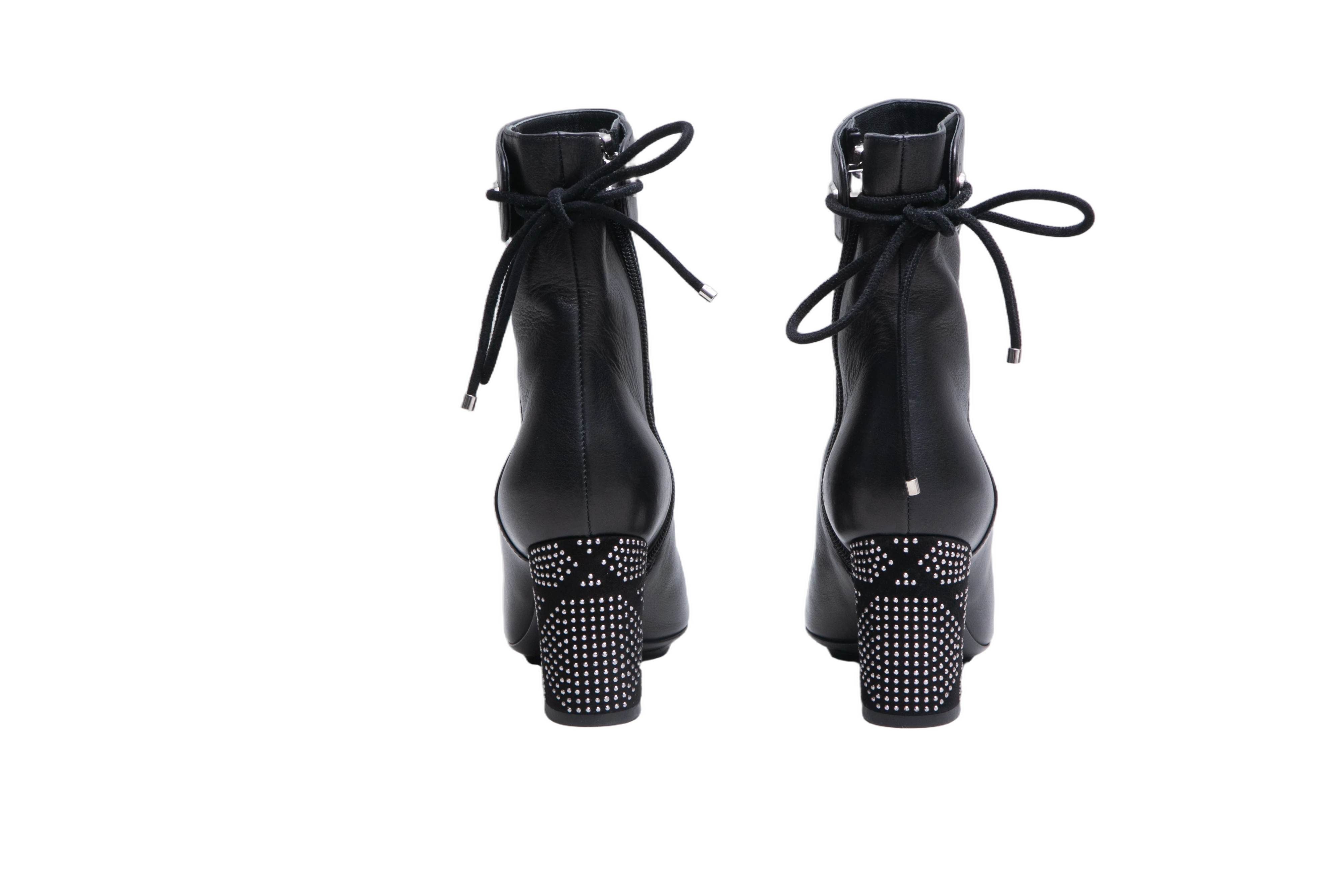 Bota em couro preto de cano curto, com design elegante e sofisticado. Possui amarração discreta na parte traseira e fechamento lateral por zíper. O destaque fica por conta do salto bloco revestido com aplicação de microcristais em padronagem geométrica, que adiciona um toque de luxo e modernidade.