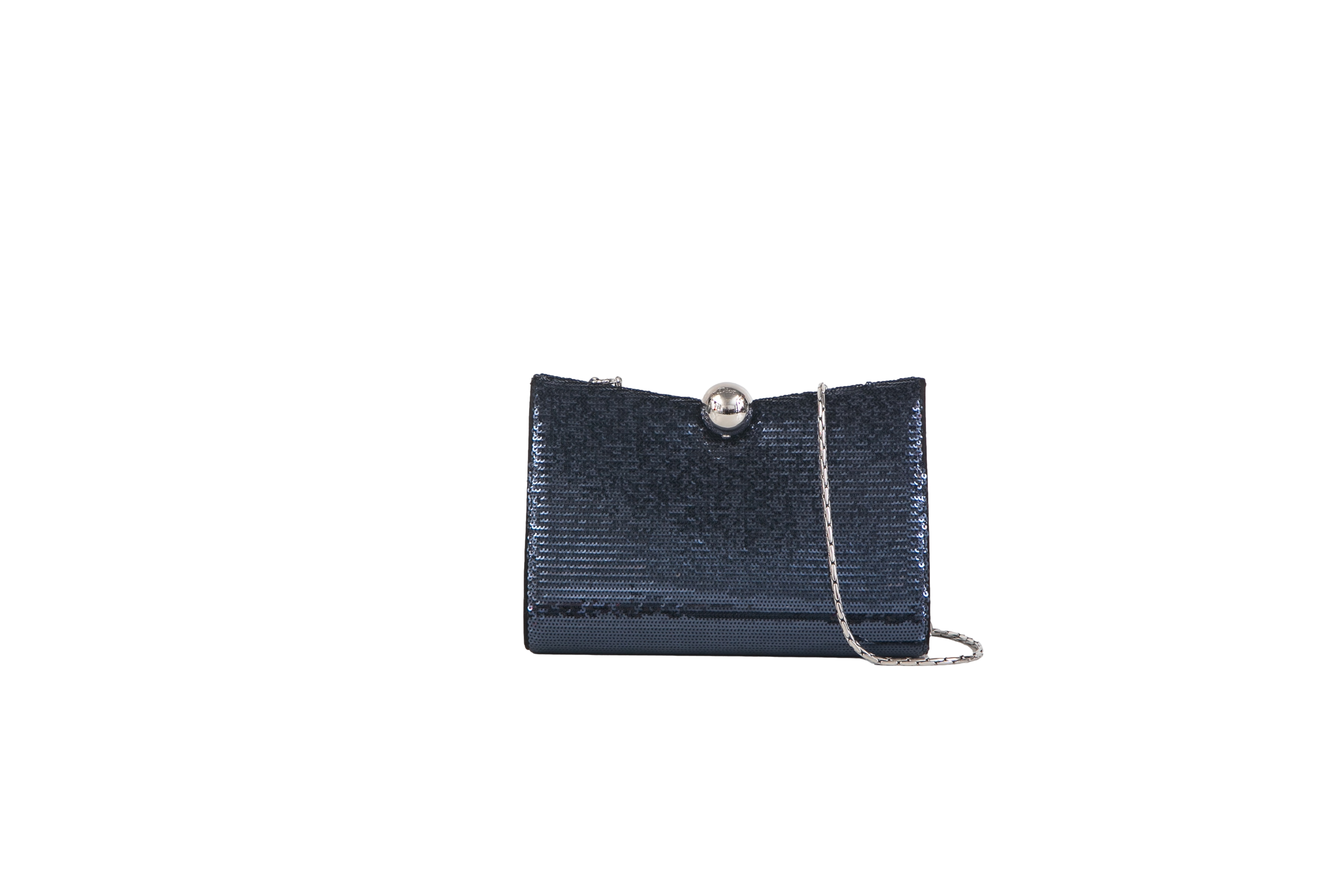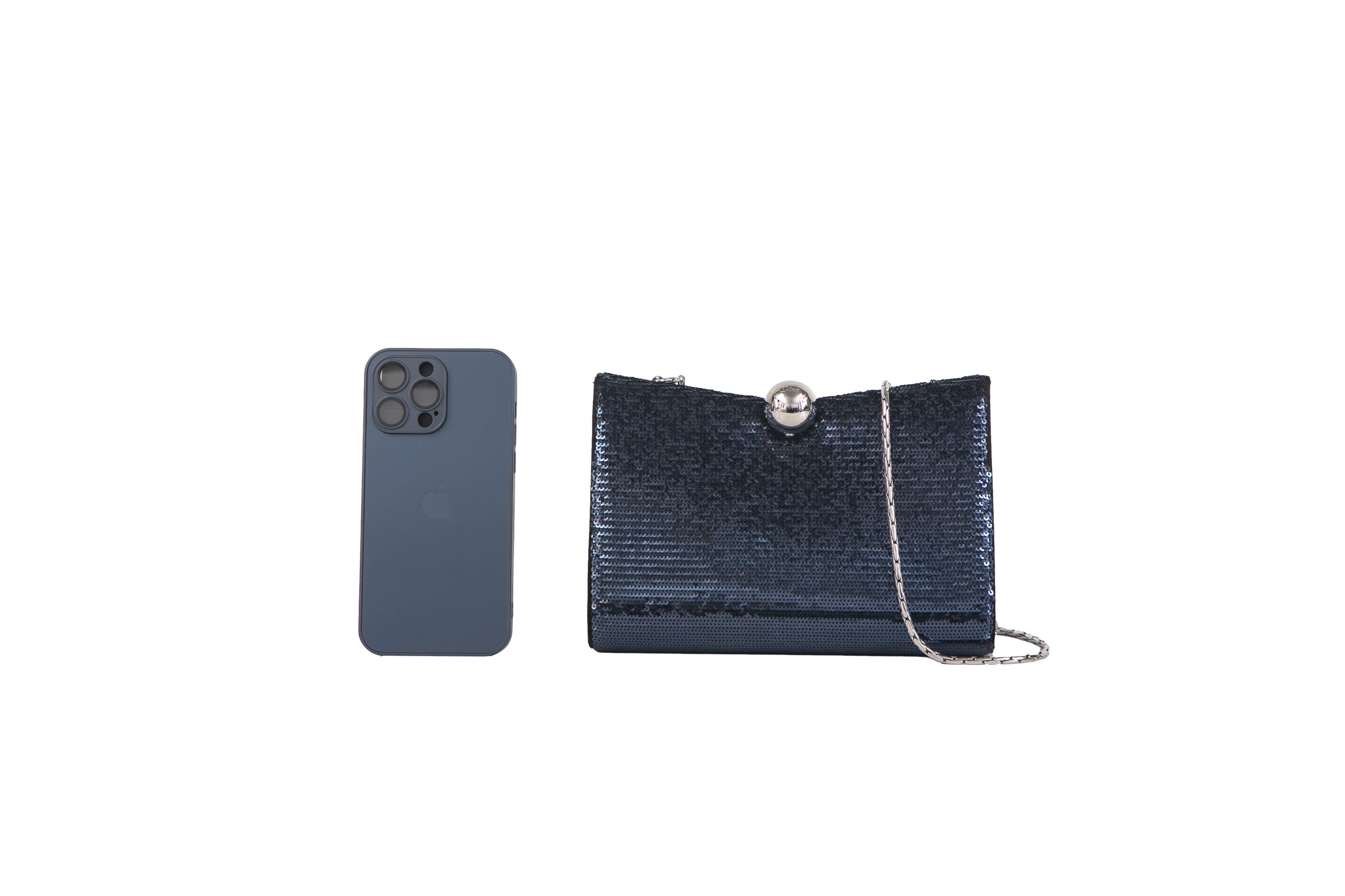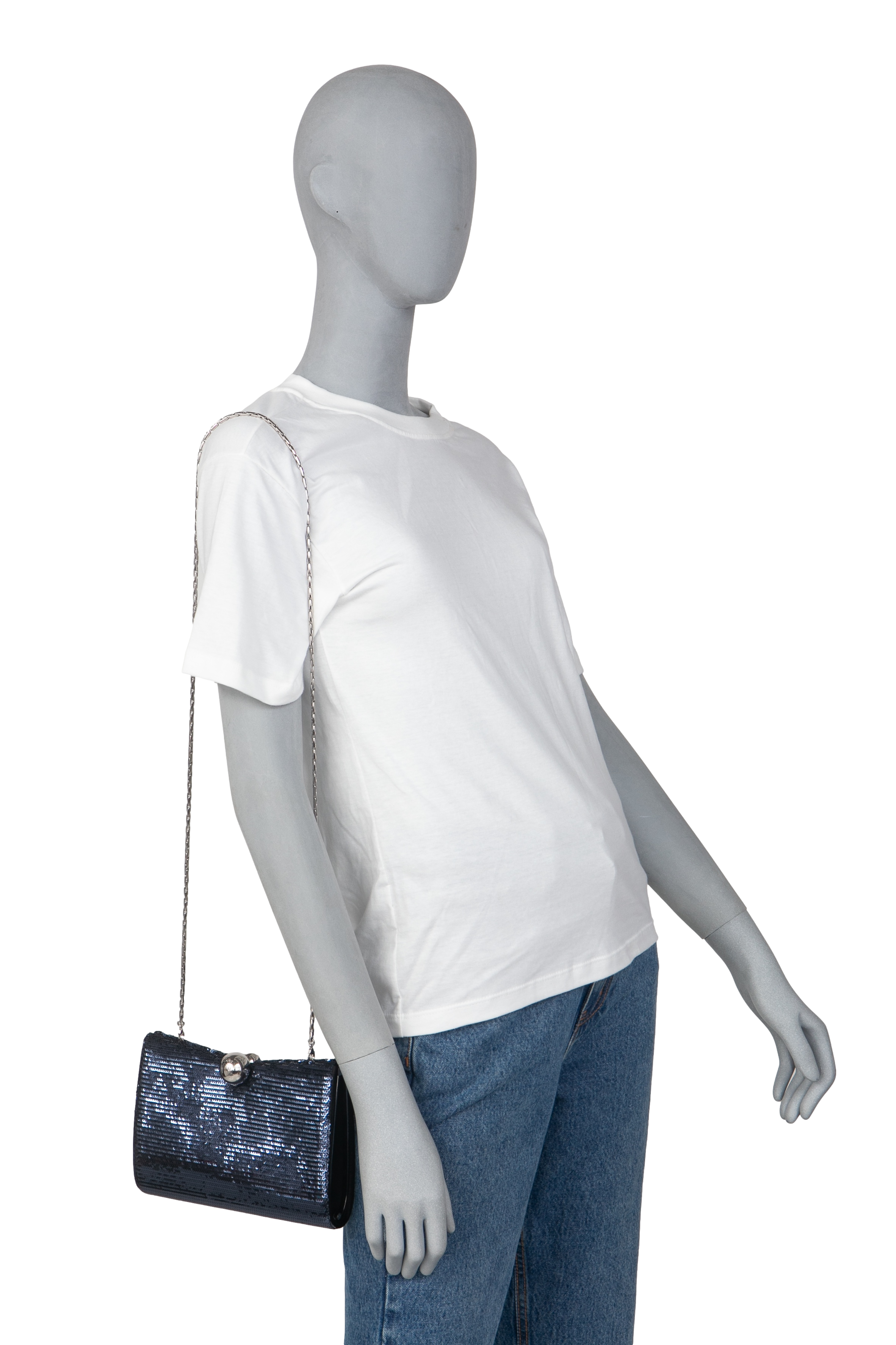 Seu design meticulosamente elaborado combina luxo, sofisticação e um toque de extravagância de maneira impecável. Feita com materiais de alta qualidade e habilmente adornada com lantejoulas reluzentes em um tom profundo de azul marinho, esta bolsa cativa o olhar e estimula os sentidos.