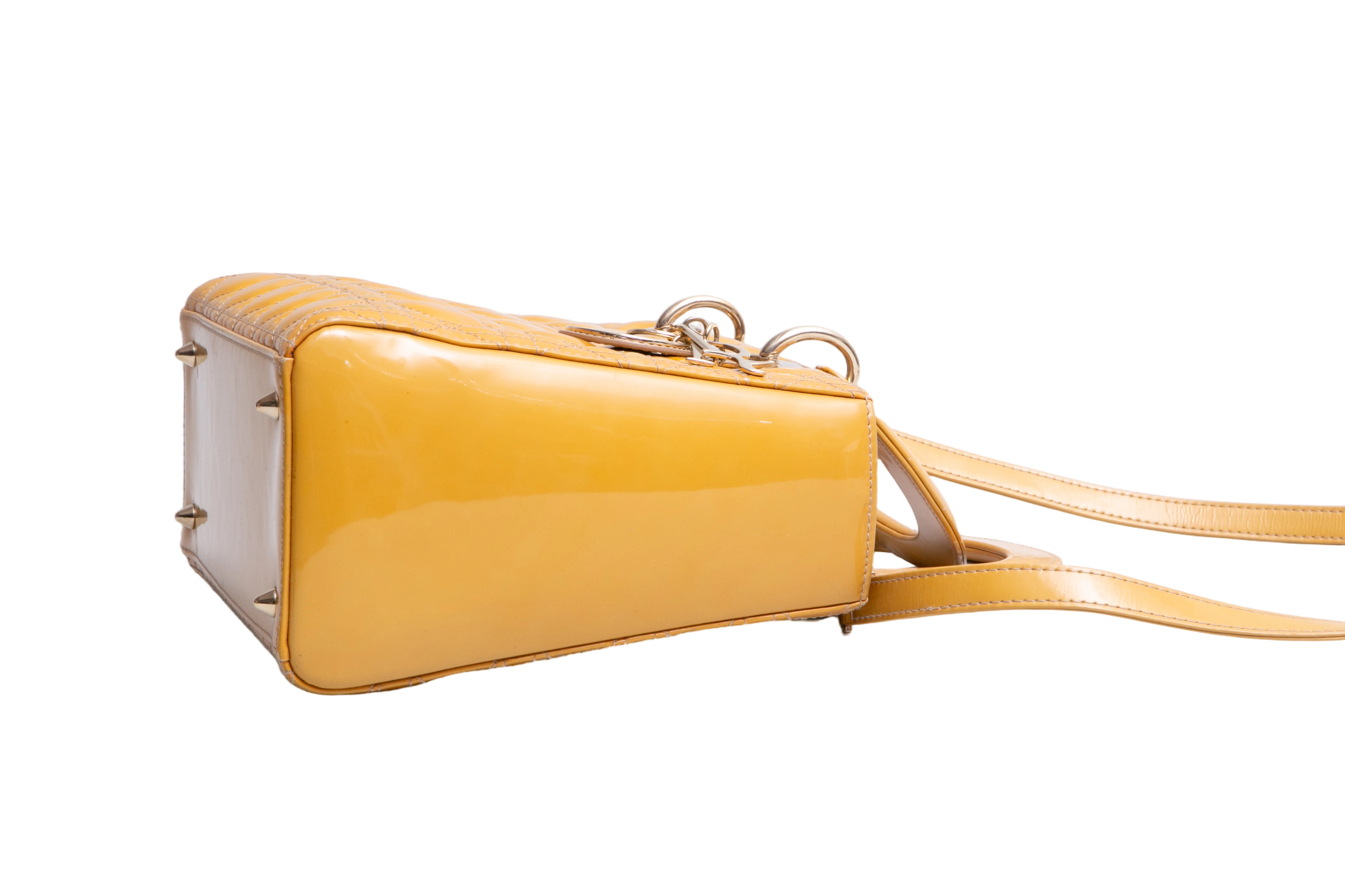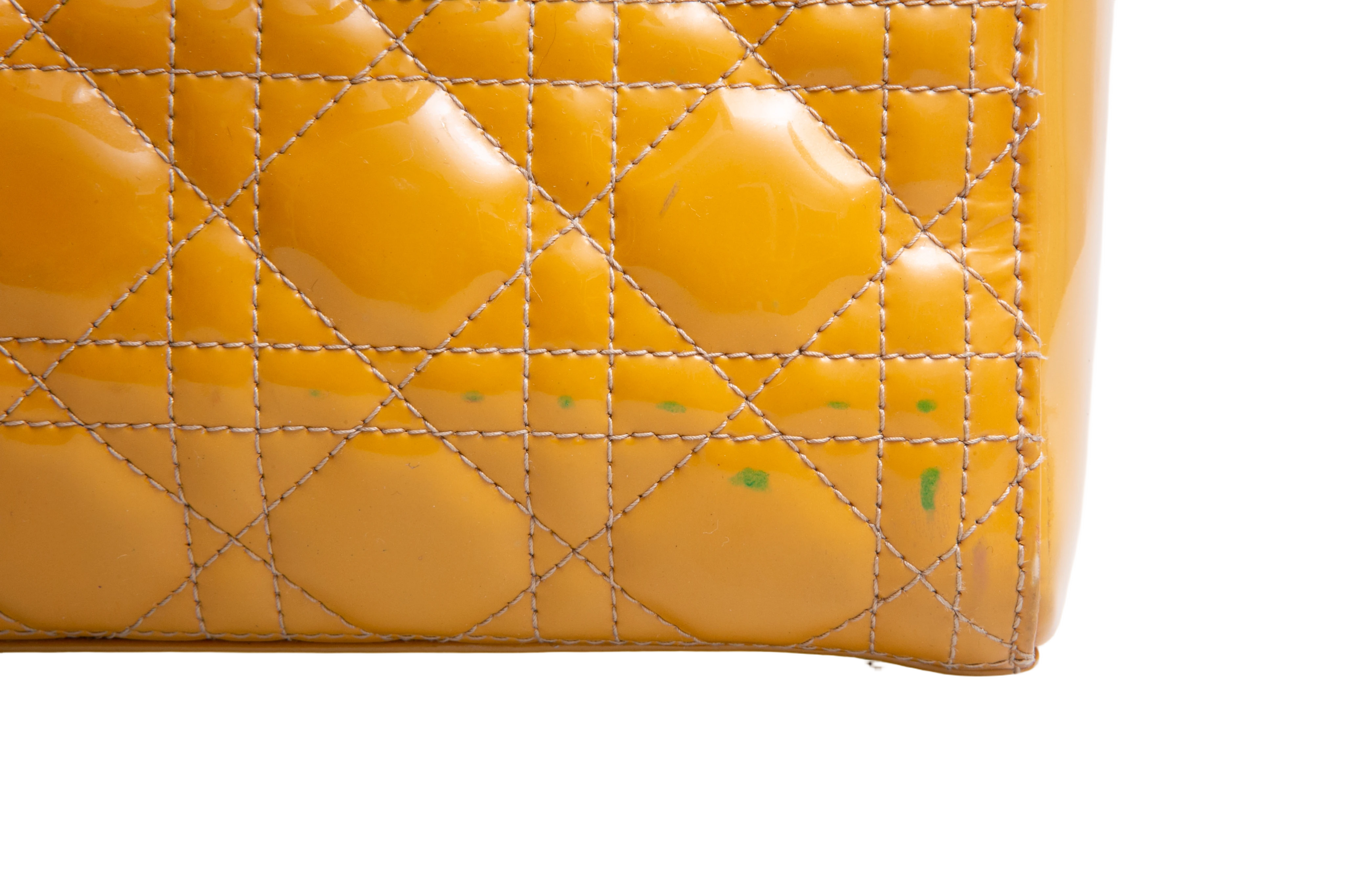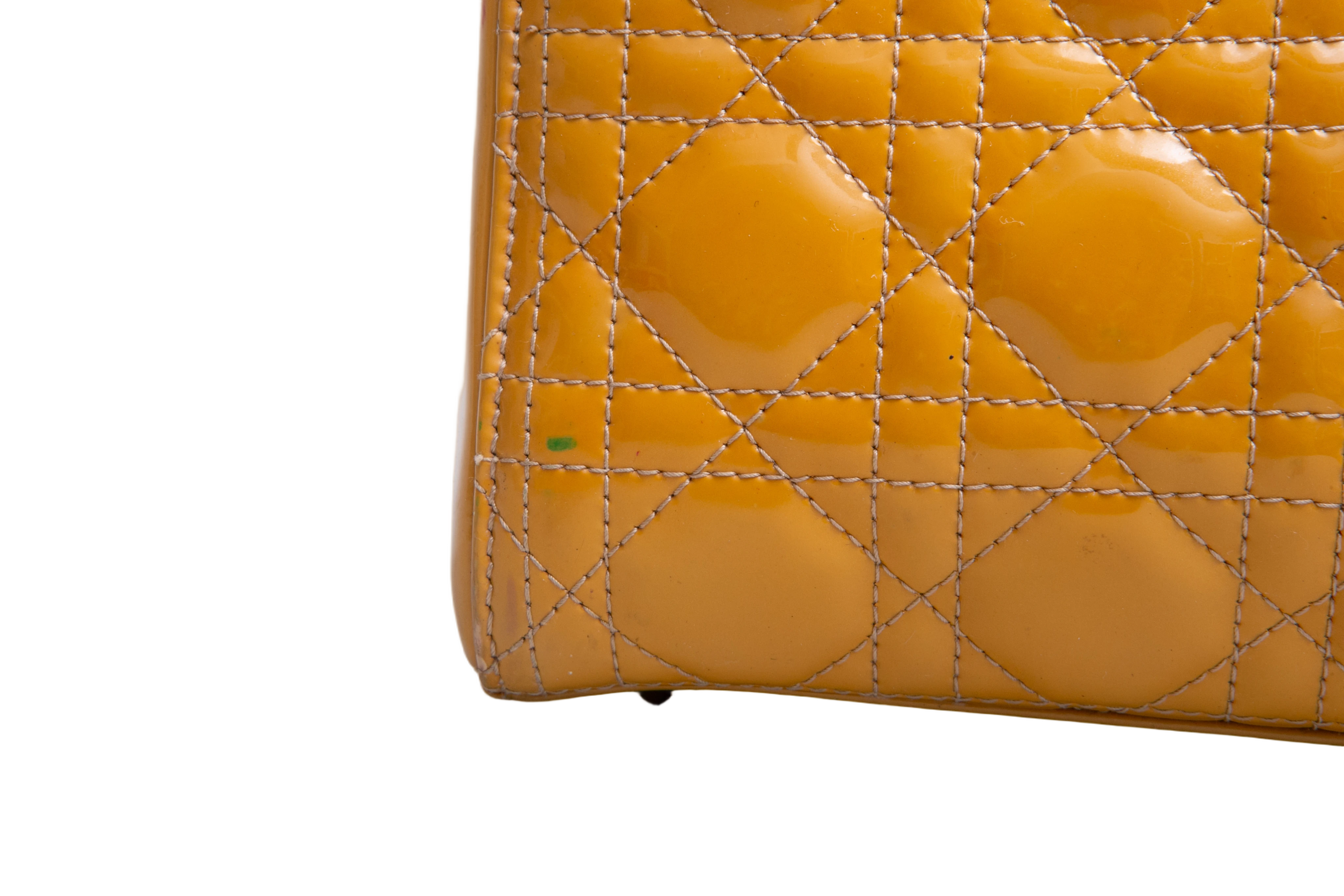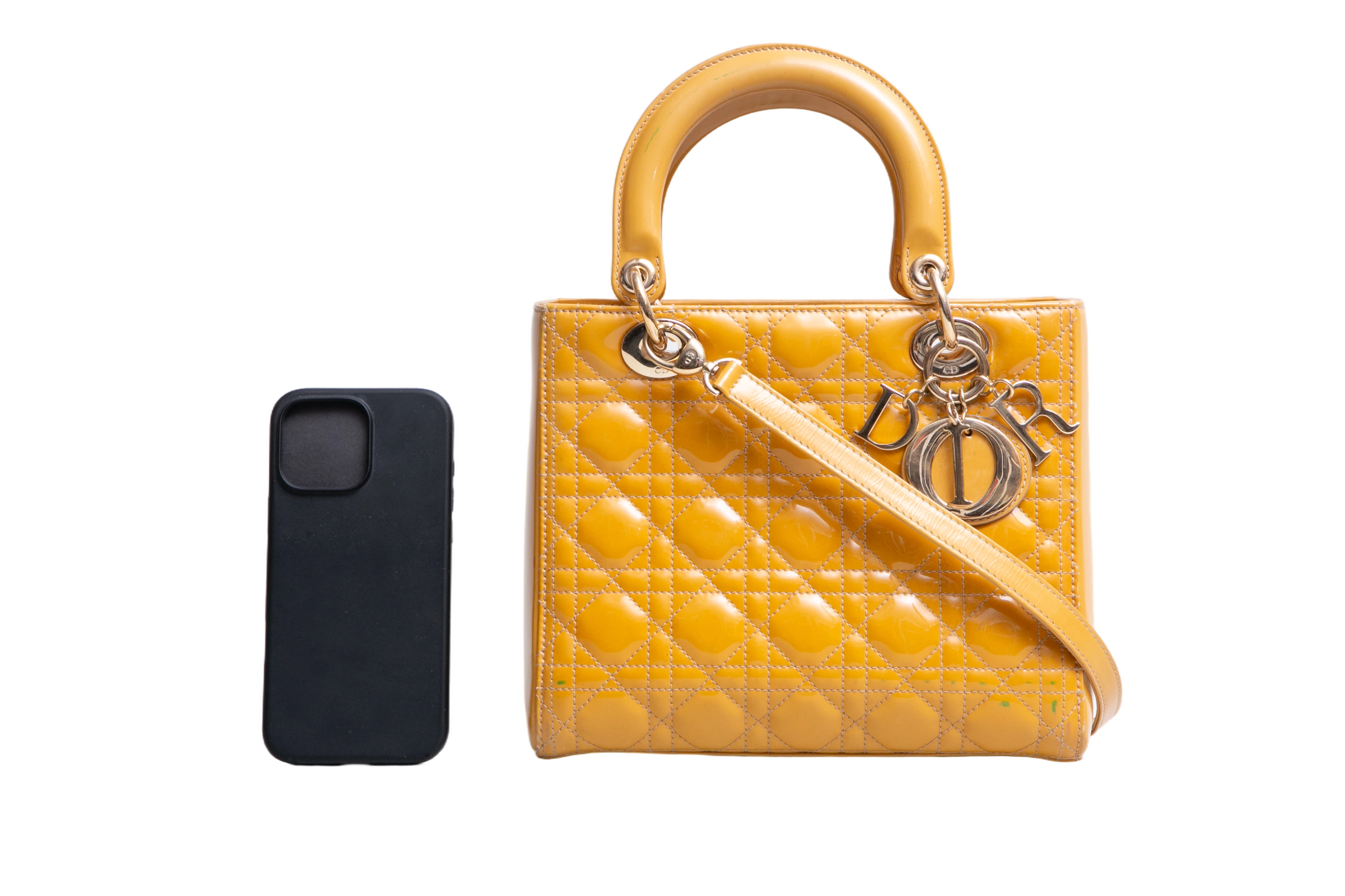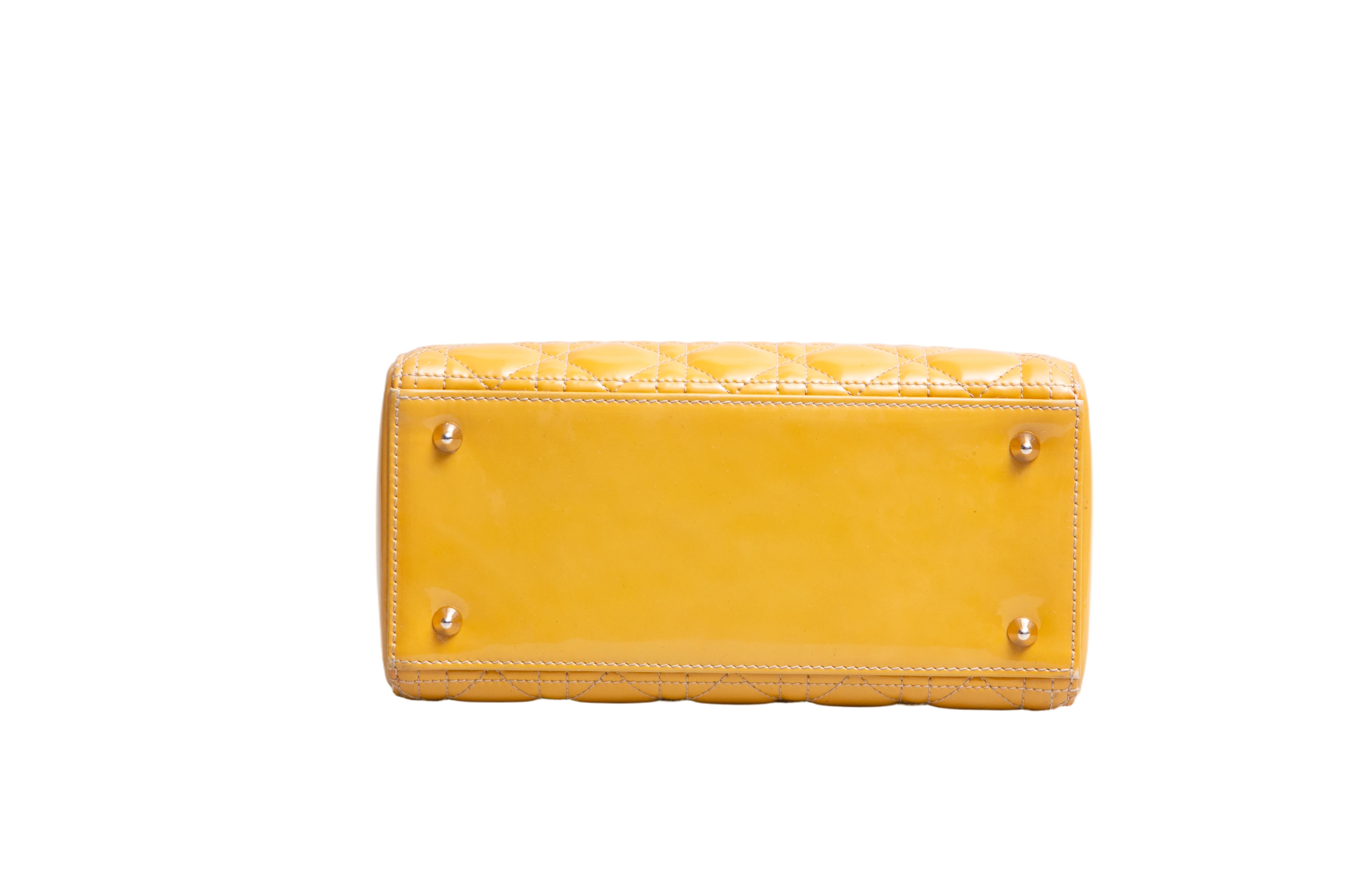 Dior Lady Dior Cannage Medium Patent Mustard. Peça em ótimo estado, possui sinais no couro, arestas e alça. Acomoda todos os tamanhos de telefone.