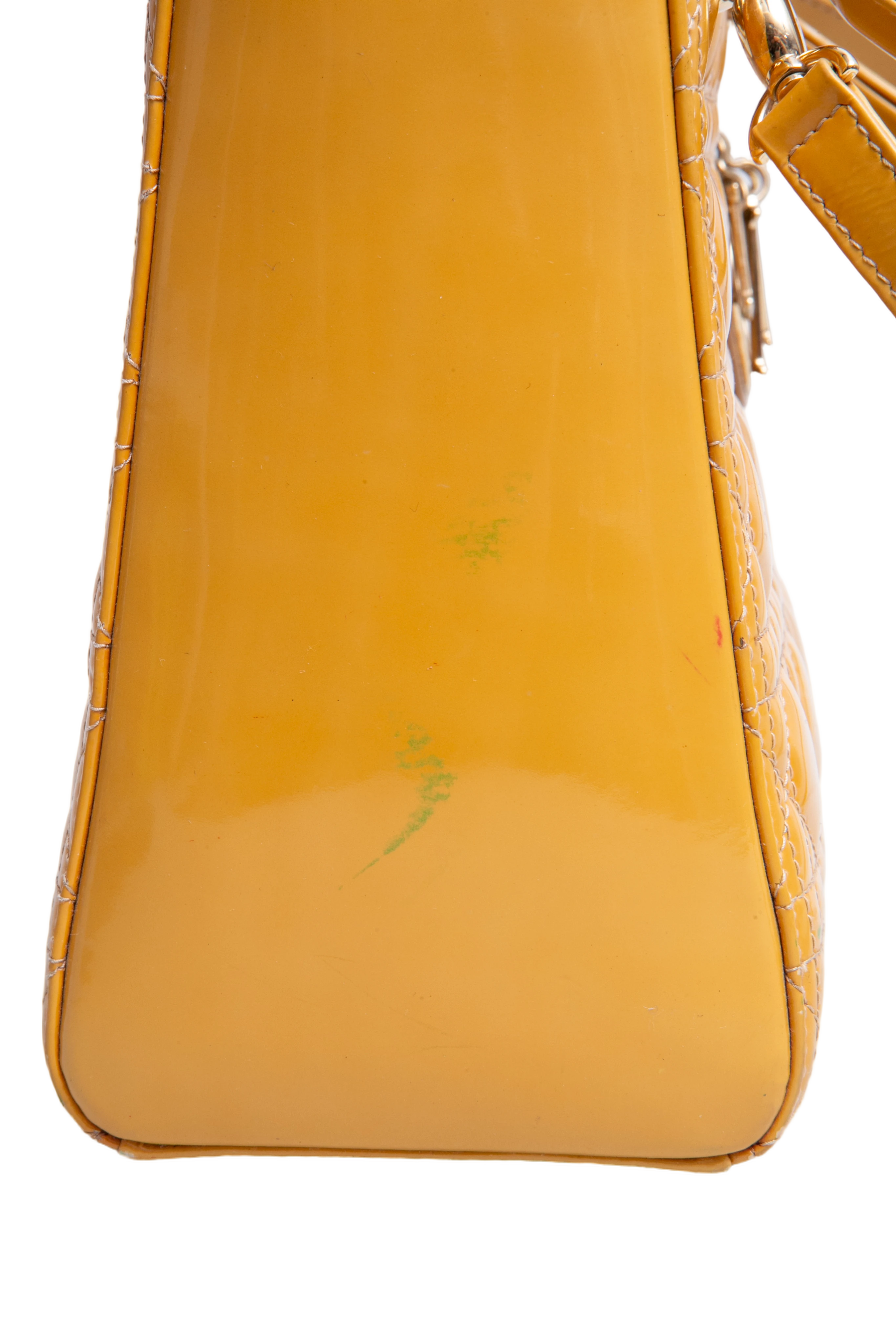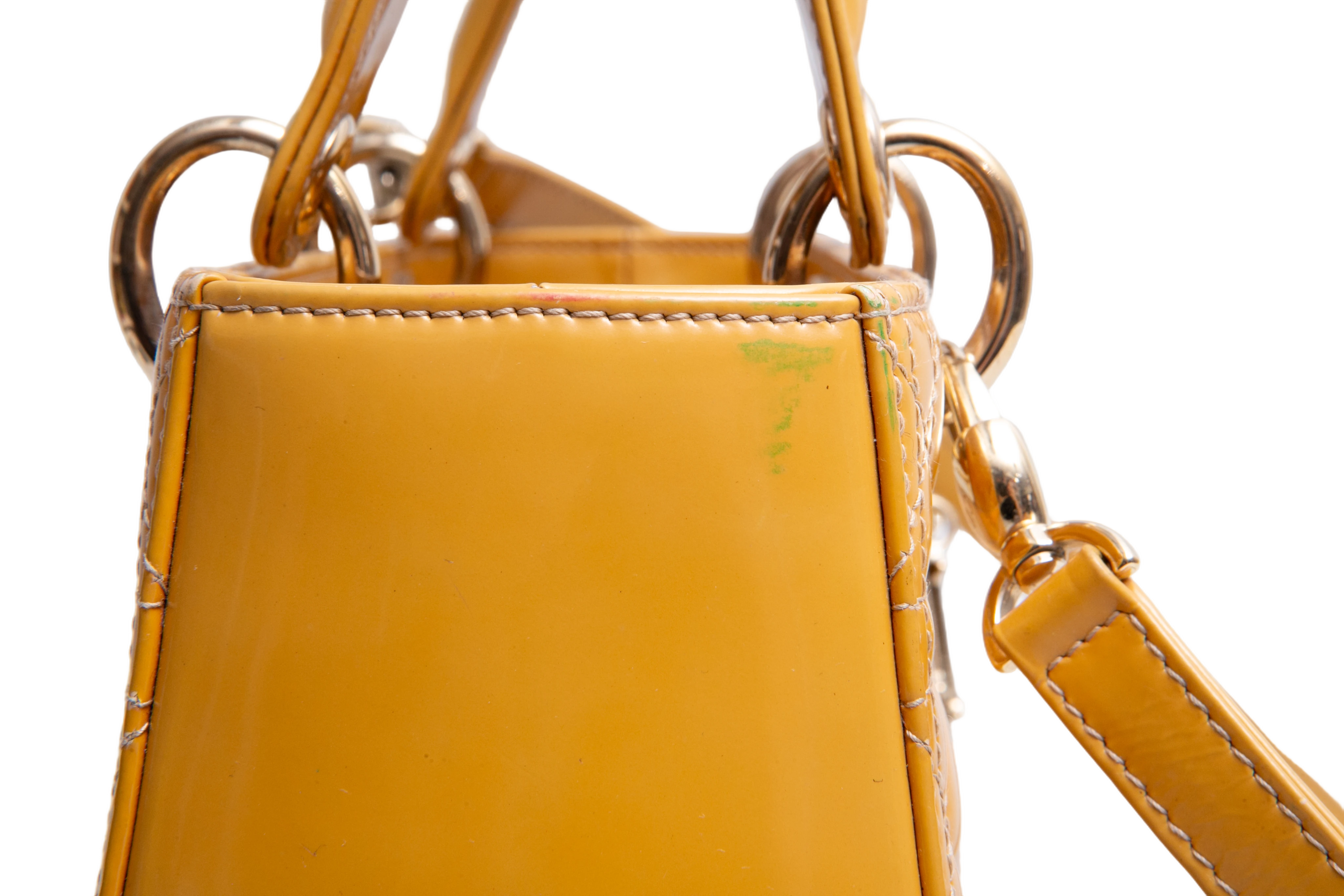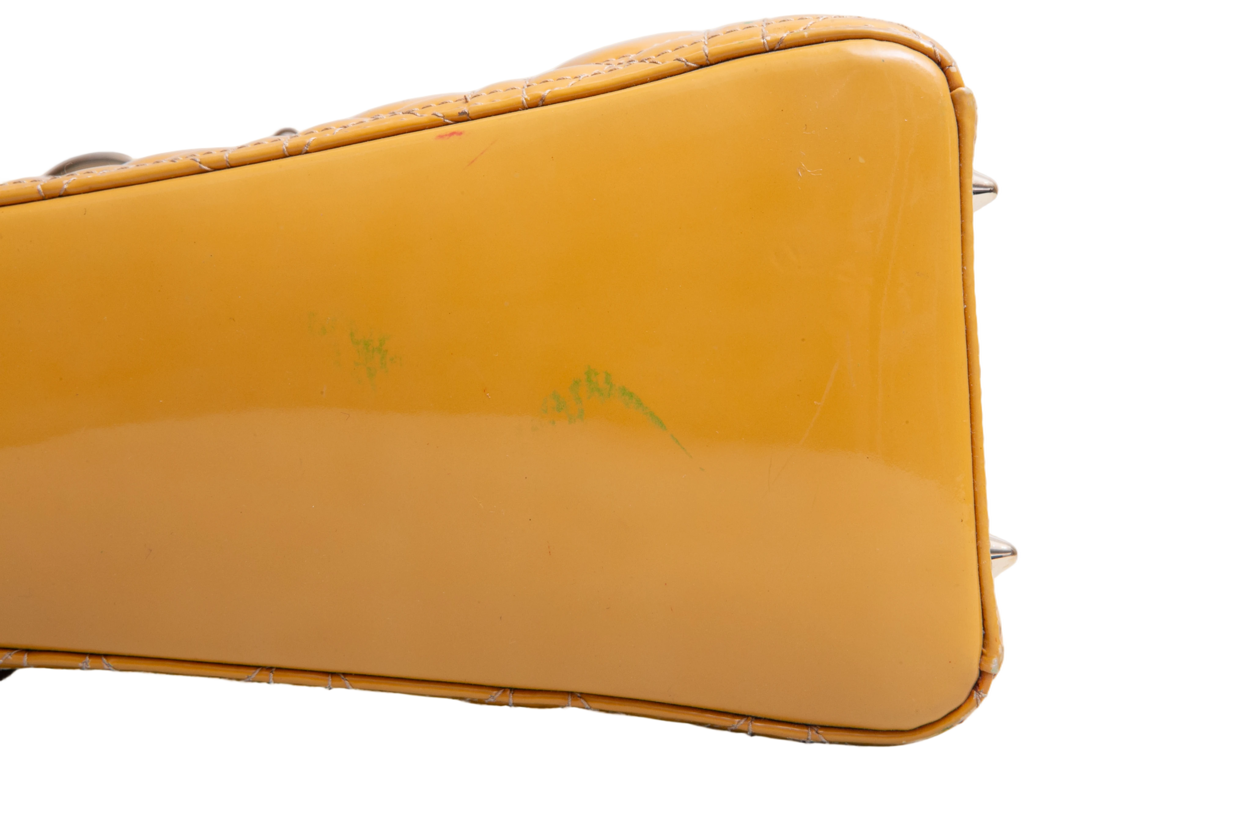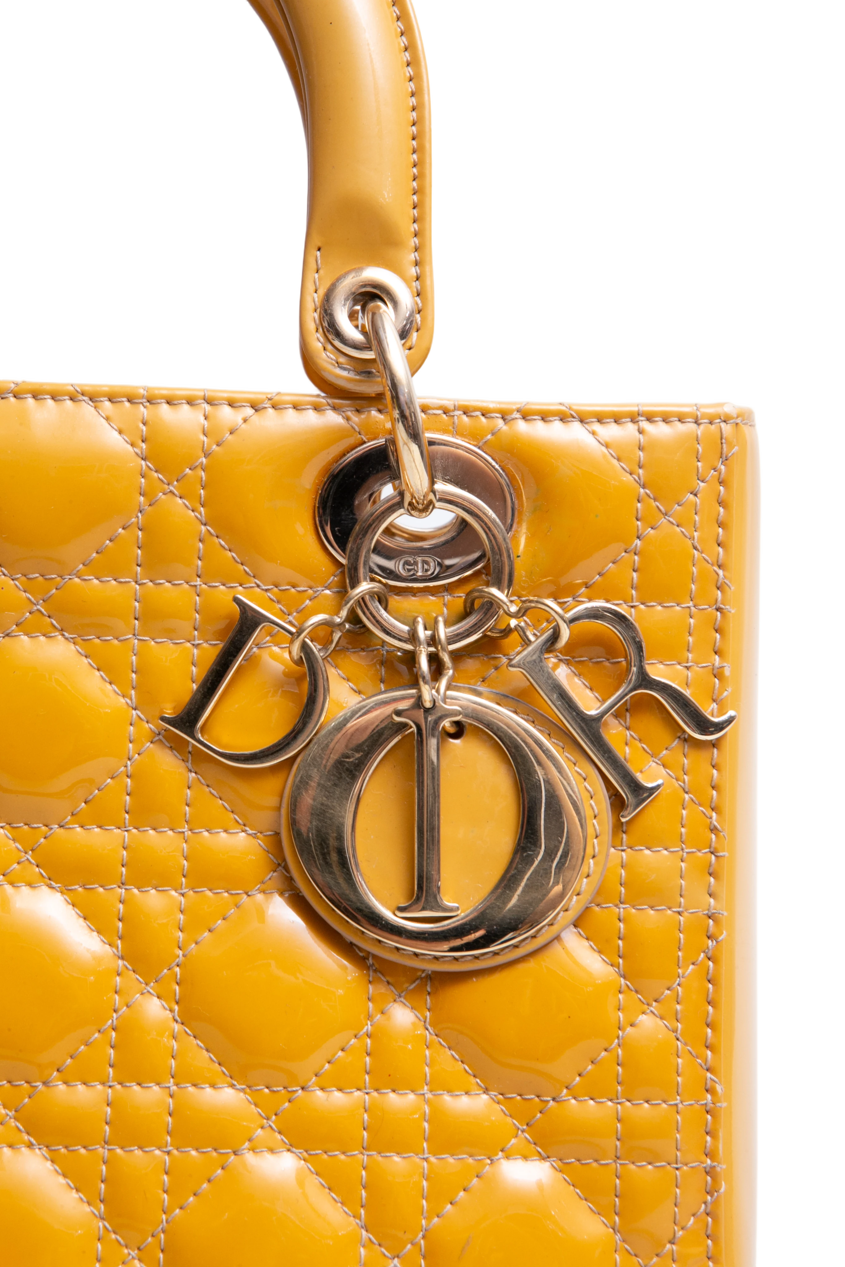 Dior Lady Dior Cannage Medium Patent Mustard. Peça em ótimo estado, possui sinais no couro, arestas e alça. Acomoda todos os tamanhos de telefone.