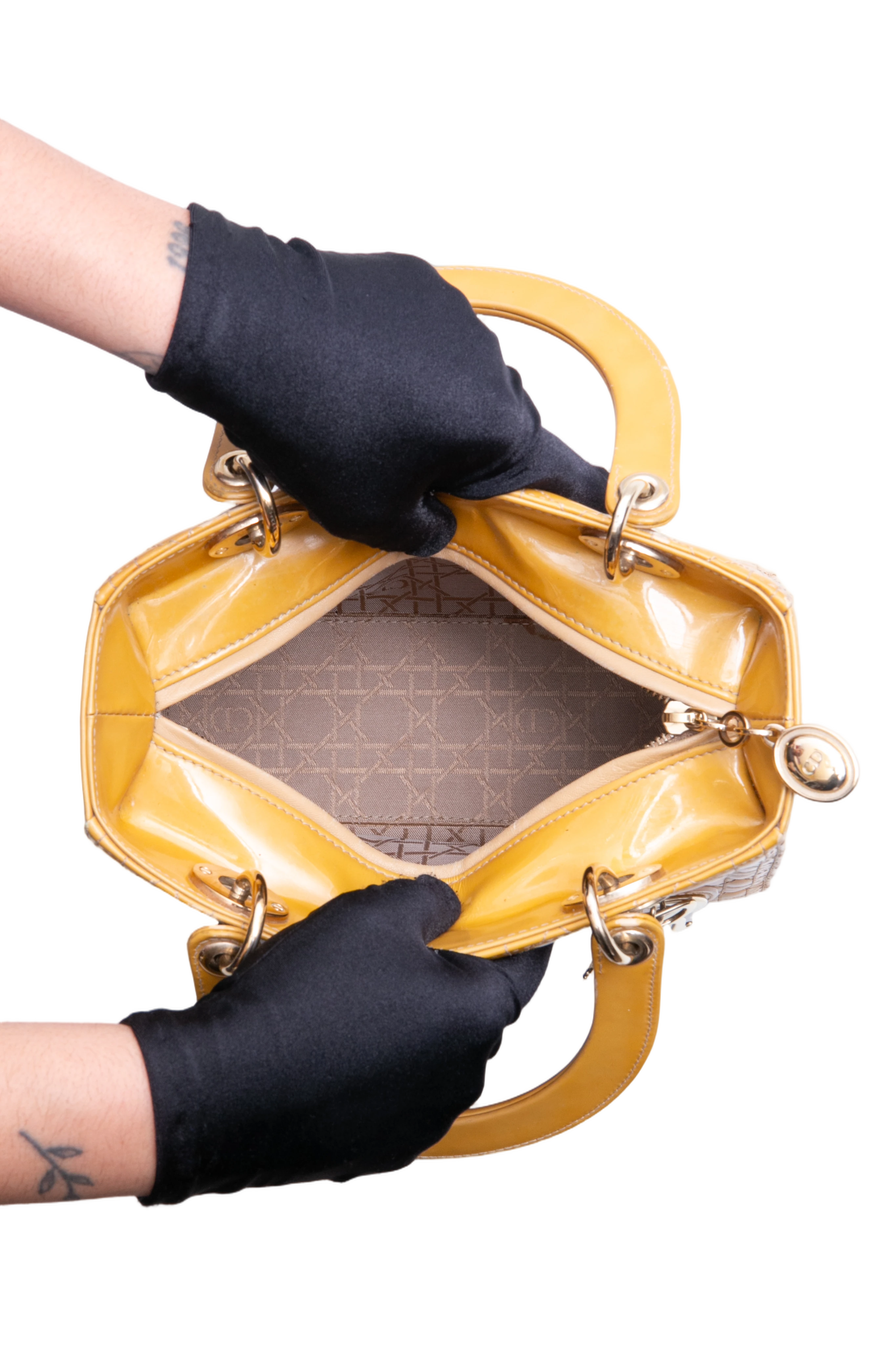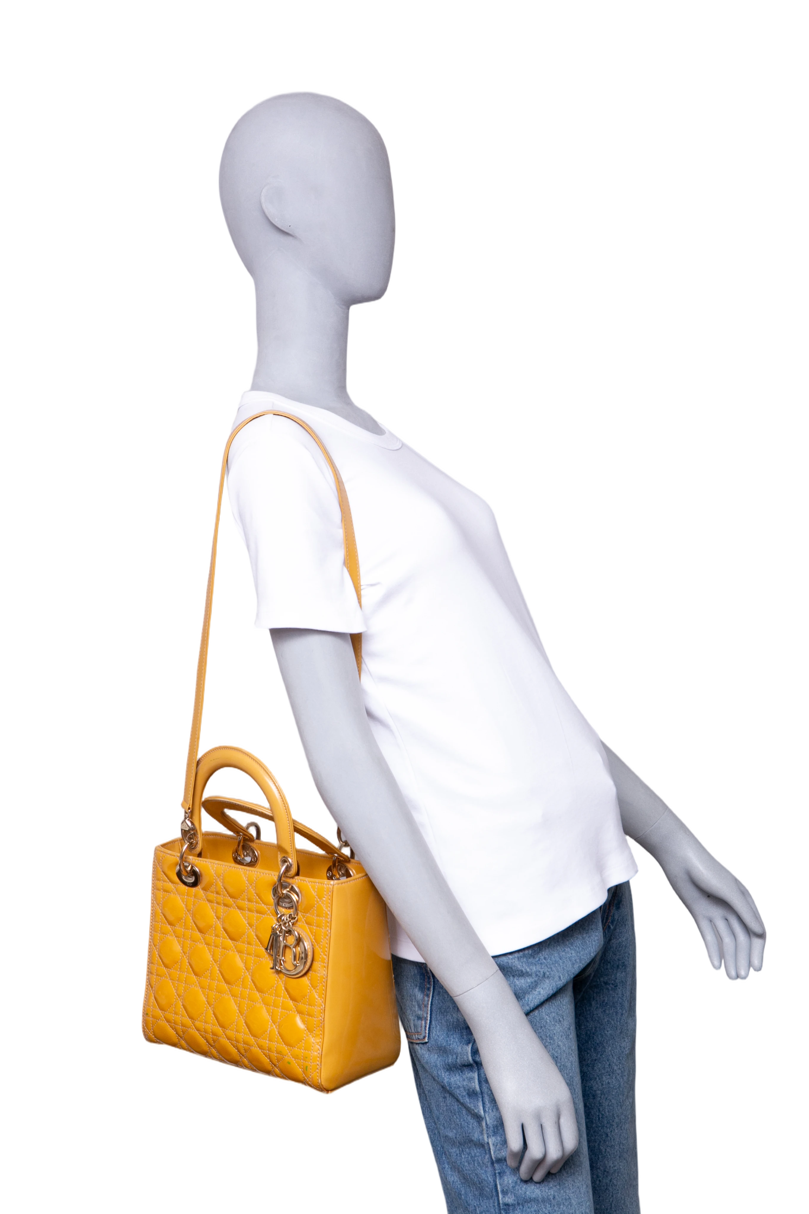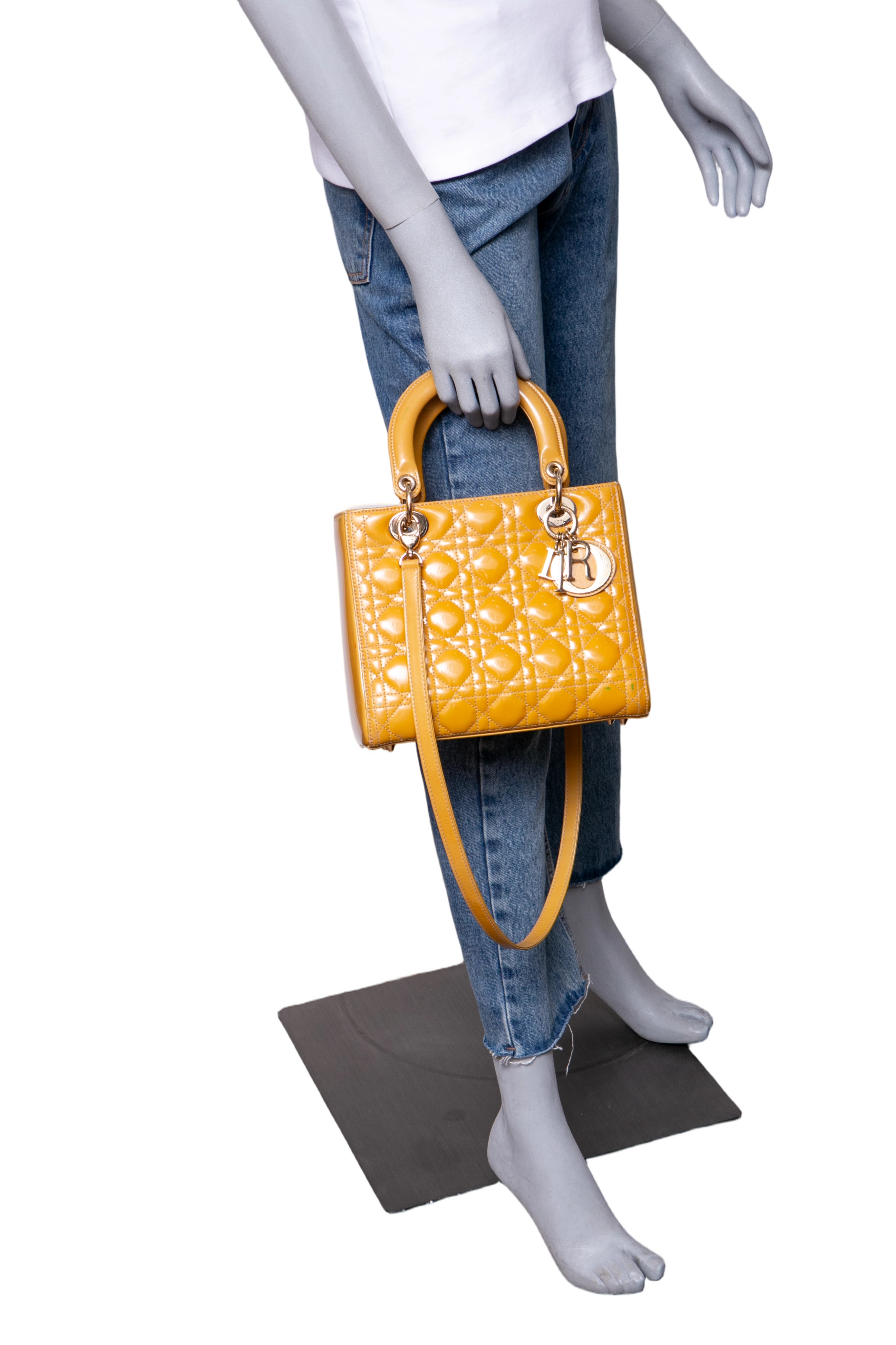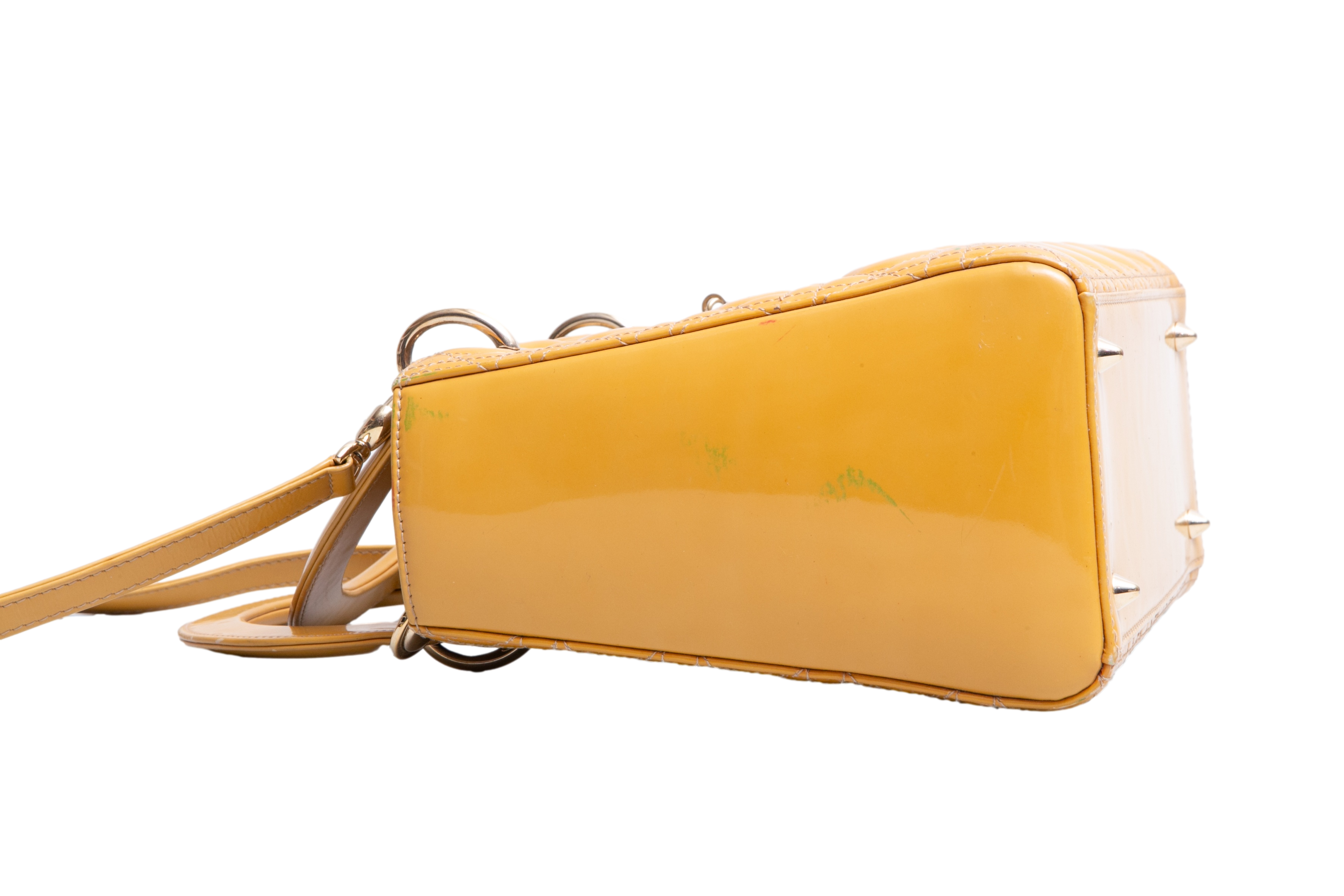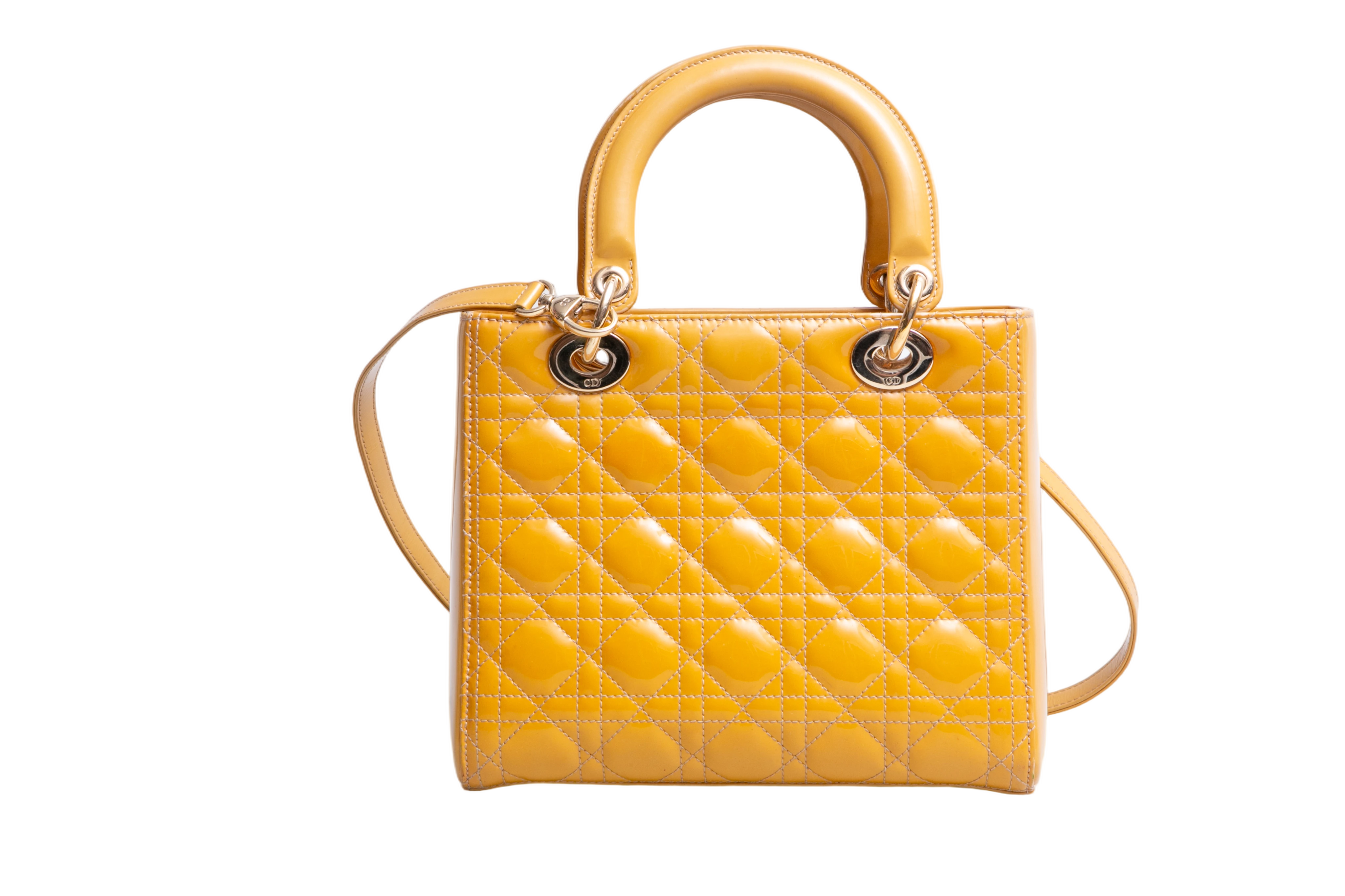 Dior Lady Dior Cannage Medium Patent Mustard. Peça em ótimo estado, possui sinais no couro, arestas e alça. Acomoda todos os tamanhos de telefone.