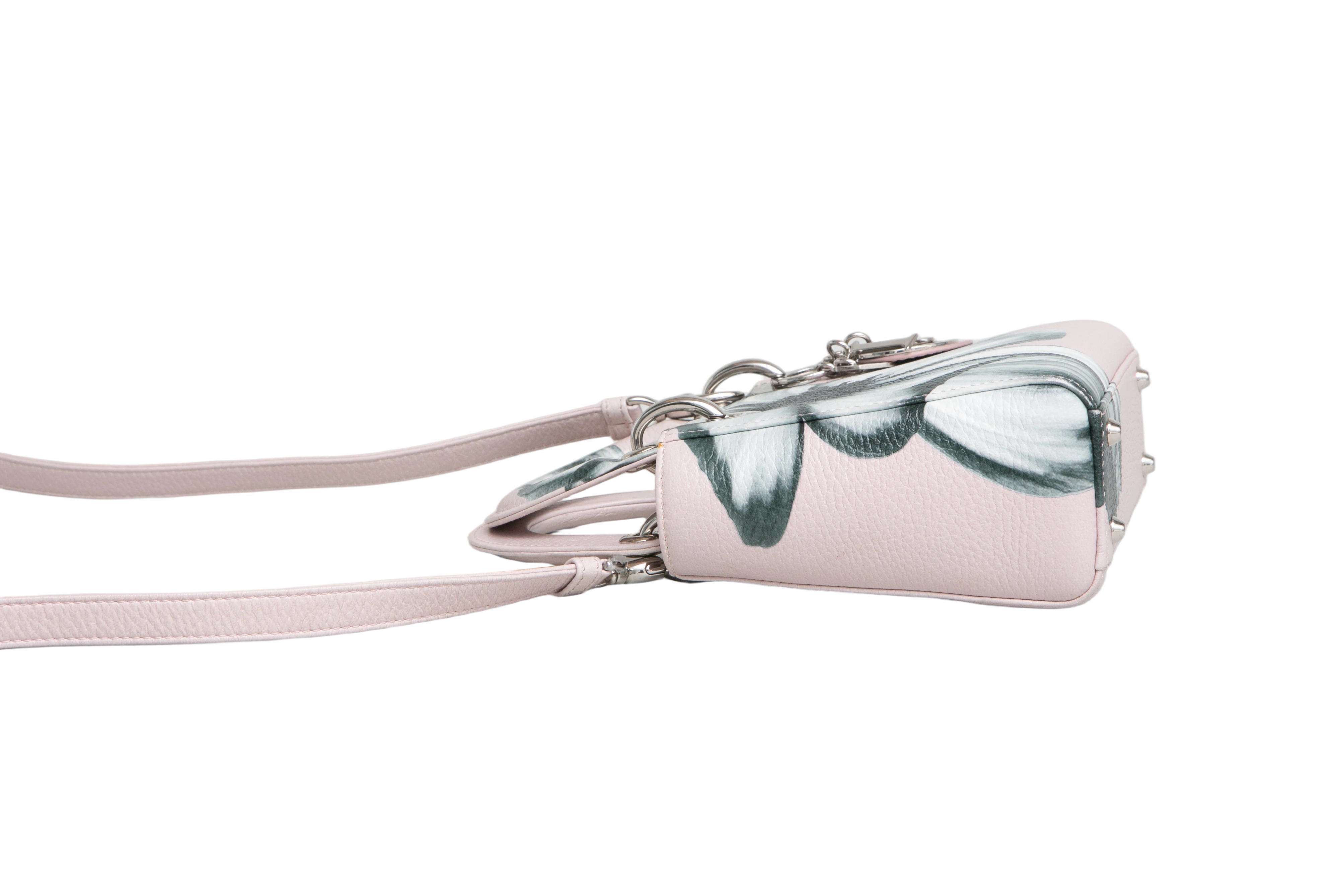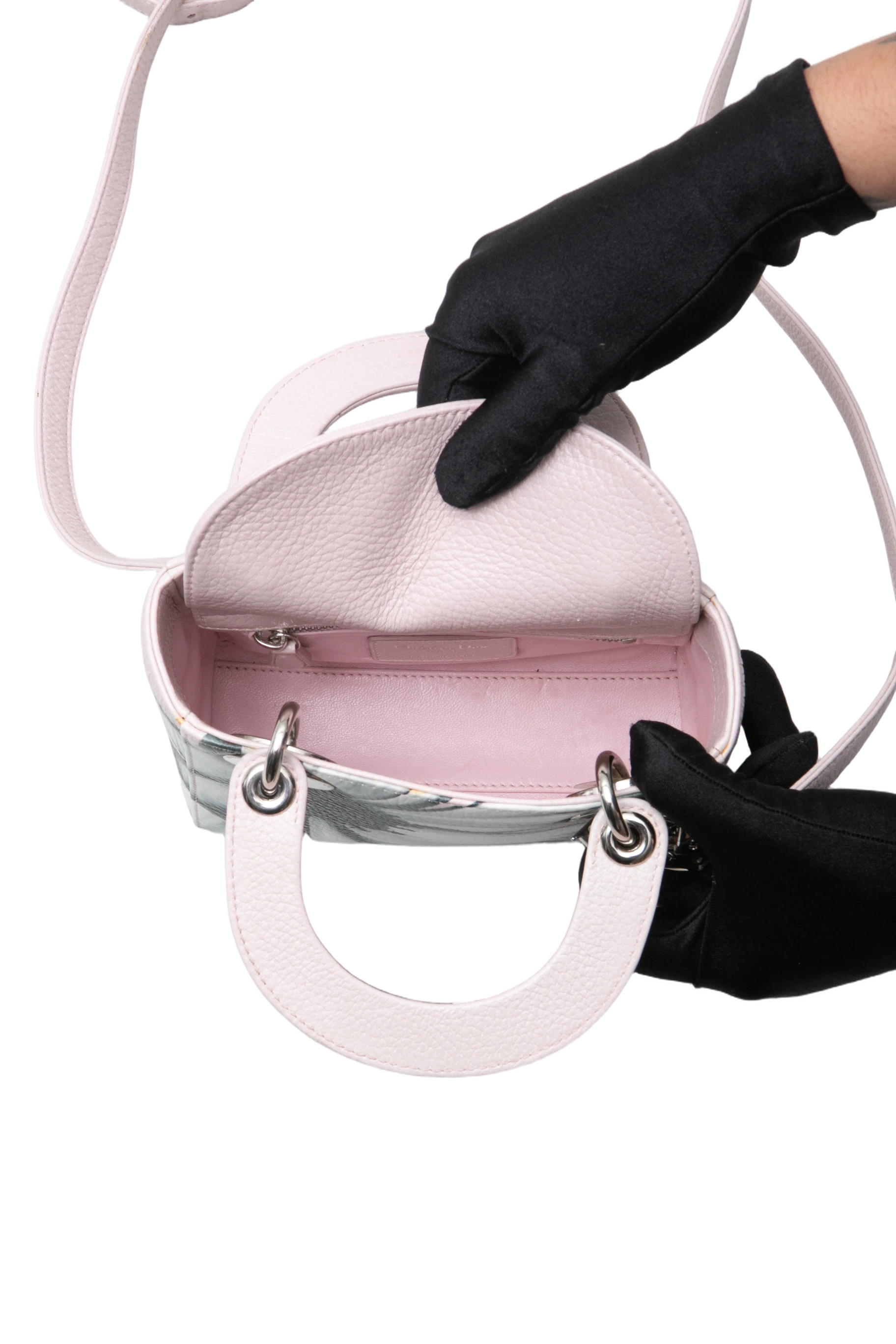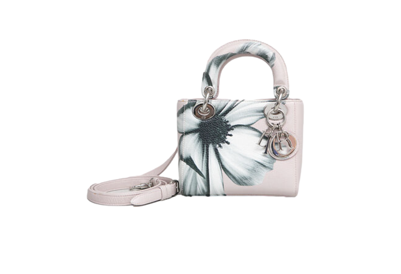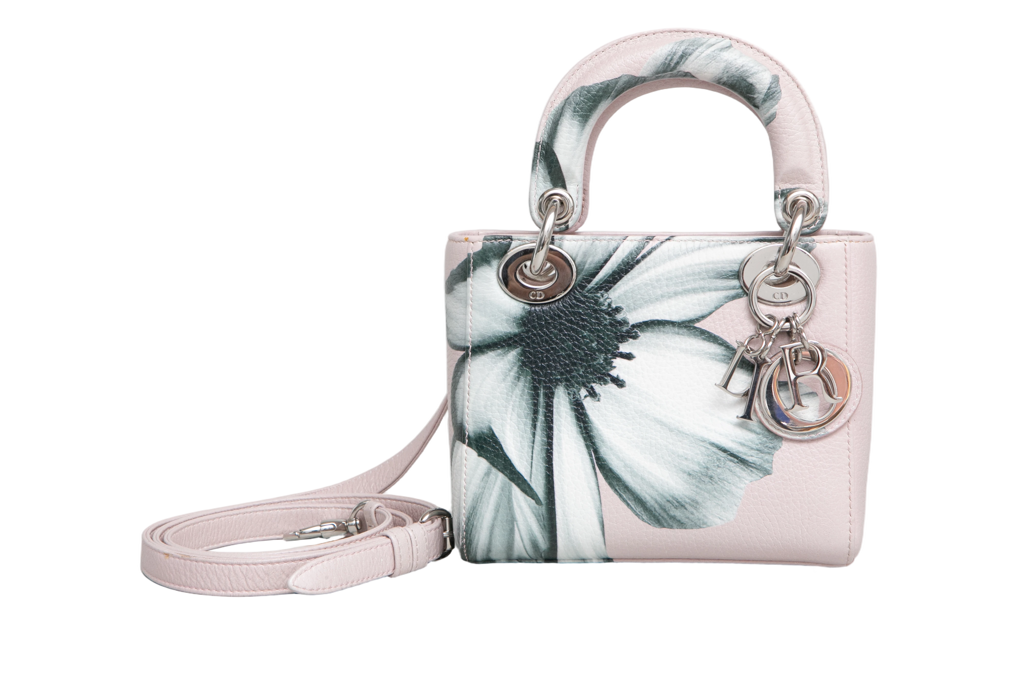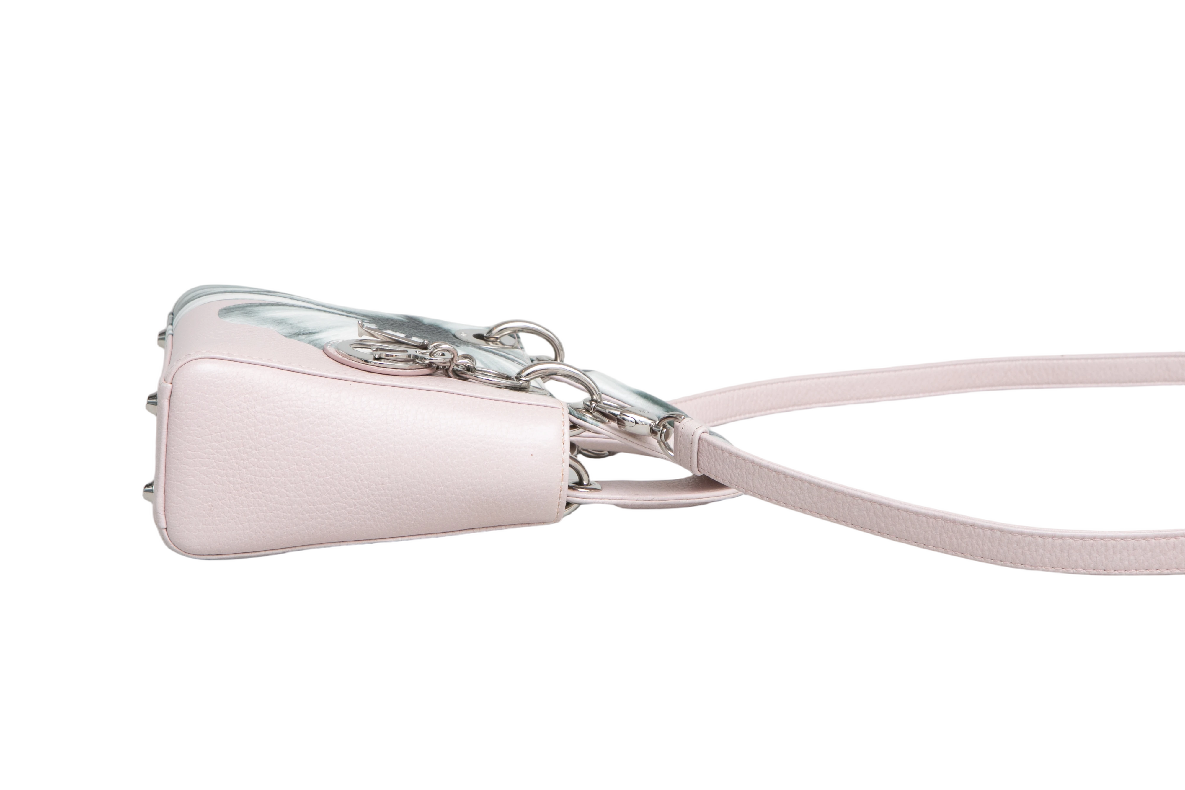 Dior Lady Dior Mini Deerskin Floral Printed Pink. Peça em perfeito estado, possui pequenos sinais no couro, arestas e ferragens.