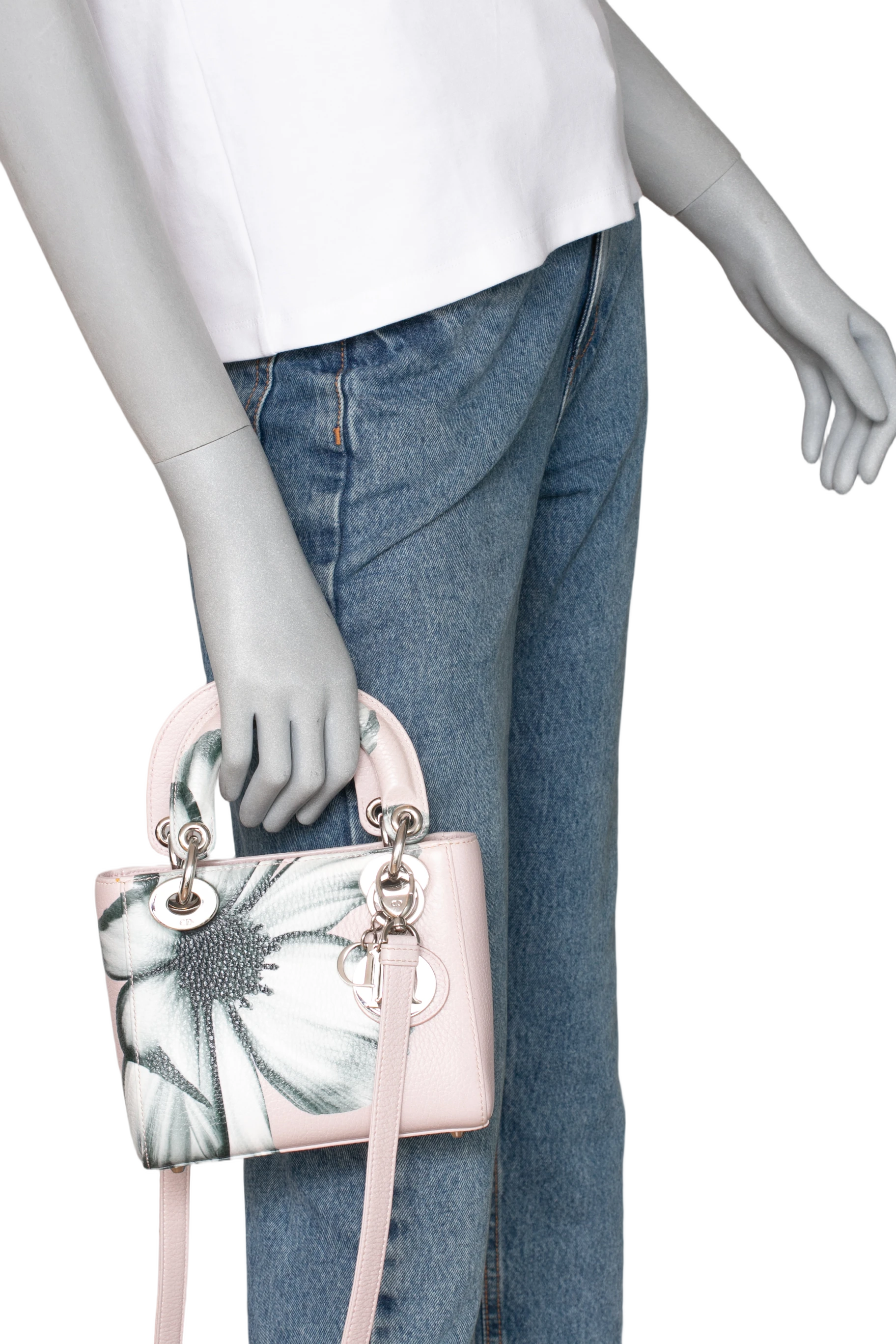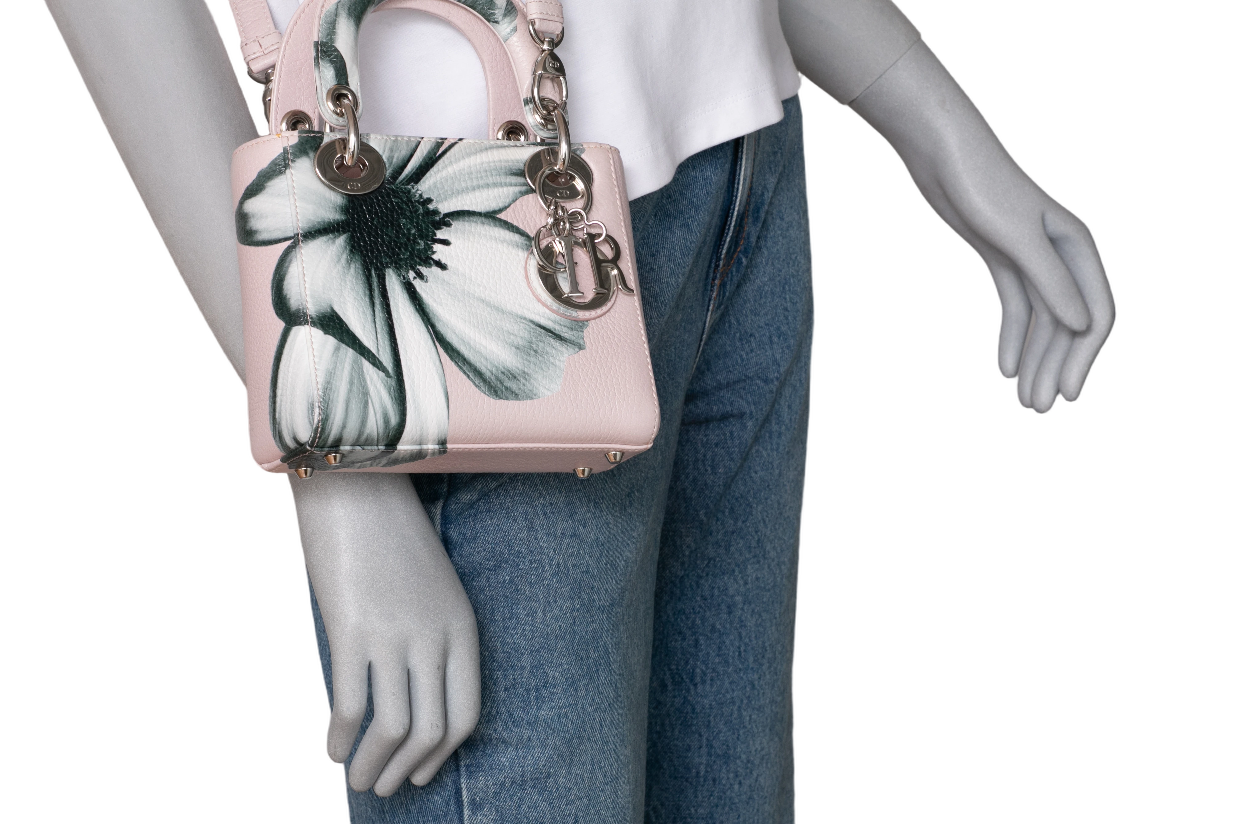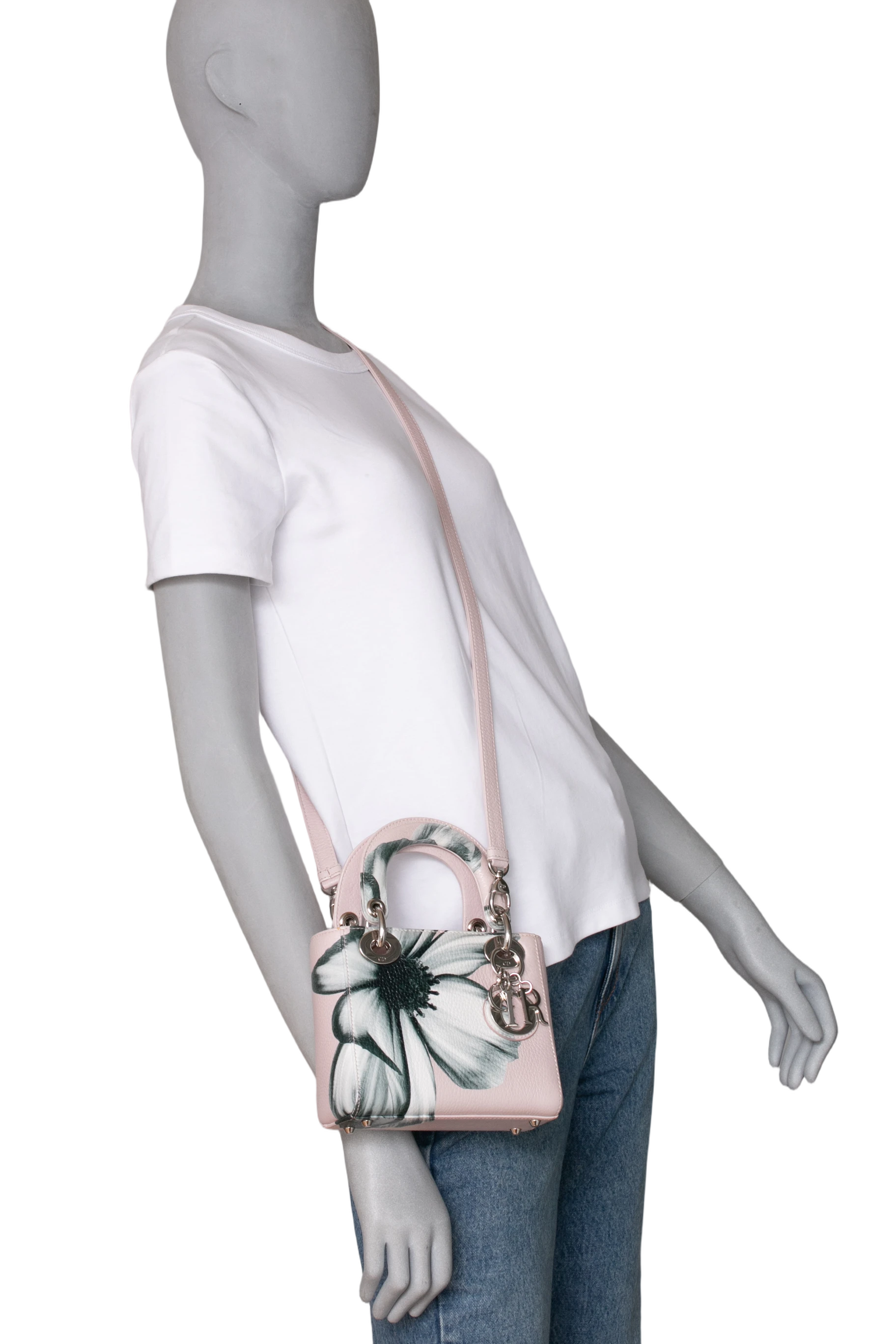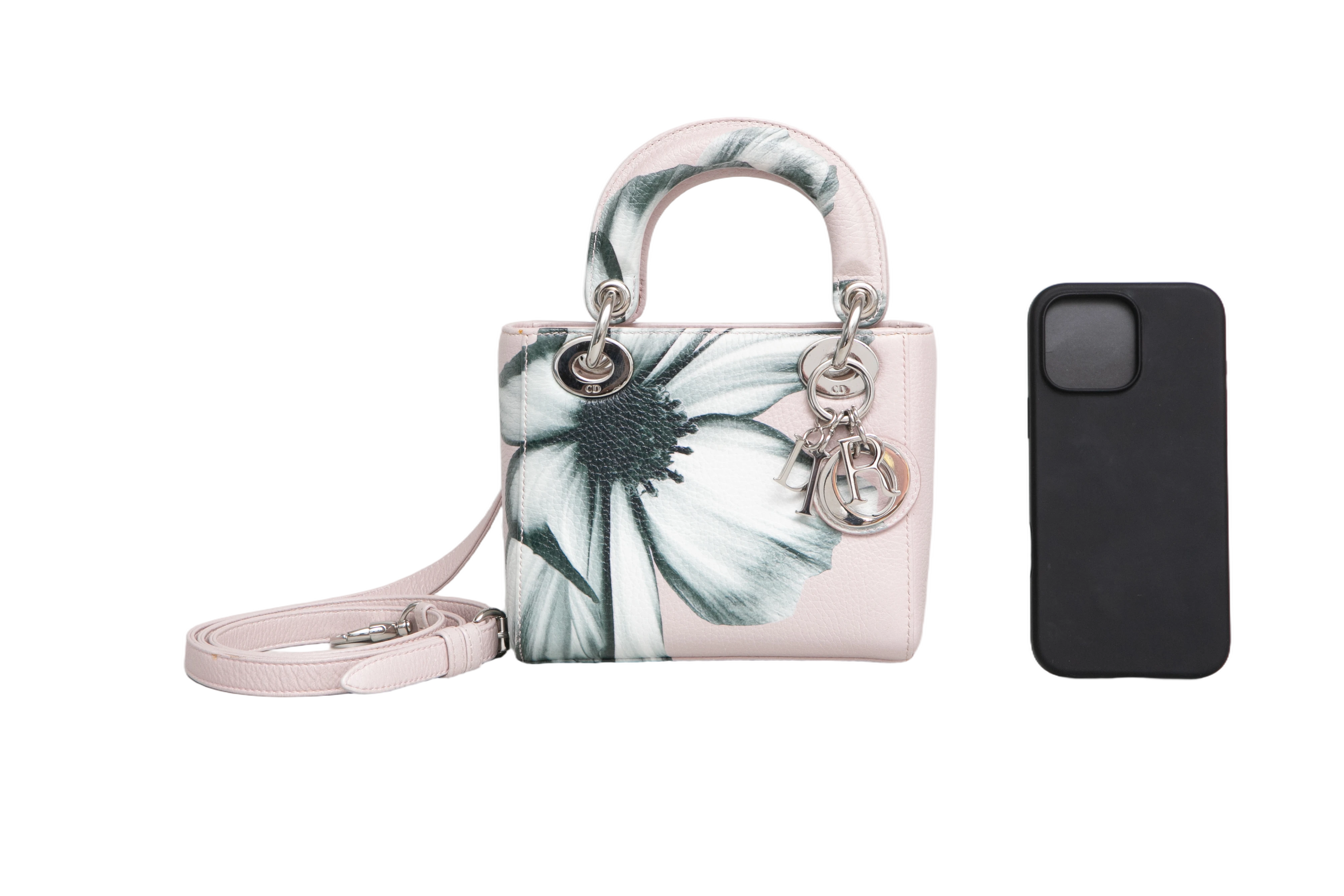 Dior Lady Dior Mini Deerskin Floral Printed Pink. Peça em perfeito estado, possui pequenos sinais no couro, arestas e ferragens.