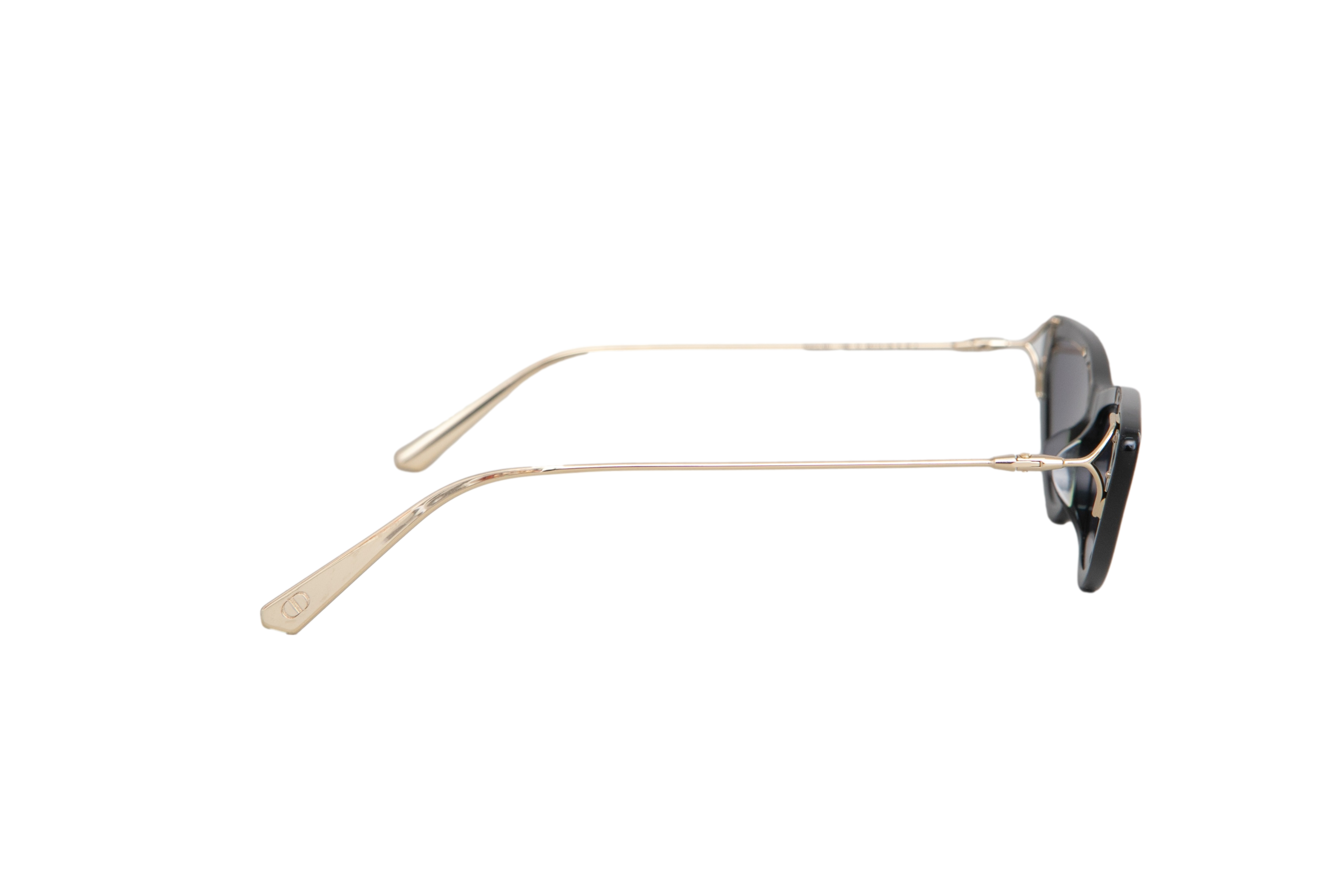 As lentes escuras e armação em acetato preto, enquanto as hastes são em dourado.