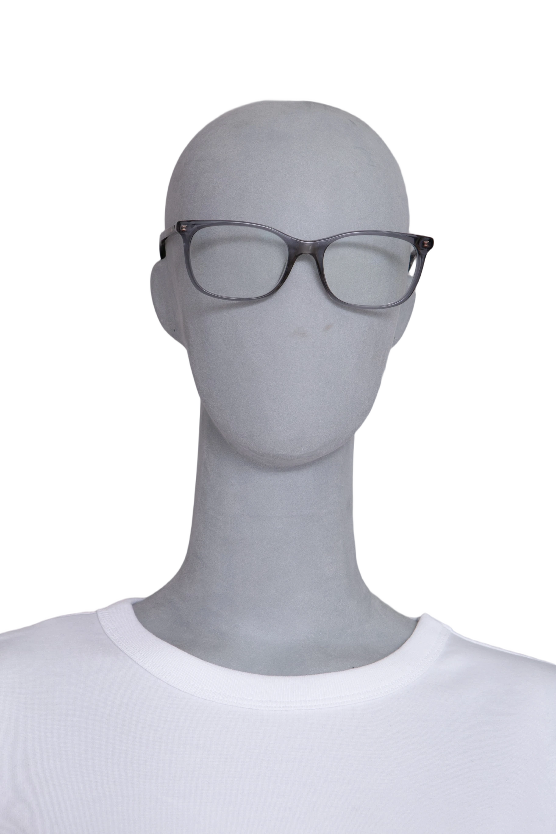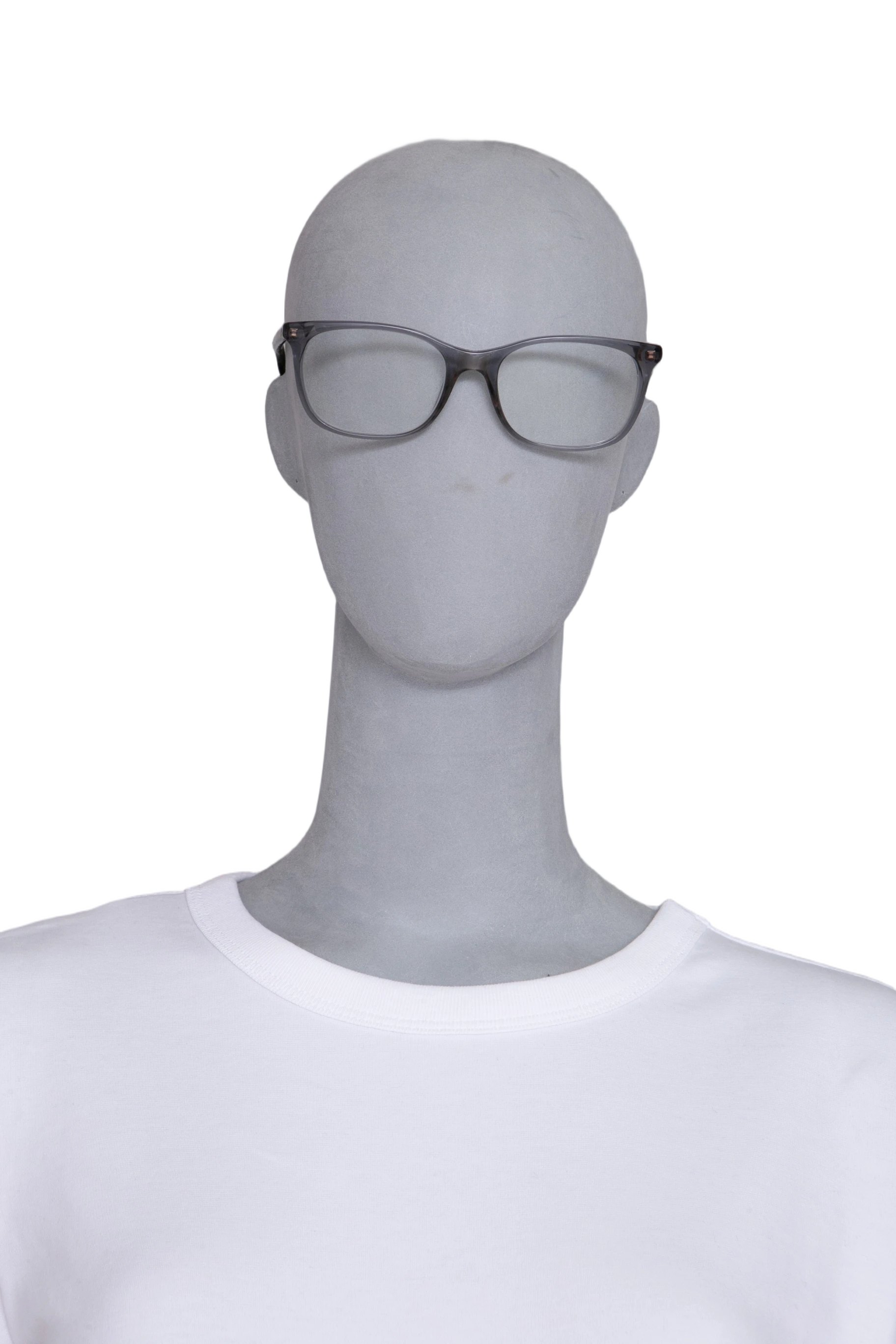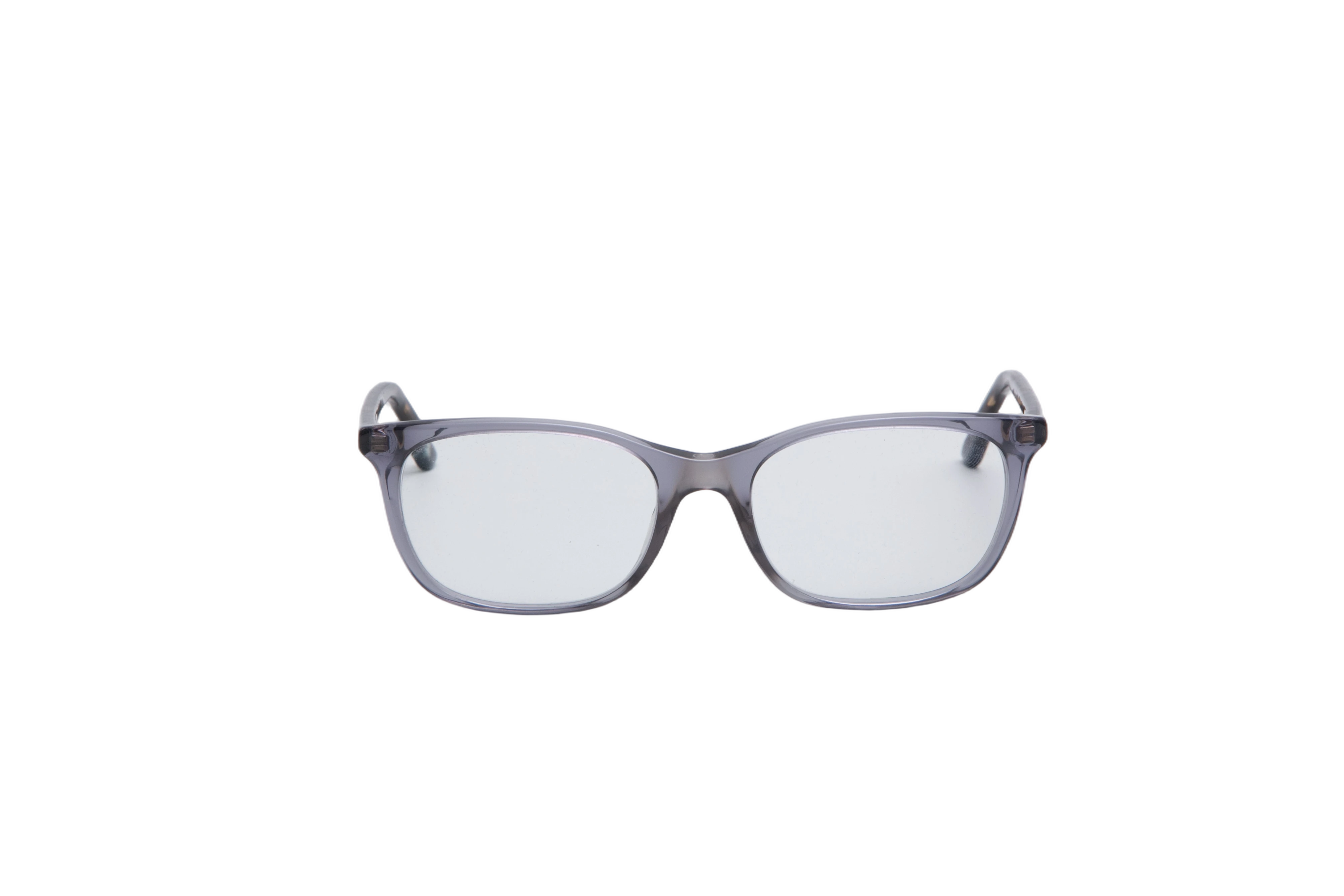 Óculos de grau em acetato em tom cinza translúcido e estampa "tartaruga"nas hastes, lentes transparentes. A armação possui formato retangular.
