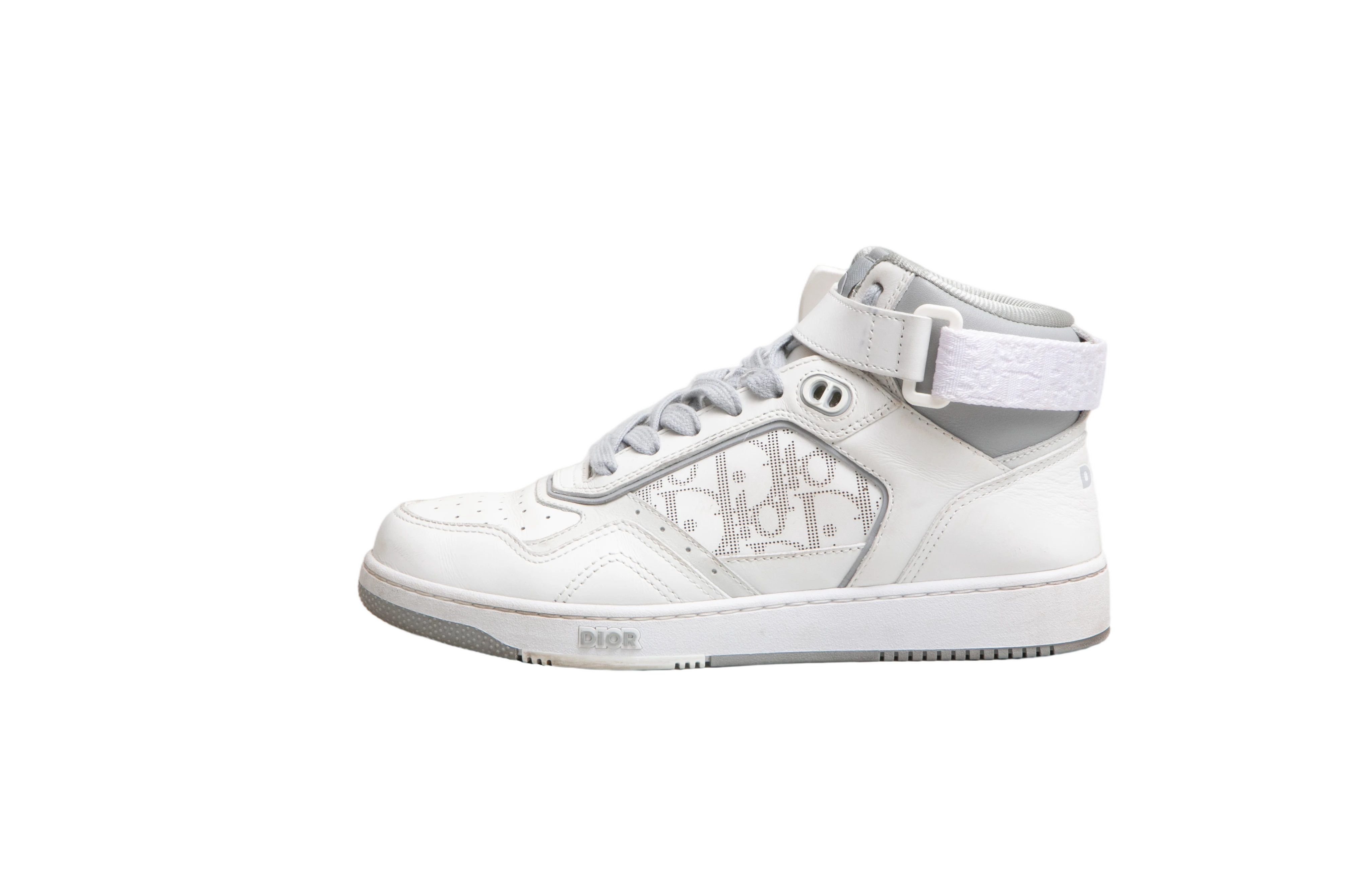 Tênis de cano médio confeccionado em couro branco com detalhes em tecido estampado Dior Oblique em cinza. Possui fechamento por cadarço e tira ajustável com velcro no tornozelo, palmilha confortável e solado de borracha.