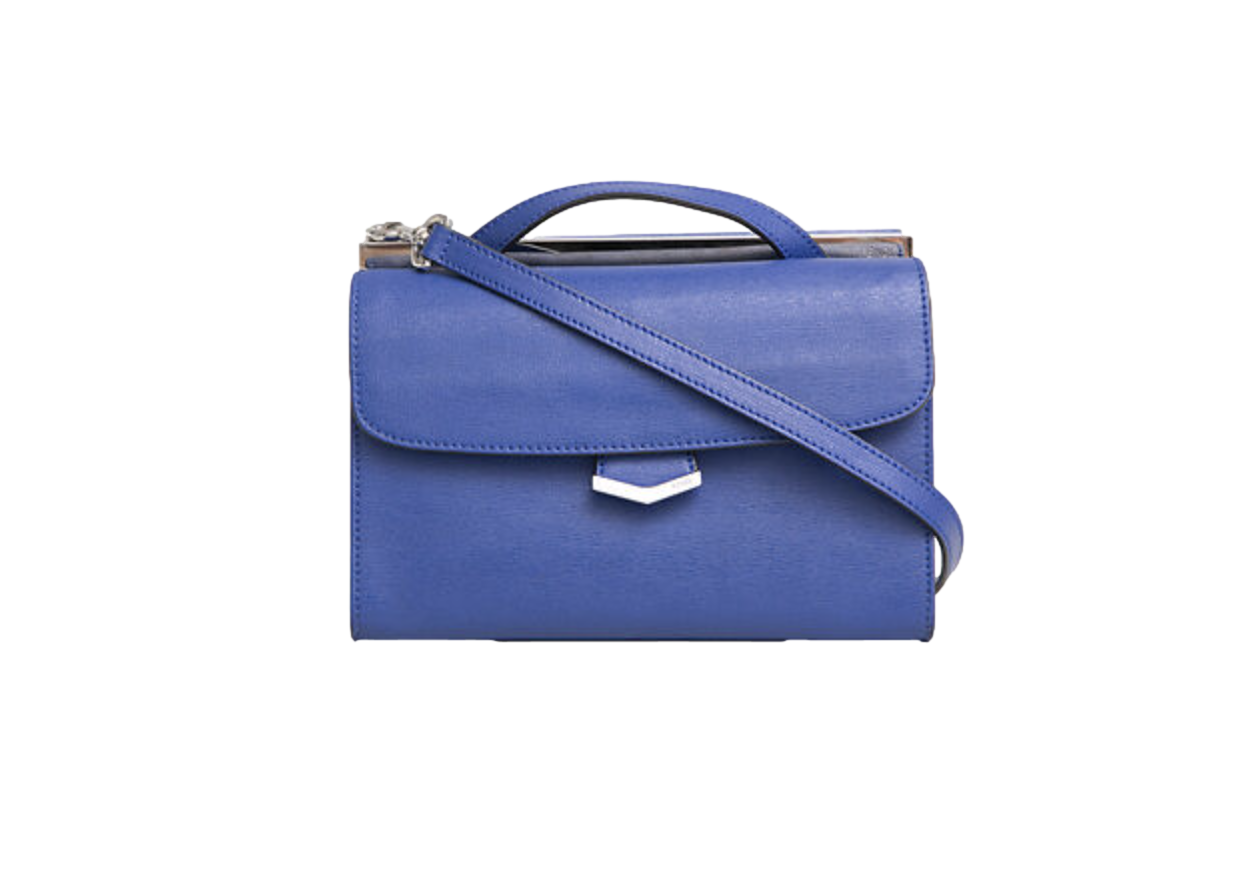Bolsa em couro texturizado azul, com fechamentos por aba e zíper. Possui alça superior de mão e alça longa ajustável e removível, para uso shoulder, crossbody e handle bag