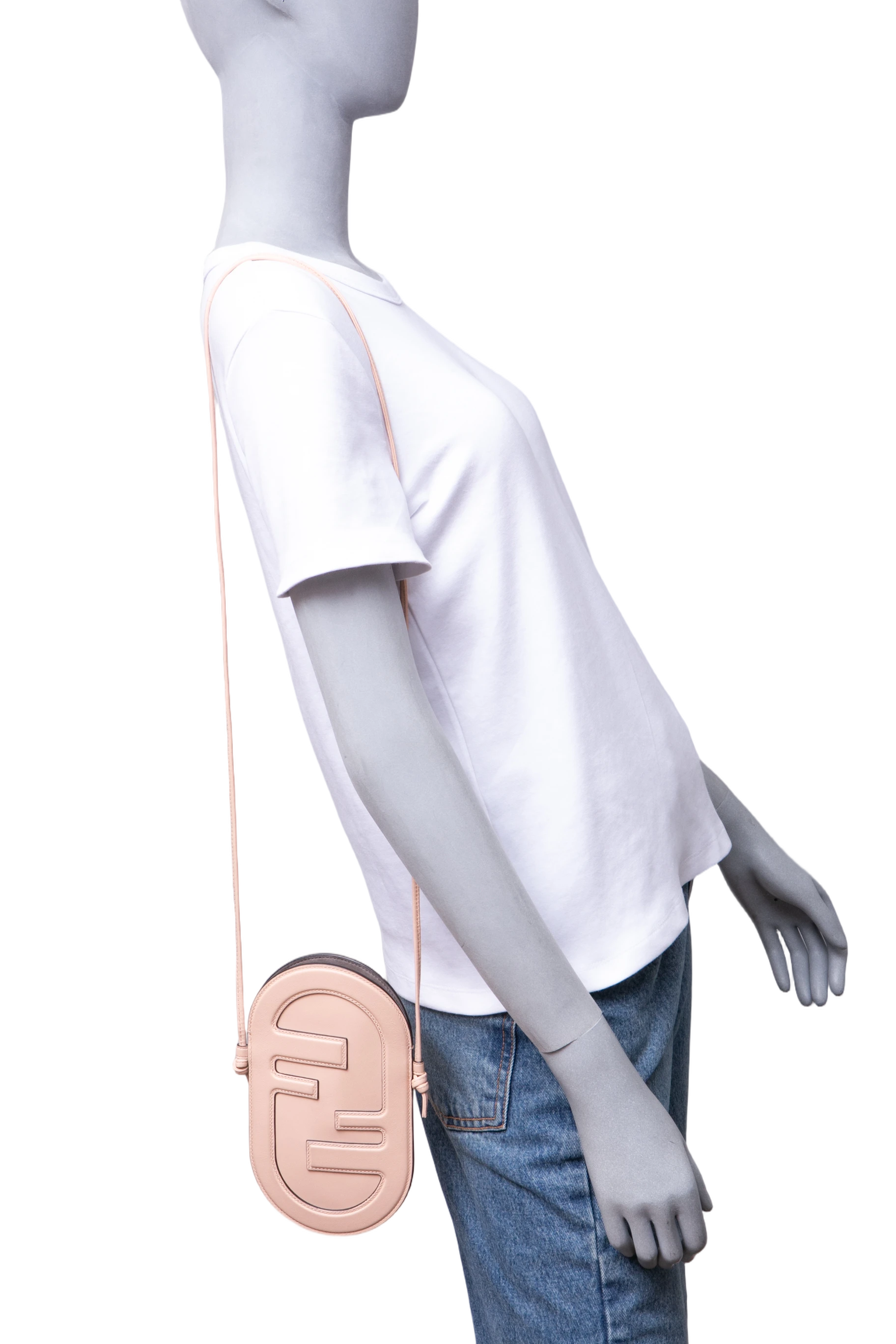 Bolsa couro bege claro com formato oval alongado, possui logo FF em relevo na parte frontal. Com alça longa ajustável, para uso shoulder e crossbody