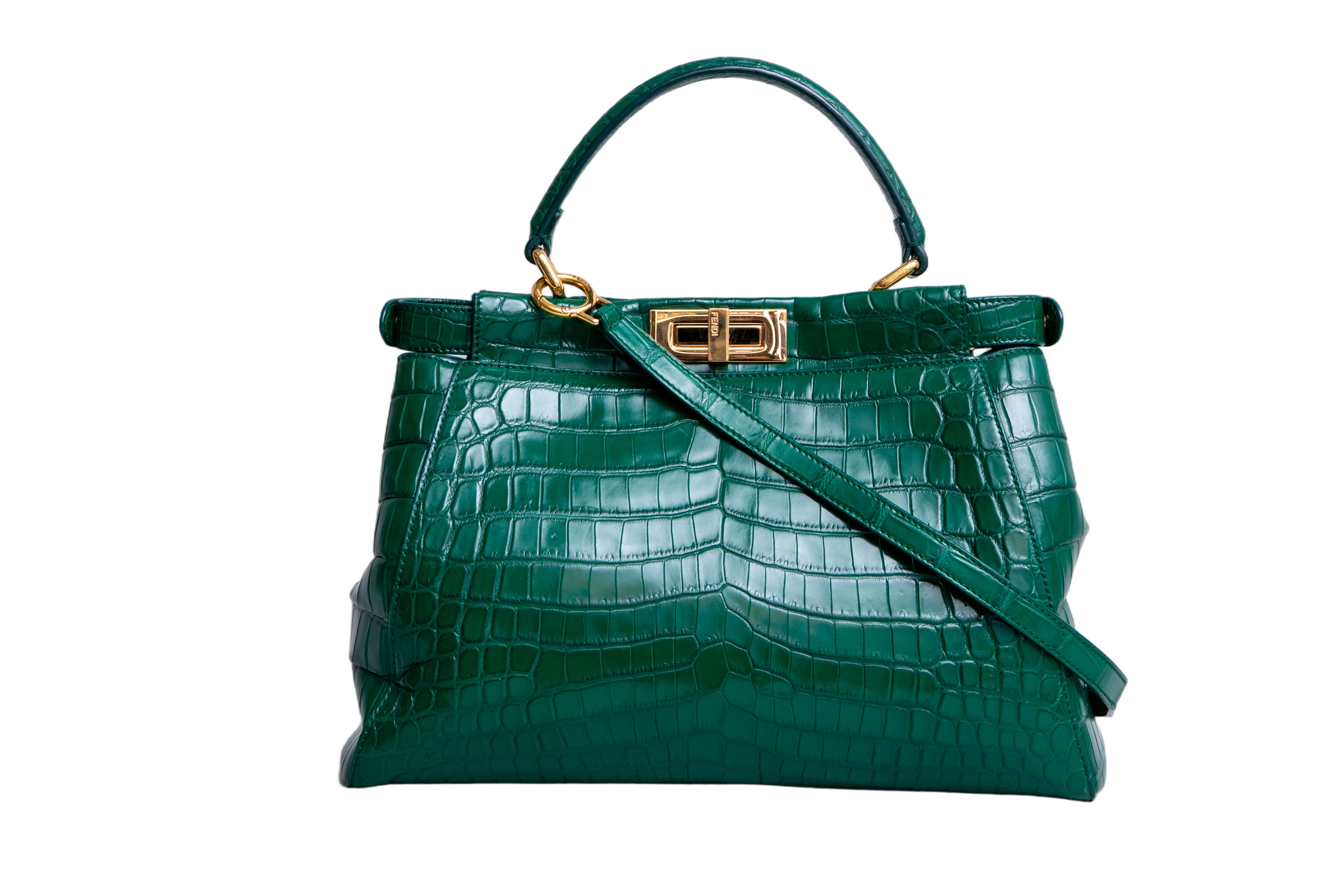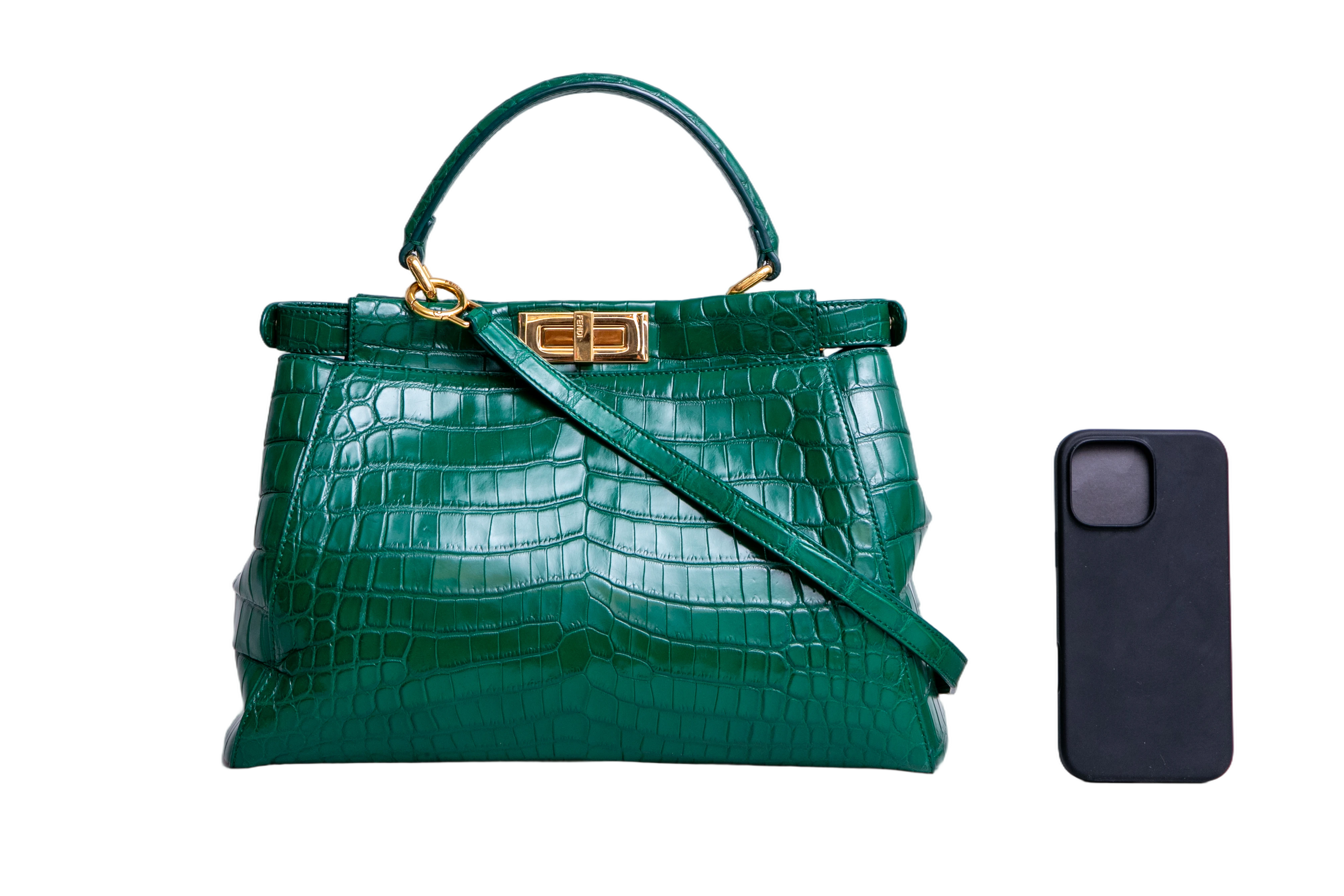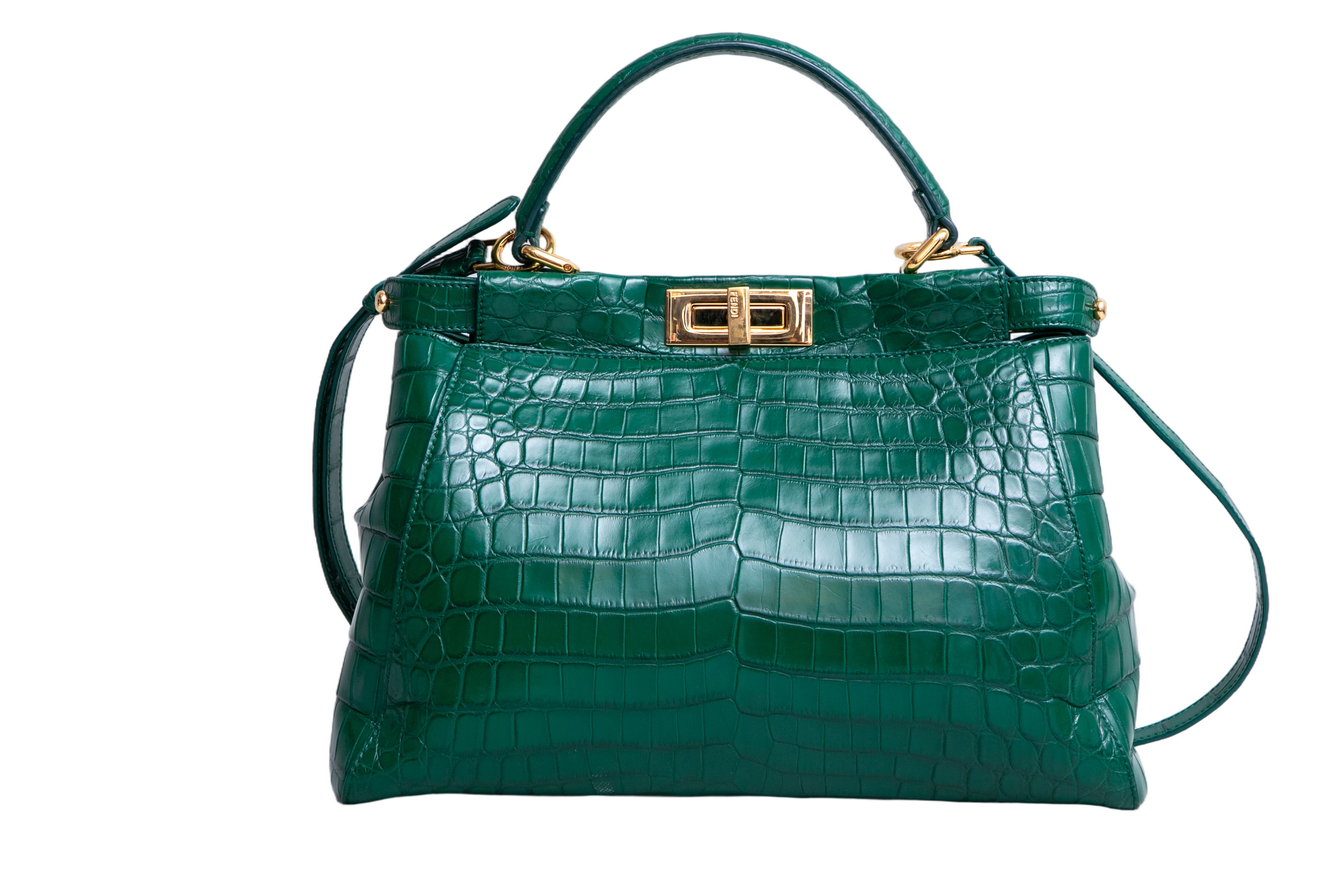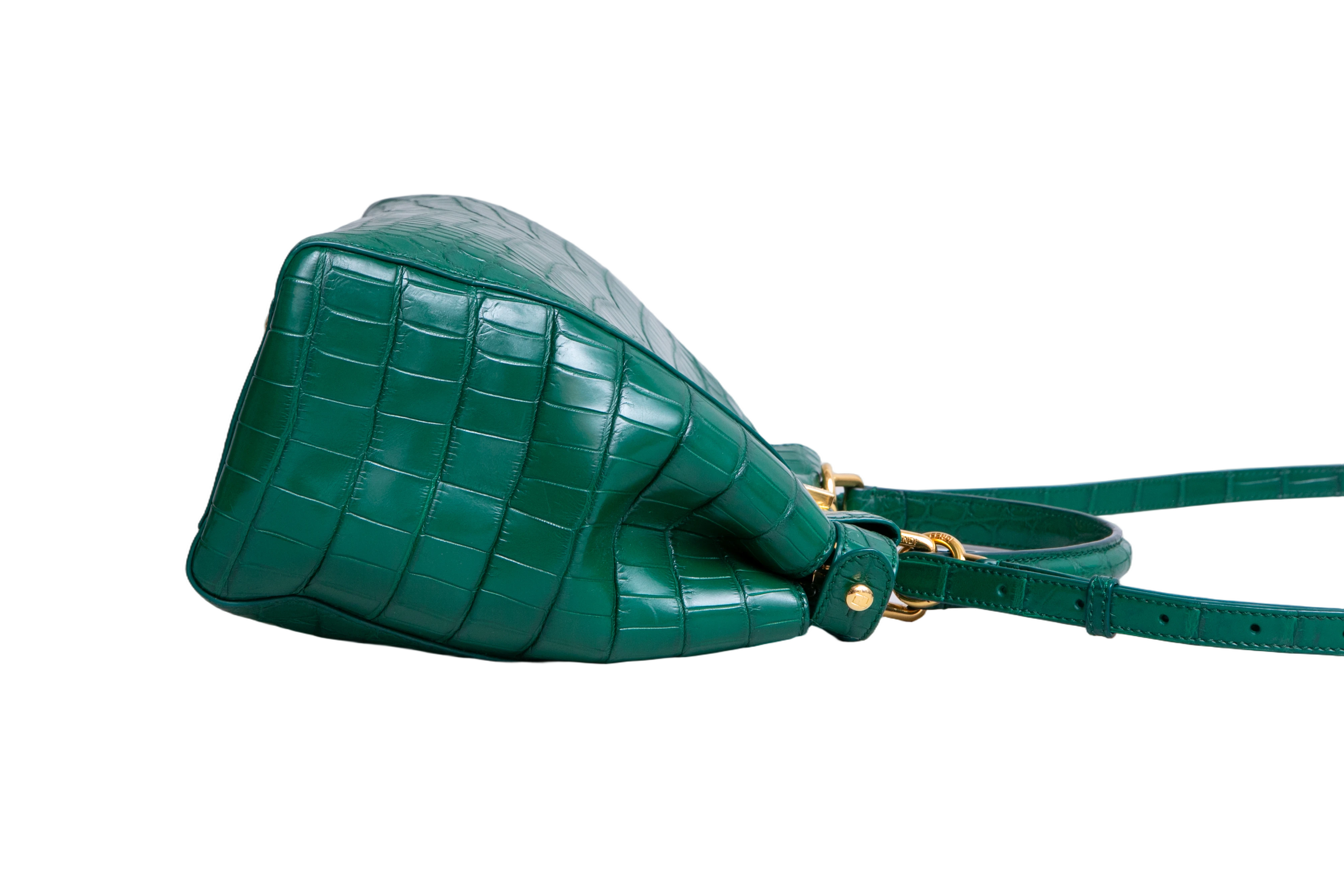Fendi Peekaboo Medium Croco Embossed Green. Peça em perfeito estado, possui pequenos scratches nas ferragens. Acomoda todos os tamanhos de telefone.